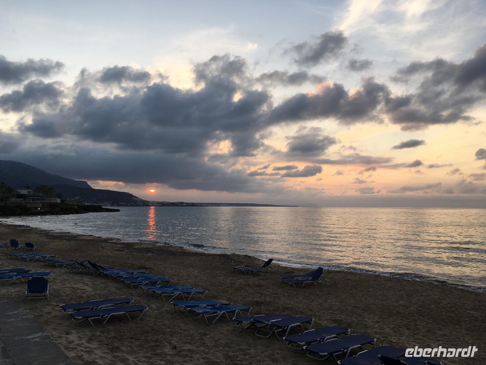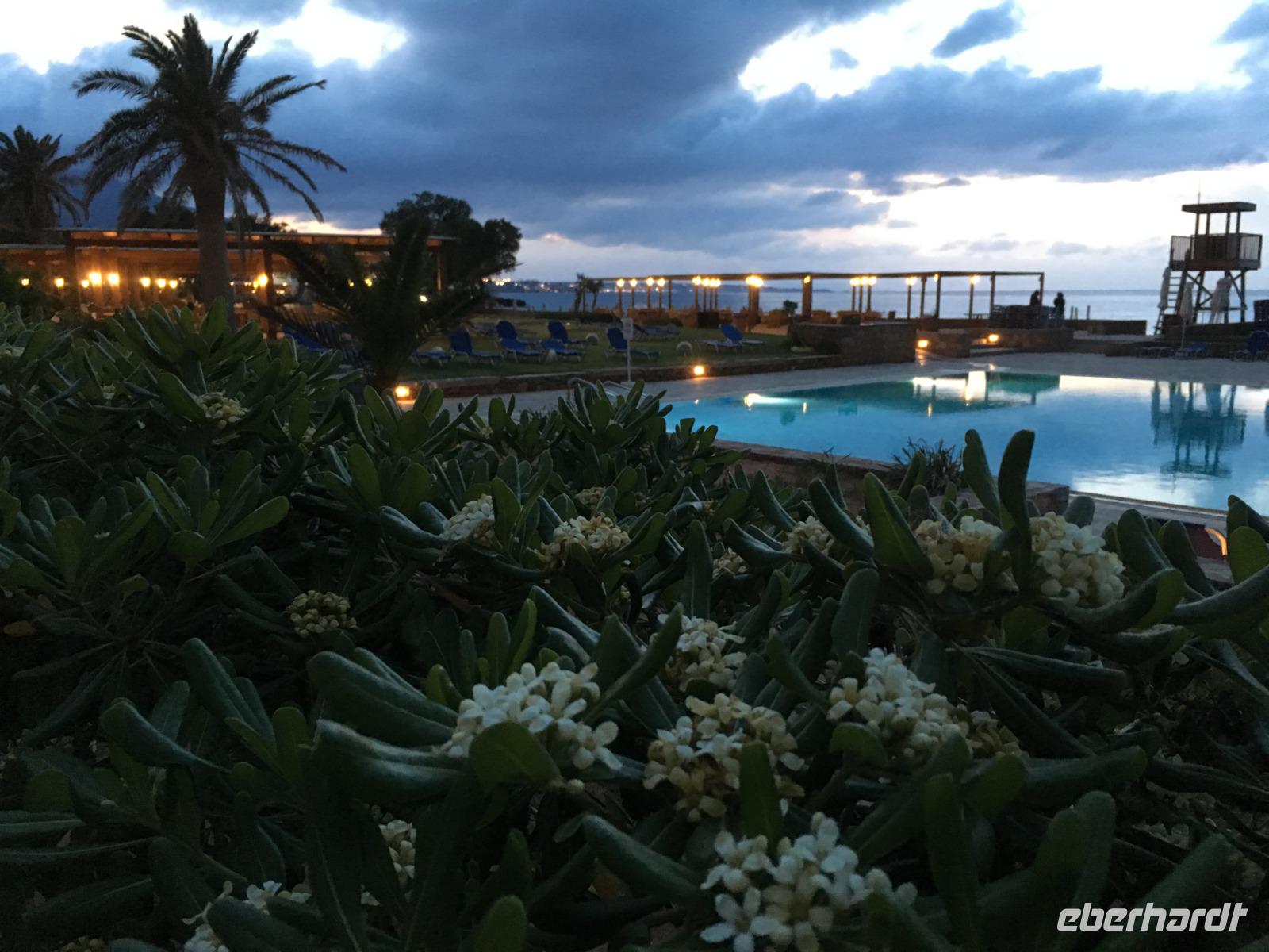 Der Chef unserer Agentur, Dimos, erwartet uns schon, und ein Bus bringt uns in unser Vier-Sterne-Hotel Kernos Beach in Malia. Kurz frisch gemacht, und dann treffen wir uns zum gemeinsamen Abendessen im Restaurant. Ein leckeres Vorspeisenbuffet verführt uns, ein Menü kann man auch noch bestellen, die Speisen sind alle sehr schmackhaft.