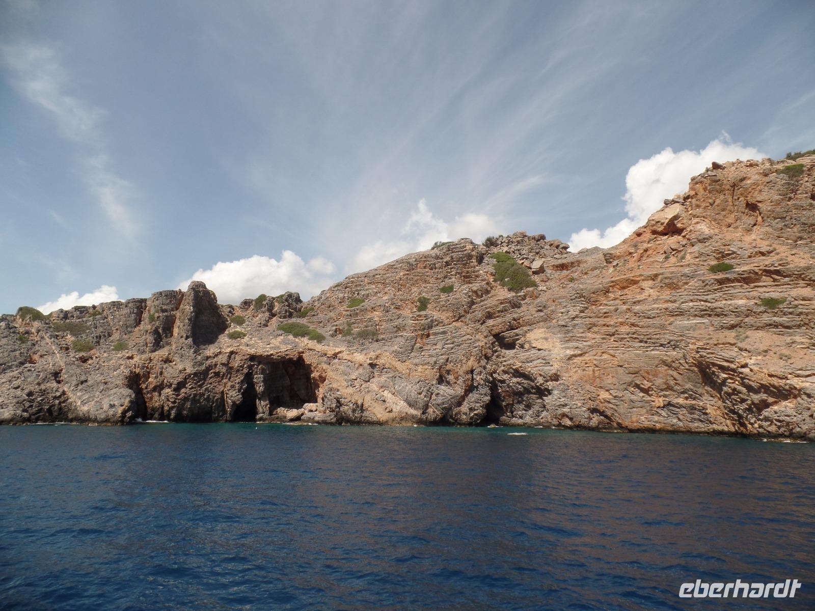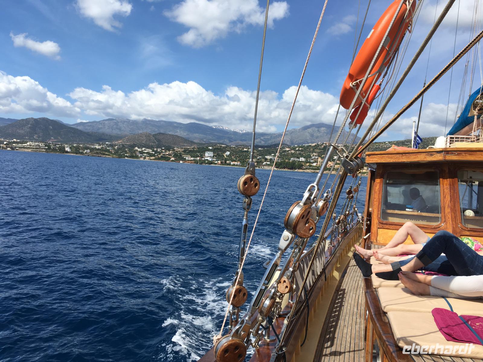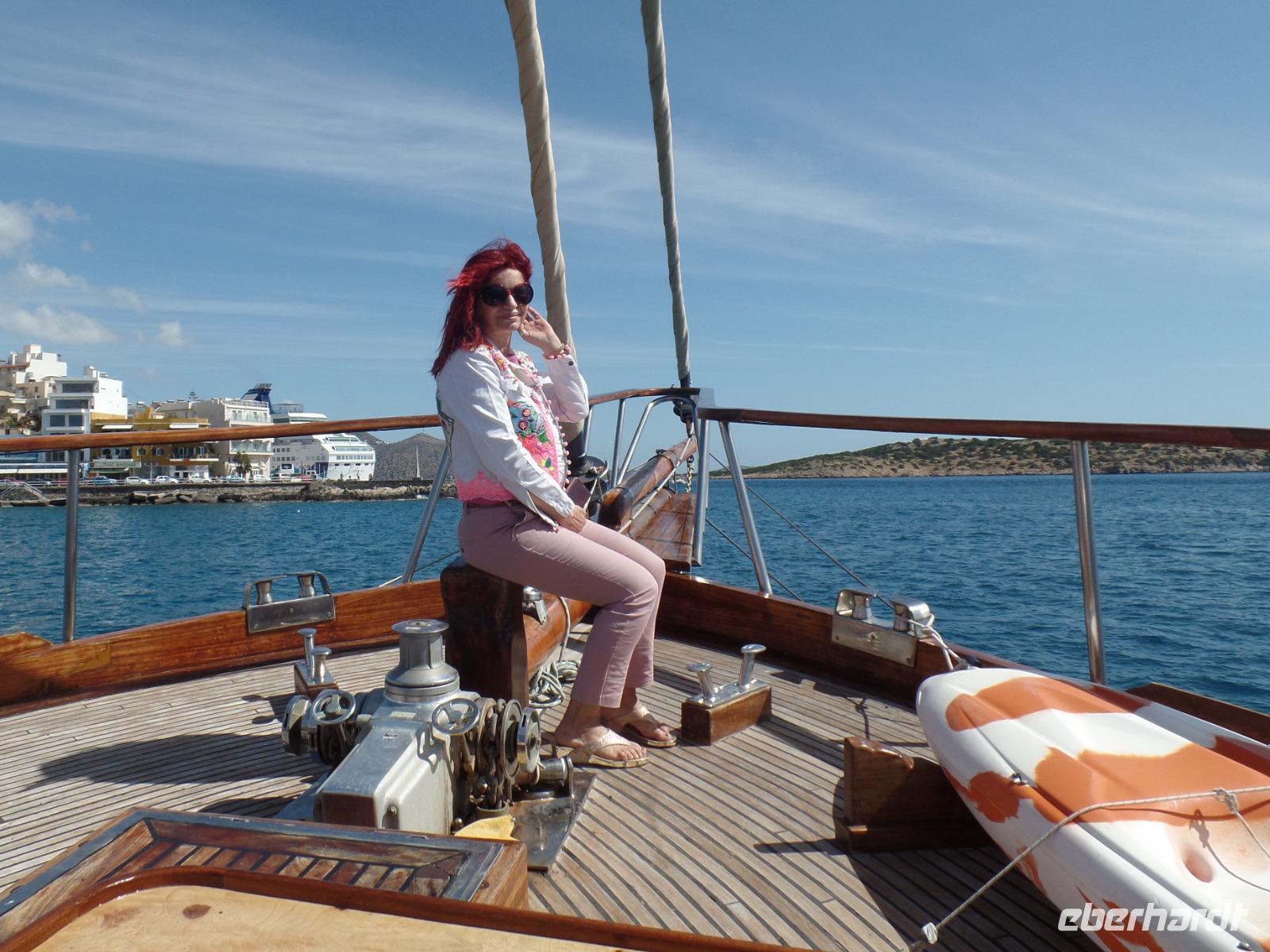 In Agios Nikolaos erwartet uns ein tolles Boot, nur für unsere Gruppe. Wir starten in einen entspannten Tag in der herrlichen Mirabello Bucht. Uns begeistert das blaue Meer, die Felsenlandschaft, die Ruhe. Glücklicherweise ist es nicht mehr so windig.