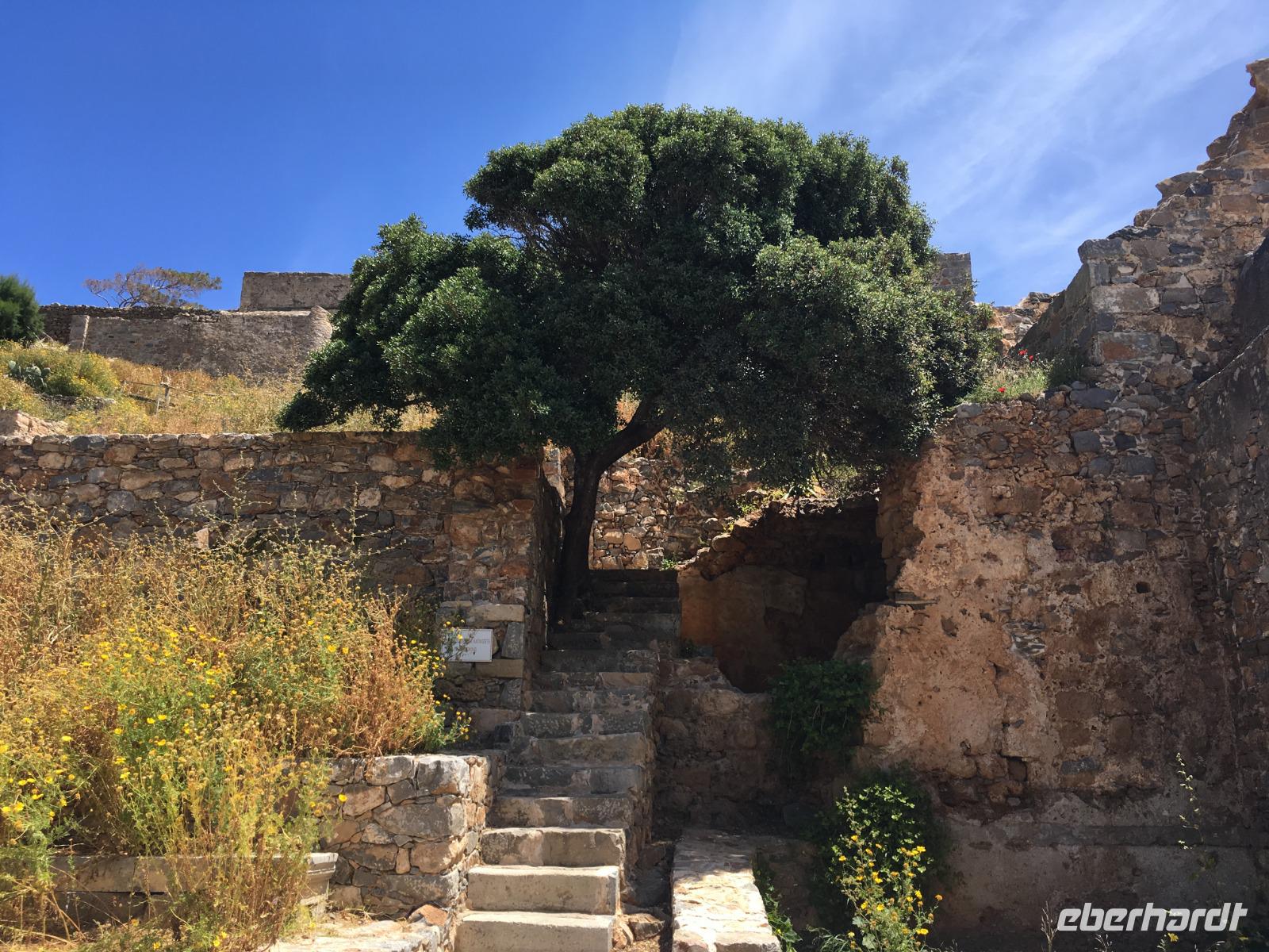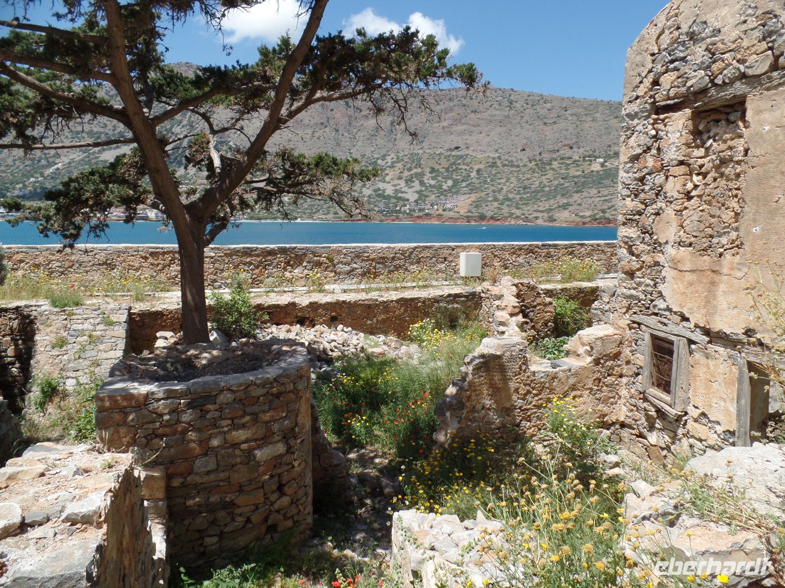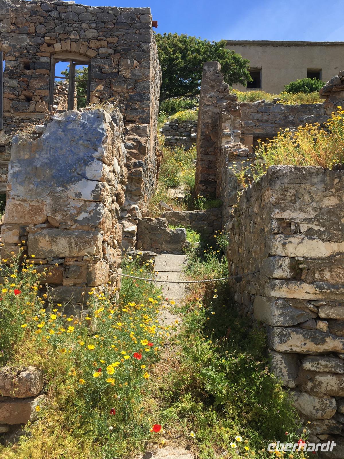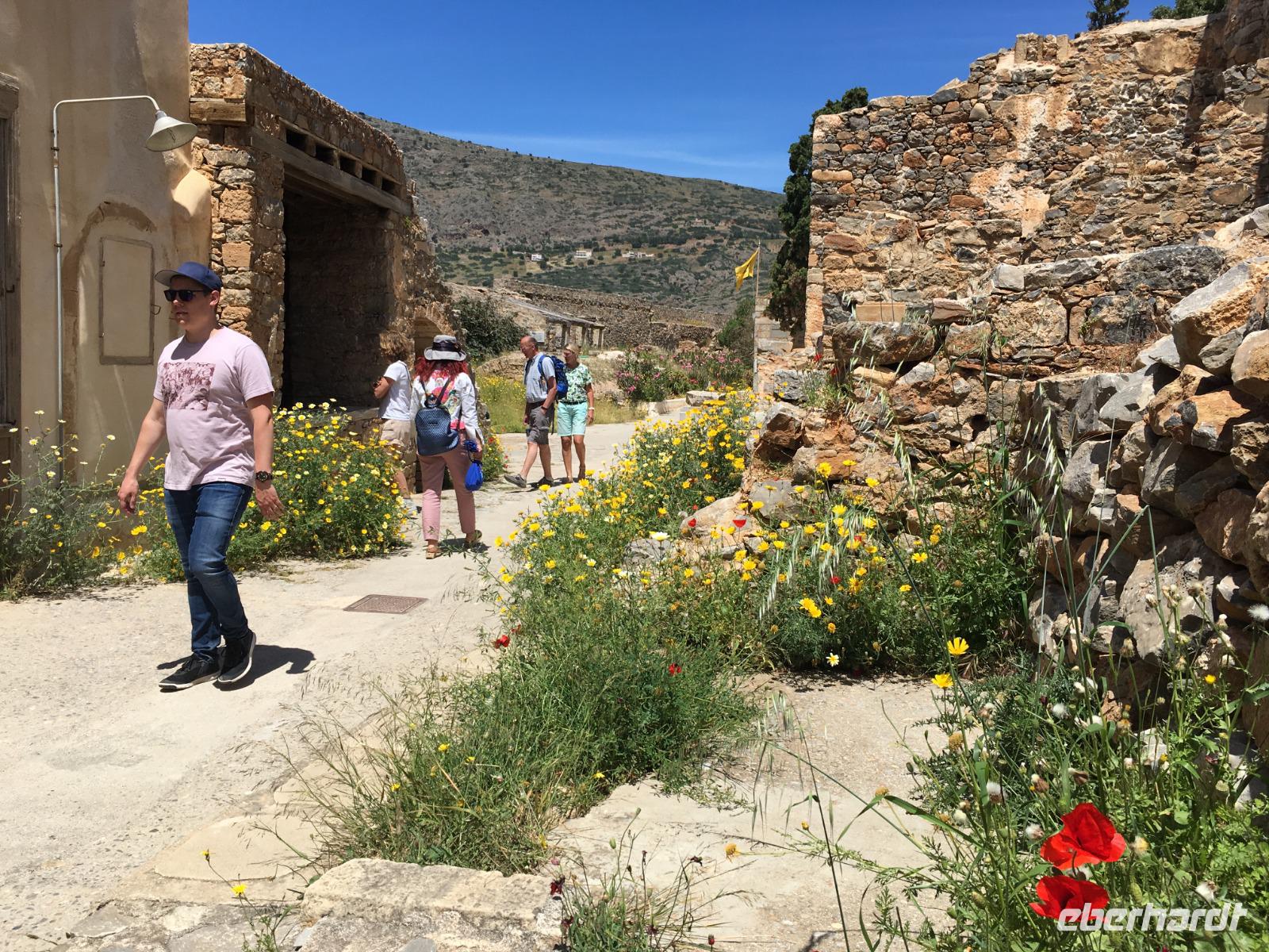 Kultur darf nicht fehlen, und Soula führt uns über die Insel Spinalonga und erläutert uns die Geschichte der Insel. Zuerst umrunden wir aber die Insel per Schiff und müssen dann mit einem kleineren Boot an Land gebracht werden. Im 15. Jahrhundert errichteten hier die Venezianer eine mächtige Burg bzw. ein riesiges Fort. Im 17. Jahrhundert eroberten die Türken Kreta und türkische Siedler nutzten die Anlage als Wohnraum. Als 1903 die kretische Regierung beschloss, die Insel als Quarantäneort für die kretischen Leprakranken einzurichten, verließen die Türken fluchtartig das Gebiet. Glücklicherweise wurde dann ein Mittel gegen diese heimtückische Krankheit erfunden.