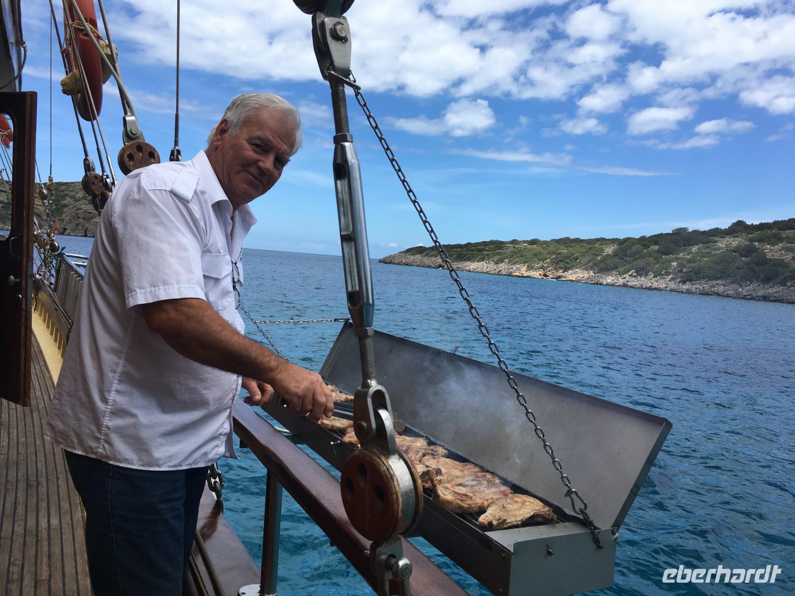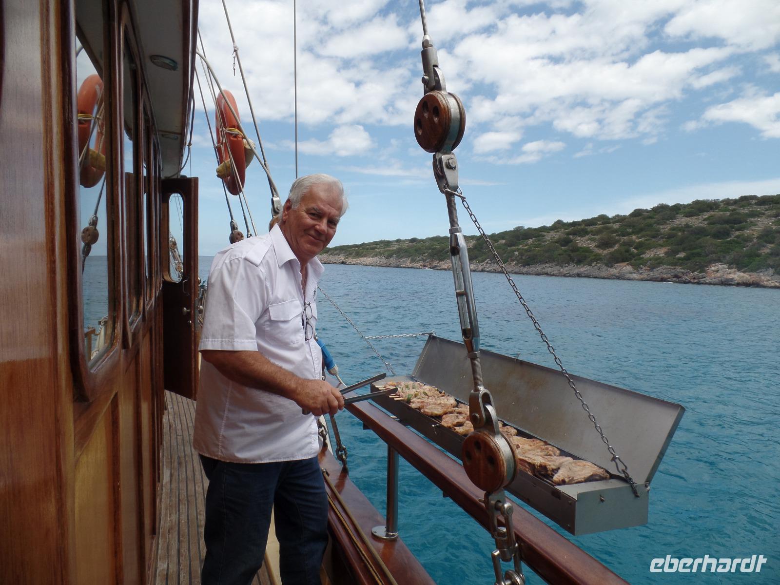 Unser Kapitän grillt für uns auf dem Außenbord-Grill leckeres Fleisch, und wir stärken uns bei einem fantastischen Barbecue. Wein und Raki fließen in Strömen, und Soula verleitet uns mit ihrer tollen Musik vom Handy zum Tanzen.