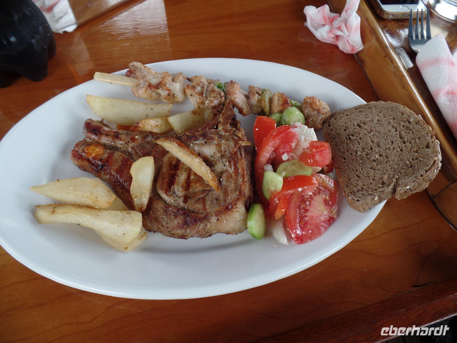 In Skalani werden wir in einer Taverne in die griechische Küche eingeführt. Wir könnten uns selbst betätigen, aber an den gedeckten Tisch zu setzen, ist uns lieber. Es gibt diverse Vorspeisen, und Hahn als Hauptgericht, danach noch Eis. Bei mehreren Gläschen Wein schmeckt es uns ausgezeichnet.