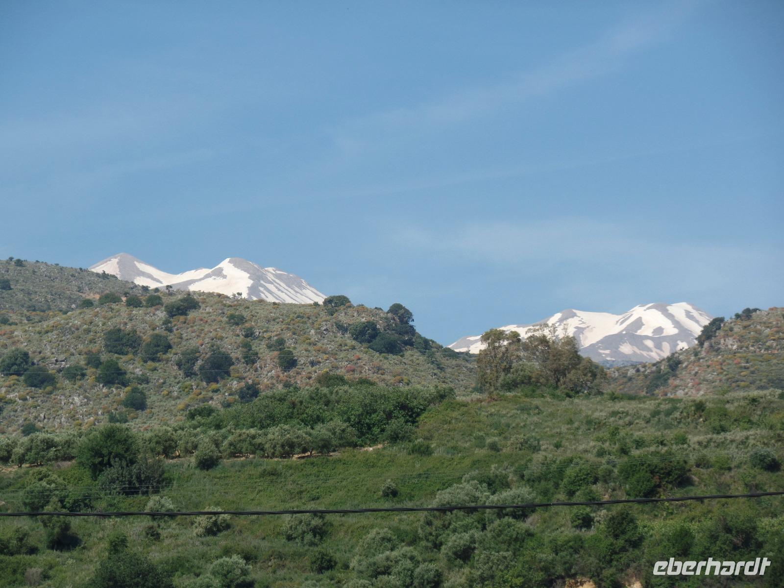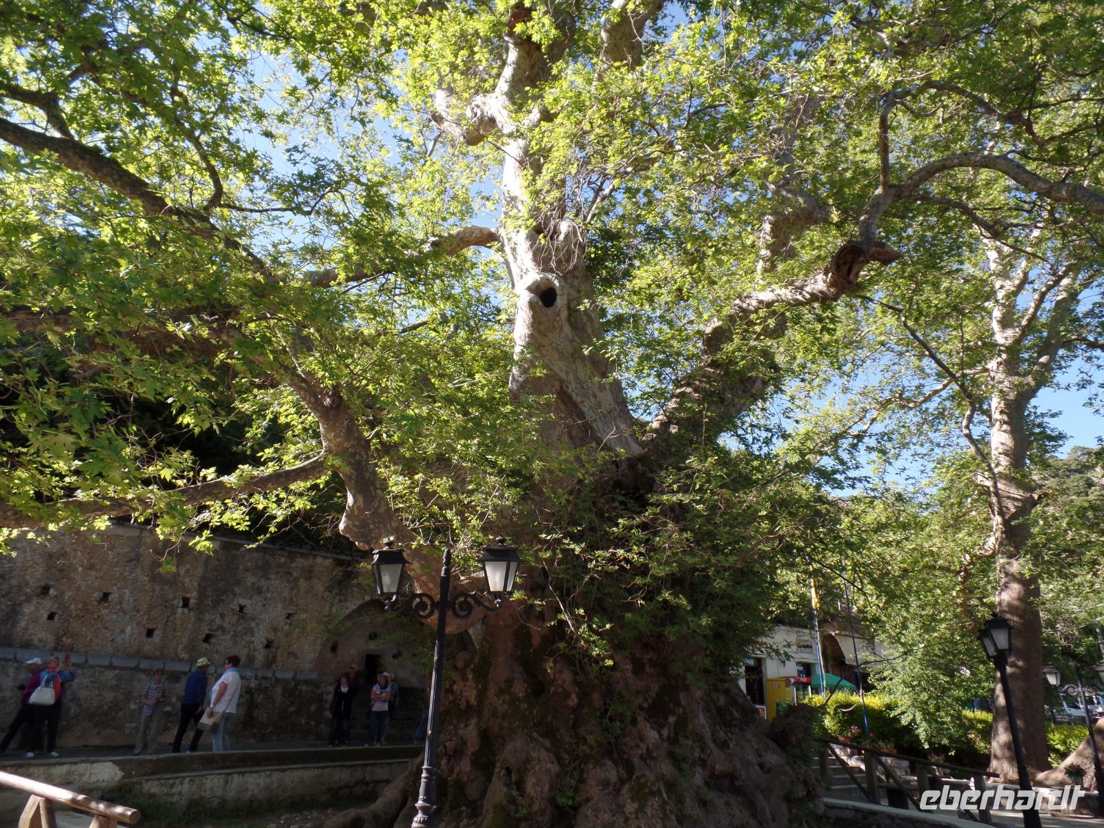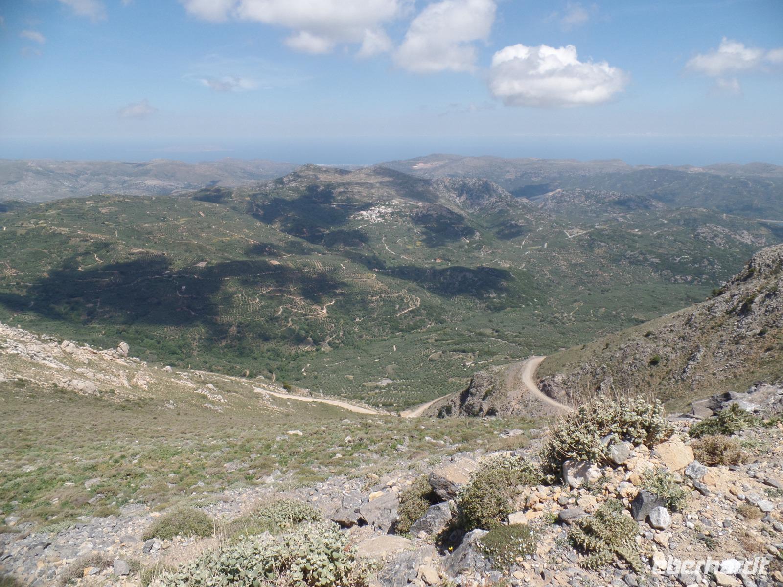 Unsere Fahrer Thomas und Marius fahren uns sicher den ganzen Tag auf holprigen Straßen durch diese herrliche Berglandschaft. Zuerst ein Stopp im Bergdorf Krasi, wo wir die über 2000 Jahre alte Platane bewundern. Hier können wir auch sehen, wie mühsam die Dorffrauen früher ihre Wäsche waschen mussten. Ein kleiner Spaziergang und dann geht es über den Ambelos -Pass in 900 m Höhe zur Lassithi-Hochebene. Hier oben stehen noch die Ruinen von alten Getreidemühlen. Vom Pass haben wir einen herrlichen Blick in die Bergwelt, durch die wir später fahren. In den oberen Bergen liegt sogar noch Schnee. Der Winter war dieses Jahr auf Kreta sehr lang und nass, so dass man jetzt erst beginnt, die berühmten Lassithi-Kartoffeln zu legen. Keiner von uns möchte die Kraft aufwenden, um in die Zeus-Höhle hinauf und die Treppen dann hinab zu steigen.