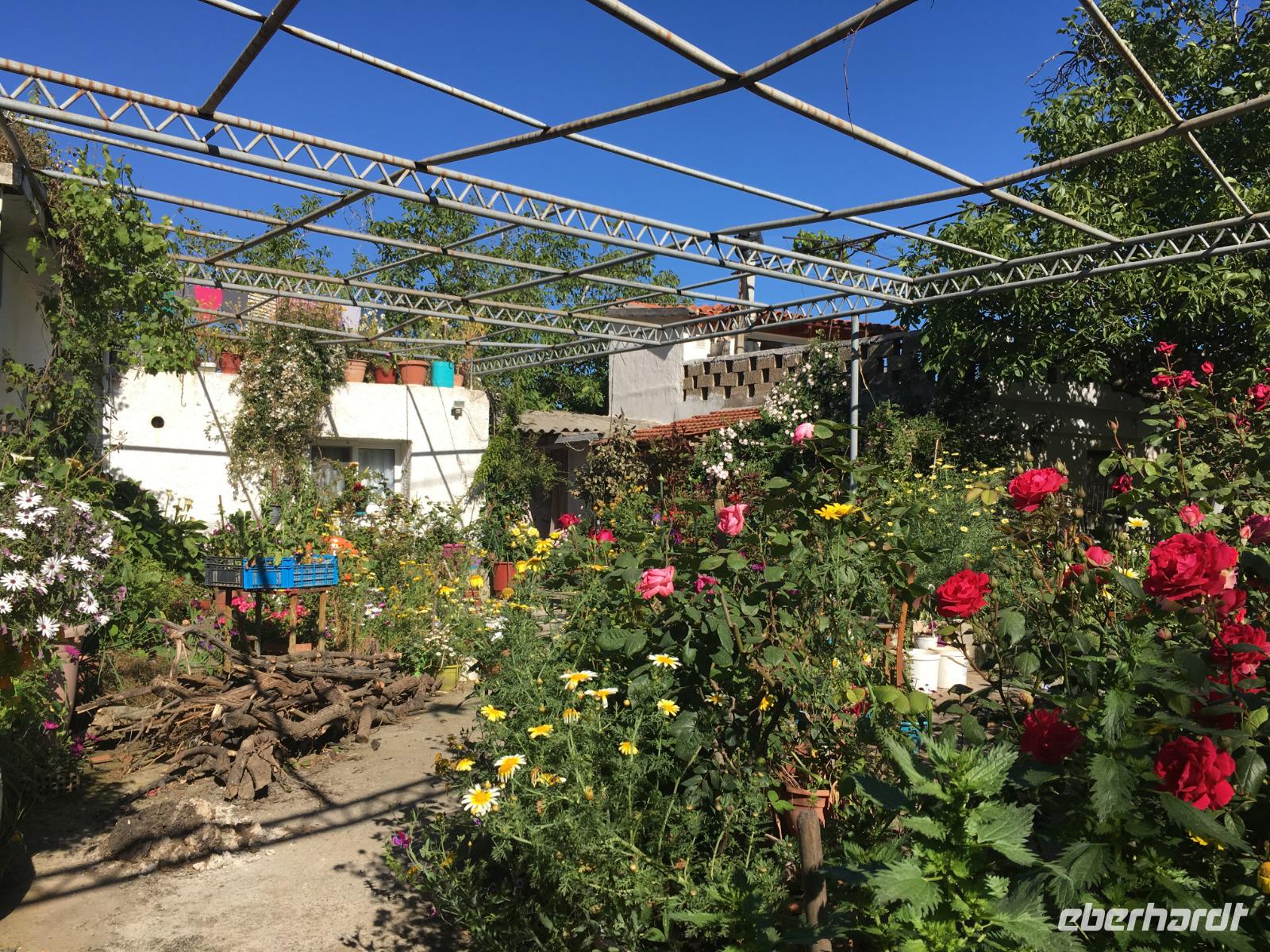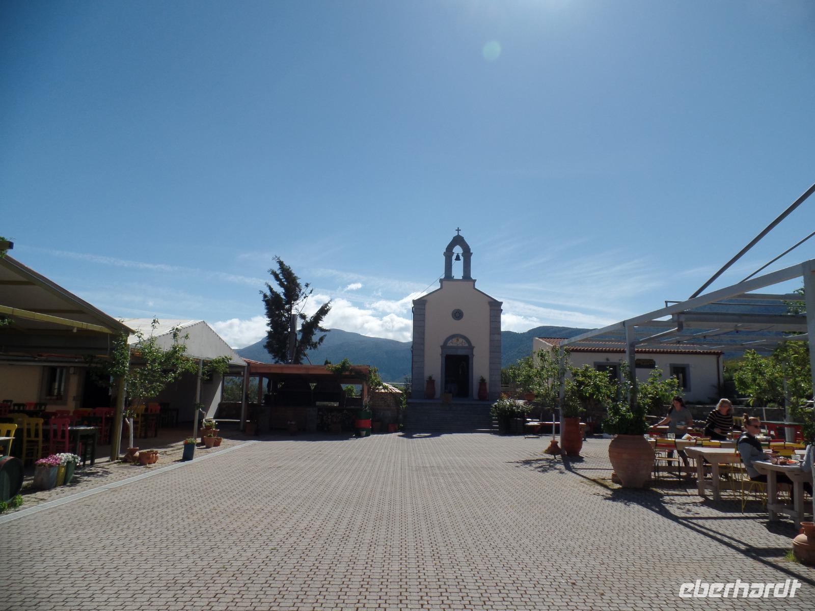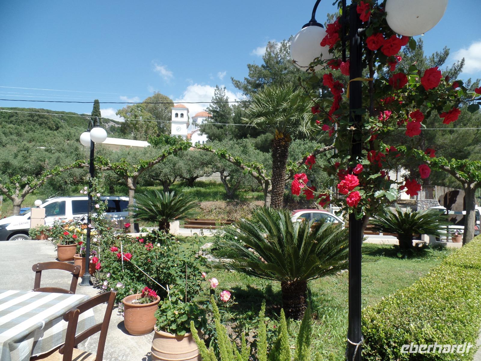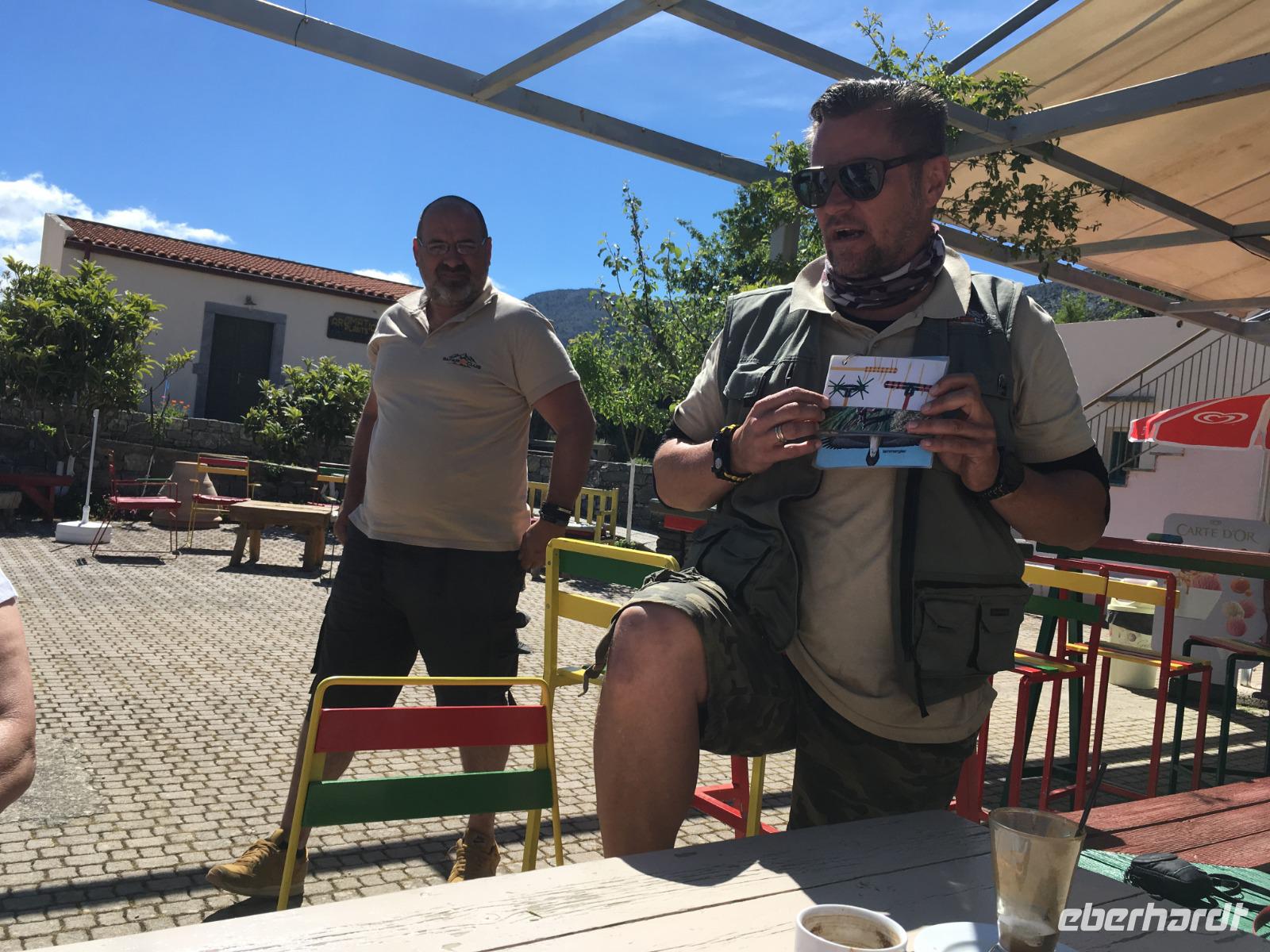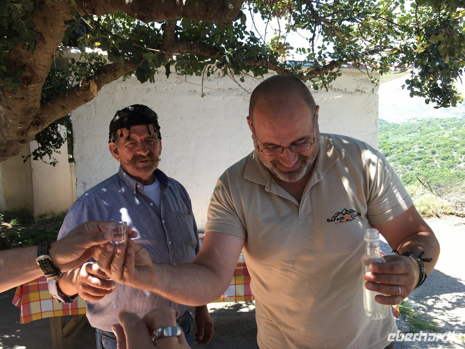 So nutzen wir die Zeit für eine Kaffeepause im Eco Park. Wir schauen mal in die Töpferei und Kirche und kaufen einige landwirtschaftliche Produkte. Dann geht es auf einer Steinpiste durch diese herrliche Bergwelt mit tollen Blicken in die Landschaft bis zum Meer. Im Bergdorf Kastamonitsa kosten wir Raki und daraus produzierte Liköre mit Orangen, Limonen, Pfefferminze oder Zimt. Natürlich nehmen wir einige Souvenirs mit, auch Olivenöl.