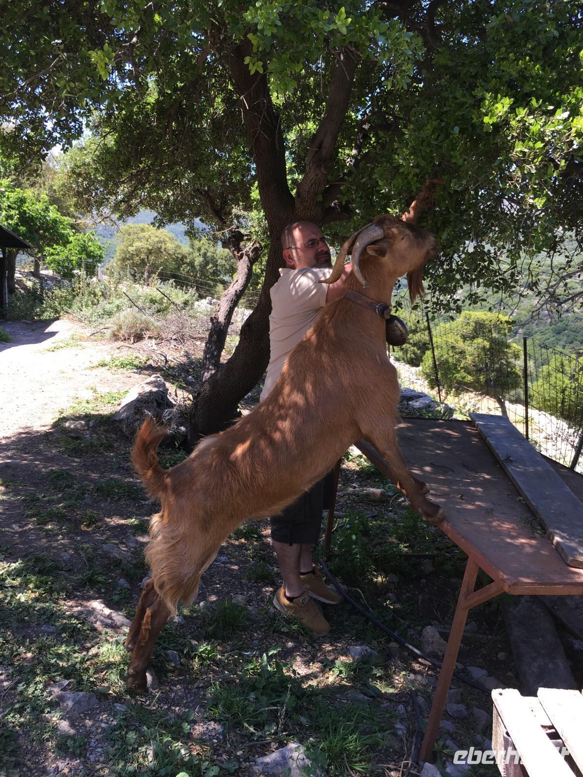Nun statten wir noch dem Schäfer einen Besuch ab, um von seinem selbstproduzierten Käse zu kosten und zu kaufen. Auch die Ziege begrüßt uns freundlich!