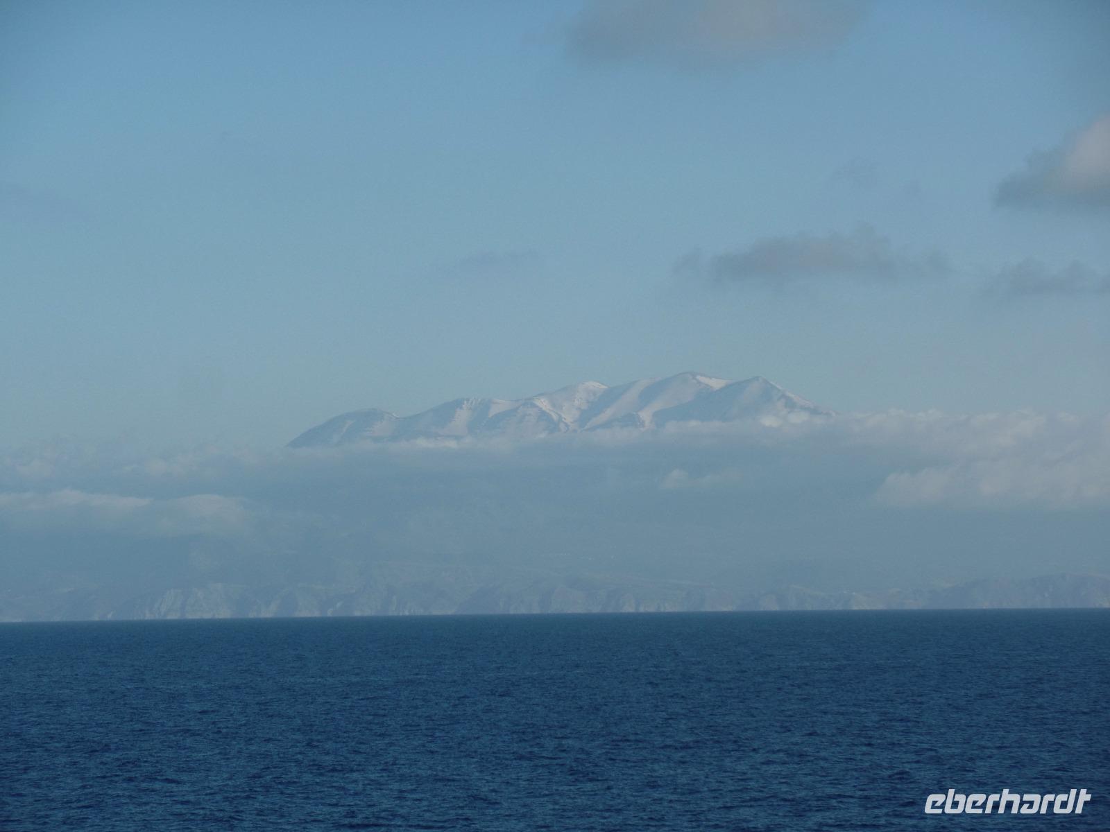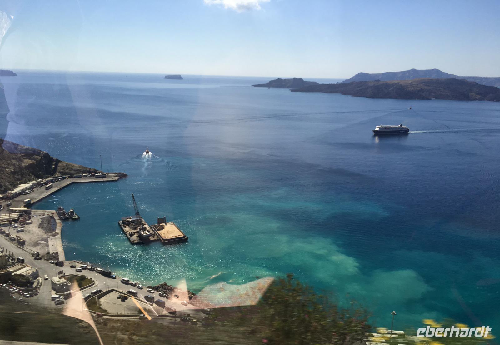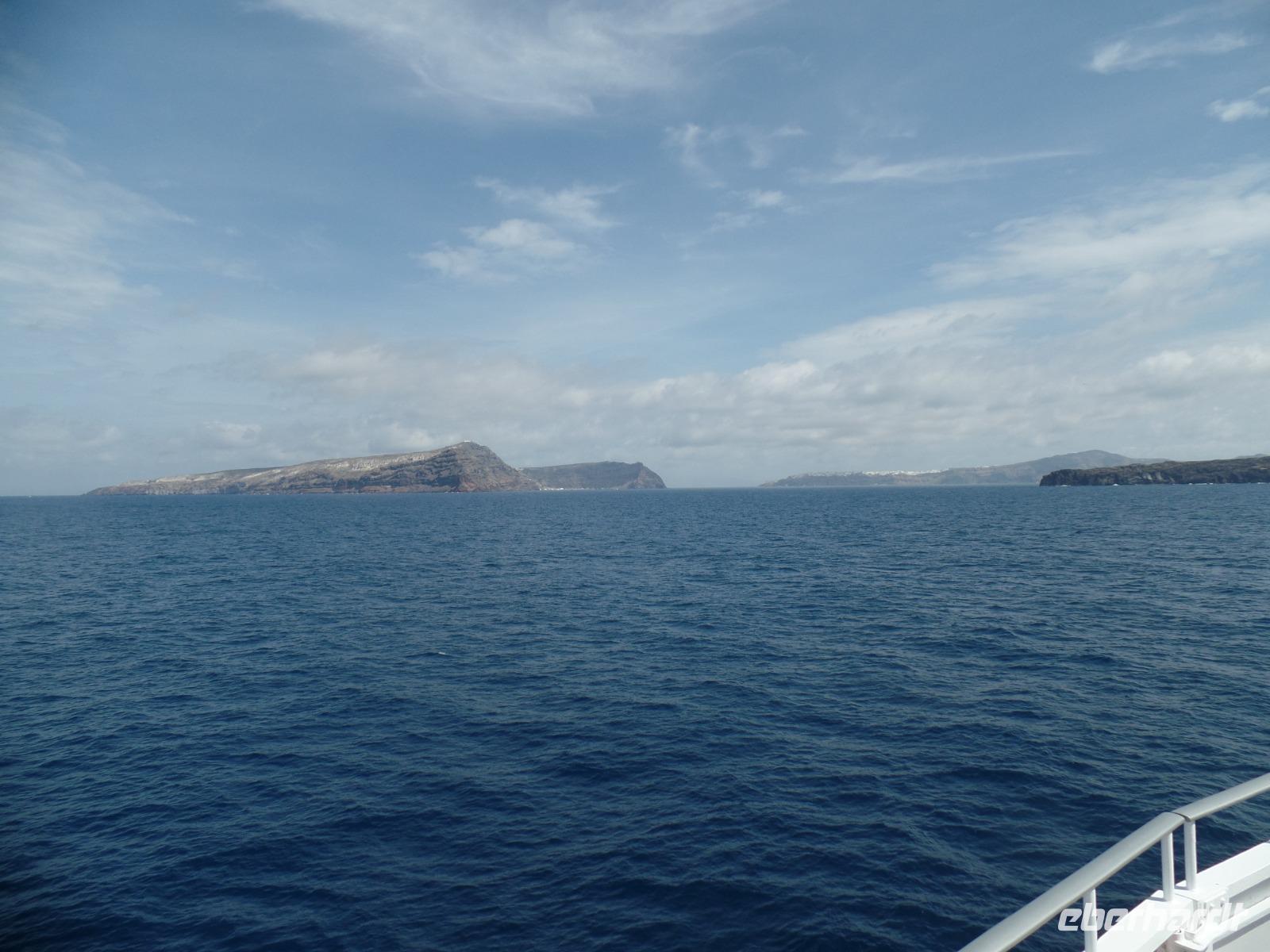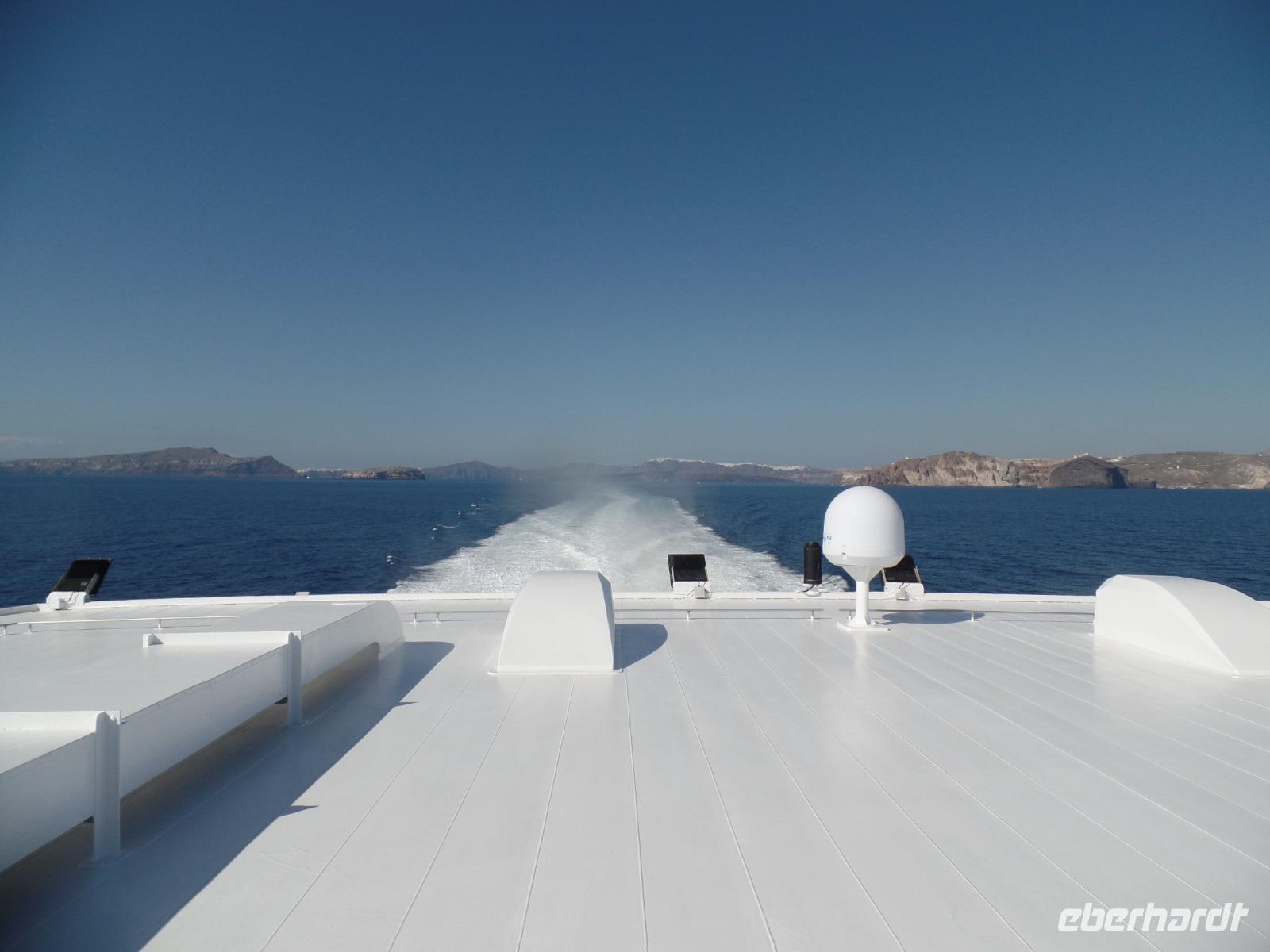 Mit kleinem Gepäck geht es von Heraklion mit der Schnellfähre nach Santorin. Es gibt zeitig Frühstück und der Bus bringt uns zum Hafen, wo Dimos uns für zwei Tage nach Santorin begleitet. Zwar ist das Meer ruhig, aber es schaukelt doch ganz schön.