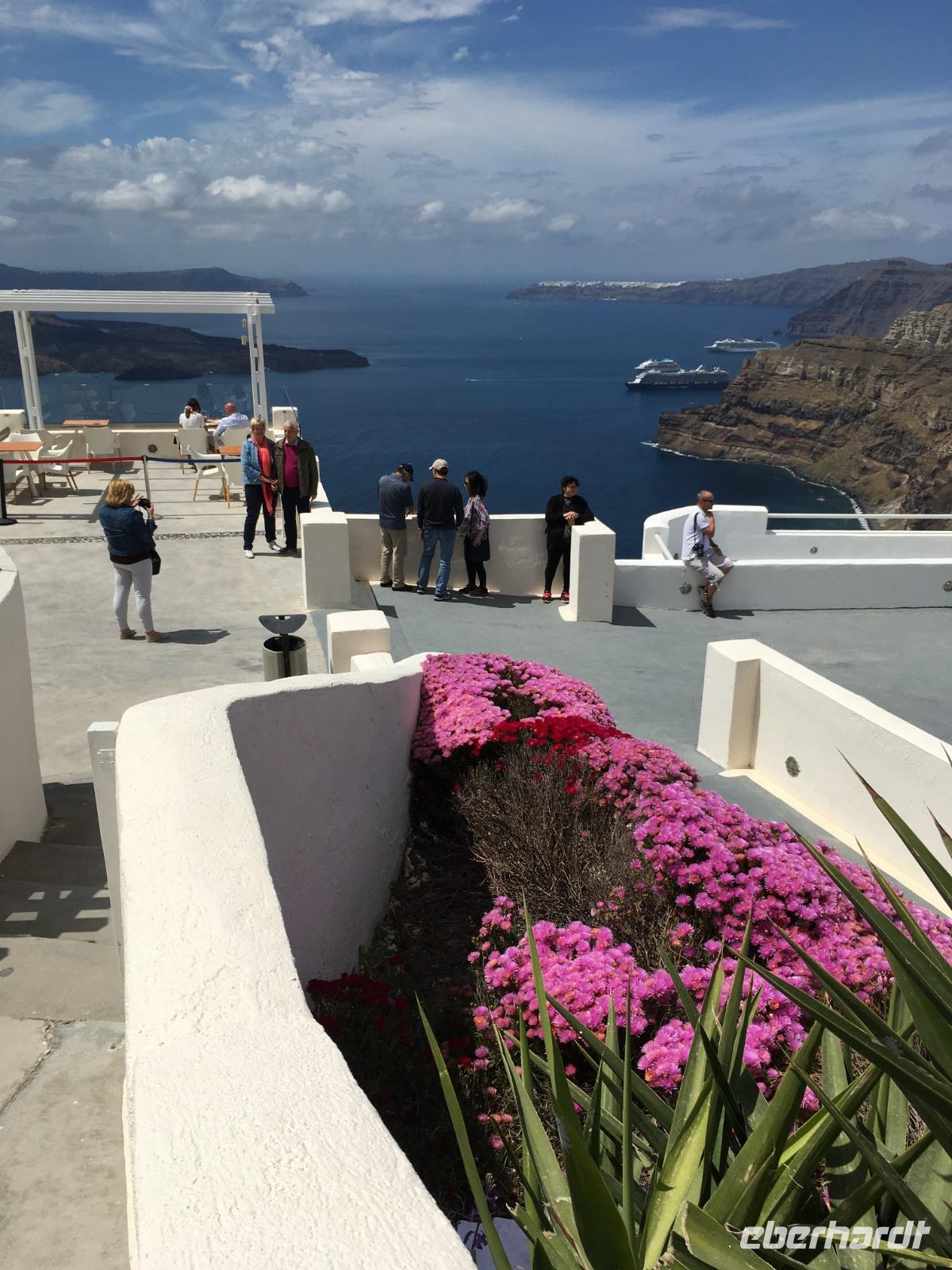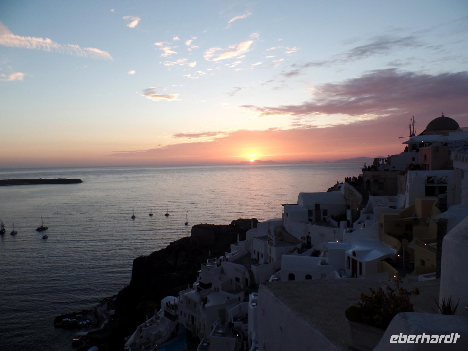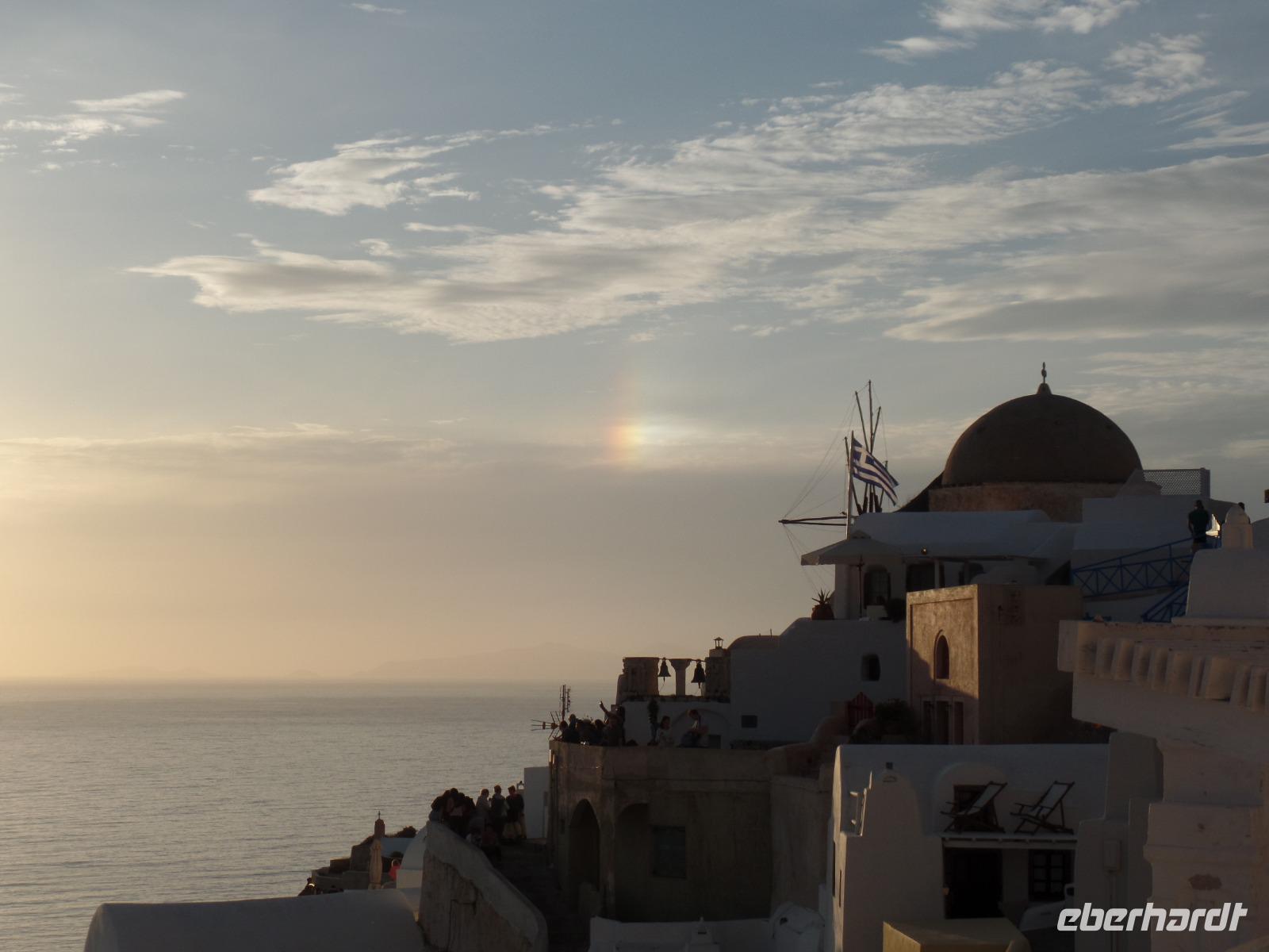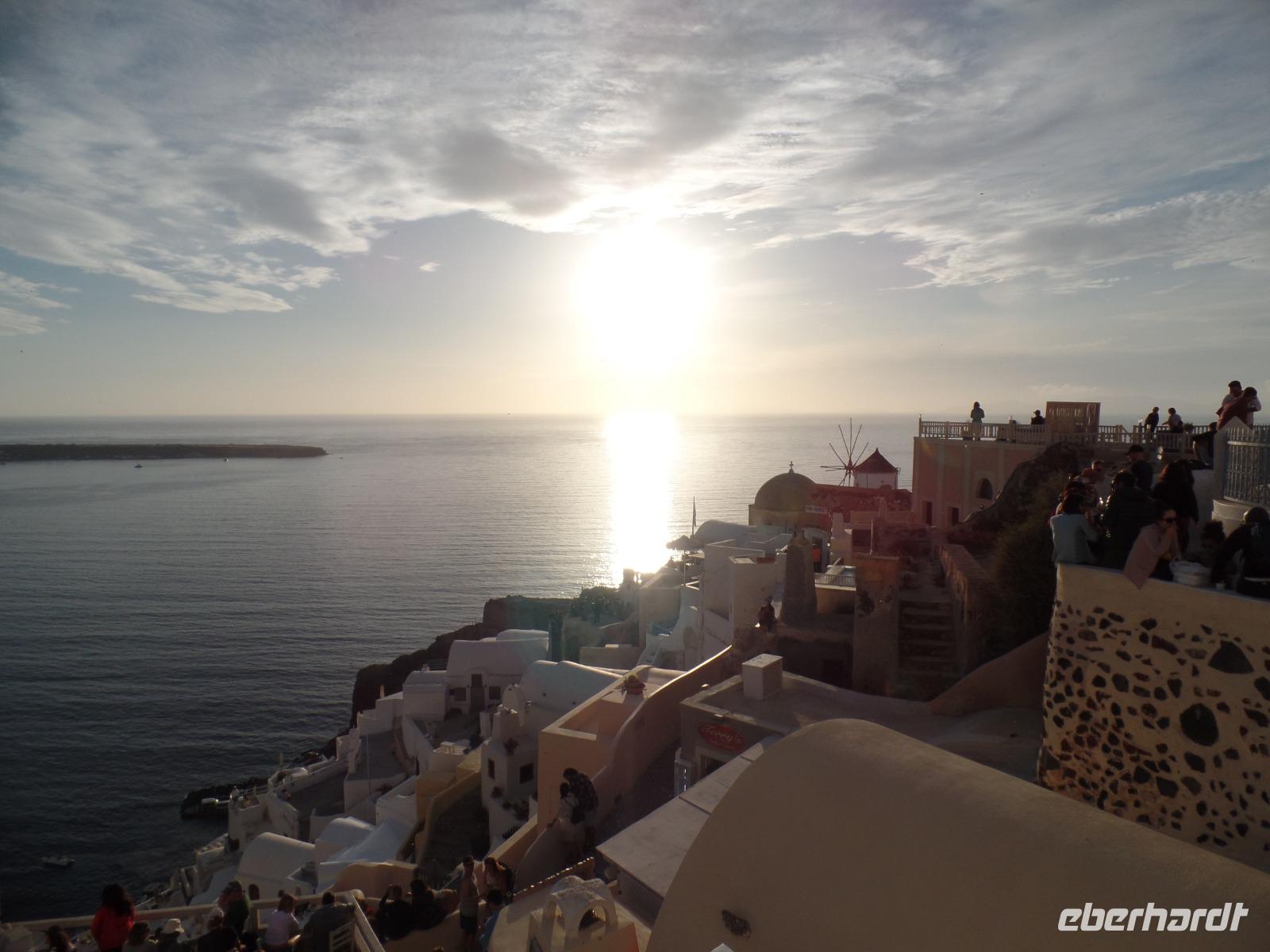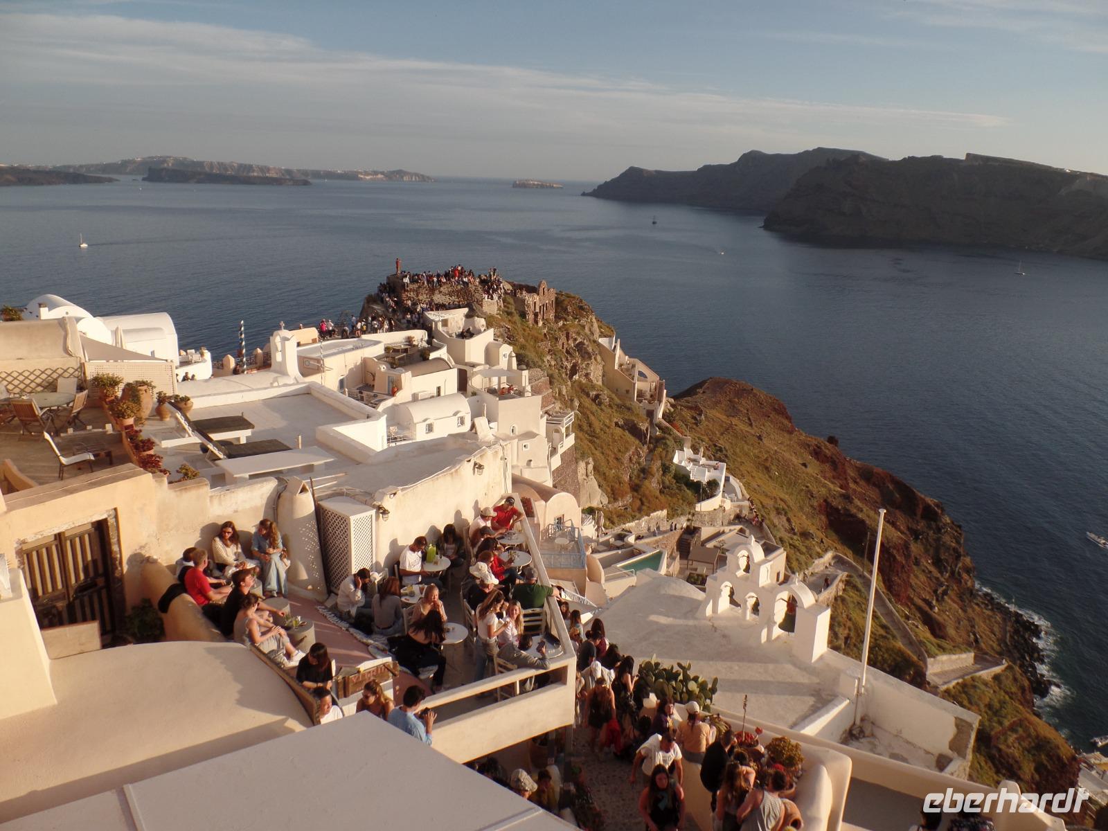 Dimos bringt uns dann ins Zentrum von Oja, wo wir uns in die Touristenschar aus aller Welt einreihen, die extra von der Insel und den Kreuzfahrtschiffen zum Sonnenuntergang an diesen exponierten Ort gekommen sind.