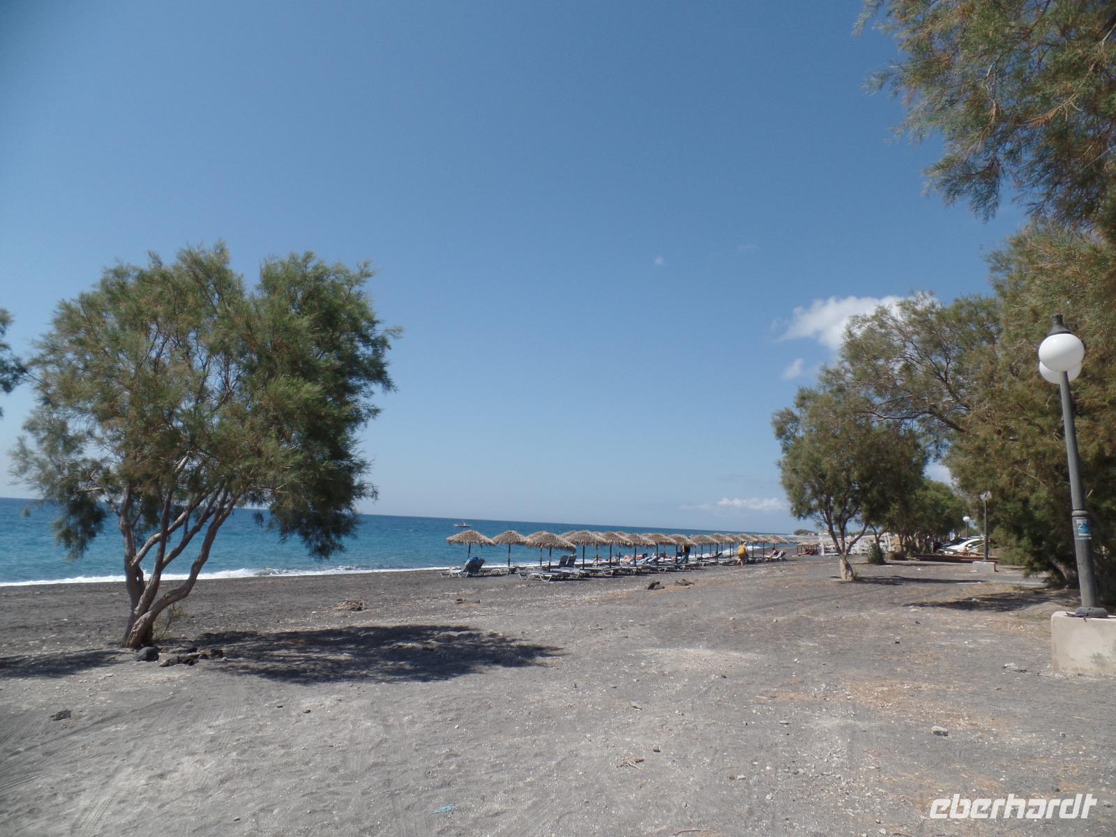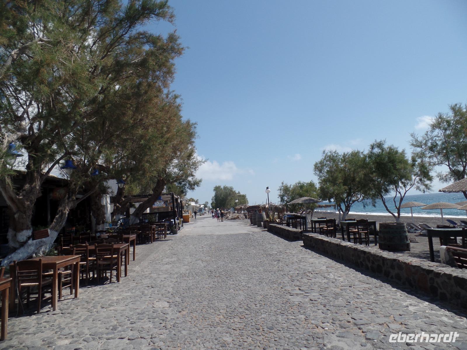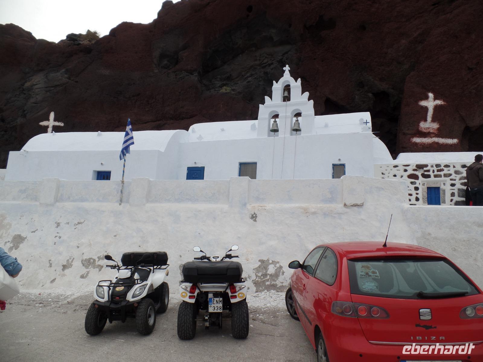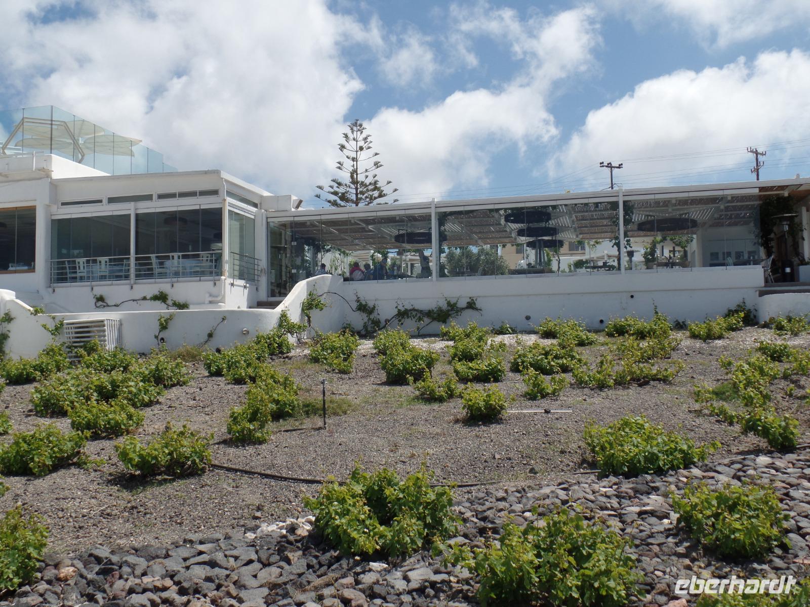 Da wir nicht verdursten dürfen, ist unser nächstes Ziel einer exclusive Weinverkostung mit einem kleinen Imbiss bei Santo Winery. Neben den einheimischen prämierten Weinen und dem Sekt genießen wir die fantastische Aussicht über die Caldera. Wir fahren dann erst einmal zu unserem Hotel Santo Miramare in Perissa. Hier haben wir Zeit etwas zu relaxen, ehe es zu unserer kleinen Inselrundfahrt zum Roten Strand und ins idyllische Dörfchen Megalochori geht. Hier begleitet uns Katrin, die es vor 20 Jahren von München auf die Insel verschlagen hat. Sie informiert uns über viel Wissenswertes zu Santorini.