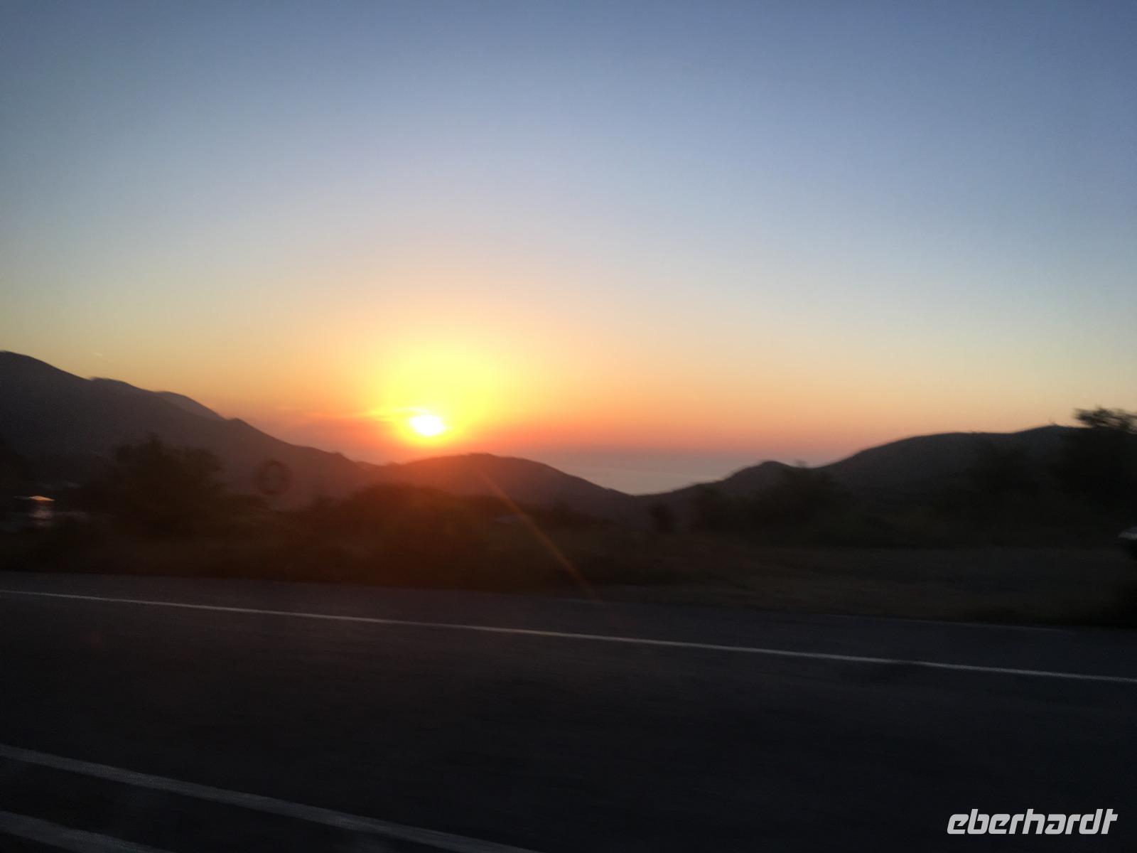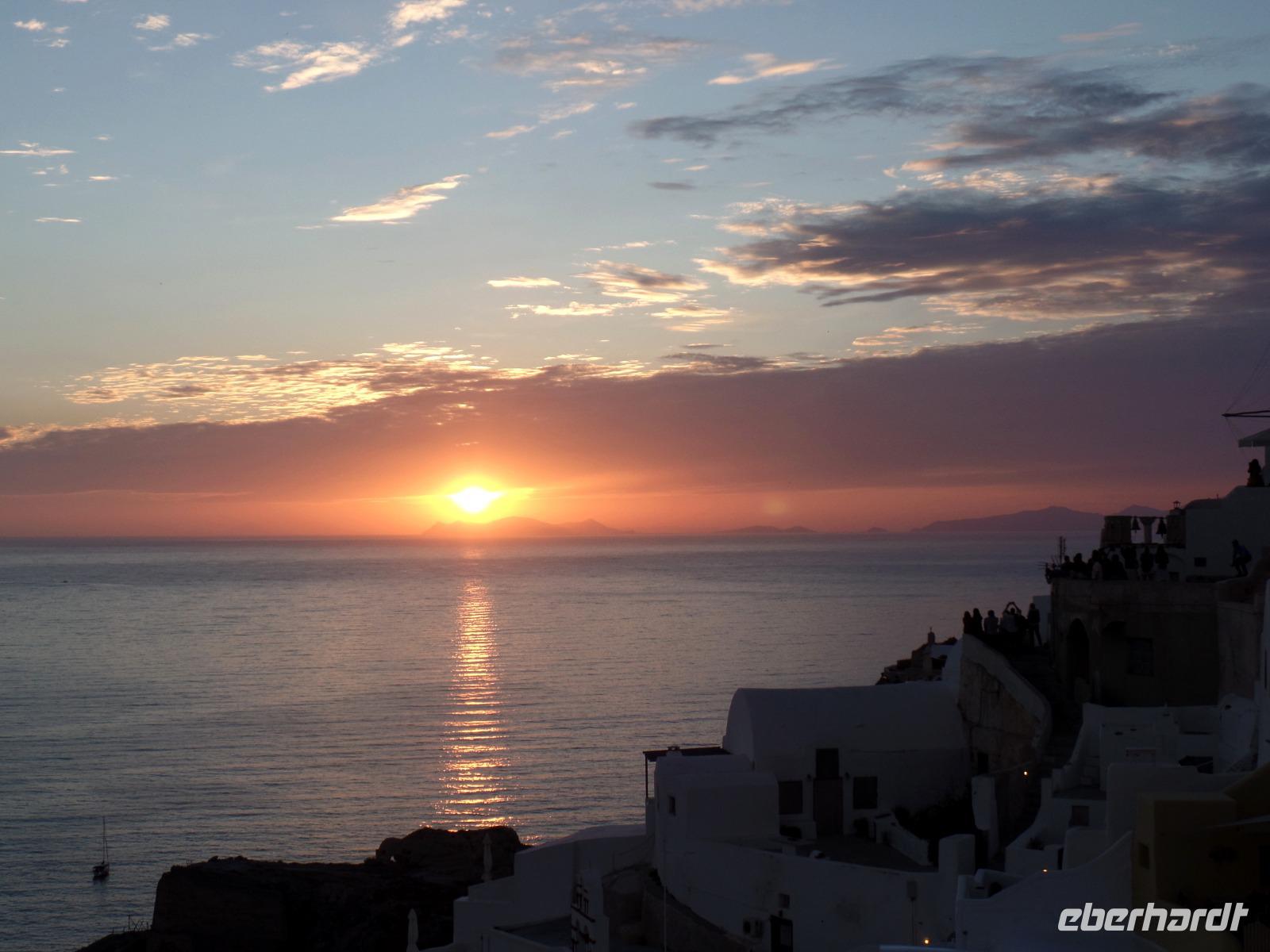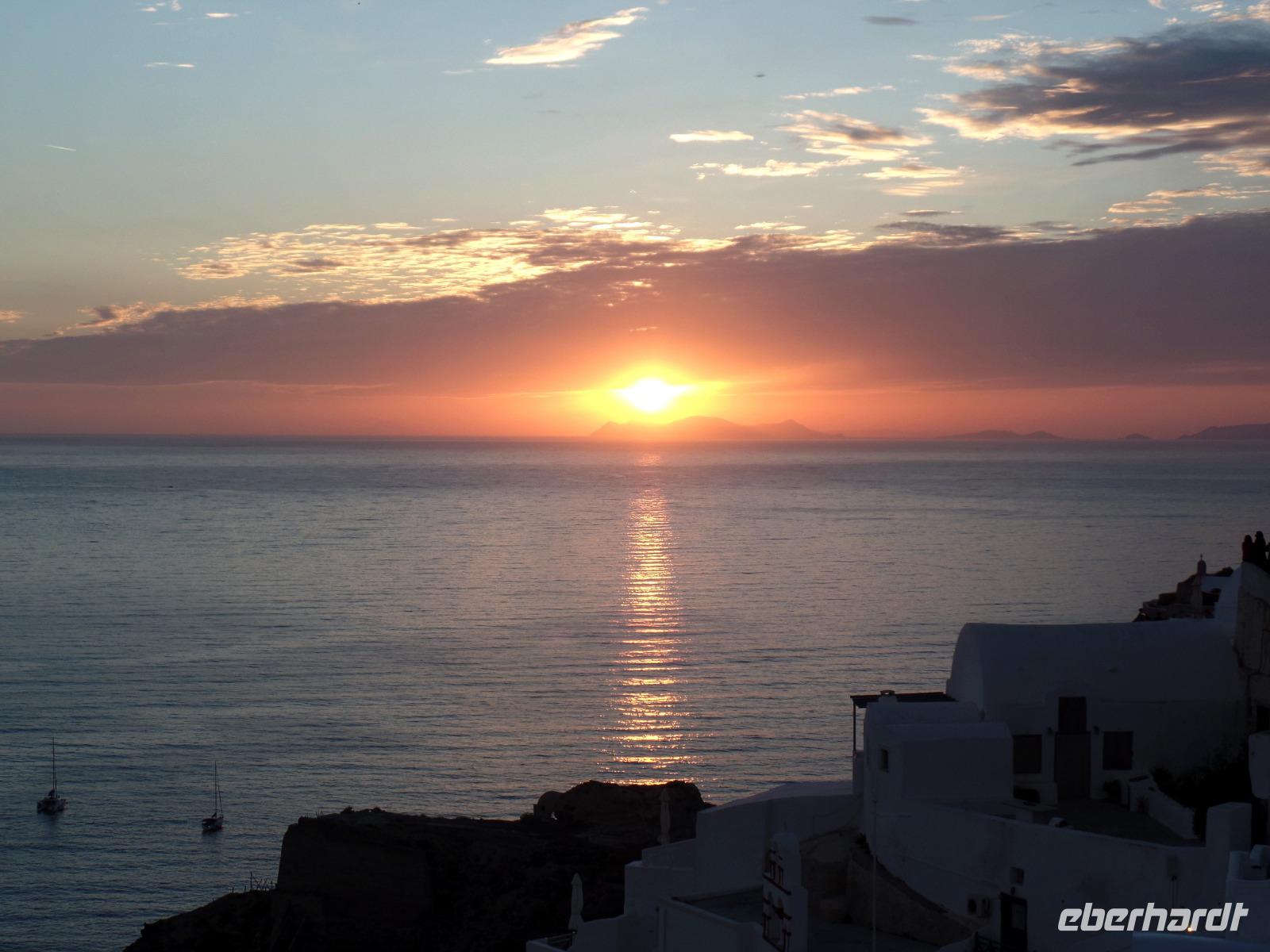 Heute geht es recht entspannt zu. Obwohl die Sonne erst mal hinter den Wolken verschwindet, zeigt sie sich uns wieder, und wir haben das Glück, einen herrlichen Sonnenuntergang erleben zu können. Allerdings "ditscht" sie, wie erhofft, nicht direkt ins Meer, sondern entschwindet vorher unseren Augen hinter der Insel Sikinos.