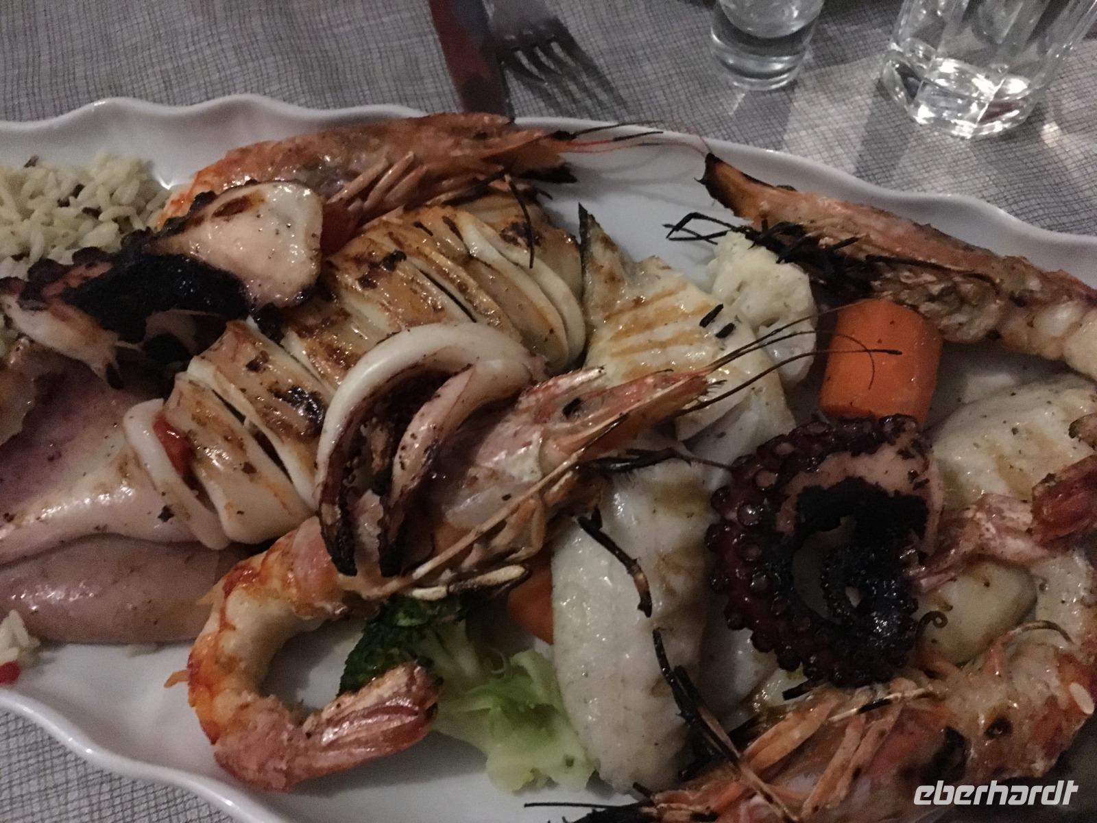 Wir genießen anschließend ein fantastisches Meeresfrüchte-Menü im Restaurant Skala mit Miesmuscheln, gegrilltem Fisch, Scampi, Oktopus und Tintenfisch.