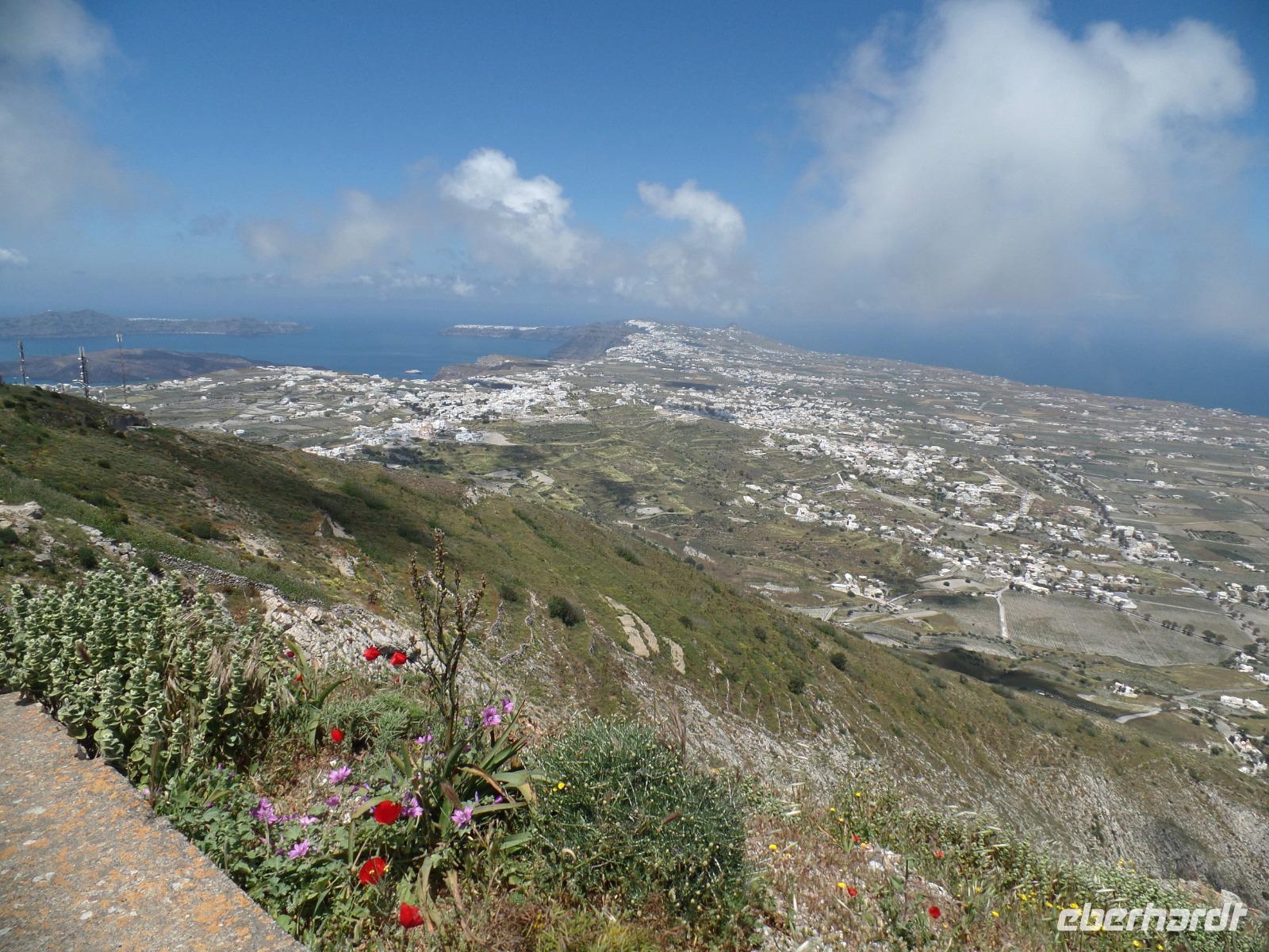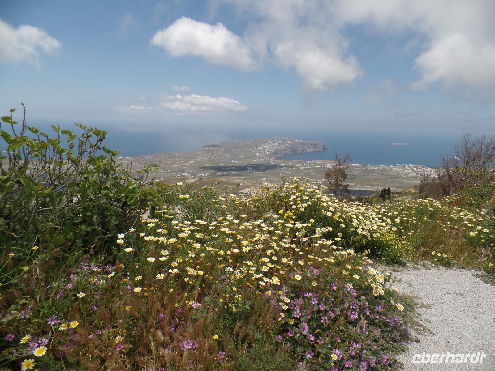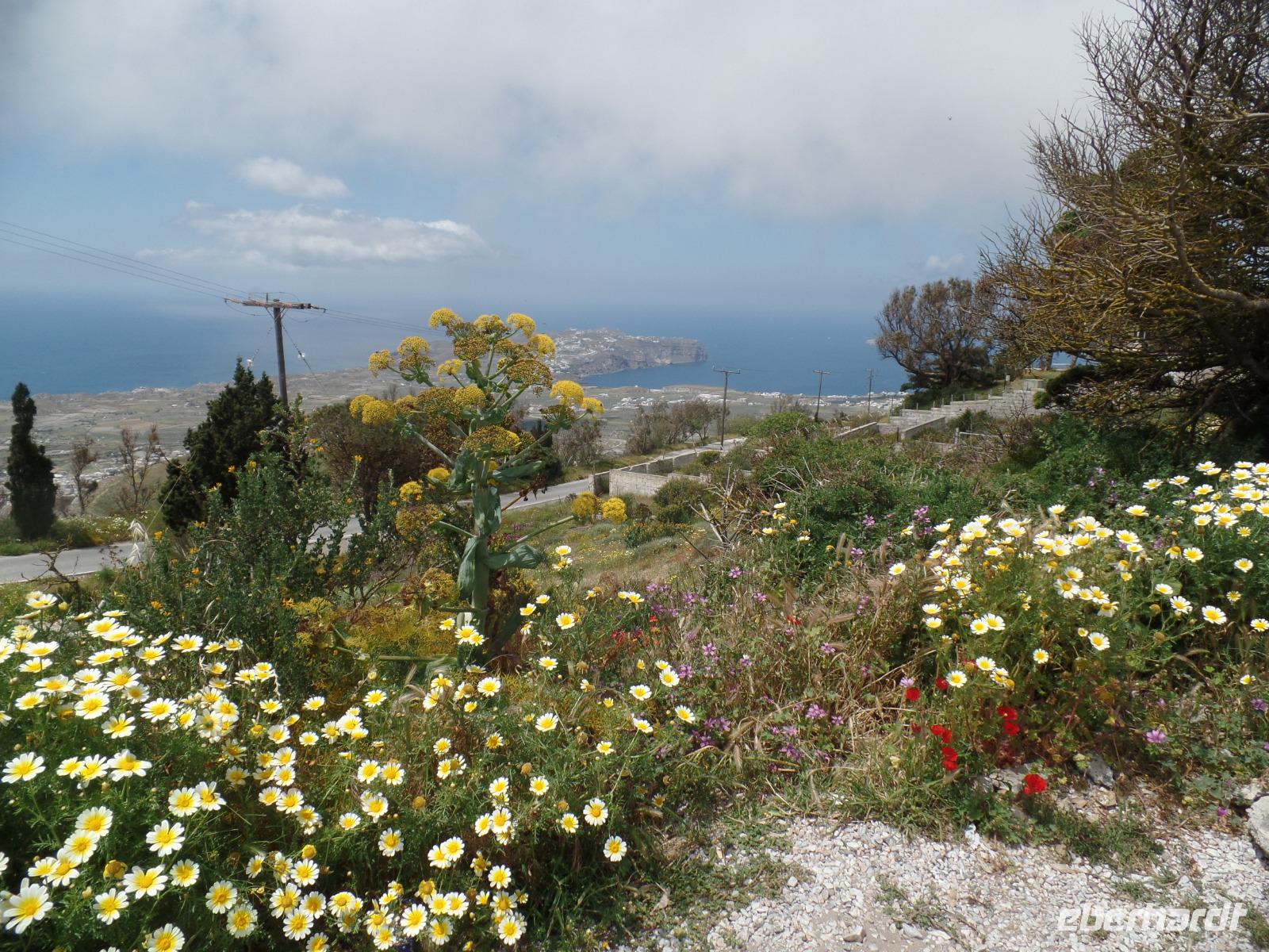 Mittags fahren wir auf den höchsten Berg von Santorin, den 566 m hohen Profitis Ilias. Von hier können wir den ganzen Calderabereich mit seinen Inseln überblicken. Jetzt im Mai verbreiten die Blumen eine herrliche Blütenpracht.