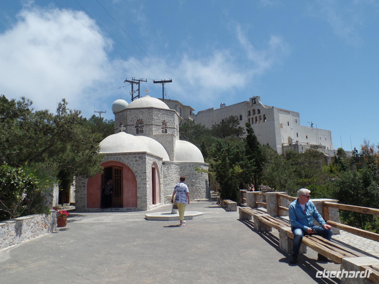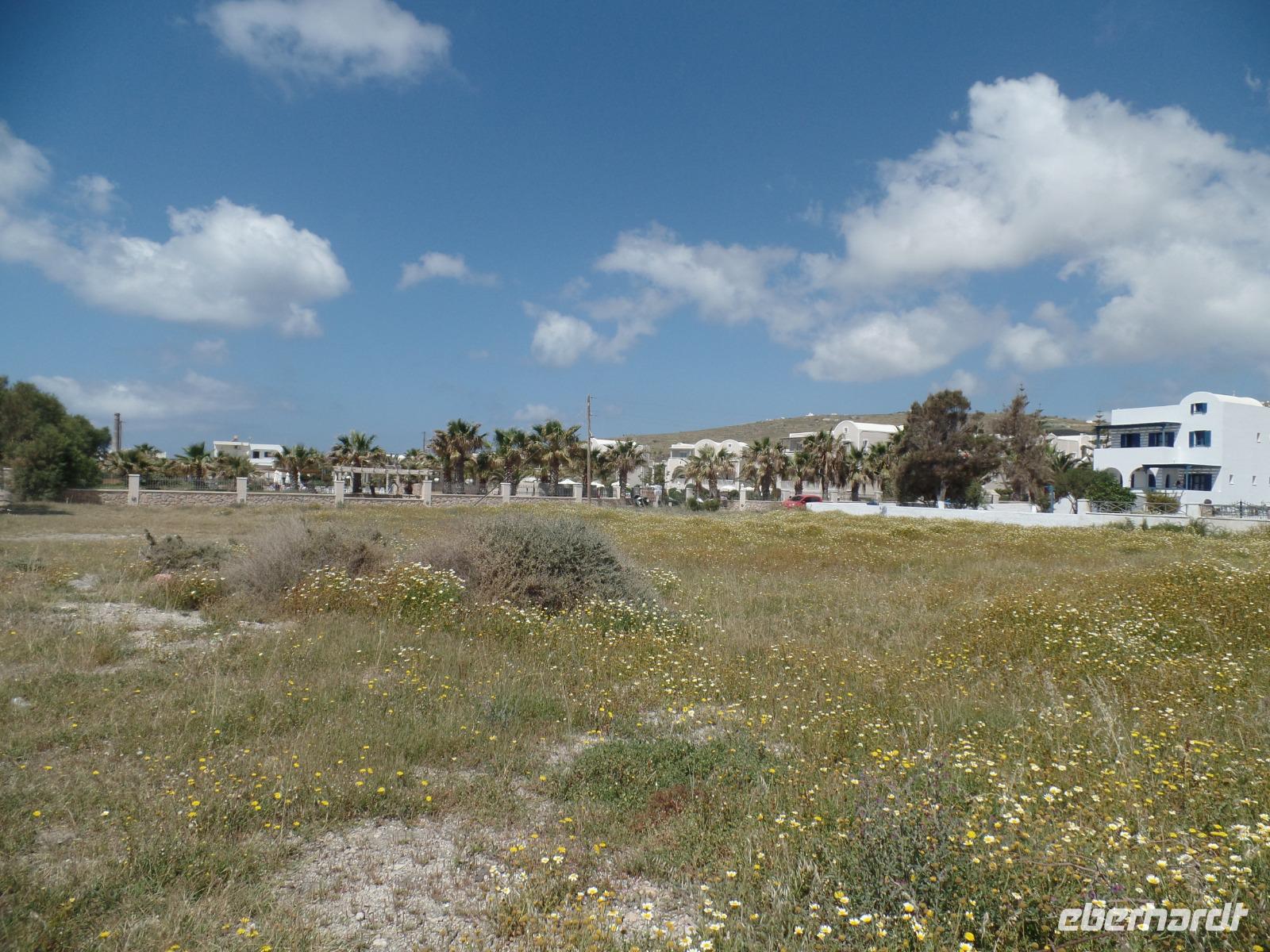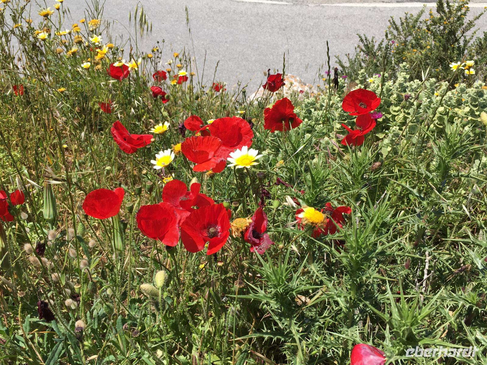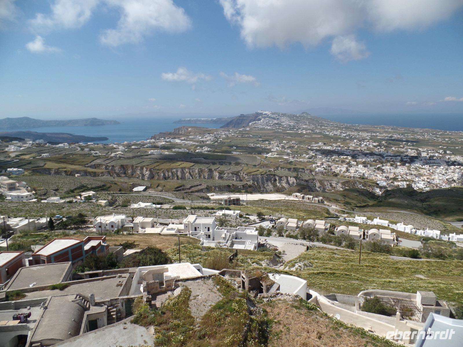 Mittags fahren wir auf den höchsten Berg von Santorin, den 566 m hohen Profitis Ilias. Von hier können wir den ganzen Calderabereich mit seinen Inseln überblicken. Jetzt im Mai verbreiten die Blumen eine herrliche Blütenpracht.