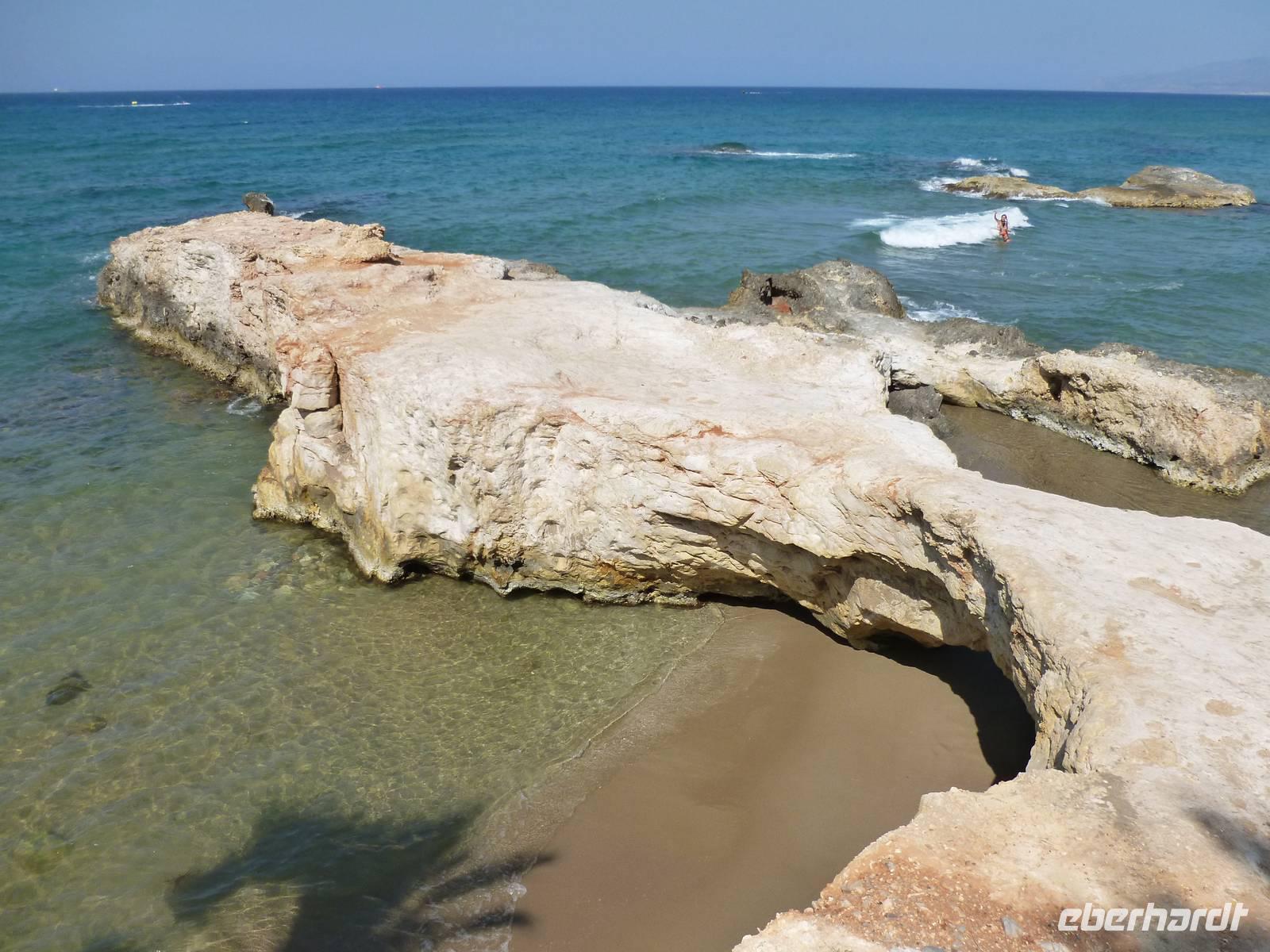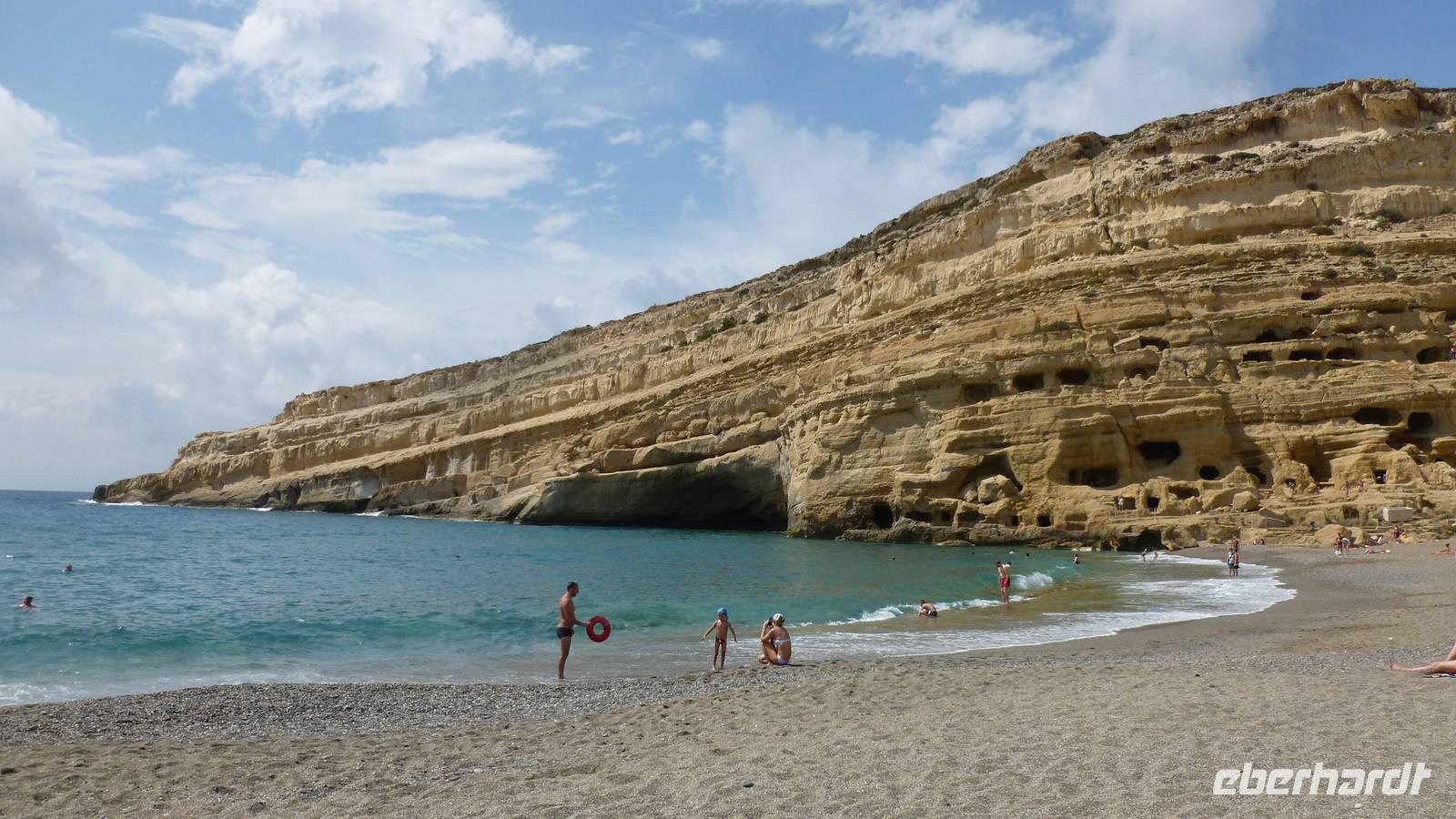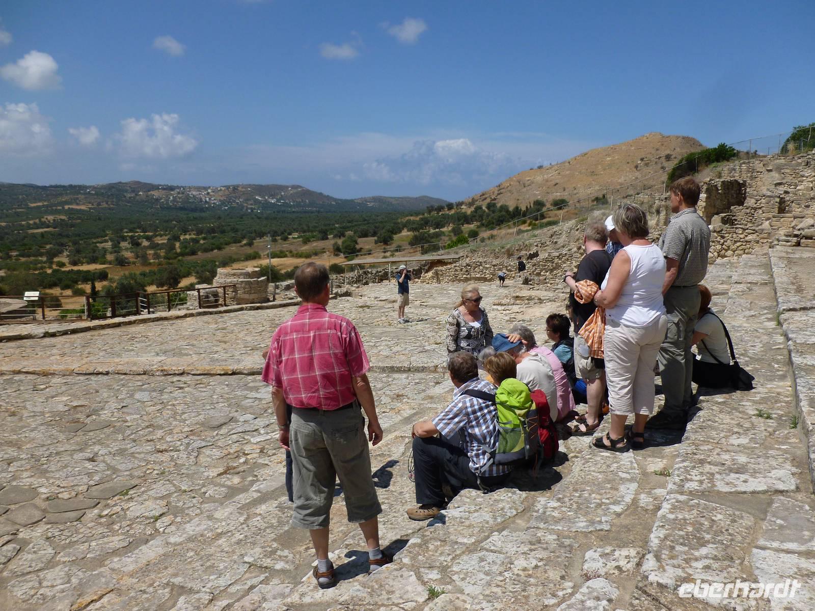 Bevor wir heute endlich wieder in unsere Wanderstiefel schlüpfen konnten, standen noch zwei kulturelle Höhepunkte auf dem Programm: die Ruinen von Gortys und Festos. Wir fuhren durch das Dorf „Agio Varvara" (=Heilige Barbara), das als Mittelpunkt Kretas gilt und hatten anschließend einen fantastischen Blick auf die Mesara-Ebene. Kurz darauf waren wir auch schon angekommen und besuchten das römische Odeon und bestaunten die in Stein gemeiselten Gesetze in dieser Ausgrabungsstätte. Kiki erklärte uns wieder sehr ausführlich und verständlich die geschichtlichen Hintergründe. Unser Busfahrer Georg chauffierte uns anschließend weiter in den beeindruckenden minoischen Palast Festos, von dem man wieder einen herrlichen Blick in die Mesara-Ebene hatte. Auch dort machten wir gemeinsam mit Kiki einen Rundgang vom Nordhof, der früher als Marktplatz gedient haben soll, weiter hangabwärts zum Westhof, der Tribüne und konnten auch einen Blick in die Magazine des Palastes werfen. Bevor wir uns wanderfertig machten, konnte sich jeder noch einmal etwas stärken. Dann begann die 8 Kilometer lange Wanderung vom kleinen Dorf Petsidia, dessen doch einfache Häuser traumhaft schön von prächtig blühenden Bouganvillen umrahmt waren - das war auf jeden Fall ein oder mehrere Fotos wert. Der teilweise asphaltierte Weg führte uns bergauf und bergab durch Oliven- und Aloehaine. Nach einer kurzen Raki-Pause hatten wir es auch schon geschafft und waren im kleinen Dorf Matala angekommen. Nun aber raus aus den Wanderstiefeln und ab ins Lybische Meer...oder ins Café nebenan um das Treiben zu beobachten. Nun machten wir uns auf den Weg nach Platanias ins Hotel Porto Platanias. Wieder neigt sich ein erlebnisreicher Wander- und Kulturtag dem Ende...