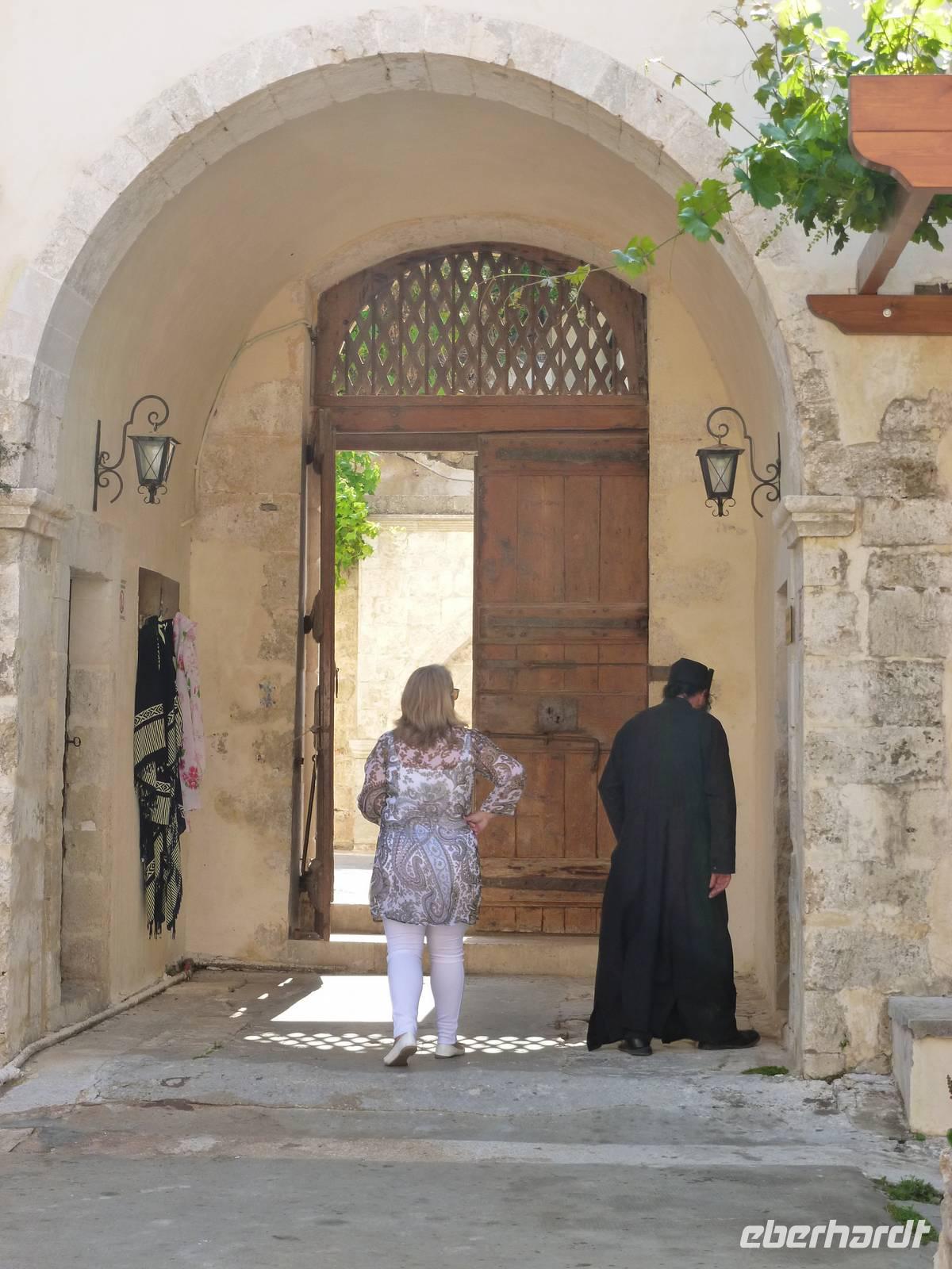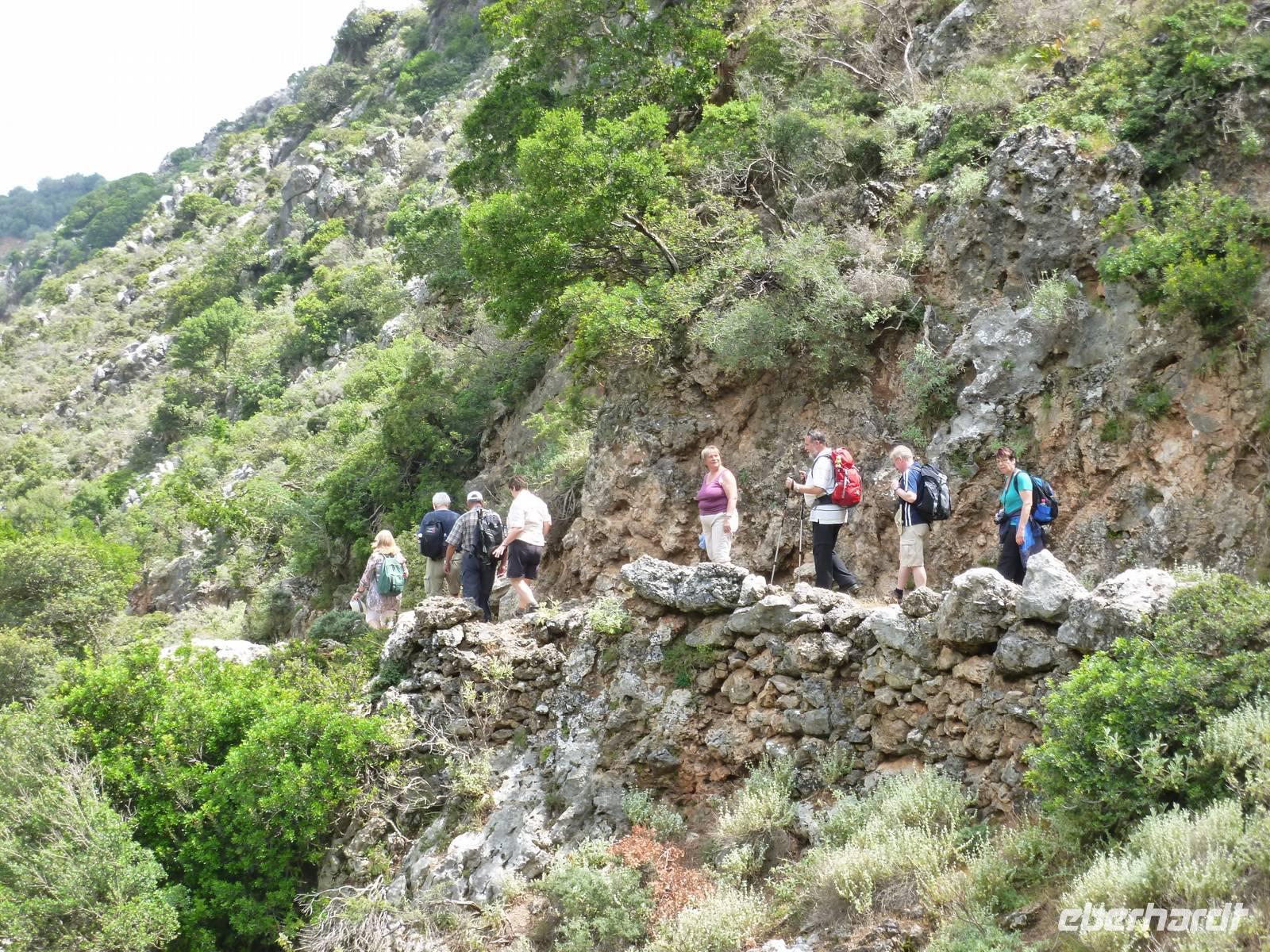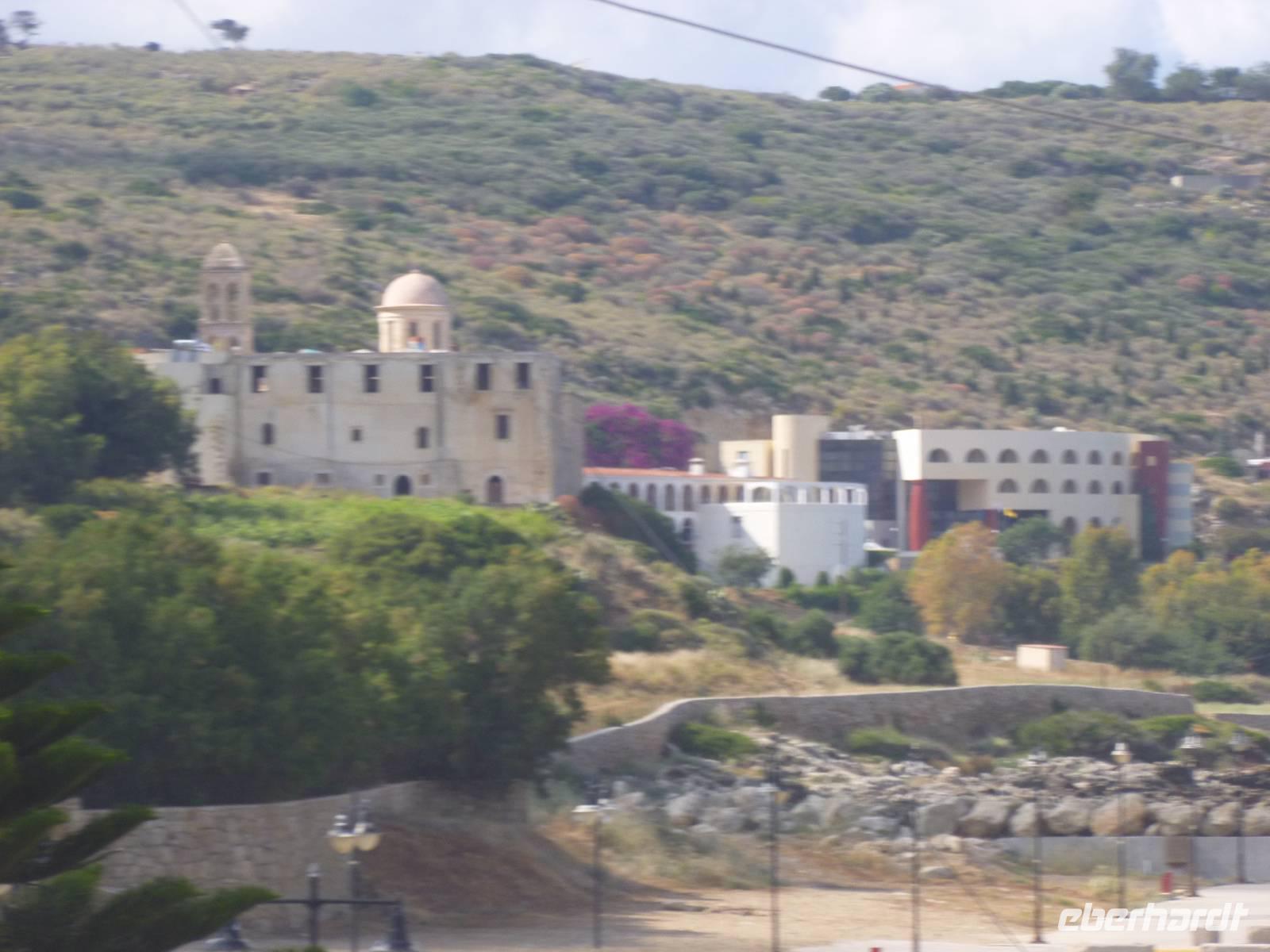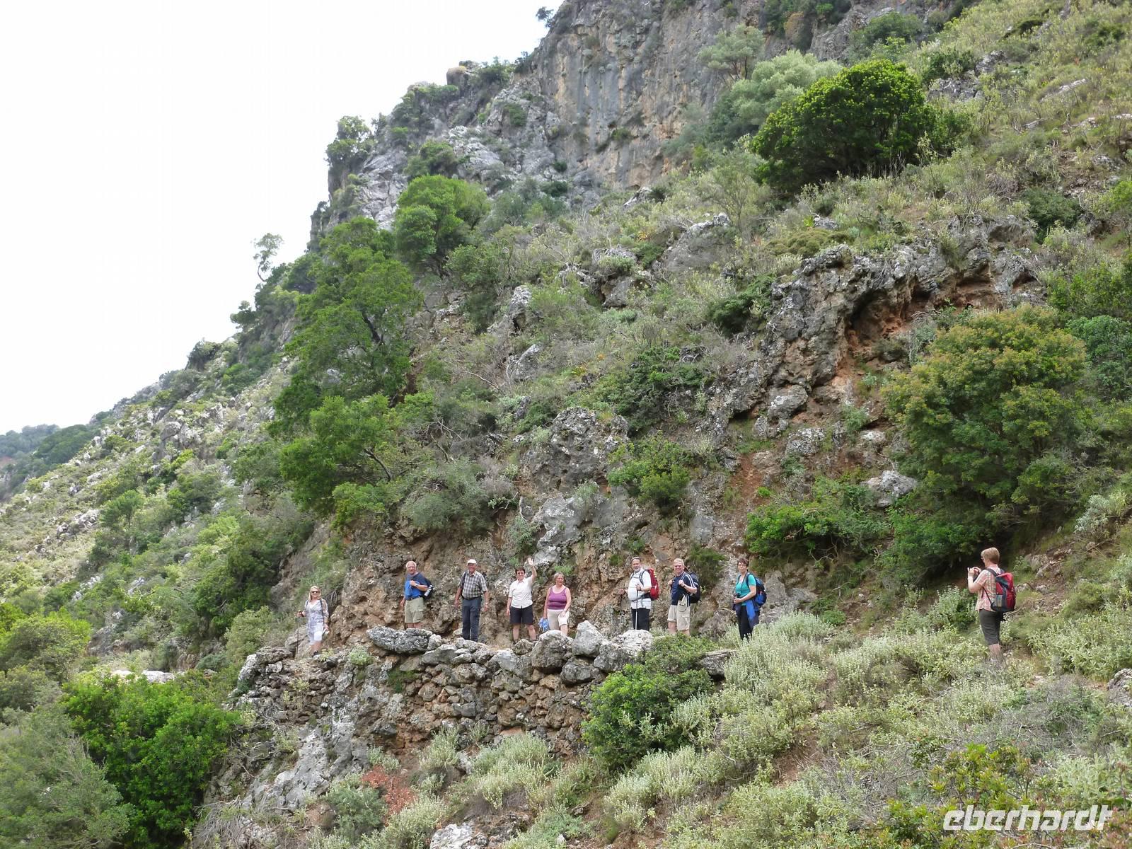 Da das Kloster zum Samstag erst um 16 Uhr öffnet, verschoben wir den Besuch auf den Nachmittag. Wir fuhren weiter nach Sirikari und starteten dort unsere Wanderung. Als erstes ging es eine ganze Weile steil bergab über mal große, mal kleinere Steine. Wir durchliefen die beeindruckende Tshikliana-Schlucht und genossen die eindrucksvollen Aussichten links und rechts und die Sonne setzte die Schlucht immer wieder sehr hübsch in Szene. Diese Eindrücke sollten schon mal ein kleiner Vorgeschmack auf die morgige, hoffentlich sonnige Wanderung in der spektakulären Samaria-Schlucht sein. Die 7 Kilometer waren schnell geschafft und schon stiegen wir wieder gut gelaunt in den Bus. Wir fuhren in das etwas abgelegene Dorf Kastelli um dort in der griechischen Taverne „Papadaki" ein köstliches Mittagessen einzunehmen. Die direkte Lage zum Mittelmeer lud zum Verweilen ein. Aber wir wollten ja auch noch das Kloster besichtigen, also machten wir uns wieder auf den Weg dahin. Diesmal stand uns Tür & Tor für einen Besuch offen. Kiki erklärte uns die wichtigsten Fakten bevor wir wieder den Heimweg antraten. Nun war noch genügend Zeit das Meer am hoteleigenen Strand zu testen und sich zu erfrischen.