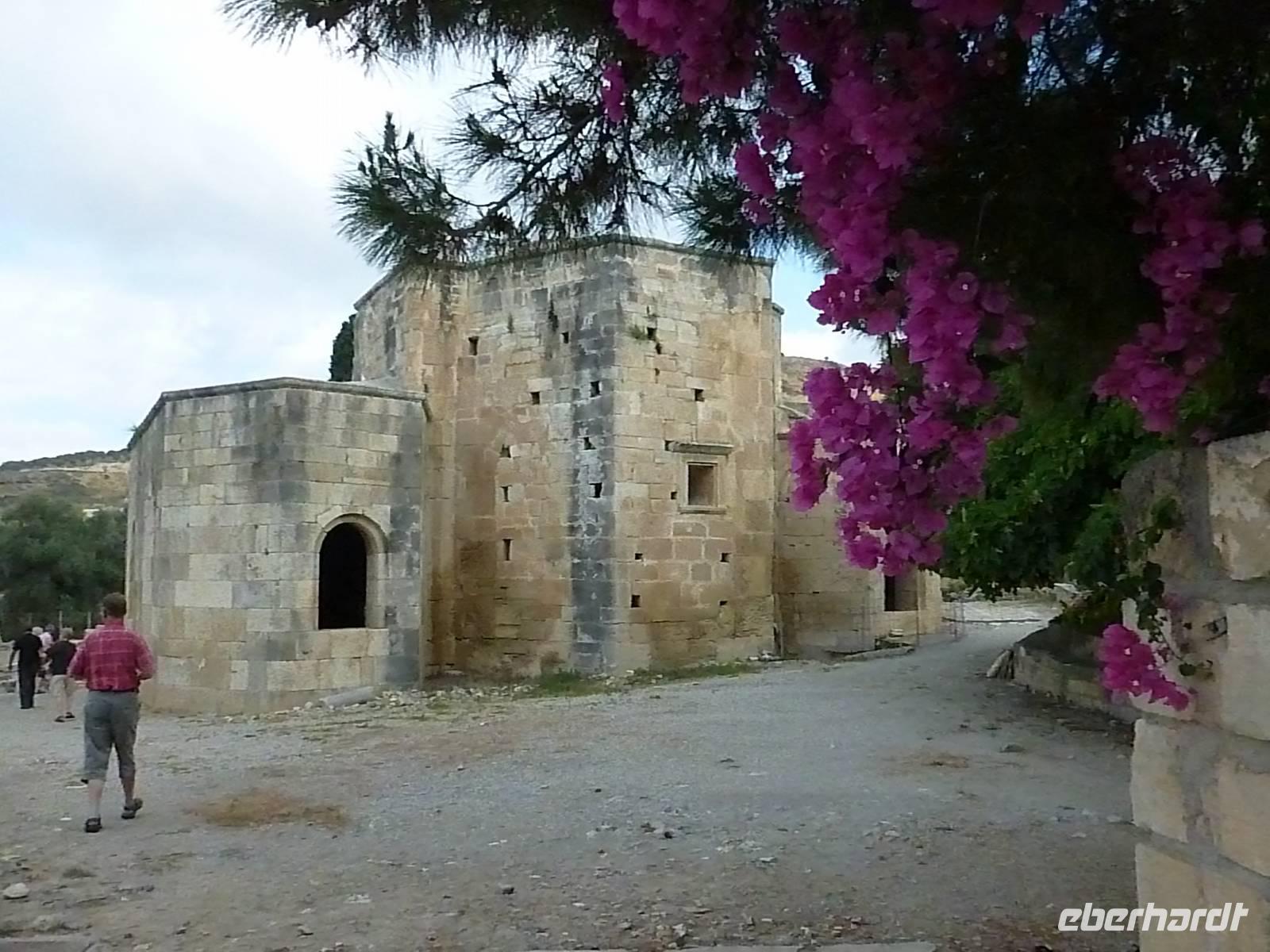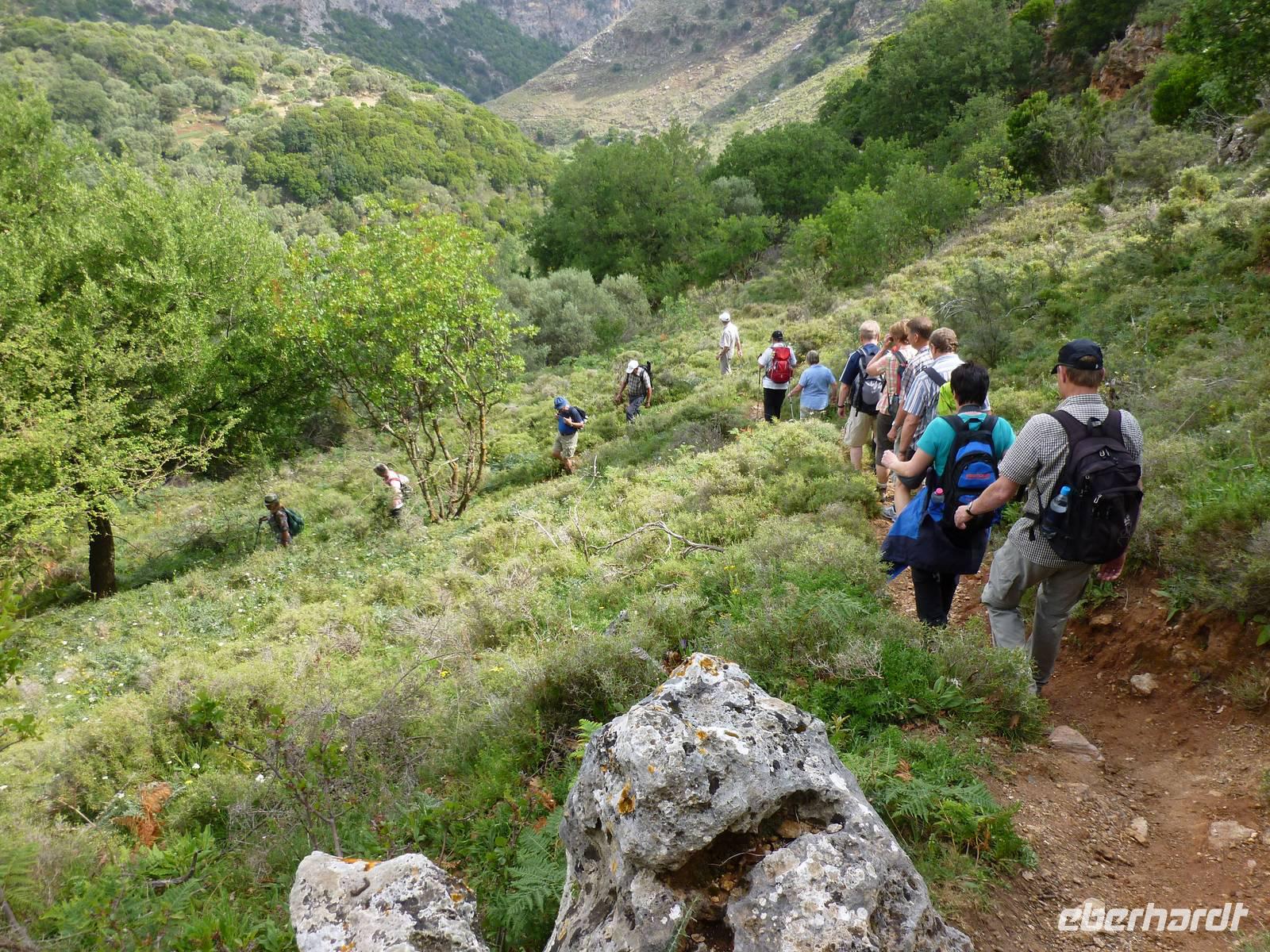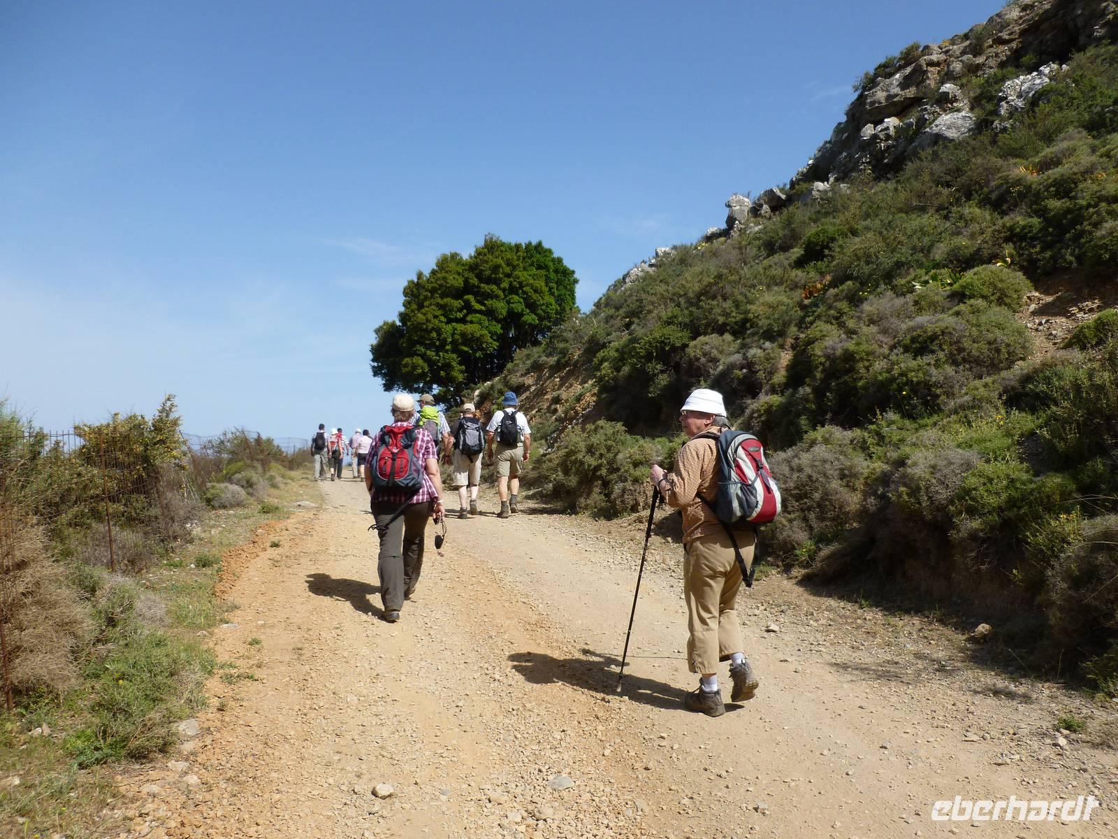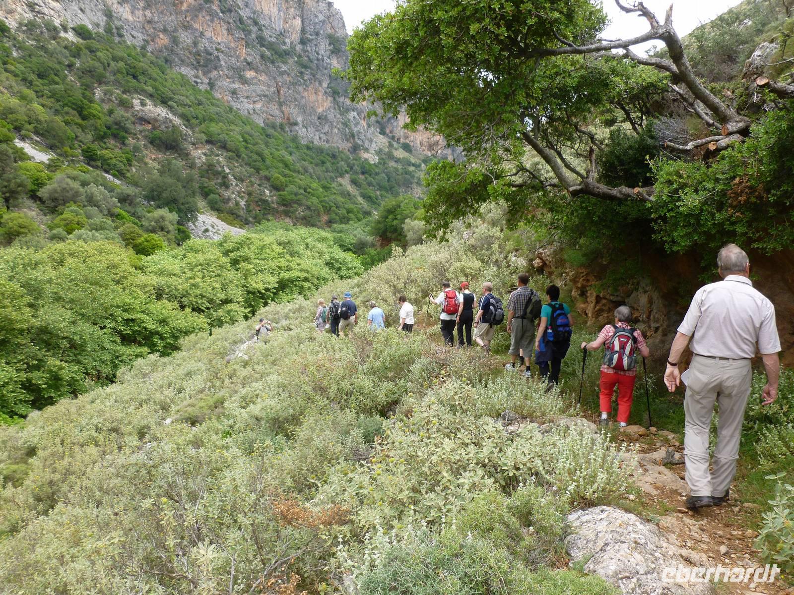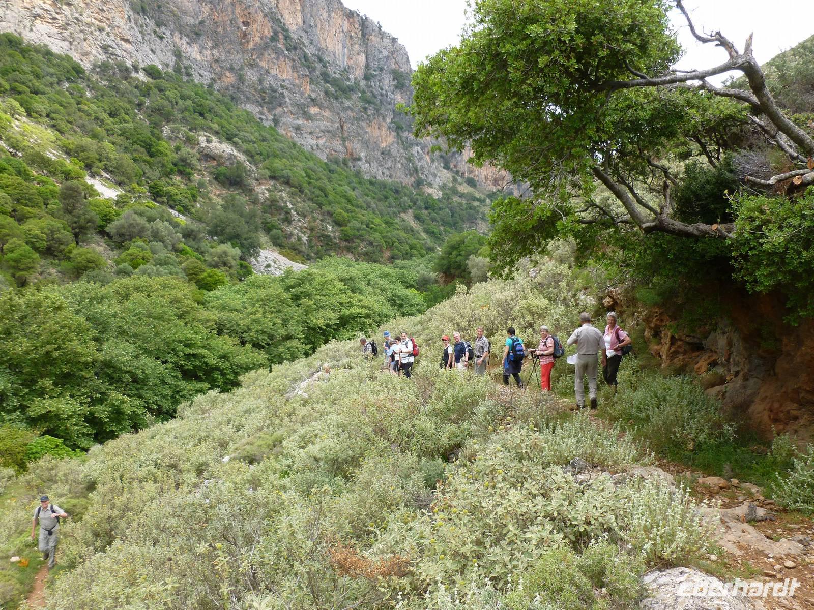 Da das Kloster zum Samstag erst um 16 Uhr öffnet, verschoben wir den Besuch auf den Nachmittag. Wir fuhren weiter nach Sirikari und starteten dort unsere Wanderung. Als erstes ging es eine ganze Weile steil bergab über mal große, mal kleinere Steine. Wir durchliefen die beeindruckende Tshikliana-Schlucht und genossen die eindrucksvollen Aussichten links und rechts und die Sonne setzte die Schlucht immer wieder sehr hübsch in Szene. Diese Eindrücke sollten schon mal ein kleiner Vorgeschmack auf die morgige, hoffentlich sonnige Wanderung in der spektakulären Samaria-Schlucht sein. Die 7 Kilometer waren schnell geschafft und schon stiegen wir wieder gut gelaunt in den Bus. Wir fuhren in das etwas abgelegene Dorf Kastelli um dort in der griechischen Taverne „Papadaki" ein köstliches Mittagessen einzunehmen. Die direkte Lage zum Mittelmeer lud zum Verweilen ein. Aber wir wollten ja auch noch das Kloster besichtigen, also machten wir uns wieder auf den Weg dahin. Diesmal stand uns Tür & Tor für einen Besuch offen. Kiki erklärte uns die wichtigsten Fakten bevor wir wieder den Heimweg antraten. Nun war noch genügend Zeit das Meer am hoteleigenen Strand zu testen und sich zu erfrischen.
