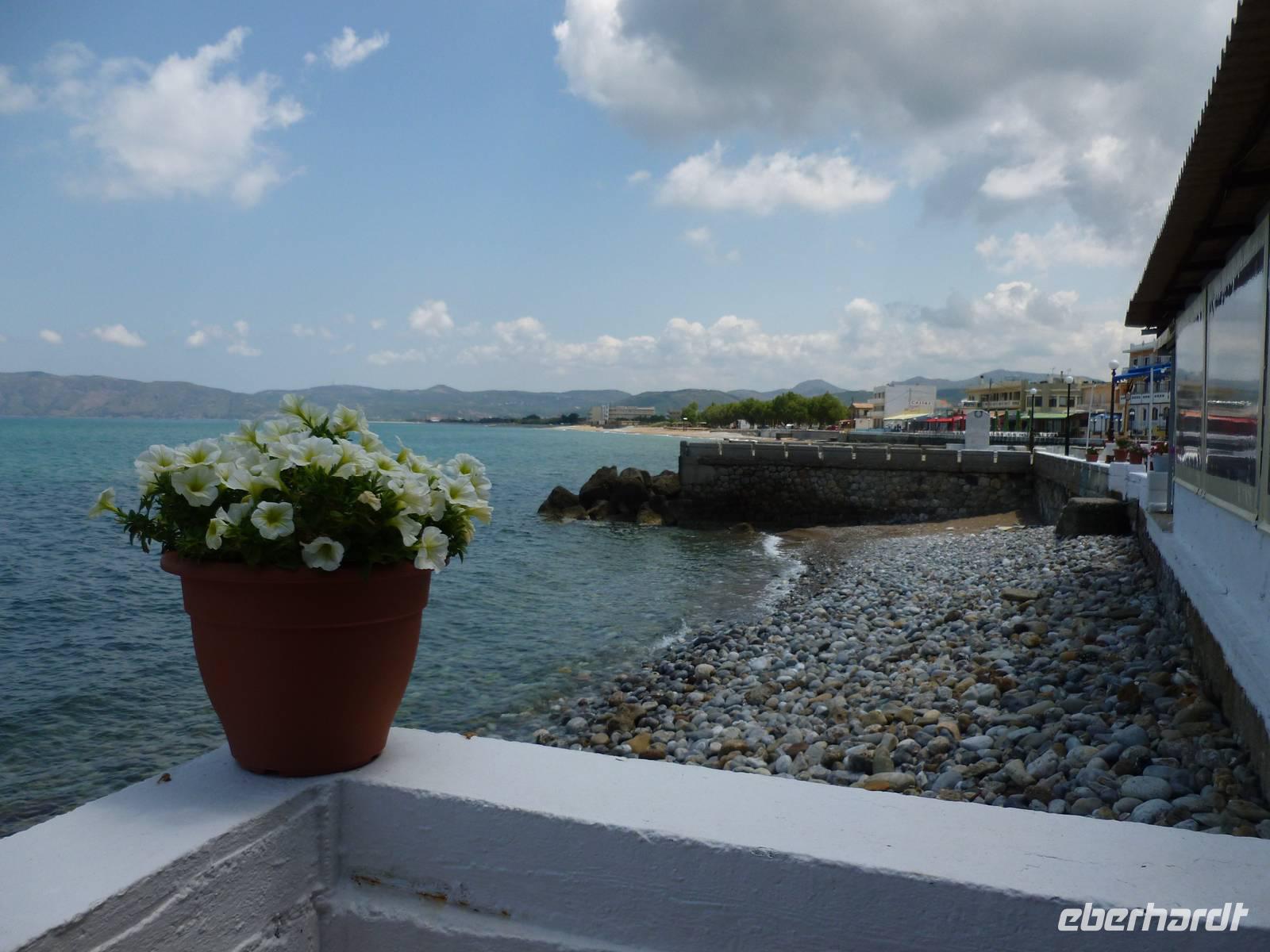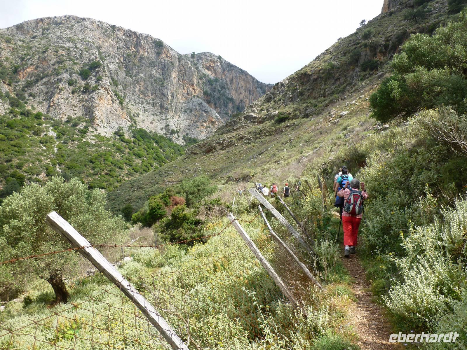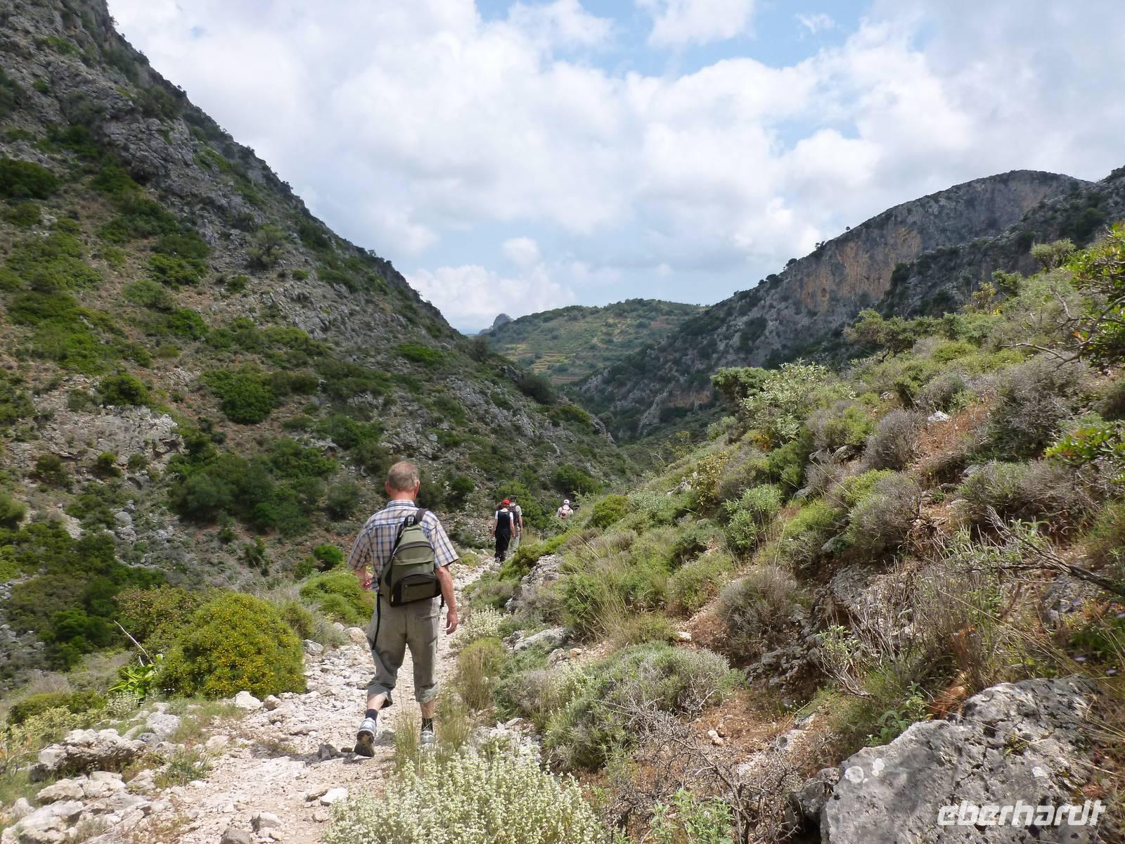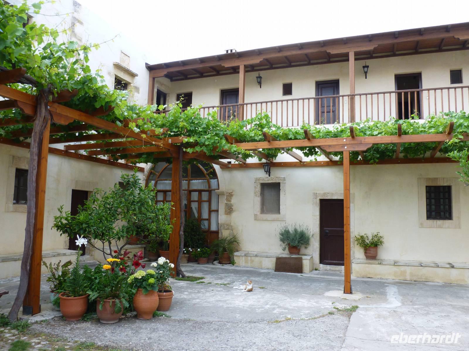 Da das Kloster zum Samstag erst um 16 Uhr öffnet, verschoben wir den Besuch auf den Nachmittag. Wir fuhren weiter nach Sirikari und starteten dort unsere Wanderung. Als erstes ging es eine ganze Weile steil bergab über mal große, mal kleinere Steine. Wir durchliefen die beeindruckende Tshikliana-Schlucht und genossen die eindrucksvollen Aussichten links und rechts und die Sonne setzte die Schlucht immer wieder sehr hübsch in Szene. Diese Eindrücke sollten schon mal ein kleiner Vorgeschmack auf die morgige, hoffentlich sonnige Wanderung in der spektakulären Samaria-Schlucht sein. Die 7 Kilometer waren schnell geschafft und schon stiegen wir wieder gut gelaunt in den Bus. Wir fuhren in das etwas abgelegene Dorf Kastelli um dort in der griechischen Taverne „Papadaki" ein köstliches Mittagessen einzunehmen. Die direkte Lage zum Mittelmeer lud zum Verweilen ein. Aber wir wollten ja auch noch das Kloster besichtigen, also machten wir uns wieder auf den Weg dahin. Diesmal stand uns Tür & Tor für einen Besuch offen. Kiki erklärte uns die wichtigsten Fakten bevor wir wieder den Heimweg antraten. Nun war noch genügend Zeit das Meer am hoteleigenen Strand zu testen und sich zu erfrischen.
