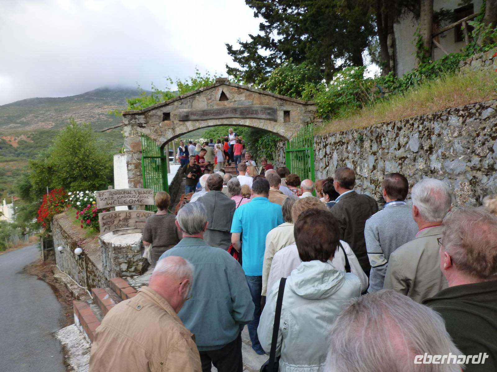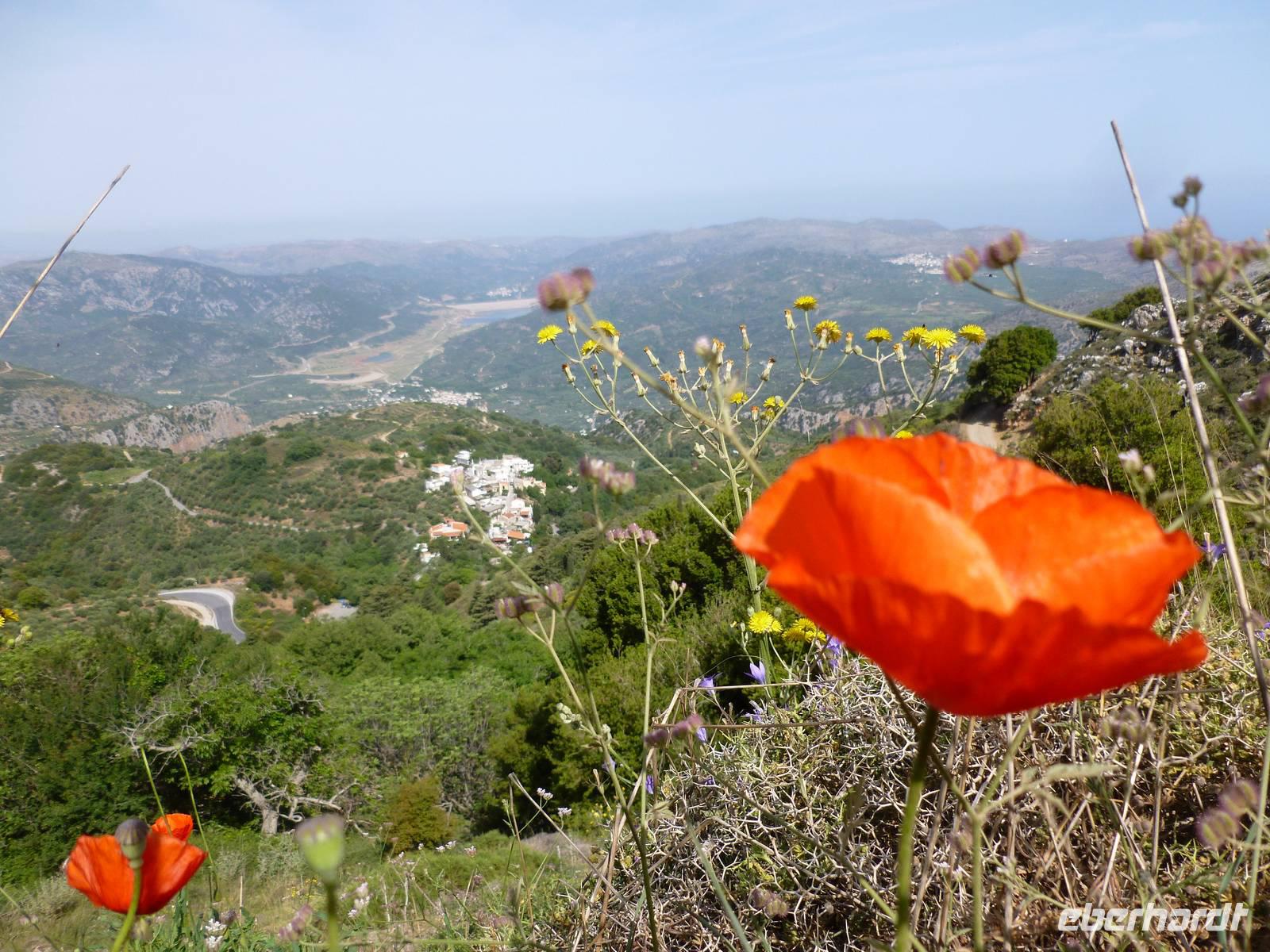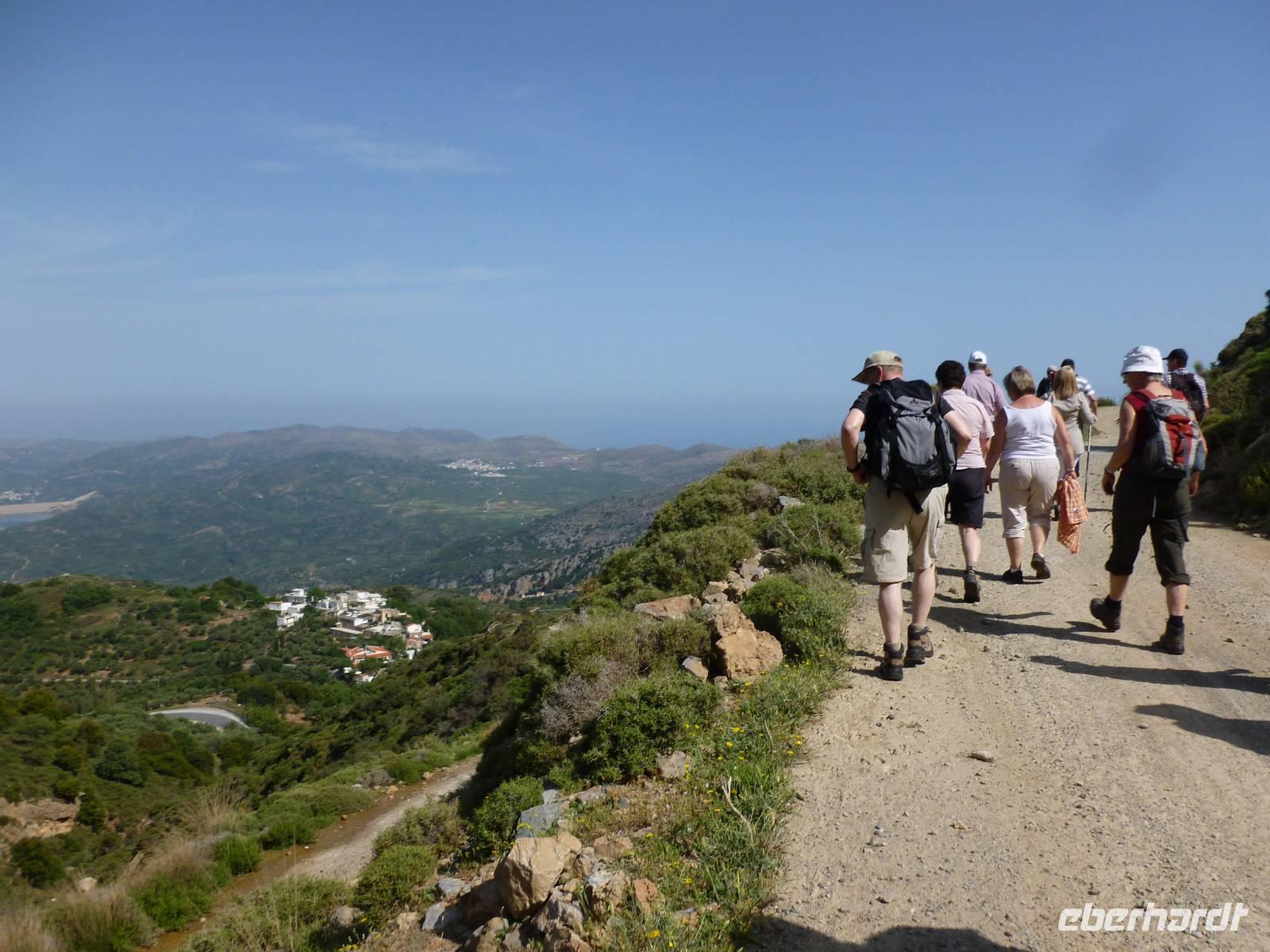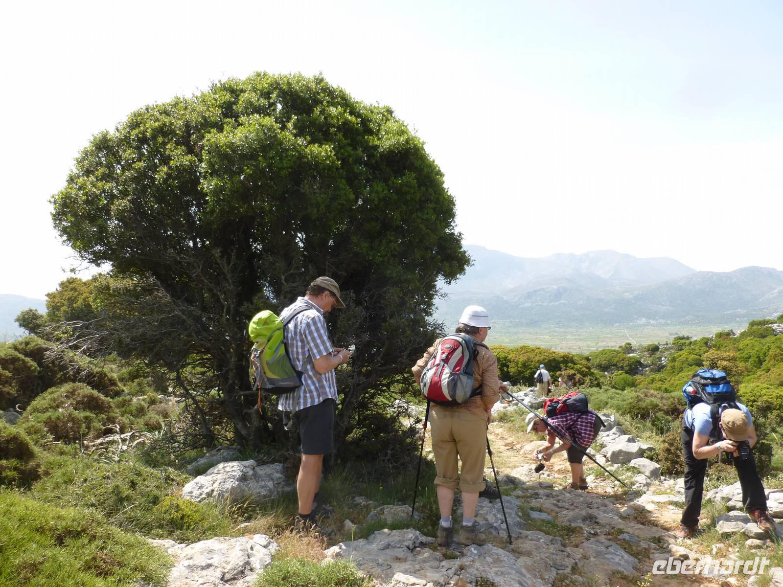 Nach einem stärkenden Frühstück schnürten wir die Wanderstiefel und waren alle ganz gespannt auf den heutigen Tag. Unsere Wanderreiseleiterin Kiki begrüßte uns und schon konnte es losgehen. Als erstes fuhren wir eine knappe dreiviertel Stunde zum Kloster Kera Kardiotissa. Da wir dies einen Tag nach Ostermontag besichtigten, wurden wir mit einem frischgebackenen Ostergebäck empfangen und auch am Wasserautomaten konnten wir uns bedienen. Kiki erklärte uns die geschichtlichen Hintergründe dieses Klosters und auch eine Menge mehr zu Land und Leuten. In der kleinen beschaulichen Kirche selbst konnten wir die aus dem 14. Jh. Stammenden Fresken bewundern. Anschließend fuhren wir weiter zur Lashiti-Ebene. Wie wanderten von Kera entlang einer Schotterstraße bergauf, bis zum Abzweig nach Tzermiado. Dann ging es über einen Schotterweg meist bergab vorbei an eindrucksvollen Gewächsen wie der Zistrose, der Totenblume, kleinen Orchideen oder dem Drachenblut. Kiki war auch in der Flora sehr bewandert und konnte zu jeder Blume den lateinischen Namen nennen. Auch eine Nachahmung eines Stierkampfes konnten wir ganz ohne Eintritt bestaunen und mit fiebern wer der stärkere Ziegenbock war. In Tzermiado angekommen, bog auch schon unser Busfahrer Georg um die Ecke und wir konnten weiter fahren in die Höhle des Zeus, dort wo selbiger angeblich geboren wurde. Nach einem steilen Aufstieg ging es steil bergab in die erfrischend kühle Höhle. Wieder am Bus angekommen fuhren wir weiter zu einer kurzen Mittagspause, bevor wir die malerische Hafenstadt Agios Nikolaos besuchten. Die Stadt, die übersetzt der Heilige Nikolaus bedeutet, erkundeten wir nun auf eigene Faust. Bei einem gemütlichen Kaffee ließen wir diesen erlebnisreichen Wandertag ausklingen.