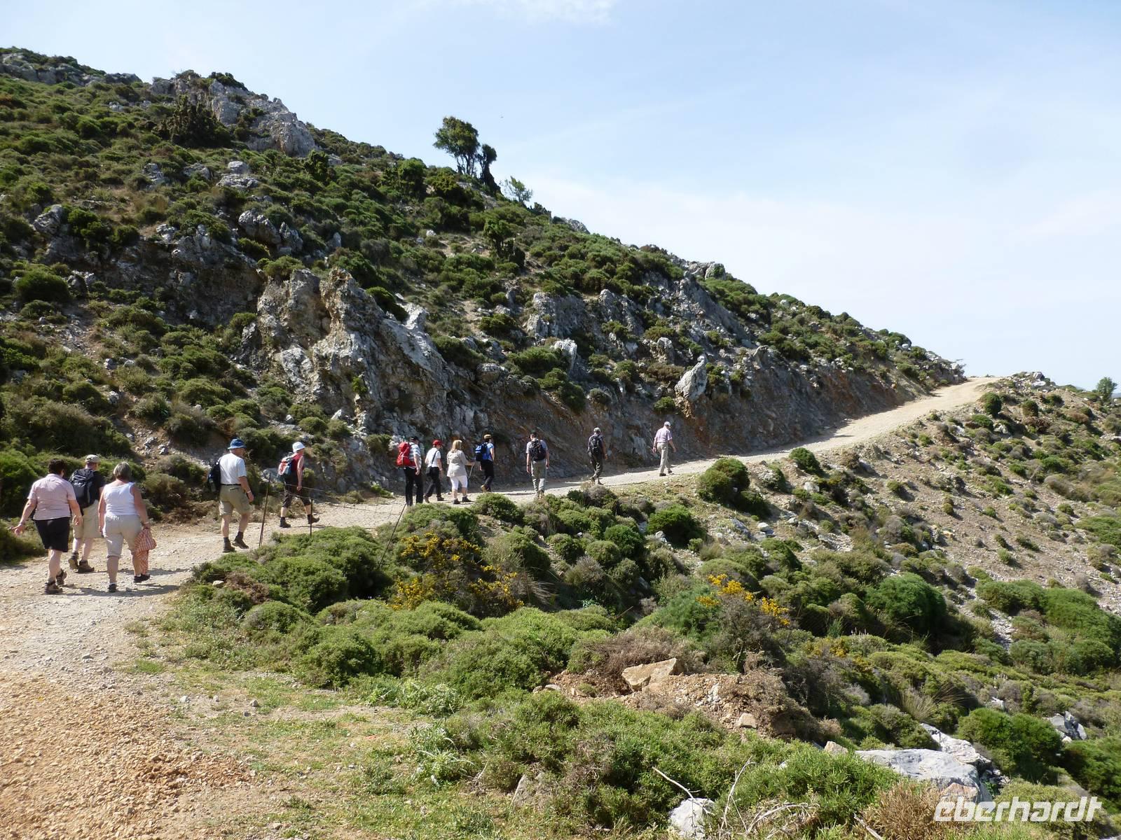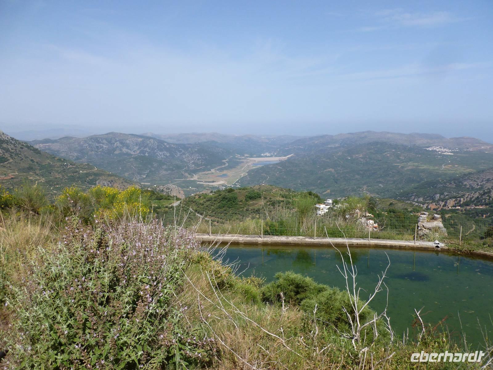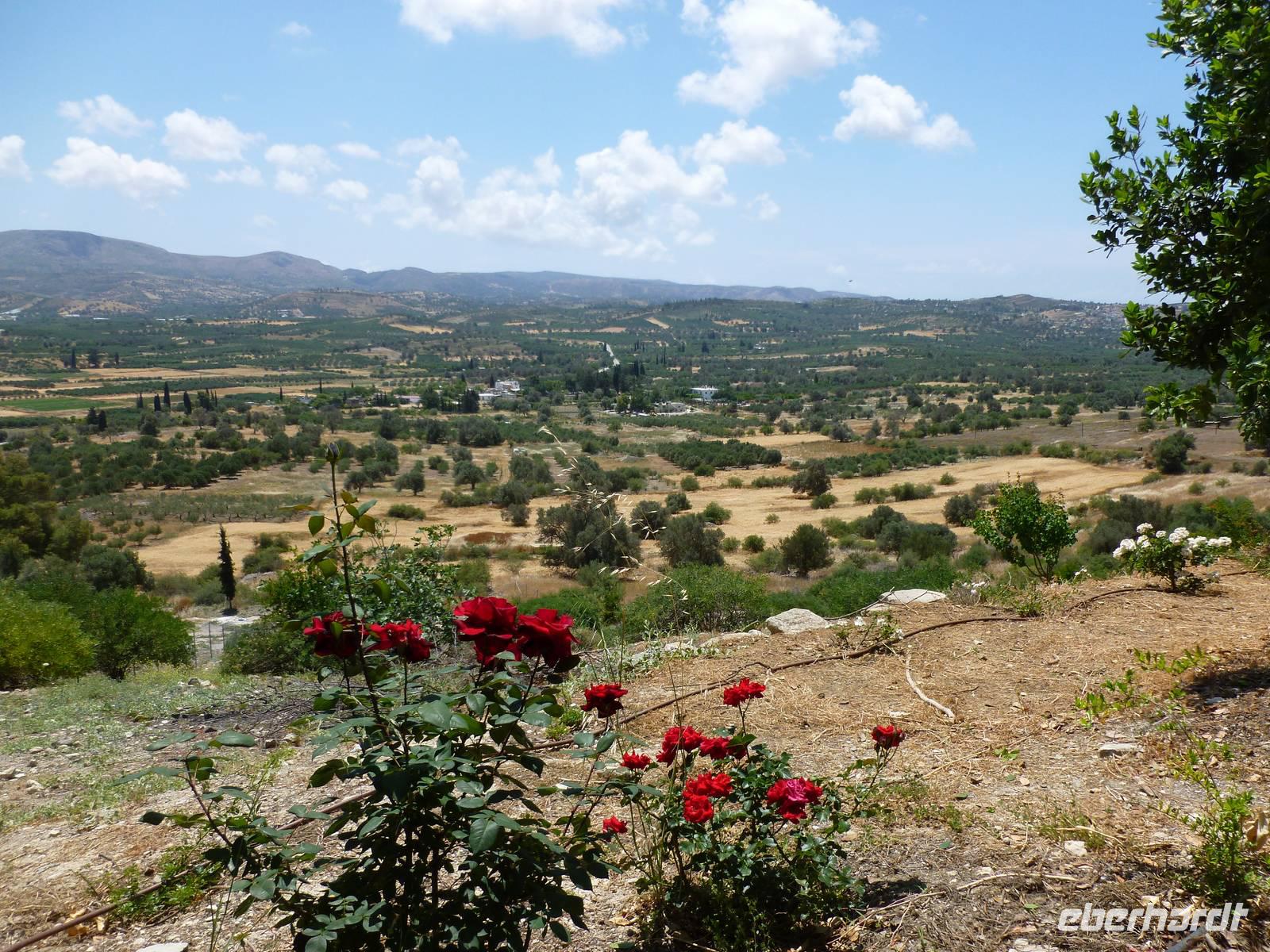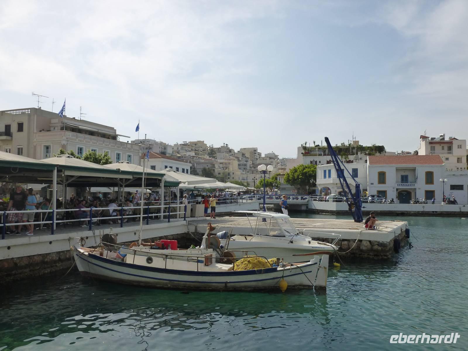 Nach einem stärkenden Frühstück schnürten wir die Wanderstiefel und waren alle ganz gespannt auf den heutigen Tag. Unsere Wanderreiseleiterin Kiki begrüßte uns und schon konnte es losgehen. Als erstes fuhren wir eine knappe dreiviertel Stunde zum Kloster Kera Kardiotissa. Da wir dies einen Tag nach Ostermontag besichtigten, wurden wir mit einem frischgebackenen Ostergebäck empfangen und auch am Wasserautomaten konnten wir uns bedienen. Kiki erklärte uns die geschichtlichen Hintergründe dieses Klosters und auch eine Menge mehr zu Land und Leuten. In der kleinen beschaulichen Kirche selbst konnten wir die aus dem 14. Jh. Stammenden Fresken bewundern. Anschließend fuhren wir weiter zur Lashiti-Ebene. Wie wanderten von Kera entlang einer Schotterstraße bergauf, bis zum Abzweig nach Tzermiado. Dann ging es über einen Schotterweg meist bergab vorbei an eindrucksvollen Gewächsen wie der Zistrose, der Totenblume, kleinen Orchideen oder dem Drachenblut. Kiki war auch in der Flora sehr bewandert und konnte zu jeder Blume den lateinischen Namen nennen. Auch eine Nachahmung eines Stierkampfes konnten wir ganz ohne Eintritt bestaunen und mit fiebern wer der stärkere Ziegenbock war. In Tzermiado angekommen, bog auch schon unser Busfahrer Georg um die Ecke und wir konnten weiter fahren in die Höhle des Zeus, dort wo selbiger angeblich geboren wurde. Nach einem steilen Aufstieg ging es steil bergab in die erfrischend kühle Höhle. Wieder am Bus angekommen fuhren wir weiter zu einer kurzen Mittagspause, bevor wir die malerische Hafenstadt Agios Nikolaos besuchten. Die Stadt, die übersetzt der Heilige Nikolaus bedeutet, erkundeten wir nun auf eigene Faust. Bei einem gemütlichen Kaffee ließen wir diesen erlebnisreichen Wandertag ausklingen.