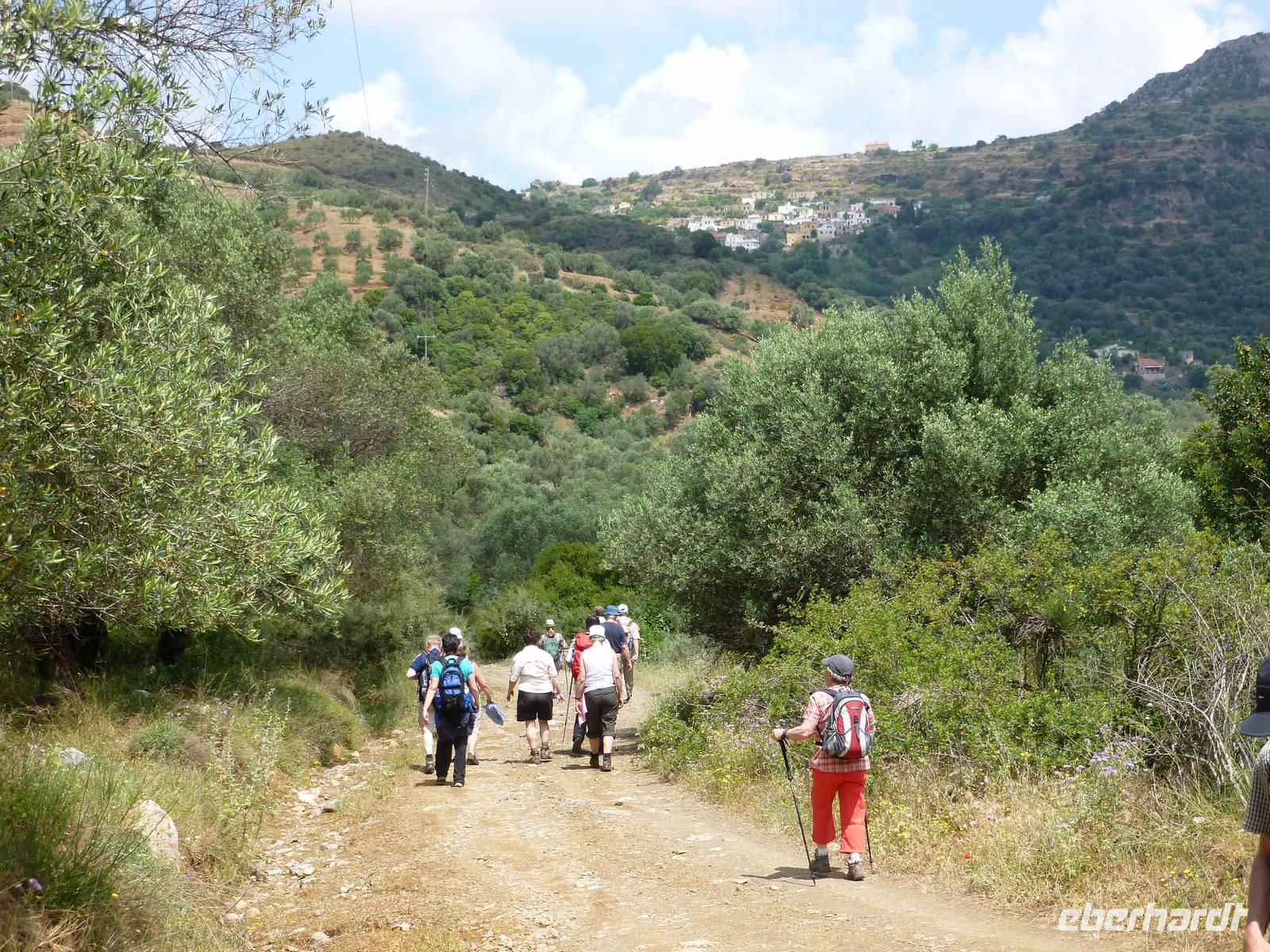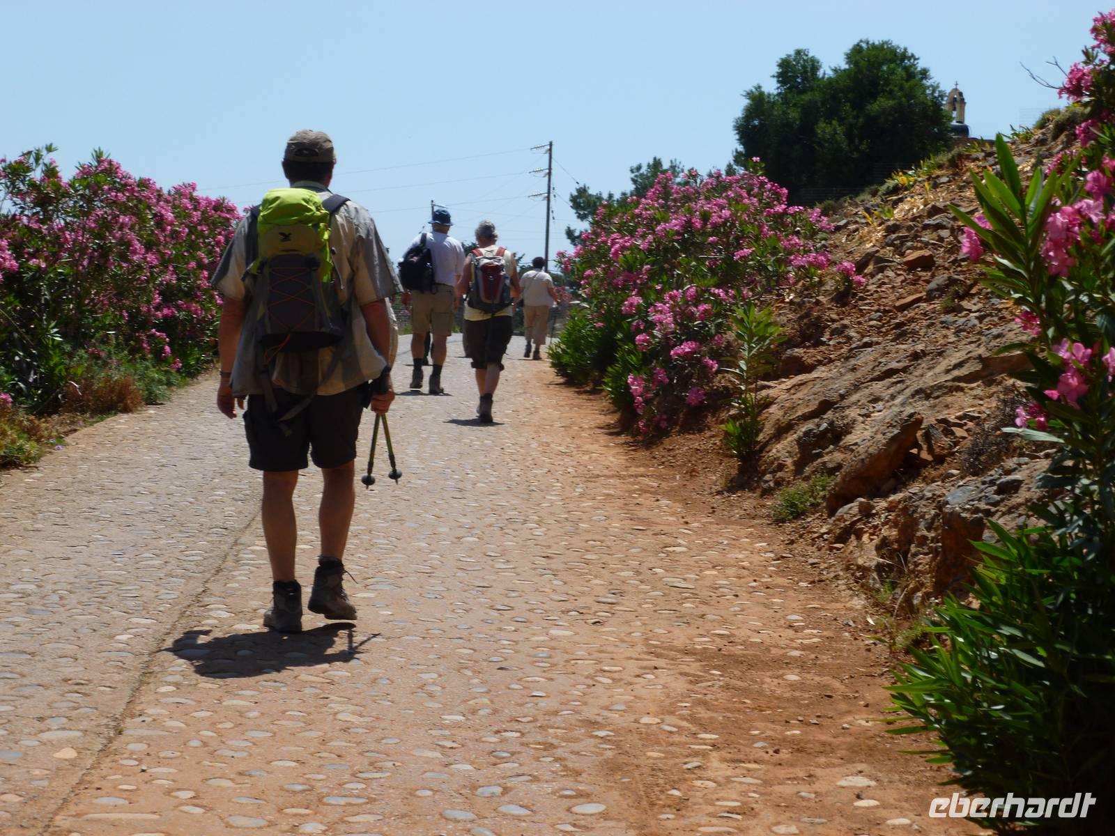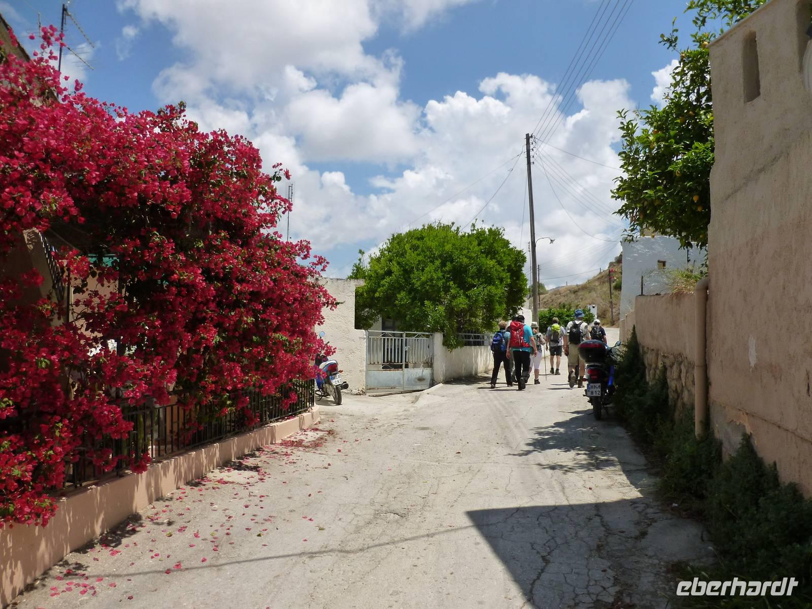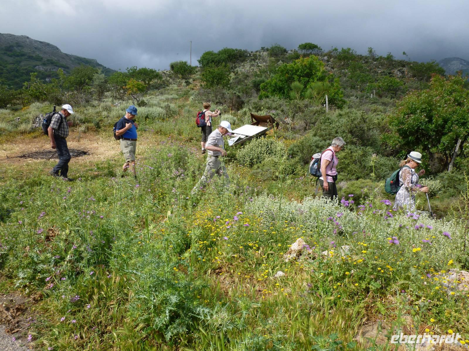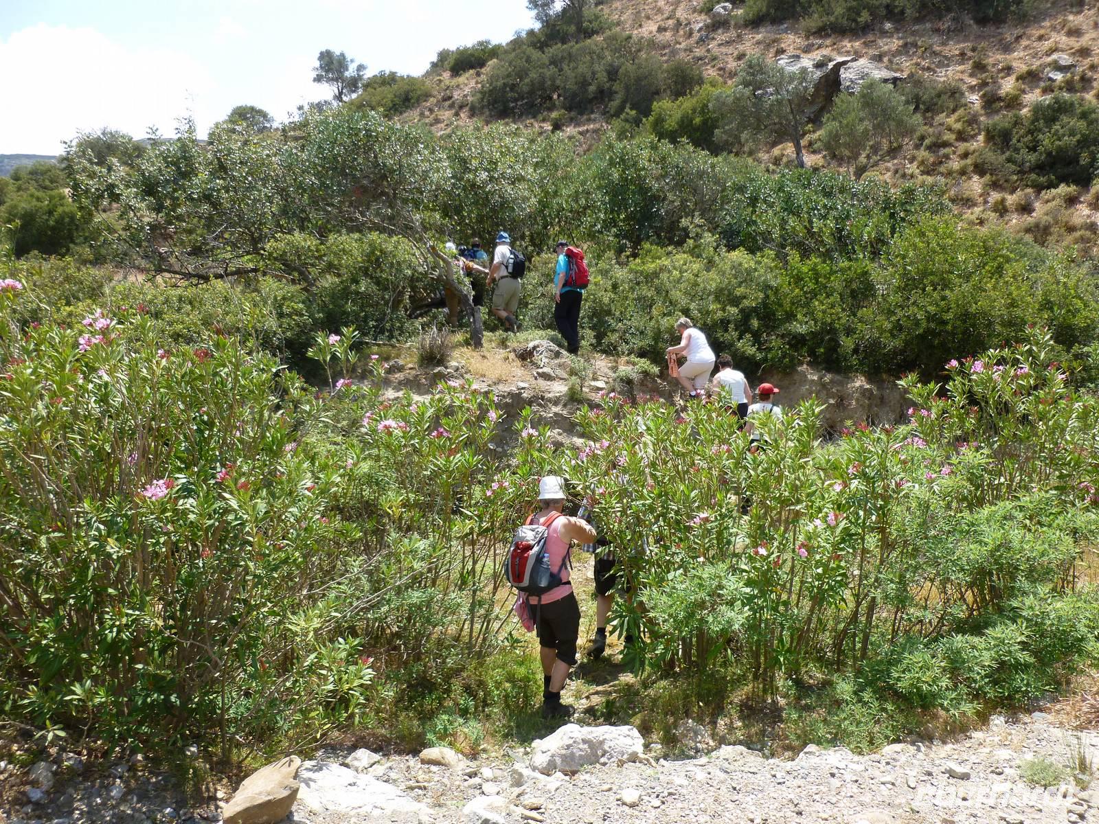 Heute klingelte bereits sehr früh der Wecker, denn wir freuten uns bereits alle auf die Bezwingung der Samaria-Schlucht. Doch da schien uns das Wetter einen Strich durch die Rechnung machen zu wollen. Wir wagten einen Versuch uns vor Ort einen genauen Eindruck zu machen. Dort es wurde immer schlimmer mit dem Regen, so dass sogar die Schlucht gesperrt wurde. Also hieß es improvisieren und so zogen wir das Programm für Samstag auf heute vor. Wir fuhren wieder nördlich nach Chania um dort nach einem Besuch des Archäologischen Museums die lebhafte Stadt auf eigene Faust zu erkunden. Die Markthalle lockte mit allerlei einheimischer Spezialitäten, Gewürzen und Kosmetika und auch die malerischen Gassen waren einen Besuch wert. Anschließend fuhren wir nach Therissos, aber kaum dort angekommen tröpfelte es wieder. Zum Glück gab es hinter der Dorfkirche eine Überdachung, so dass wir einen idealen Platz für unser spontanes Picknick hatten. Wir schnippelten in Teamarbeit einen griechischen Salat aus Gurken, Tomaten, Schafskäse gespickt mit Oliven und gleichnamigen Öl. Dazu gab es frisches Brot, Wein und natürlich als Abschluss ein Gläschen Raki. Inzwischen waren die Wolken auch wieder etwas aufgezogen und gut gelaunt nahmen wir nun die Wanderung über Zourva nach Meskla in Angriff. Den ersten Anstieg auf der Asphaltstraße hatten wir schnell geschafft und konnten nebenbei auch am Wegesrand wieder eine Menge Flora bestaunen, vor allem der prächtige Oleander hatte es uns angetan. Wir durchquerten das kleine Dorf Zourva und dann war es auch gar nicht mehr weit bis zum Bus in Meskla. Ein langer Tag voller Überraschungen und Improvisation neigte sich nun dem Ende und alle freuten sich nun auf das stärkende Abendessen im Hotel.