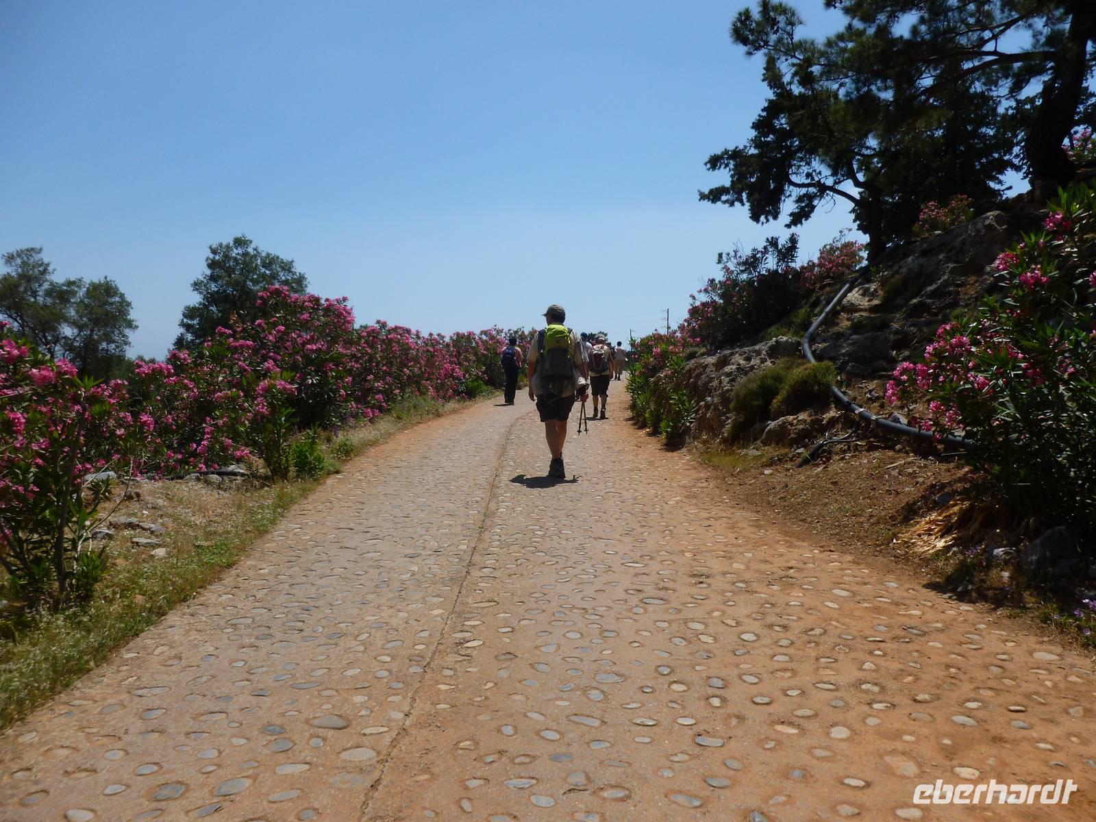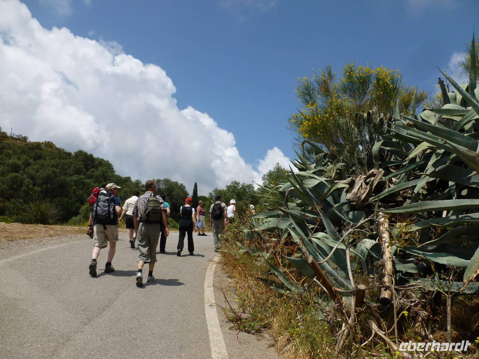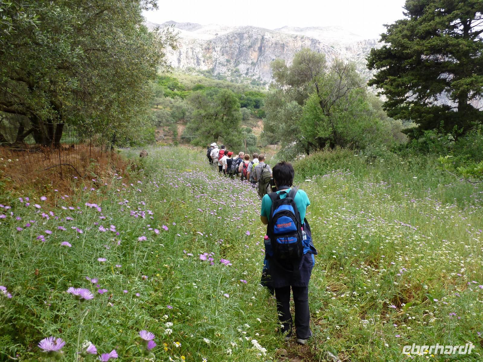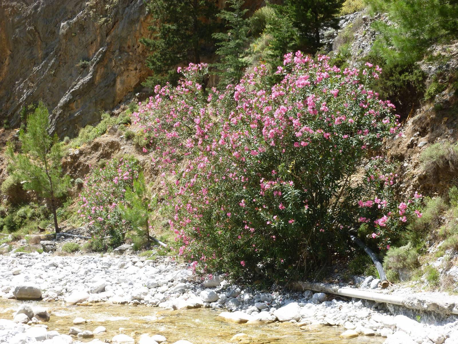 Heute klingelte bereits sehr früh der Wecker, denn wir freuten uns bereits alle auf die Bezwingung der Samaria-Schlucht. Doch da schien uns das Wetter einen Strich durch die Rechnung machen zu wollen. Wir wagten einen Versuch uns vor Ort einen genauen Eindruck zu machen. Dort es wurde immer schlimmer mit dem Regen, so dass sogar die Schlucht gesperrt wurde. Also hieß es improvisieren und so zogen wir das Programm für Samstag auf heute vor. Wir fuhren wieder nördlich nach Chania um dort nach einem Besuch des Archäologischen Museums die lebhafte Stadt auf eigene Faust zu erkunden. Die Markthalle lockte mit allerlei einheimischer Spezialitäten, Gewürzen und Kosmetika und auch die malerischen Gassen waren einen Besuch wert. Anschließend fuhren wir nach Therissos, aber kaum dort angekommen tröpfelte es wieder. Zum Glück gab es hinter der Dorfkirche eine Überdachung, so dass wir einen idealen Platz für unser spontanes Picknick hatten. Wir schnippelten in Teamarbeit einen griechischen Salat aus Gurken, Tomaten, Schafskäse gespickt mit Oliven und gleichnamigen Öl. Dazu gab es frisches Brot, Wein und natürlich als Abschluss ein Gläschen Raki. Inzwischen waren die Wolken auch wieder etwas aufgezogen und gut gelaunt nahmen wir nun die Wanderung über Zourva nach Meskla in Angriff. Den ersten Anstieg auf der Asphaltstraße hatten wir schnell geschafft und konnten nebenbei auch am Wegesrand wieder eine Menge Flora bestaunen, vor allem der prächtige Oleander hatte es uns angetan. Wir durchquerten das kleine Dorf Zourva und dann war es auch gar nicht mehr weit bis zum Bus in Meskla. Ein langer Tag voller Überraschungen und Improvisation neigte sich nun dem Ende und alle freuten sich nun auf das stärkende Abendessen im Hotel.