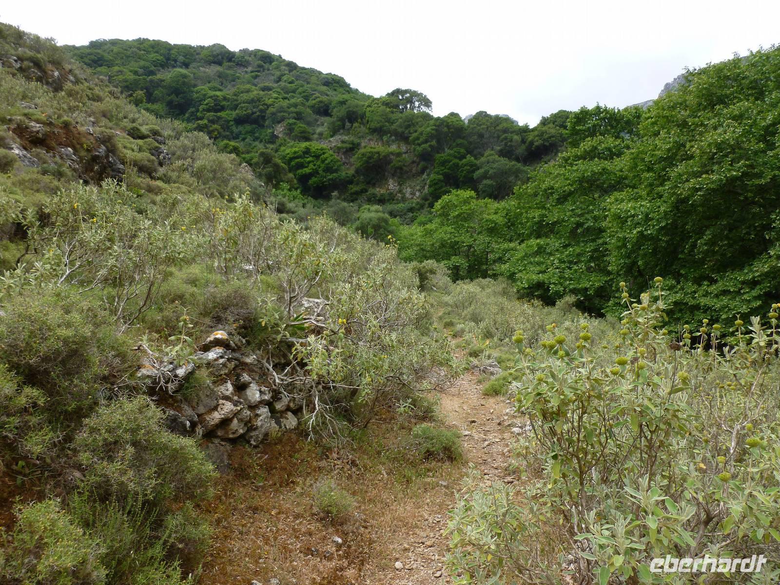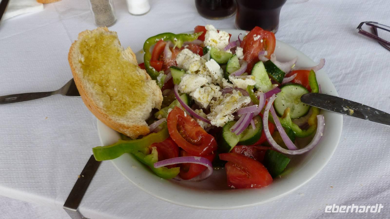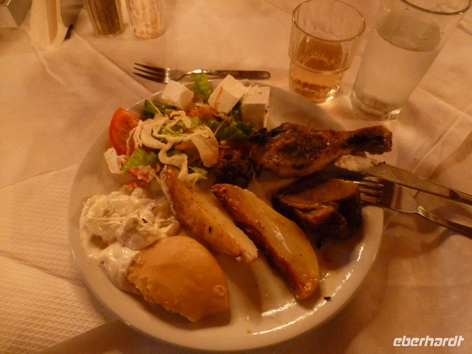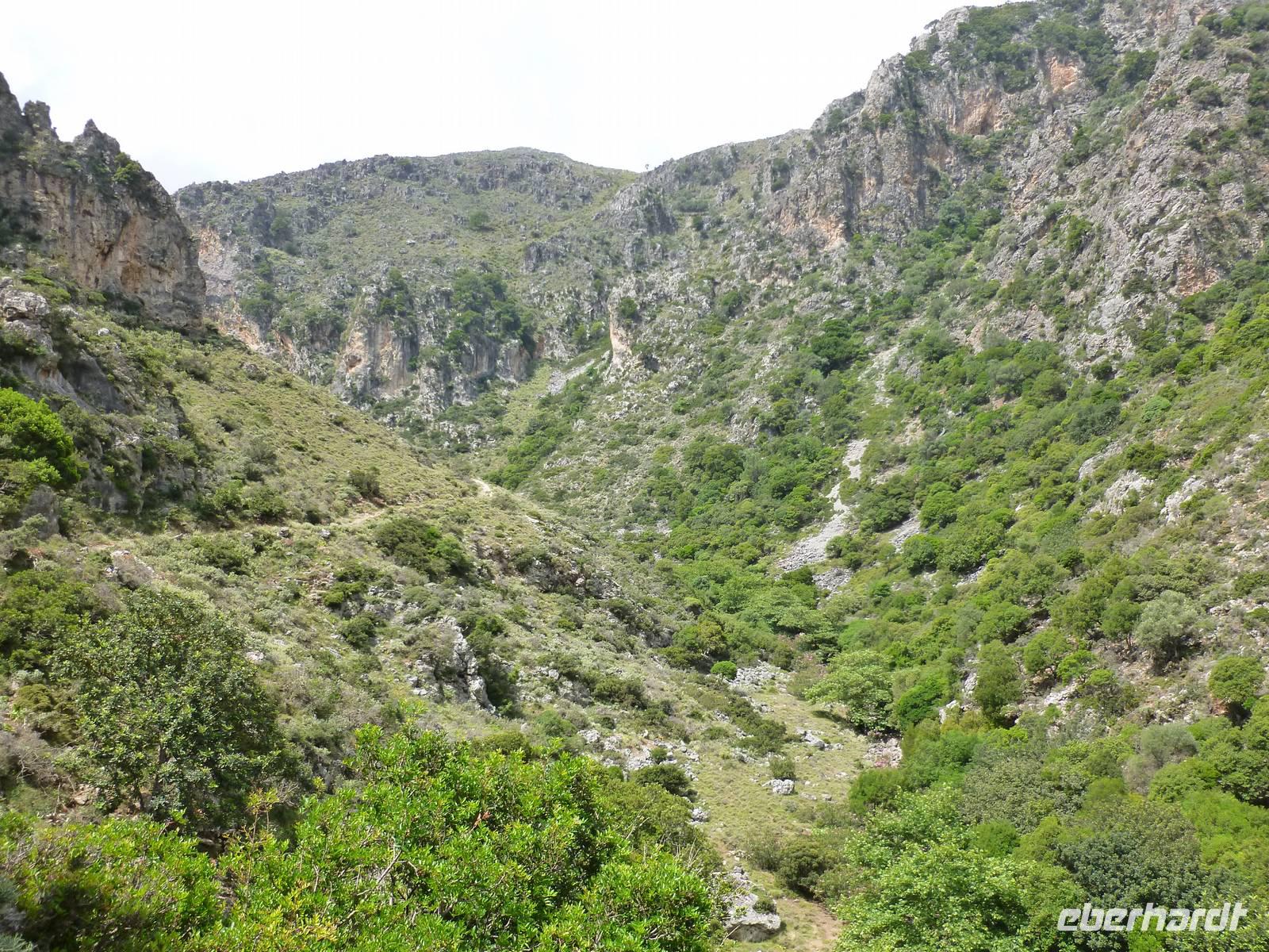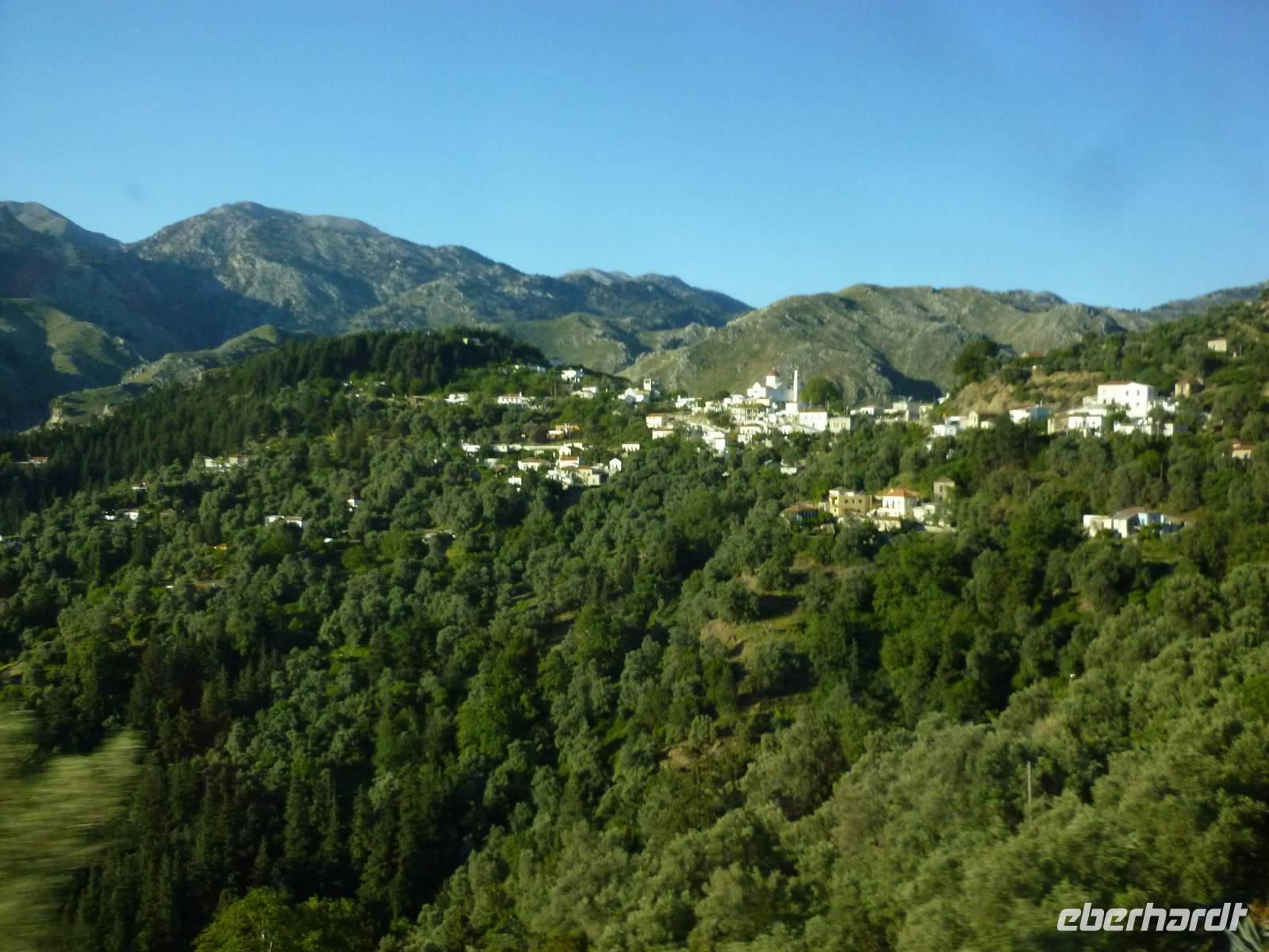 Heute klingelte bereits sehr früh der Wecker, denn wir freuten uns bereits alle auf die Bezwingung der Samaria-Schlucht. Doch da schien uns das Wetter einen Strich durch die Rechnung machen zu wollen. Wir wagten einen Versuch uns vor Ort einen genauen Eindruck zu machen. Dort es wurde immer schlimmer mit dem Regen, so dass sogar die Schlucht gesperrt wurde. Also hieß es improvisieren und so zogen wir das Programm für Samstag auf heute vor. Wir fuhren wieder nördlich nach Chania um dort nach einem Besuch des Archäologischen Museums die lebhafte Stadt auf eigene Faust zu erkunden. Die Markthalle lockte mit allerlei einheimischer Spezialitäten, Gewürzen und Kosmetika und auch die malerischen Gassen waren einen Besuch wert. Anschließend fuhren wir nach Therissos, aber kaum dort angekommen tröpfelte es wieder. Zum Glück gab es hinter der Dorfkirche eine Überdachung, so dass wir einen idealen Platz für unser spontanes Picknick hatten. Wir schnippelten in Teamarbeit einen griechischen Salat aus Gurken, Tomaten, Schafskäse gespickt mit Oliven und gleichnamigen Öl. Dazu gab es frisches Brot, Wein und natürlich als Abschluss ein Gläschen Raki. Inzwischen waren die Wolken auch wieder etwas aufgezogen und gut gelaunt nahmen wir nun die Wanderung über Zourva nach Meskla in Angriff. Den ersten Anstieg auf der Asphaltstraße hatten wir schnell geschafft und konnten nebenbei auch am Wegesrand wieder eine Menge Flora bestaunen, vor allem der prächtige Oleander hatte es uns angetan. Wir durchquerten das kleine Dorf Zourva und dann war es auch gar nicht mehr weit bis zum Bus in Meskla. Ein langer Tag voller Überraschungen und Improvisation neigte sich nun dem Ende und alle freuten sich nun auf das stärkende Abendessen im Hotel.