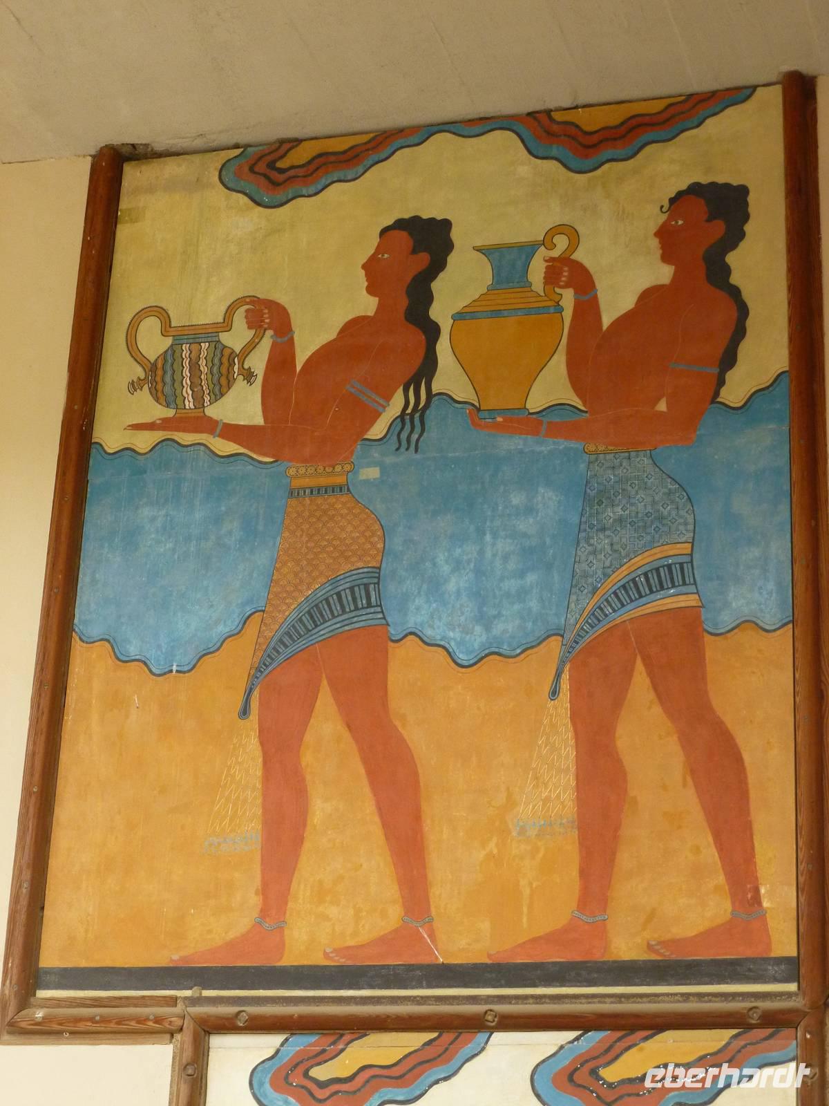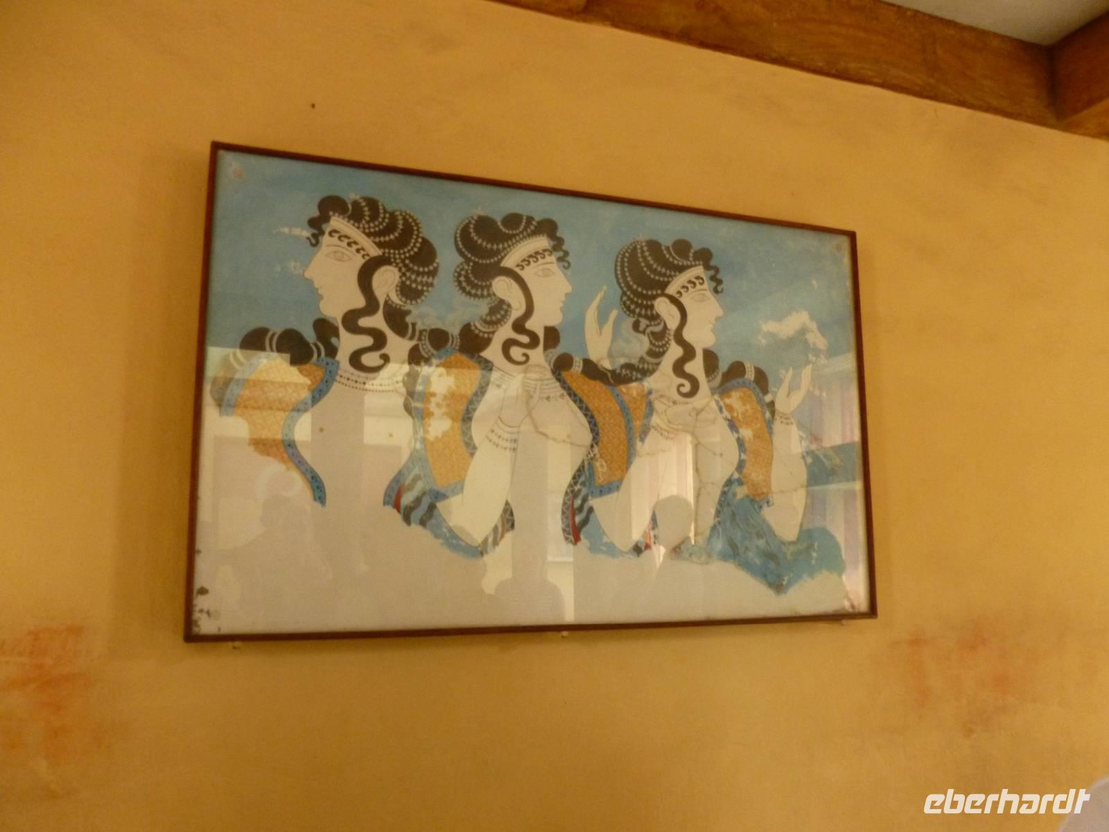 Heute konnten wir unsere Wanderstiefel im Hotelzimmer lassen und waren gespannt auf den Besuch der größten und bedeutendsten Palastanlage der Minoer: Knossos. 5km südöstlich von Heraklion bekamen wir einen umfangreichen Einblick in der vom Engländer Arthur Evans im frühen 20. Jahrhundert freigelegten Ausgrabungsstelle. Gemeinsam mit Kiki, die uns mit ihrem umfangreichen Wissen Einblick in die minoische Kultur und vielen Mythen gewährte, liefen wir durch die großzügige Anlage. Zuerst durch den Prozessionskorridor, vom Westmagazin über den Zentralhof, und von den Vorratsräumen schließlich zum Theater. Die meisten der eindrucksvollen Wandgemälde und Gebäudeteile sind zwar nur rekonstruiert, dennoch lockt diese archäologische Statte täglich hunderte Besucher. Mit vielen neuen Eindrücken fuhren wir nun weiter ins 20-minütige entfernte Dorf Peza, um dort den hiesigen Wein und das mit Liebe hergestellte Olivenöl zu verkosten. Letzter Tagesordnungspunkt war die Inselhauptstadt Heraklion - die Inselmetropole ist groß, bunt und quicklebendig. Benannt wurde diese durch den griechischen Helden Herakles und bietet vielseitige Museen, verschiedene Café´s und Bars und reichlich Einkaufsmöglichkeiten. Nach einem kurzen Rundgang mit Kiki, hatte nun noch jeder etwas Zeit für sich um entweder das Archäologische Museum oder den Hafen zu besuchen oder am bekannten Morosini- oder auch Löwenbrunnen einen Kaffee zu trinken. Dann ging es wieder zurück ins Hotel, damit wir uns für den heutigen Folklore-Abend ausgehfertig machen konnten und die hiesige Lebensfreude live erleben zu können. Am abgelegenen Restaurant angekommen, wurden wir erst einmal mit traditionell gekleideten Kretern fotografiert und kamen noch an kleineren Stationen vorbei, an denen es Raki, Käse, Gürkchen und Kartoffeln verkosten konnten, die uns Appetit machten auf unser heutiges Abendessen. Bei genügend Sirtaki und Folklorevorführungen waren wir richtig elektrisiert und auch Rena wagte ein Tänzchen. Doch immer wenn´s am Schönsten ist und Doreen auf dem Tisch tanzt, sollte man aufhören J. Es war spät geworden - also Zeit uns auf den Weg ins Hotel zu machen, denn es stand noch Kofferpacken auf dem Programm.