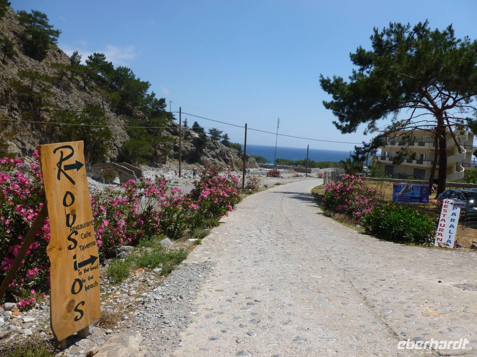 Den Höhepunkt unserer Wanderwoche hoben wir uns standesgemäß für den Sonntag auf. Der Tag machte seinem Namen alle Ehre und bereits früh am Morgen strahlte die Sonne die kretischen Berge an und ließ die Fotoapparate schon auf Hochtouren laufen. Da wir heute auch ein Geburtstagskind hatten, hatten wir gleich doppelten Grund zur Freude. An der Schlucht angekommen, wurden wir erst einmal Zuschauer eines Marathons, der durch einen Teil der Schlucht führte. Wir starteten also wie angekündigt beim Pass Xyloskala auf ca. 1252m in die Schlucht. Der erste Teil führte zunächst über mehrere Hundert Steinstufen hinunter und zwischendurch konnten wir uns immer wieder an der kühlen Quelle erfrischen. Es waren viele Besucher in der Schlucht und alle ein paar Meter musste man wieder stehen bleiben, aber nicht wegen der Menschen sondern wegen der vielen, tollen Fotomotive und dem beeindruckenden Blick zu den Steilwänden. Wir liefen durch den teils dichten Kiefernbestand, uralten Zypressen und wunderschönen Oleanderbüschen bis zur kleinen Kapelle Agios Nikolaos und weiter zum verlassenen Dorf Samaria. Dort nutzen wir die kurze Pause unser Geburtstagskind Hartmut noch einmal hochleben zu lassen. Über das steinige Flussbett ging es bald darauf weiter zur engsten Stelle der Schlucht, die sogenannte Eiserne Pforte. Schneller als wir dachten, checkten wir wieder aus der Schlucht aus und nun war es nicht mehr weit bis zum Strand in Agio Roumeli. Dort war noch Zeit für ein kühles Getränk oder Kleinigkeit zu essen. Bei sehr starkem Seegang kam nun die große Fähre um uns abzuholen. Die Wellen klatschten so fest an die Küste, dass wir um eine spontane Dusche beim Aufsteigen nicht herumkamen. Nach einer Stunde Fahrt waren wir dann auch schon in Sougia angekommen, wo uns Georg bereits mit dem Bus erwartete. Glücklich, zufrieden aber dennoch etwas müde ließen wir nun noch einmal die Eindrücke des heutigen Tages vorüberziehen. Am Abend genossen wir nochmal ein leckeres gemeinsames Abendessen, bevor wir uns an das Kofferpacken machten. Von Kiki mussten die Dresdner sich bereits verabschieden, denn sie begleitet die Leipziger Gäste zum Flughafen.