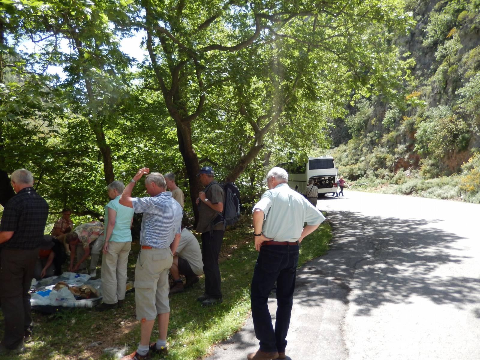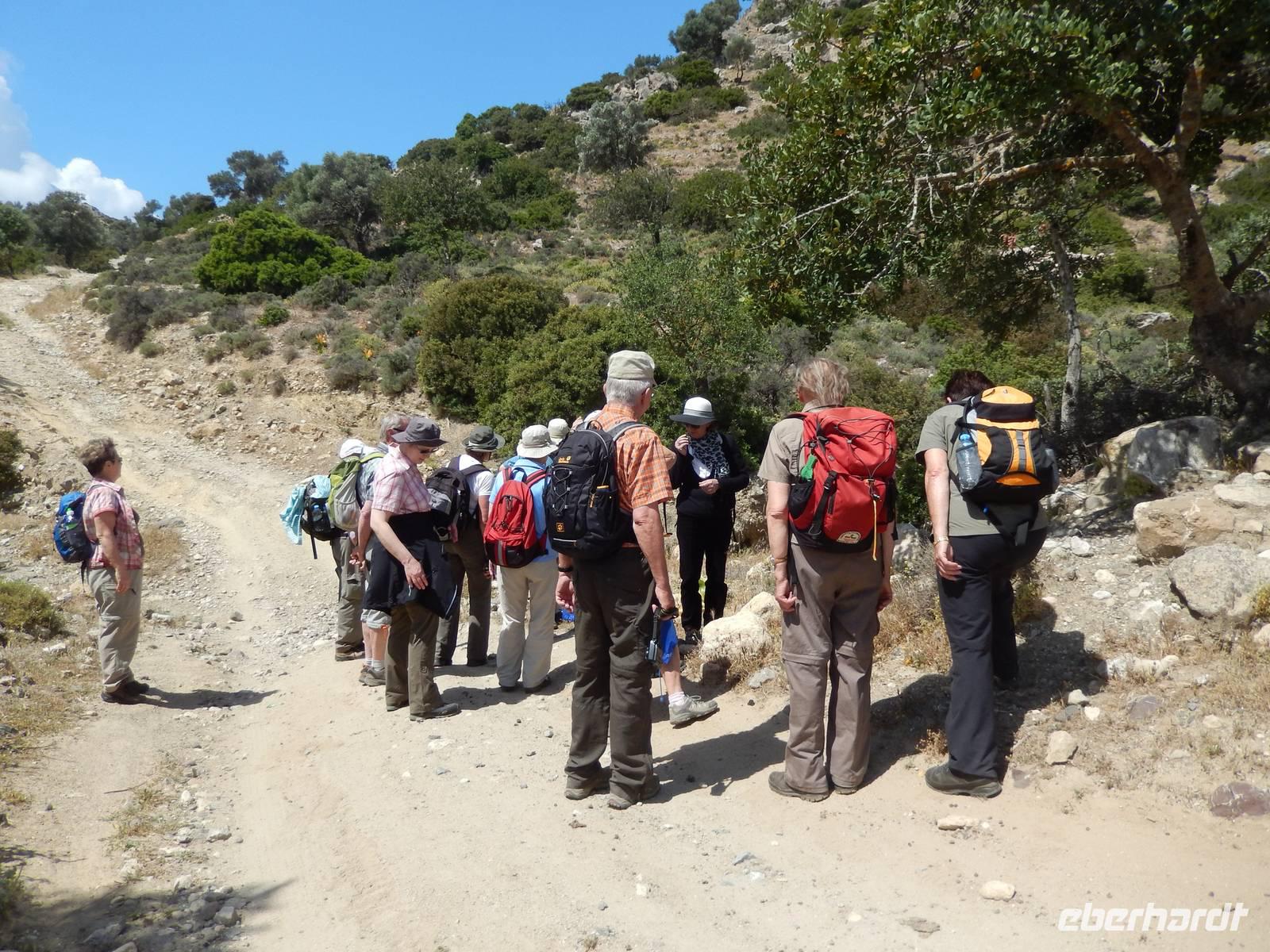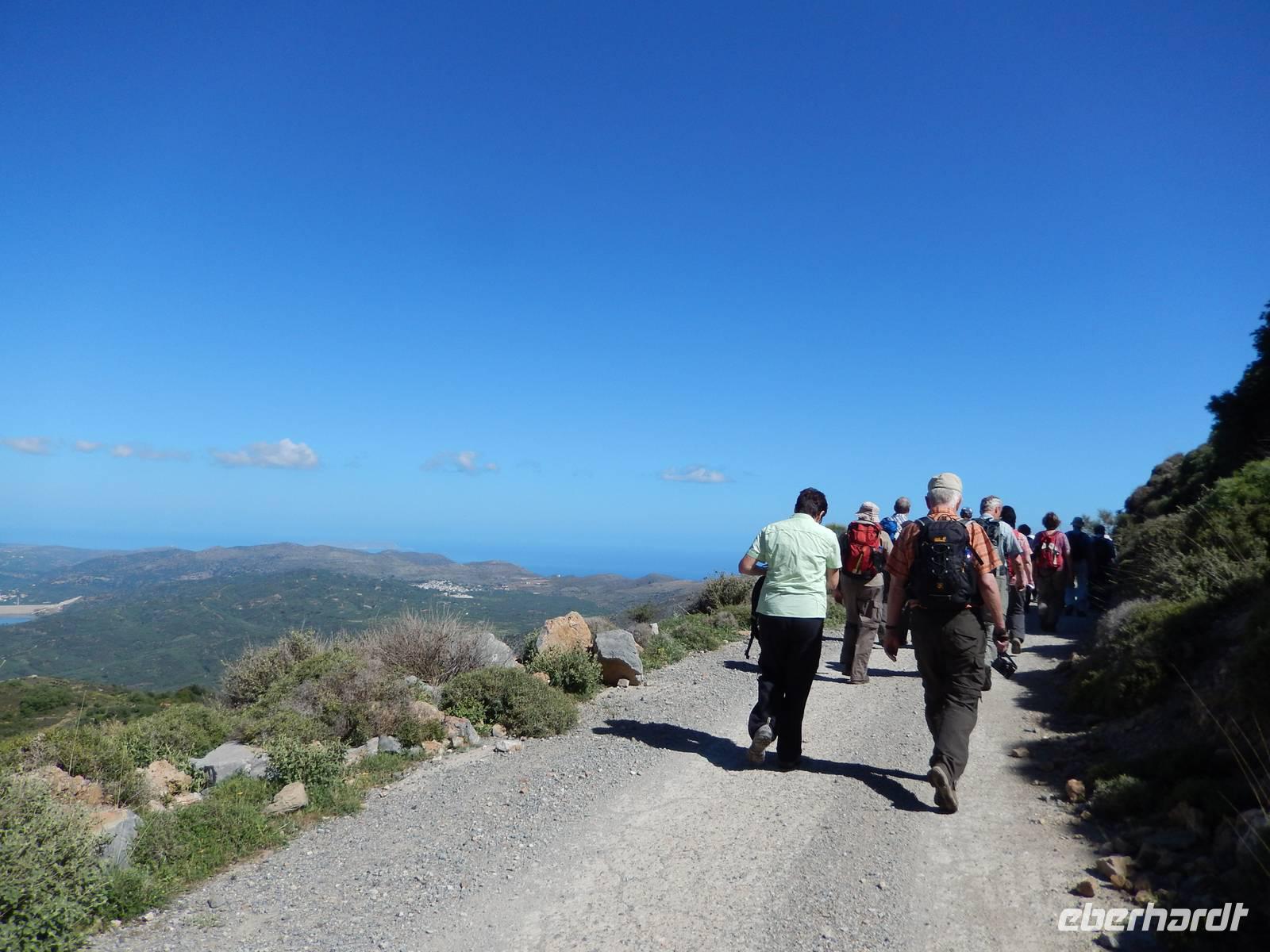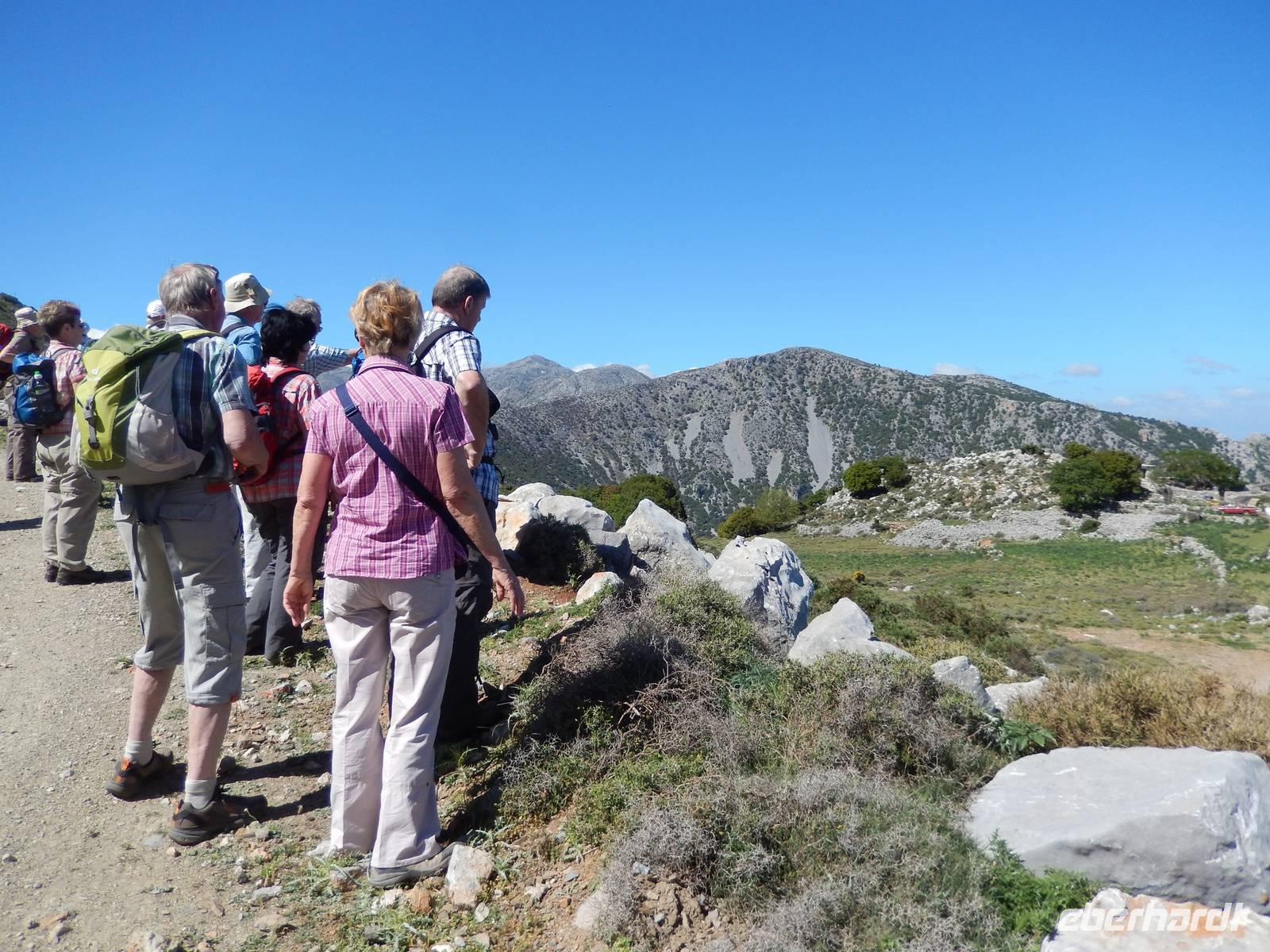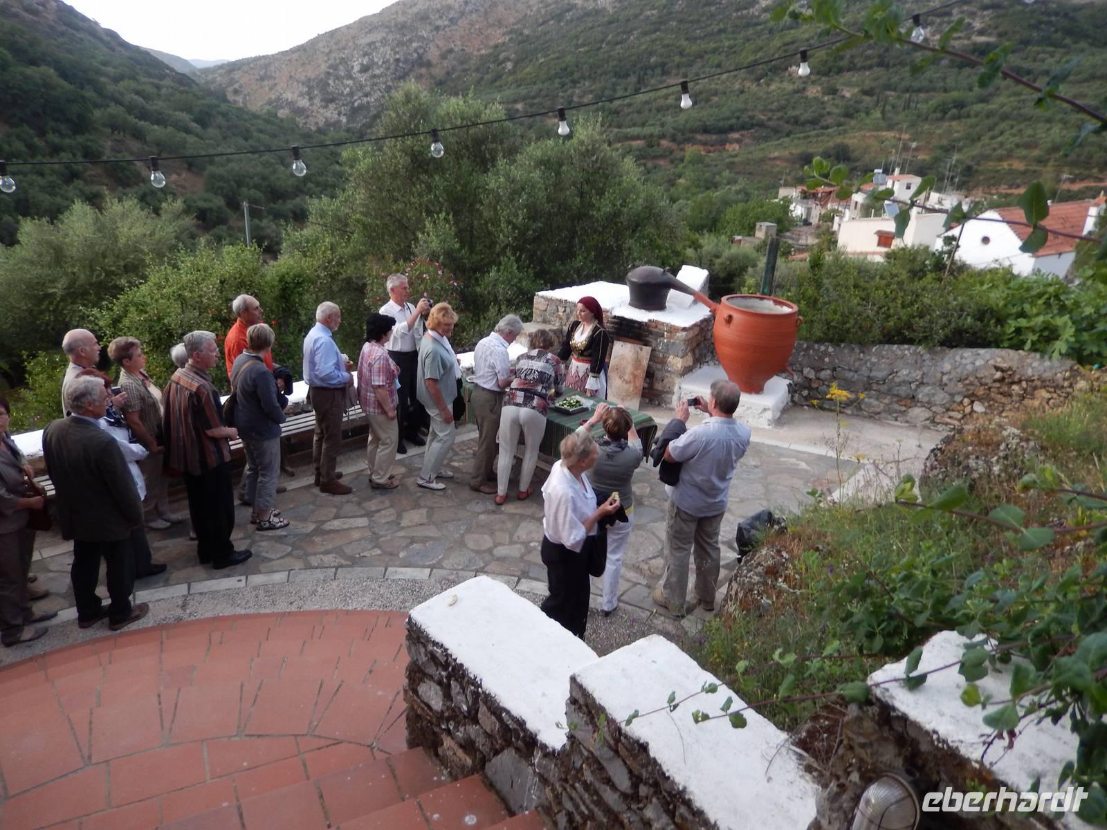 Noch einmal schnürten wir unsere Wanderschuhe um eine schöne Tour auf der Insel des Zeus zu erleben. Doch zuvor besuchten wir kurz das nahgelegene Kloster Gonia. Maria gab uns wieder ein paar Erklärungen und wir lauschten auch einmal dem laufenden Gottesdienst. Dann fuhren wir noch eine gute Stunde in den kleinen Ort Sirikari, von dem aus unsere heutige Tour durch die Tshiklana-Schlucht begann. Der erste Teil verlief etwas steiler und sehr steinig, es war also Vorsicht geboten, dass man nicht stolperte oder ausrutschte. Dann wanderten wir geradeaus durch die eindrucksvolle Schlucht. Am Himmel kreisten die Geier, die mit ihren breiten Flügeln „vogelleicht" durch die Schlucht schwebten. Nach wenigen Kilometern erreichten wir schließlich schon das Ende der Schlucht, aber wir mussten noch etwas weiter nach Polyrinia laufen. Über den Asphalt ging es nun wieder bergauf, aber die Ausblicke in die Schlucht und die tolle Landschaft war großartig. Am Bus angekommen fuhren wir in eine nahgelegene Taverne, um unsere schöne Wanderwoche gesellig ausklingen zu lassen. Es gab reichlich zu essen, angefangen von gefüllten Weinblättern, Käsetaschen, Tzatziki, Frikadellen, Sardinen bis hin zu Calamaris, Kuchen, Wein und natürlich Raki. Im Bus bedankten wir uns dann noch einmal bei unserer liebgewonnenen Reiseleiterin Maria und unserem Busfahrer Jorgos. Auch für die Beiden geht eine erlebnisreiche Woche zu Ende. Nach dieser herzlichen offiziellen Verabschiedung fuhren wir zurück ins Hotel und einige nutzten die Zeit um sich in das warme Meer zu stürzen. Für einige aus der Gruppe hieß es nun Kofferpacken, denn schon früh morgens sollte es leider wieder gen Heimat gehen.