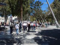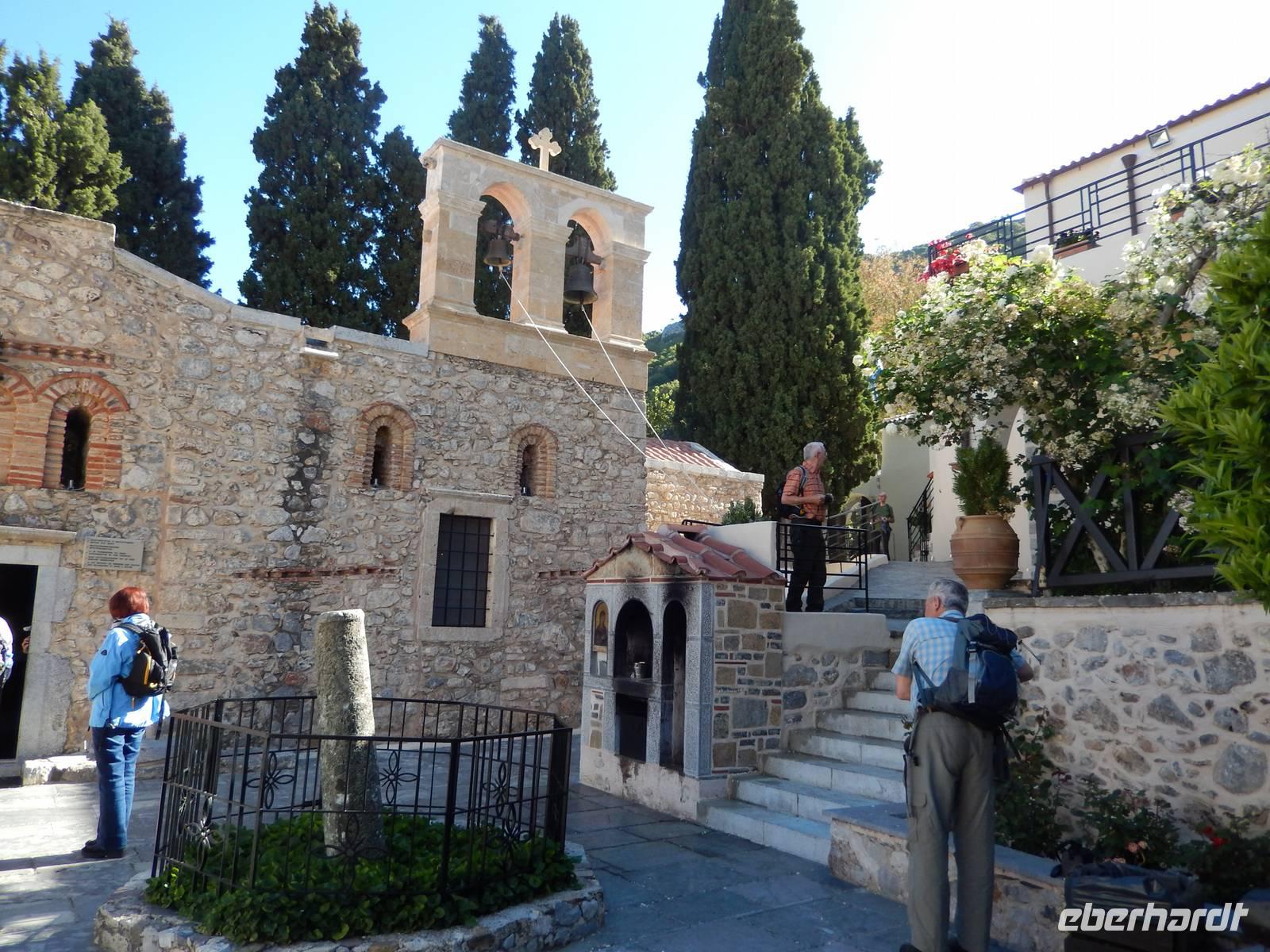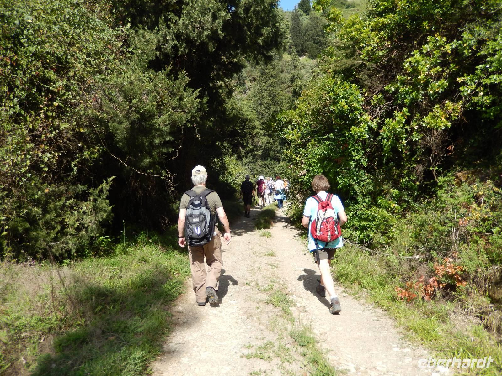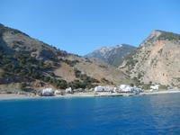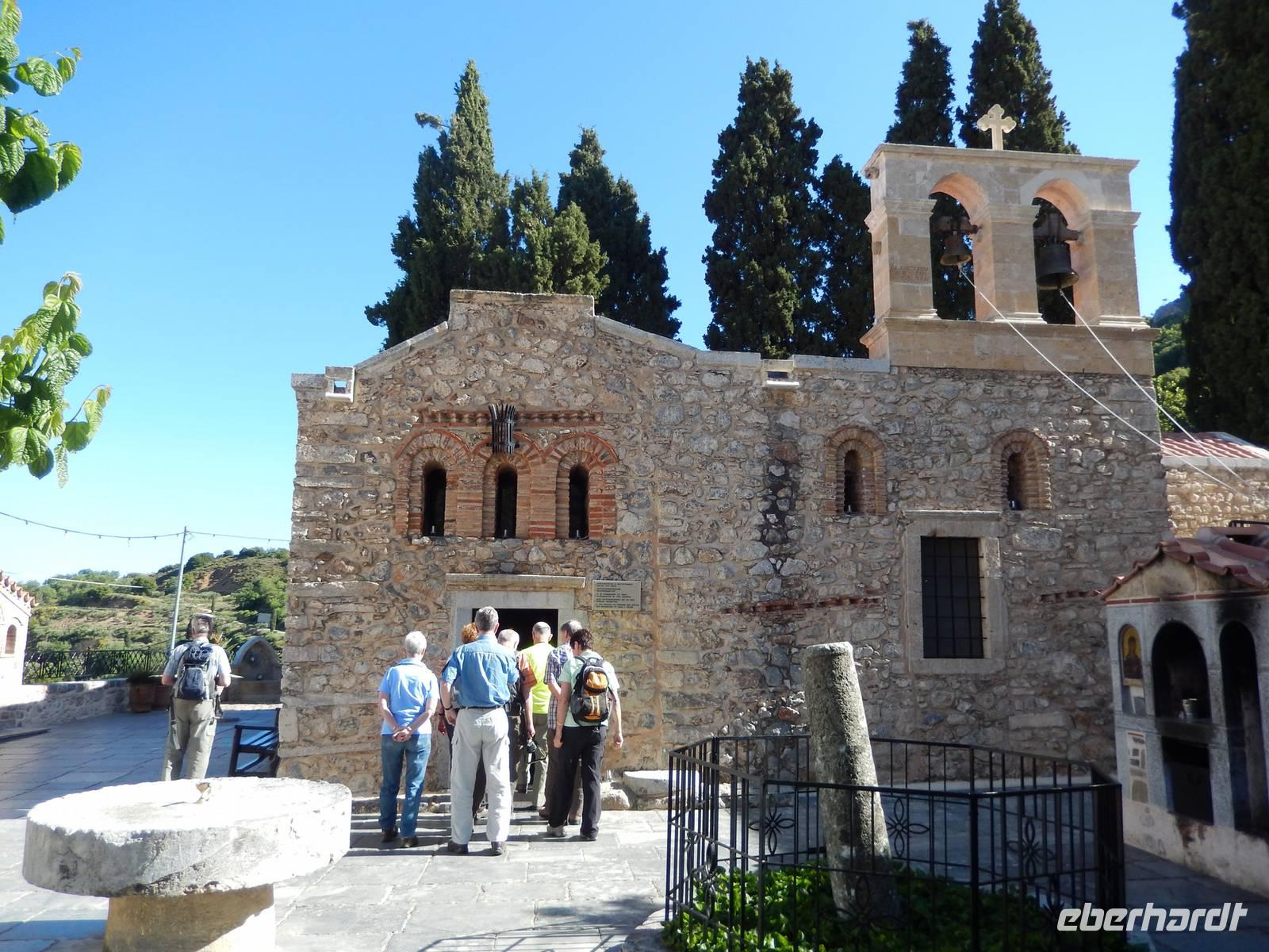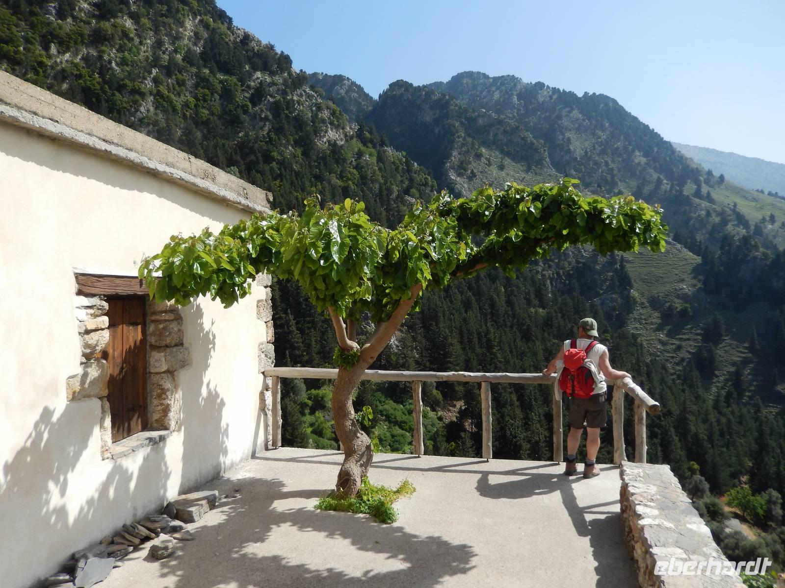 Noch einmal schnürten wir unsere Wanderschuhe um eine schöne Tour auf der Insel des Zeus zu erleben. Doch zuvor besuchten wir kurz das nahgelegene Kloster Gonia. Maria gab uns wieder ein paar Erklärungen und wir lauschten auch einmal dem laufenden Gottesdienst. Dann fuhren wir noch eine gute Stunde in den kleinen Ort Sirikari, von dem aus unsere heutige Tour durch die Tshiklana-Schlucht begann. Der erste Teil verlief etwas steiler und sehr steinig, es war also Vorsicht geboten, dass man nicht stolperte oder ausrutschte. Dann wanderten wir geradeaus durch die eindrucksvolle Schlucht. Am Himmel kreisten die Geier, die mit ihren breiten Flügeln „vogelleicht" durch die Schlucht schwebten. Nach wenigen Kilometern erreichten wir schließlich schon das Ende der Schlucht, aber wir mussten noch etwas weiter nach Polyrinia laufen. Über den Asphalt ging es nun wieder bergauf, aber die Ausblicke in die Schlucht und die tolle Landschaft war großartig. Am Bus angekommen fuhren wir in eine nahgelegene Taverne, um unsere schöne Wanderwoche gesellig ausklingen zu lassen. Es gab reichlich zu essen, angefangen von gefüllten Weinblättern, Käsetaschen, Tzatziki, Frikadellen, Sardinen bis hin zu Calamaris, Kuchen, Wein und natürlich Raki. Im Bus bedankten wir uns dann noch einmal bei unserer liebgewonnenen Reiseleiterin Maria und unserem Busfahrer Jorgos. Auch für die Beiden geht eine erlebnisreiche Woche zu Ende. Nach dieser herzlichen offiziellen Verabschiedung fuhren wir zurück ins Hotel und einige nutzten die Zeit um sich in das warme Meer zu stürzen. Für einige aus der Gruppe hieß es nun Kofferpacken, denn schon früh morgens sollte es leider wieder gen Heimat gehen.