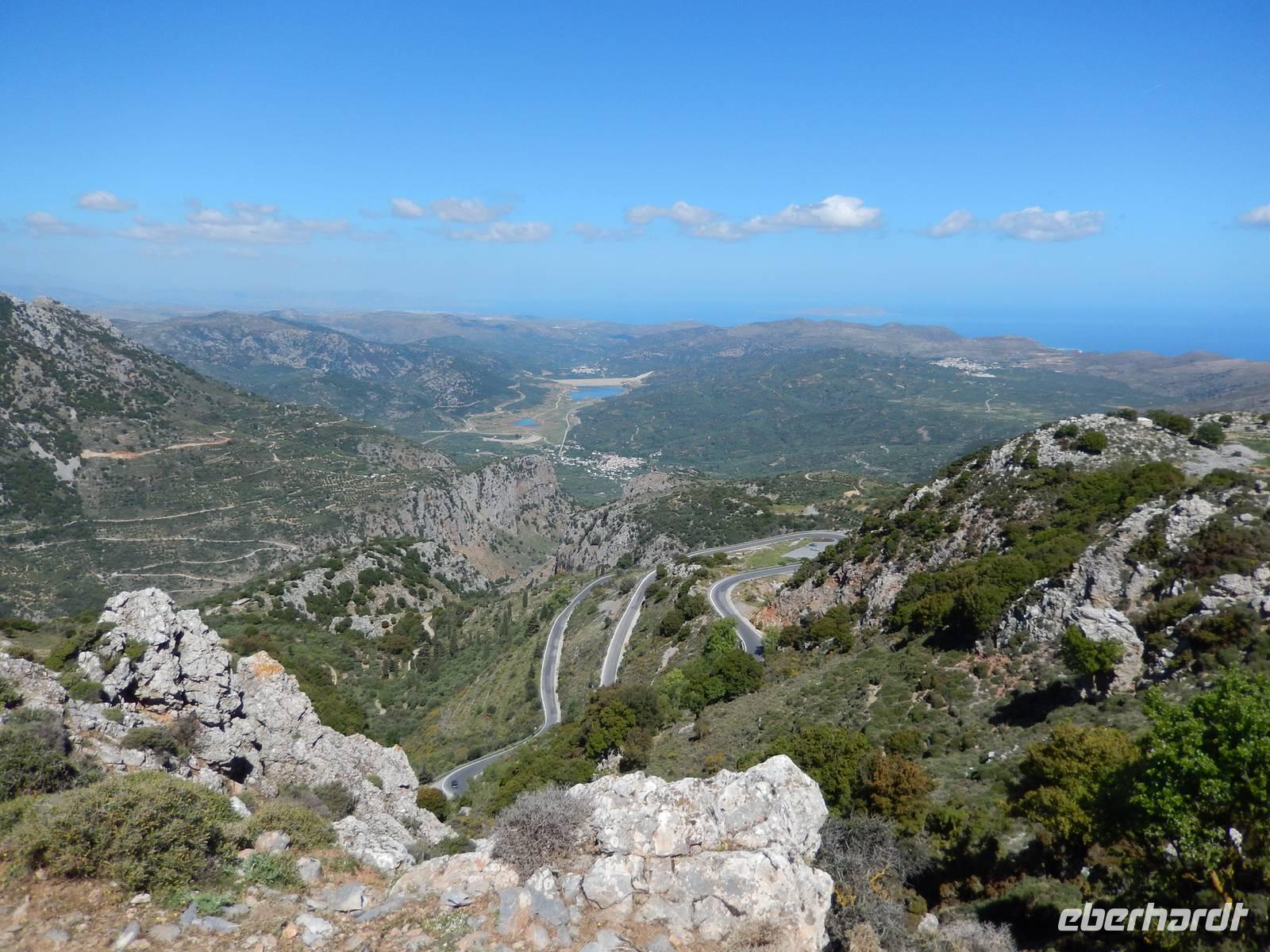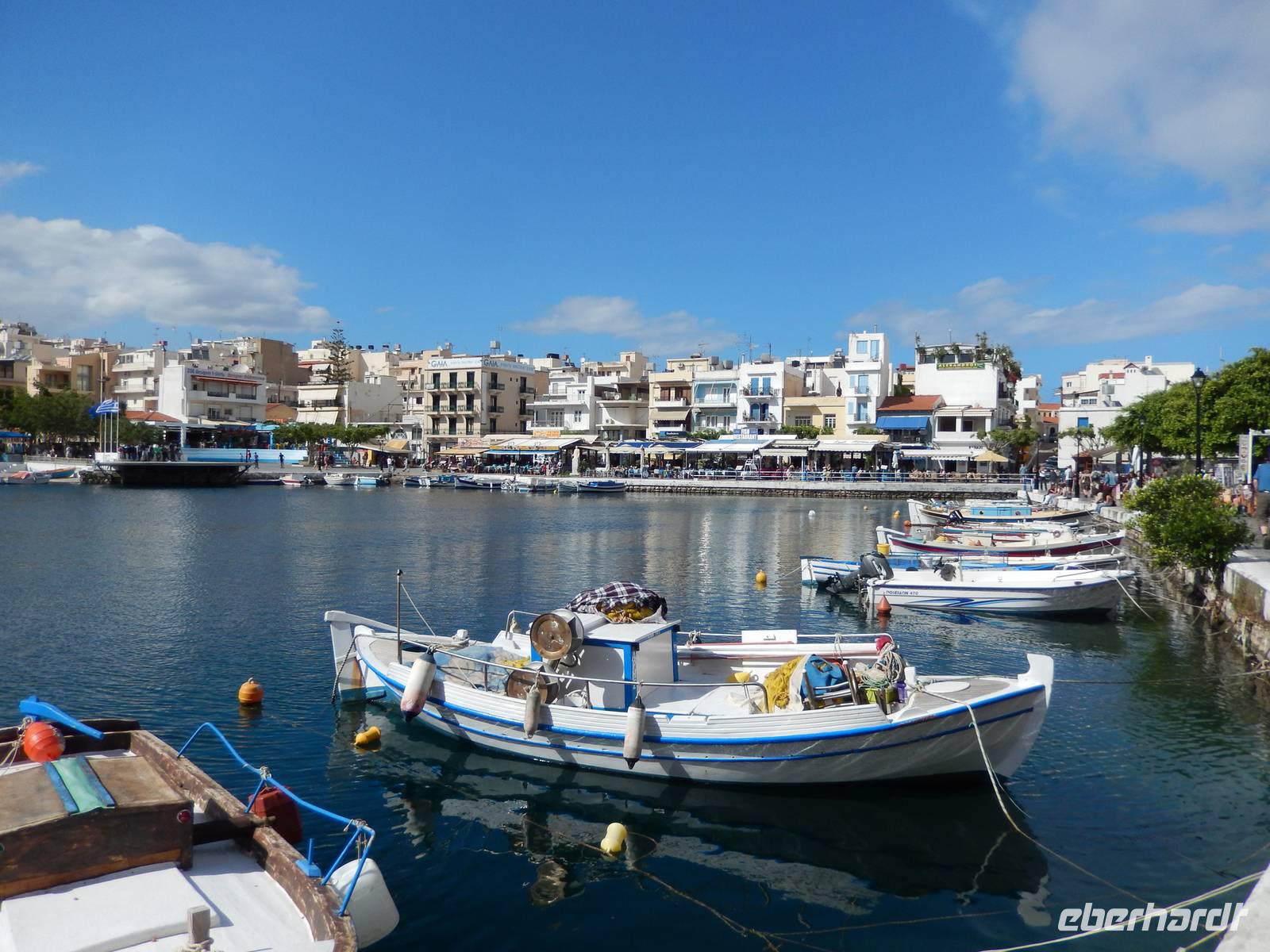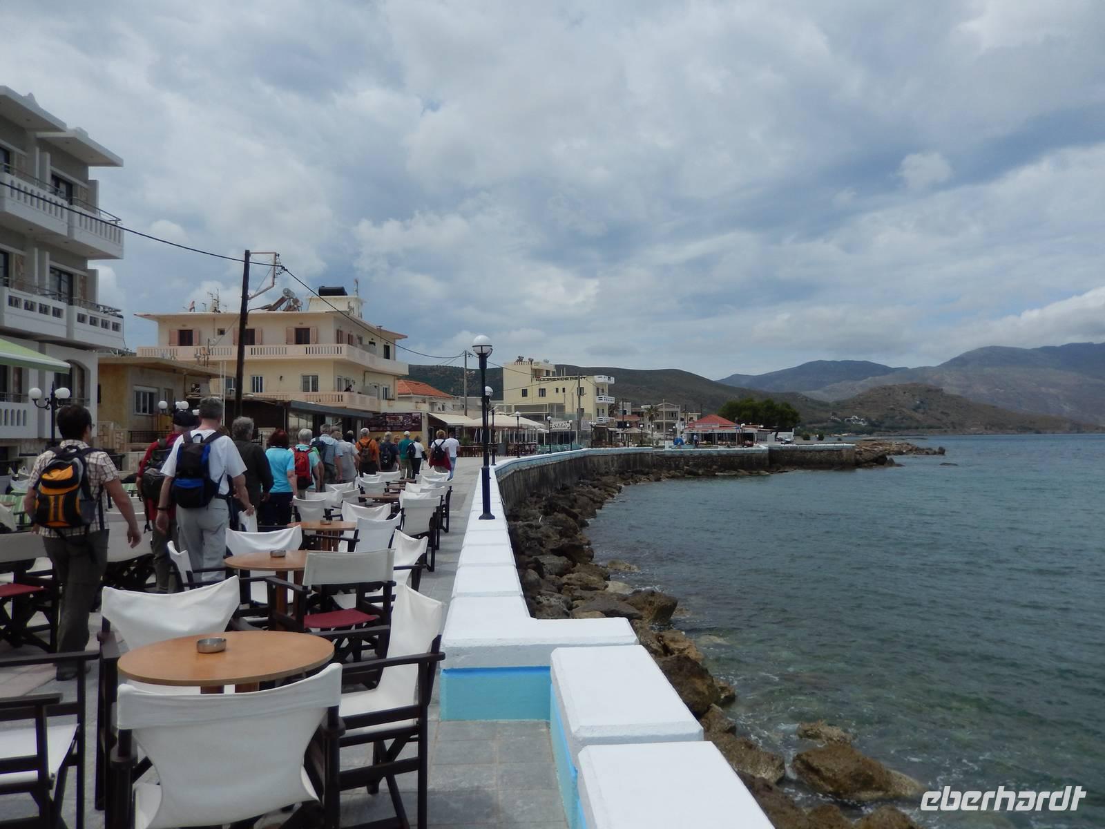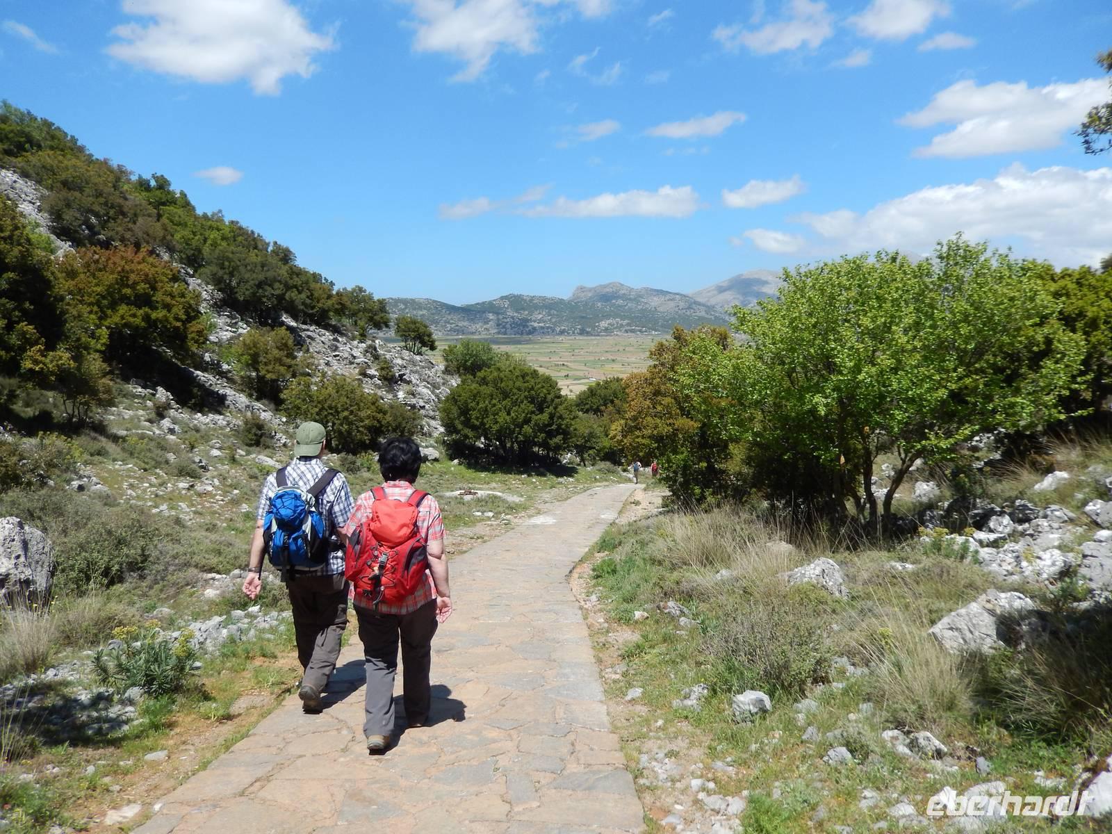 Nachdem wir gut ausgeruht und gestärkt vom leckeren Frühstück waren, wurden wir von Maria abgeholt, um heute unsere erste Wanderung zu unternehmen. Doch bevor die Wanderschuhe richtig zum Einsatz kamen, besuchten wir das beschauliche Kloster Kera Kardiotissa. Wir wurden sehr gastfreundlich empfangen und durften das selbstgemachte süße Brot probieren. Anschließend besichtigten wir die kleine Klosterkirche und Maria informierte uns über die Bedeutung der alten, aber noch gut erhaltenen Fresken und das Leben in dem kleinen Kloster. Weiter ging es dann zur Lasithi-Hochebene, um unsere Wanderung nach Tzermiado zu beginnen. Wir hatten tolles Wanderwetter und somit eine grandiose Aussicht auf die Hochebene und das Meer am Horizont. Während der Einsteigertour entdeckten wir viele kleine Pflänzchen am Wegesrand: Orchideen, Alpenveilchen, Kamille und zum Schluss einen Drachenwurz. Im urigen Tzermiado angekommen, erwartete uns bereits der Bus, um uns nach Psychro, zur Höhle des Zeus zu chauffieren. Bevor wir die Geburtsstätte des Zeus besichtigten, kehrten wir noch in einer Taverne an den alten Windrädern ein und genossen die kretischen Köstlichkeiten aus eigenem Anbau. Selbstgemachter Käse, griechischer Salat und dazu ein Gläschen Wein - so konnten wir es doch aushalten :-). Doch nun weiter zur Diktäischen Grotte, zu der uns ein steiler Pfad bergauf bis zum Eingang der eindrucksvollen Tropfsteinhöhle führte. Nun wurde es plötzlich mit einem Schlag um einige Grad kühler, aber auch diese Eindrücke waren sehr reizvoll. Den Abschluss des Tages bildete für heute unser Besuch in Agios Nikolaos, einer idyllisch gelegenen Hafenstadt im Osten Kretas, die noch einmal Gelegenheit bot zum Bummeln, Kaffee-Trinken und sich unters kretische Volk zu mischen.