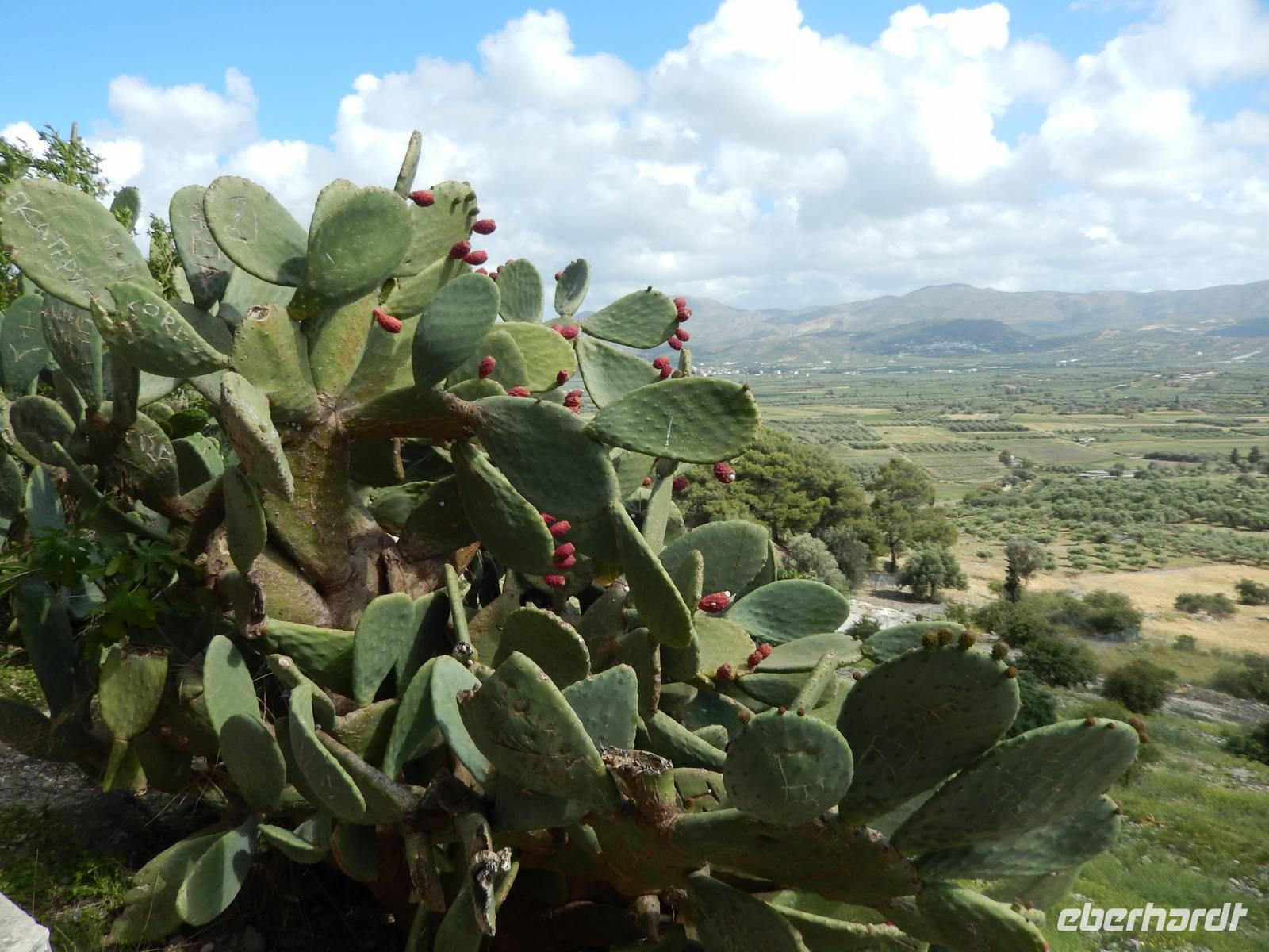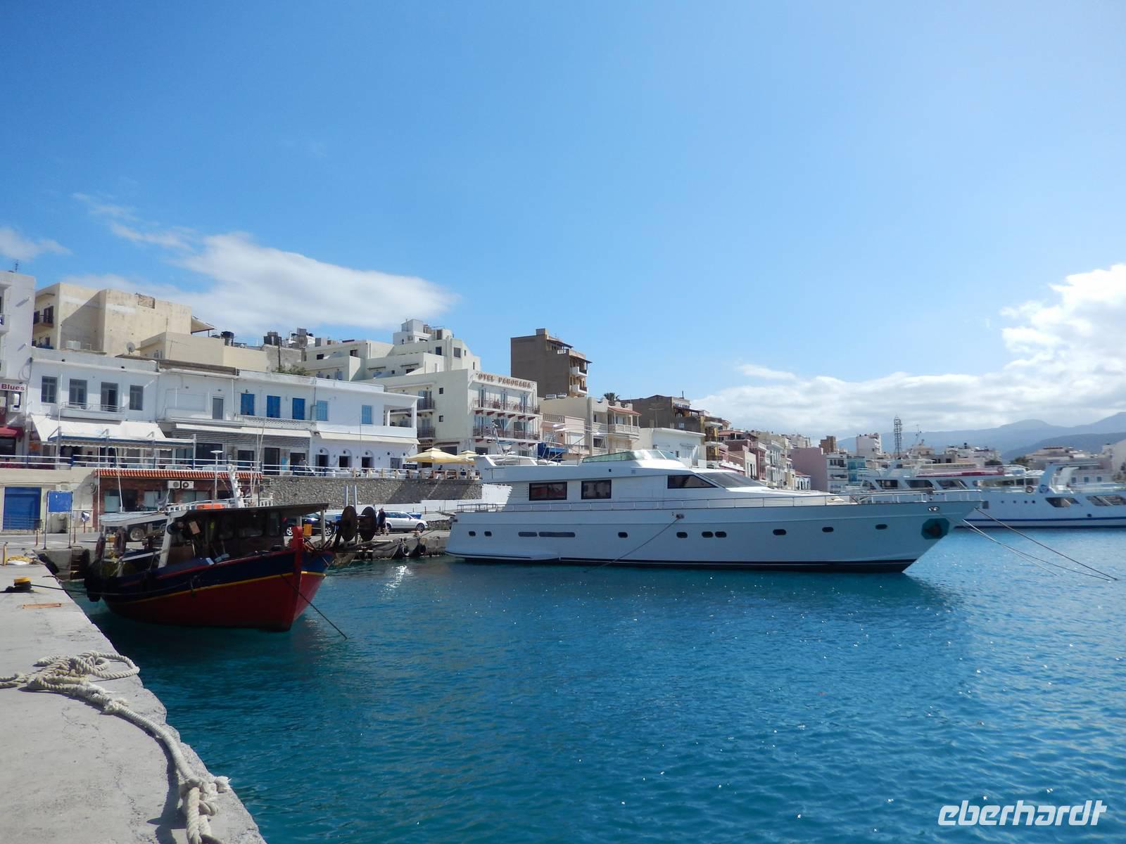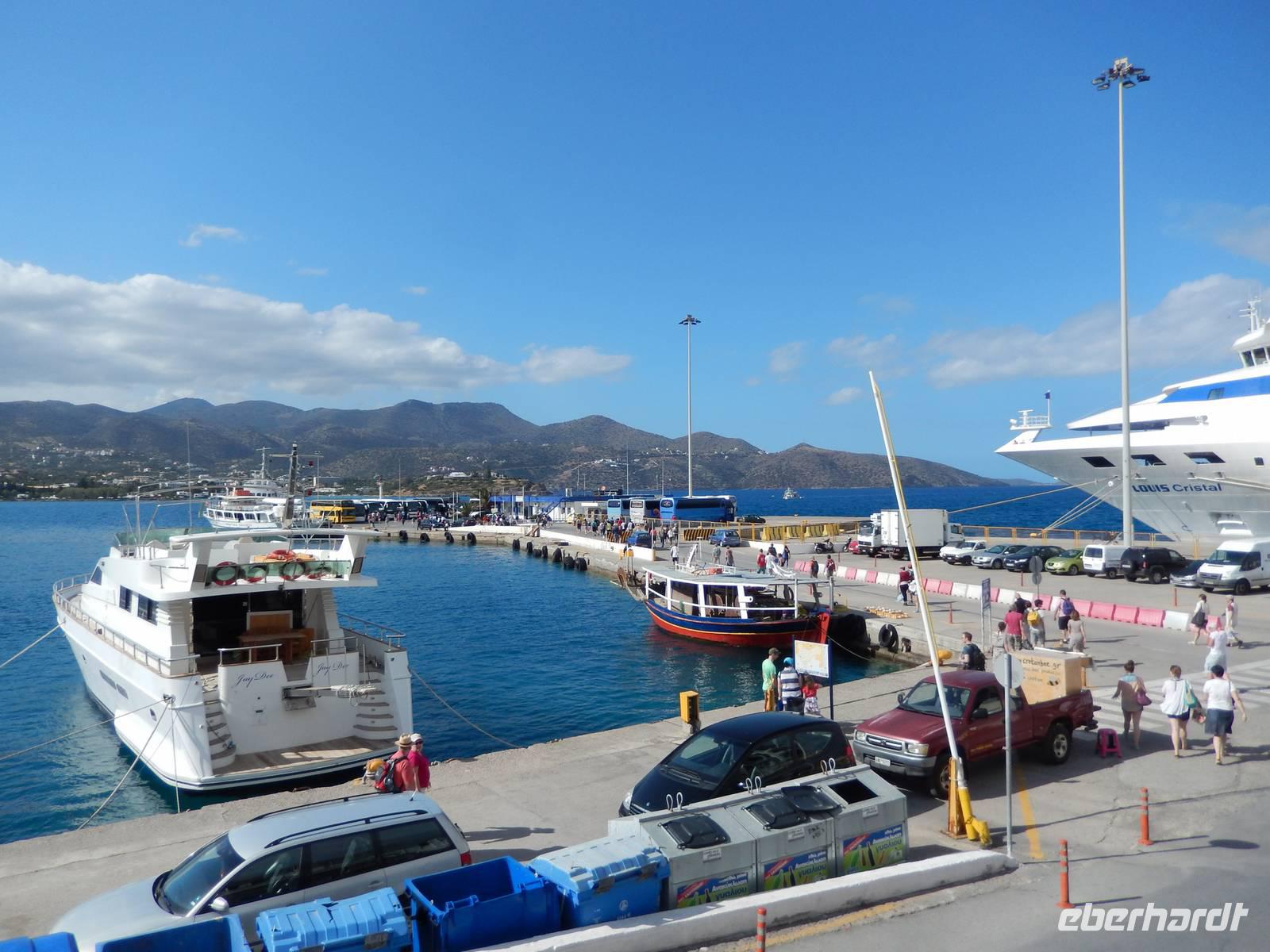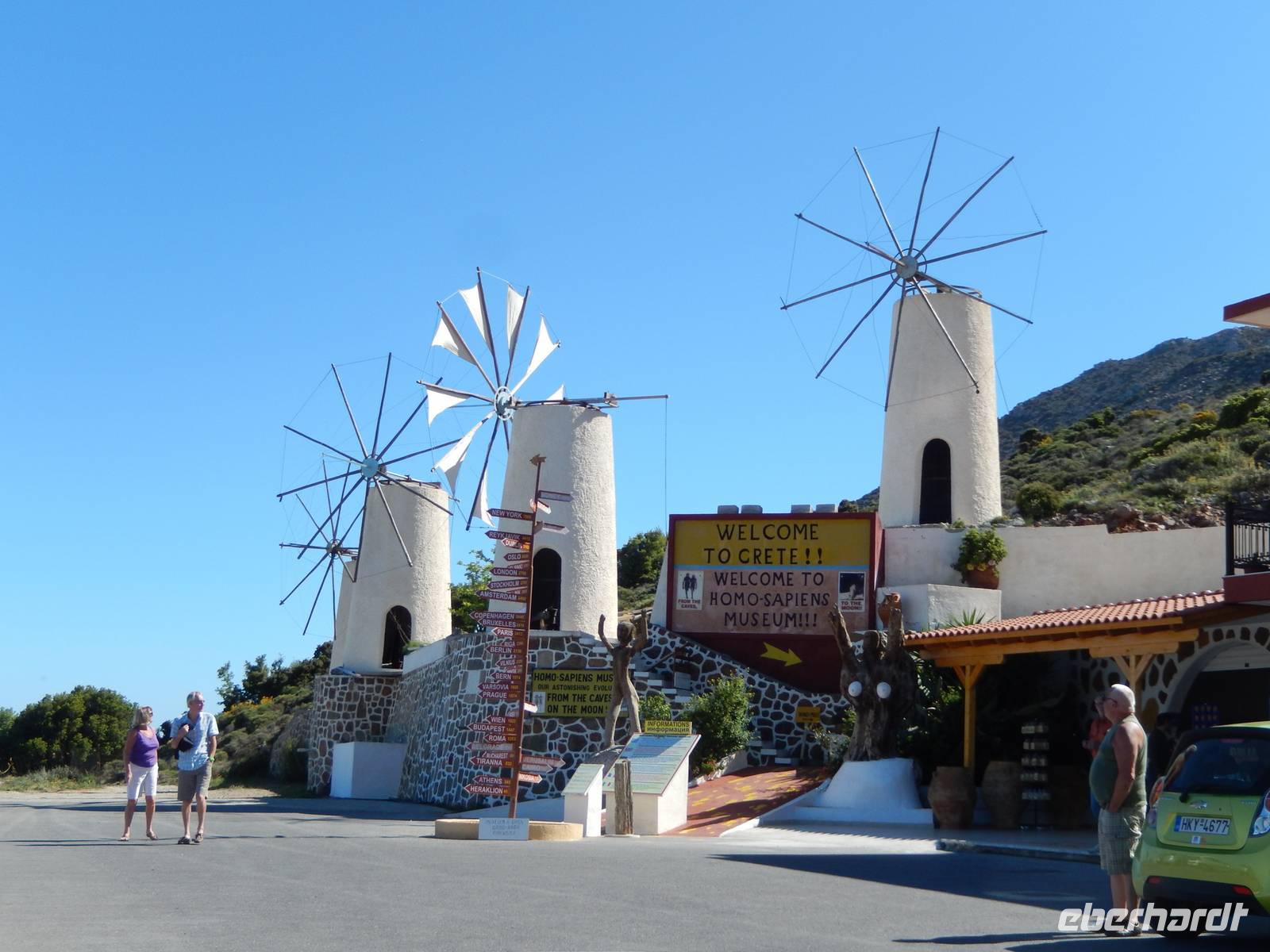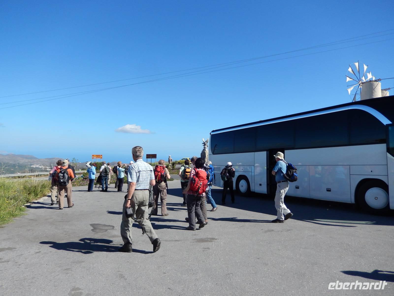 Nachdem wir gut ausgeruht und gestärkt vom leckeren Frühstück waren, wurden wir von Maria abgeholt, um heute unsere erste Wanderung zu unternehmen. Doch bevor die Wanderschuhe richtig zum Einsatz kamen, besuchten wir das beschauliche Kloster Kera Kardiotissa. Wir wurden sehr gastfreundlich empfangen und durften das selbstgemachte süße Brot probieren. Anschließend besichtigten wir die kleine Klosterkirche und Maria informierte uns über die Bedeutung der alten, aber noch gut erhaltenen Fresken und das Leben in dem kleinen Kloster. Weiter ging es dann zur Lasithi-Hochebene, um unsere Wanderung nach Tzermiado zu beginnen. Wir hatten tolles Wanderwetter und somit eine grandiose Aussicht auf die Hochebene und das Meer am Horizont. Während der Einsteigertour entdeckten wir viele kleine Pflänzchen am Wegesrand: Orchideen, Alpenveilchen, Kamille und zum Schluss einen Drachenwurz. Im urigen Tzermiado angekommen, erwartete uns bereits der Bus, um uns nach Psychro, zur Höhle des Zeus zu chauffieren. Bevor wir die Geburtsstätte des Zeus besichtigten, kehrten wir noch in einer Taverne an den alten Windrädern ein und genossen die kretischen Köstlichkeiten aus eigenem Anbau. Selbstgemachter Käse, griechischer Salat und dazu ein Gläschen Wein - so konnten wir es doch aushalten :-). Doch nun weiter zur Diktäischen Grotte, zu der uns ein steiler Pfad bergauf bis zum Eingang der eindrucksvollen Tropfsteinhöhle führte. Nun wurde es plötzlich mit einem Schlag um einige Grad kühler, aber auch diese Eindrücke waren sehr reizvoll. Den Abschluss des Tages bildete für heute unser Besuch in Agios Nikolaos, einer idyllisch gelegenen Hafenstadt im Osten Kretas, die noch einmal Gelegenheit bot zum Bummeln, Kaffee-Trinken und sich unters kretische Volk zu mischen.