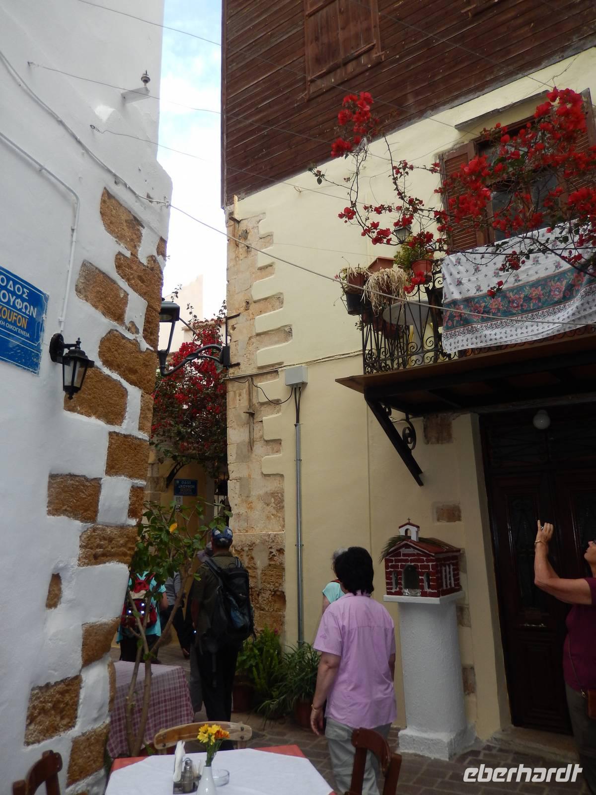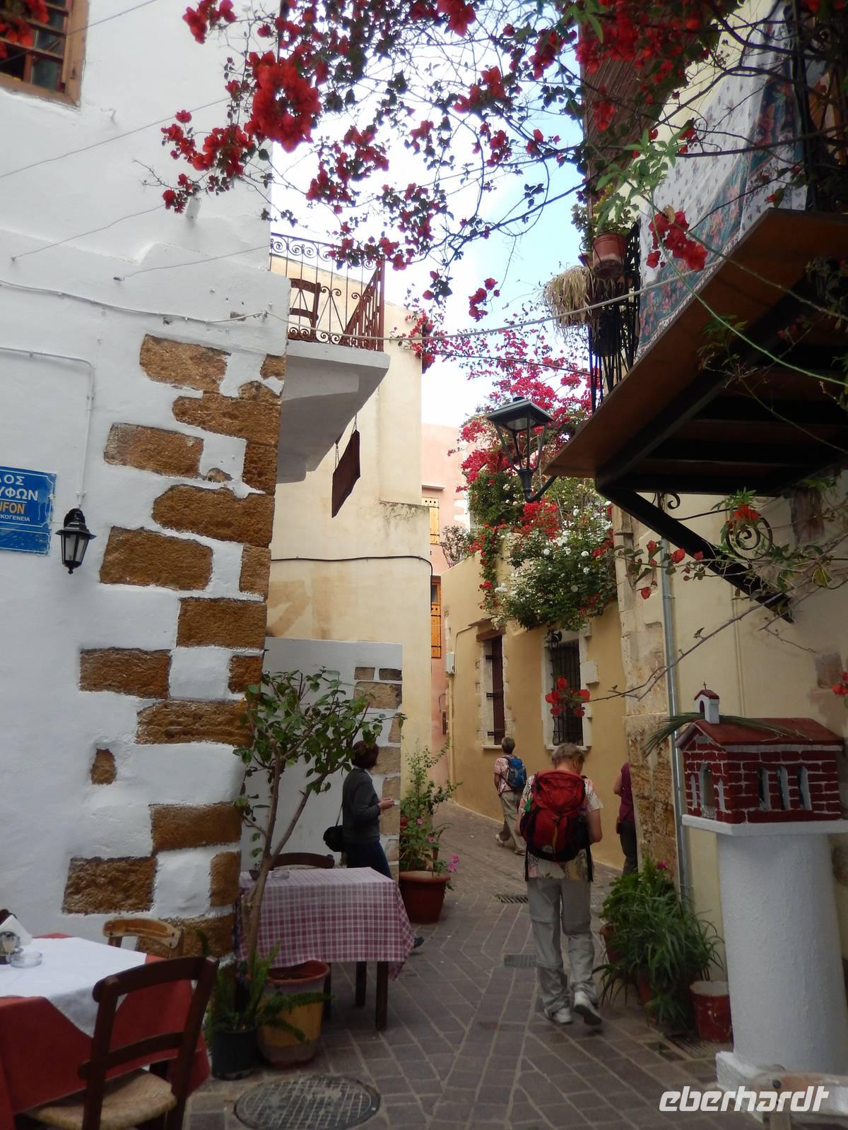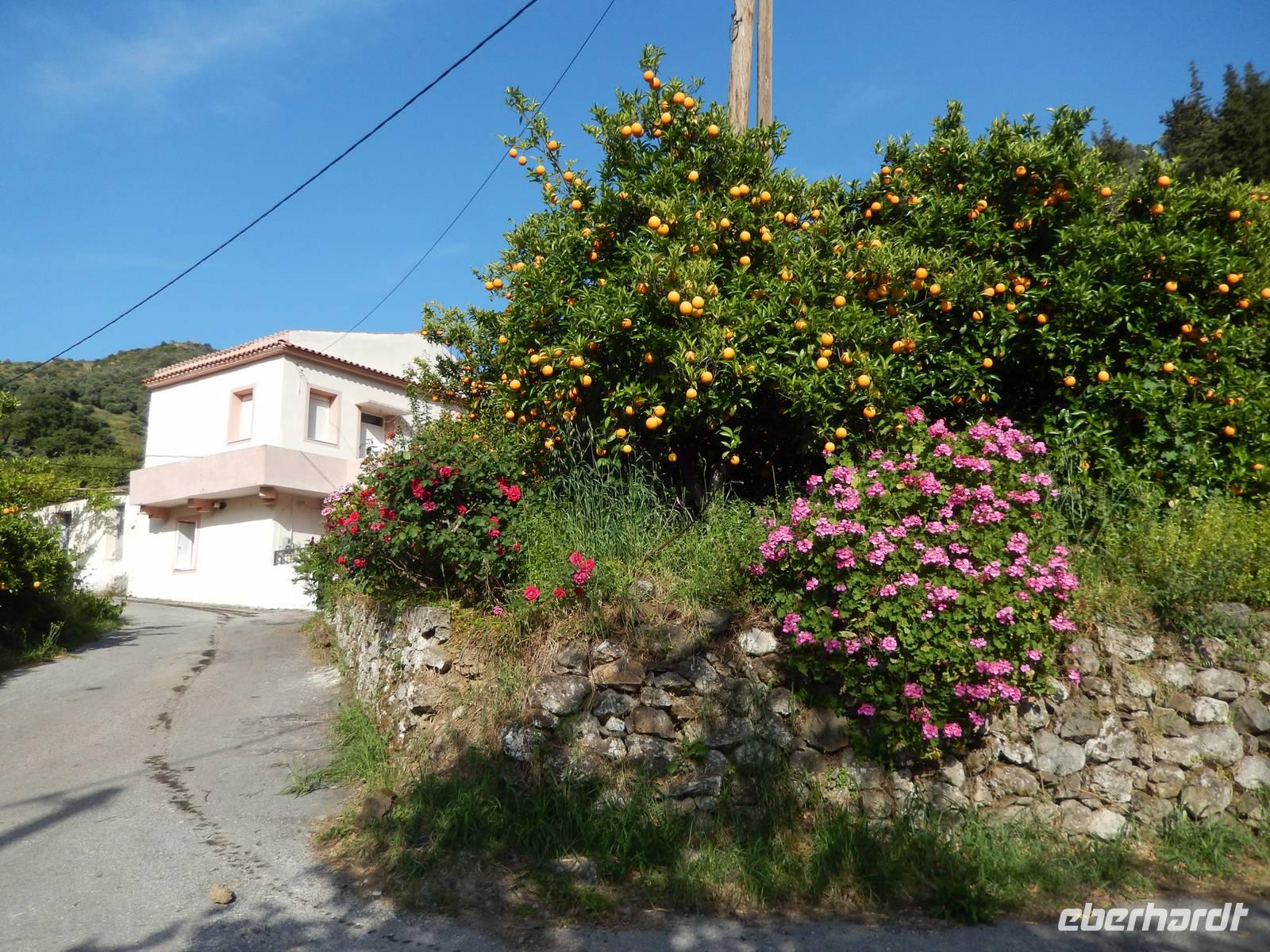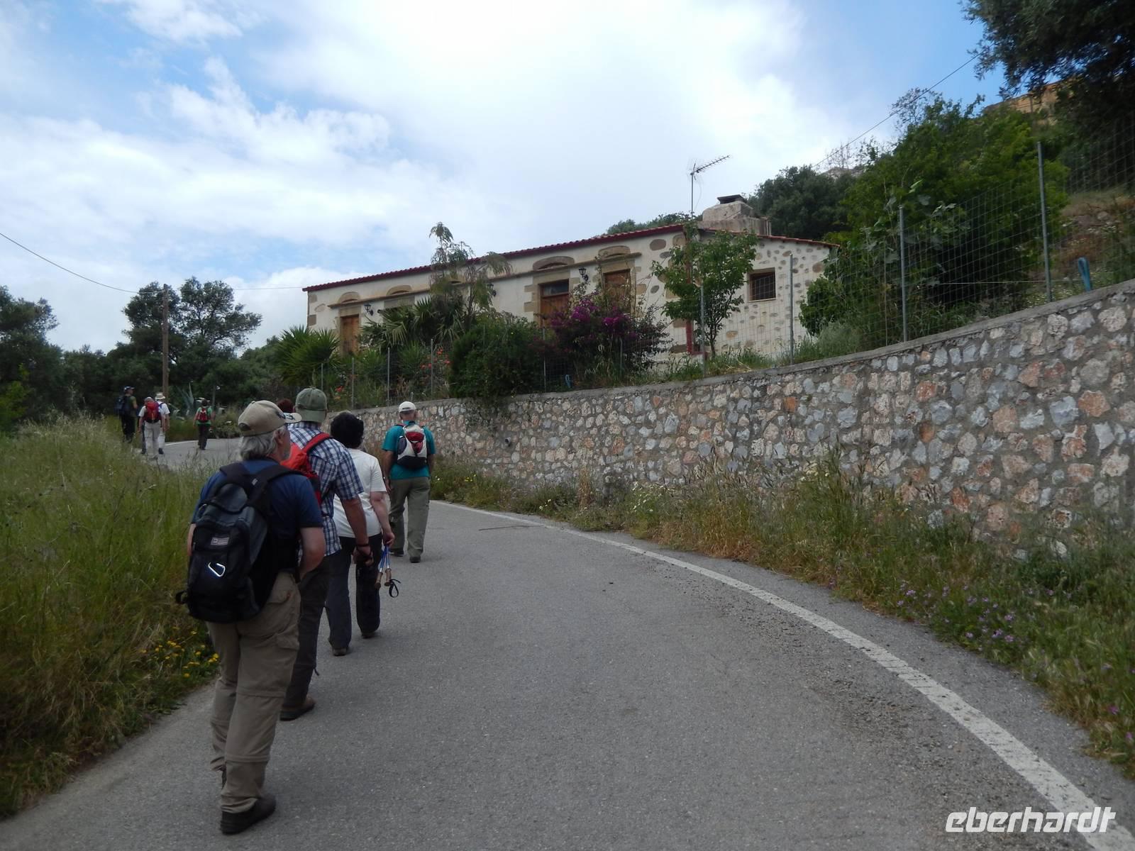Unsere Reise führte uns heute in die einstige Inselshauptstadt Chania. Sie ist bekannt für ihren venezianischen Hafen mit Leuchtturm, den türkischen Bauten und der großen Festung. Mit Maria machten wir als Erstes einen Stadtrundgang um die wichtigsten Punkte der Stadt kennenzulernen. Wir schlenderten durch das jüdische Viertel, das mit den üppigen Bougainvillean und Rosen immer wieder tolle Fotomotive bot. Dann ging es weiter am Hafen entlang bevor wir beim Archäologischen Museum in der venezianischen Kirche ankamen. Maria zeigte uns die vielen Ausstellungsstücke aus vergangener Zeit und deren Bedeutung. Nach dem Besuch konnte dann Jeder noch individuell durch Chania bummeln. Maria und ich kauften alles für unser kretisches Picknick ein, dass wir auf Grund eines kleinen Busproblems etwas früher als geplant durchführten. Aber der Platz war schön und passend für unser „kleines Dinner". Alle packten mit an, schnippelten Gemüse, Fetakäse und Wurst - alles zusammen mit etwas Salz, Oregano und Olivenöl vermischt ergab unseren leckeren, griechischen Salat. Dazu gab es Brot, Tzatziki, Erbsenpaste, Oliven und natürlich Wein...hmmmm lecker! In der Zwischenzeit hatte unser Busfahrer Jorgos auch das kleine Problem mit dem Bus geregelt, so dass wir weiter fahren konnten zum Ausgangspunkt unserer heutigen Wanderung. Der erste Teil verlief steil bergan auf einem einstigen Landweg, der in den letzten Jahren leider asphaltiert wurde, so dass der Weg sehr mühselig war. Aber die Ausblicke waren dennoch sehr schön und entschädigten die Mühen. Nach dem kleinen Ort Zourvas bogen wir dann ab auf einen Feldweg ab, wanderten durch Orangen- und Zitronenhaine und kamen schließlich in unserem Zielort Messkla an.