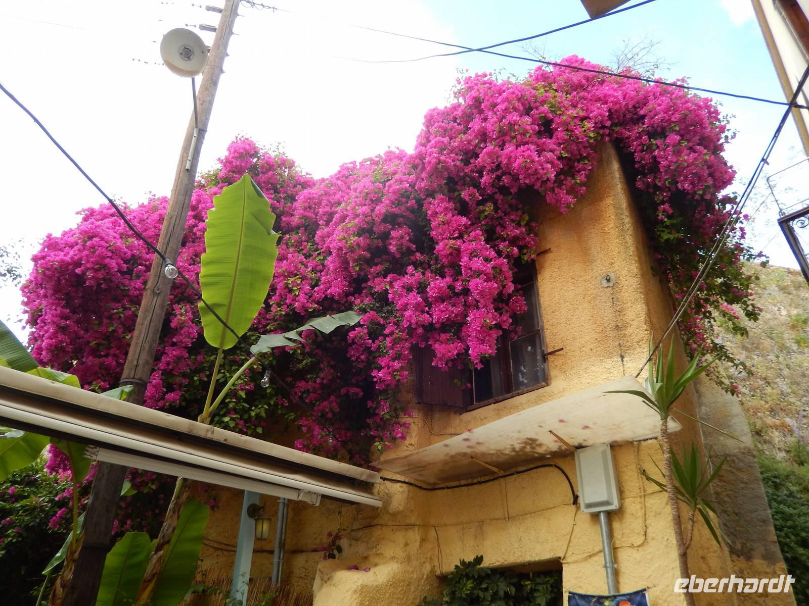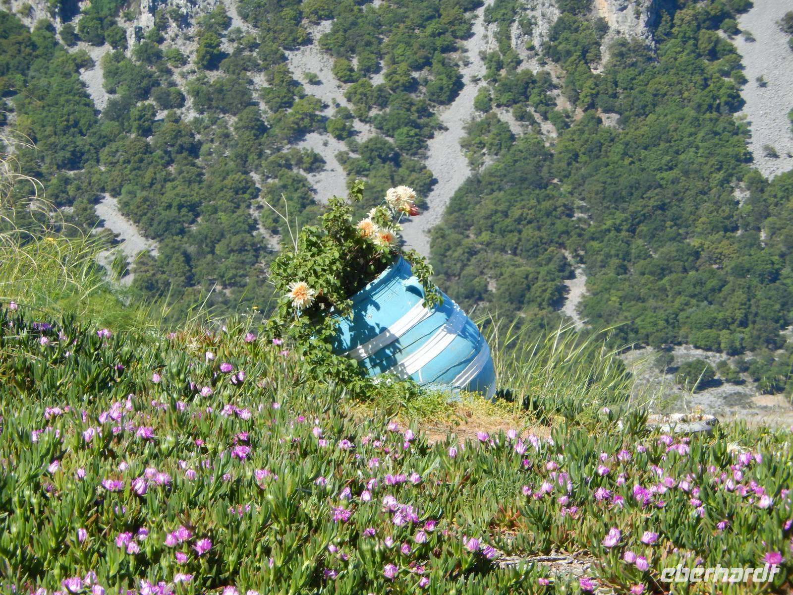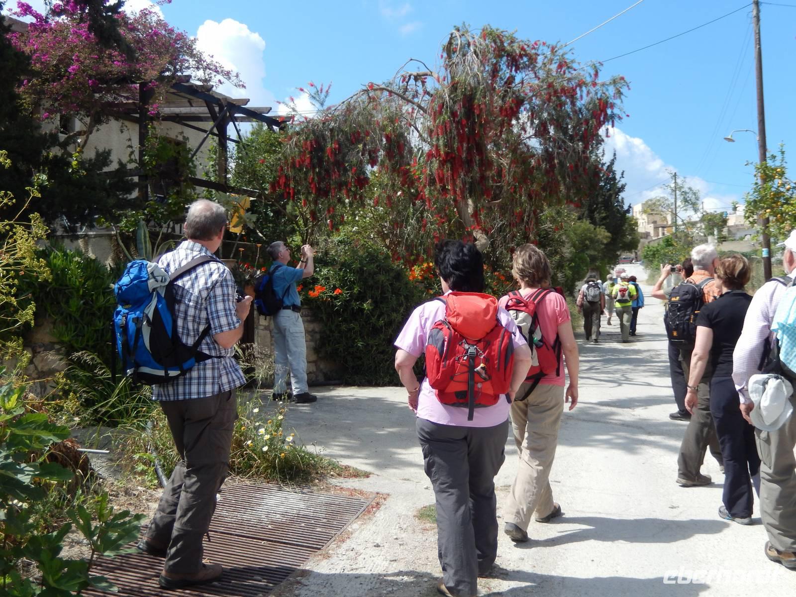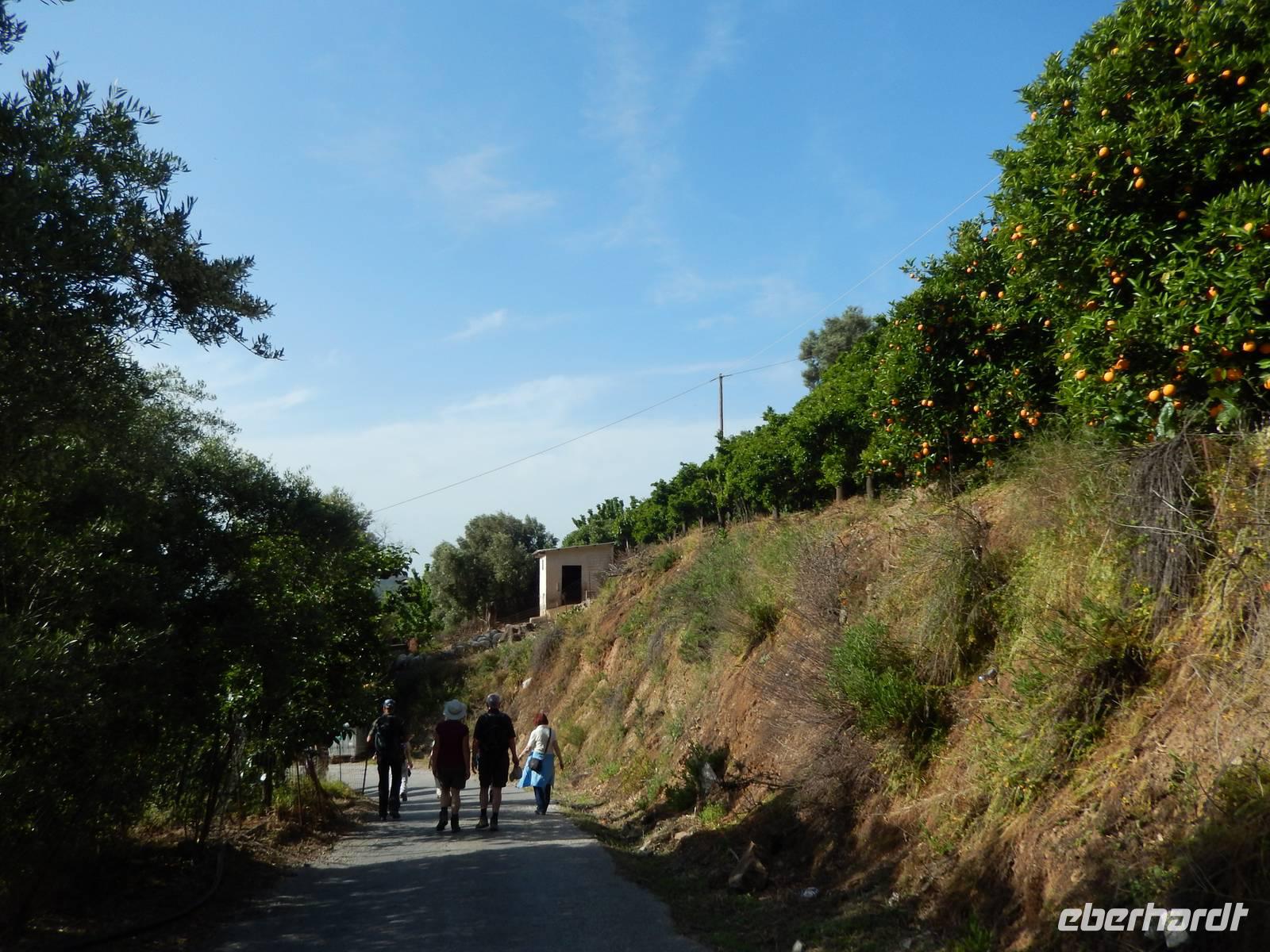 Unsere Reise führte uns heute in die einstige Inselshauptstadt Chania. Sie ist bekannt für ihren venezianischen Hafen mit Leuchtturm, den türkischen Bauten und der großen Festung. Mit Maria machten wir als Erstes einen Stadtrundgang um die wichtigsten Punkte der Stadt kennenzulernen. Wir schlenderten durch das jüdische Viertel, das mit den üppigen Bougainvillean und Rosen immer wieder tolle Fotomotive bot. Dann ging es weiter am Hafen entlang bevor wir beim Archäologischen Museum in der venezianischen Kirche ankamen. Maria zeigte uns die vielen Ausstellungsstücke aus vergangener Zeit und deren Bedeutung. Nach dem Besuch konnte dann Jeder noch individuell durch Chania bummeln. Maria und ich kauften alles für unser kretisches Picknick ein, dass wir auf Grund eines kleinen Busproblems etwas früher als geplant durchführten. Aber der Platz war schön und passend für unser „kleines Dinner". Alle packten mit an, schnippelten Gemüse, Fetakäse und Wurst - alles zusammen mit etwas Salz, Oregano und Olivenöl vermischt ergab unseren leckeren, griechischen Salat. Dazu gab es Brot, Tzatziki, Erbsenpaste, Oliven und natürlich Wein...hmmmm lecker! In der Zwischenzeit hatte unser Busfahrer Jorgos auch das kleine Problem mit dem Bus geregelt, so dass wir weiter fahren konnten zum Ausgangspunkt unserer heutigen Wanderung. Der erste Teil verlief steil bergan auf einem einstigen Landweg, der in den letzten Jahren leider asphaltiert wurde, so dass der Weg sehr mühselig war. Aber die Ausblicke waren dennoch sehr schön und entschädigten die Mühen. Nach dem kleinen Ort Zourvas bogen wir dann ab auf einen Feldweg ab, wanderten durch Orangen- und Zitronenhaine und kamen schließlich in unserem Zielort Messkla an.