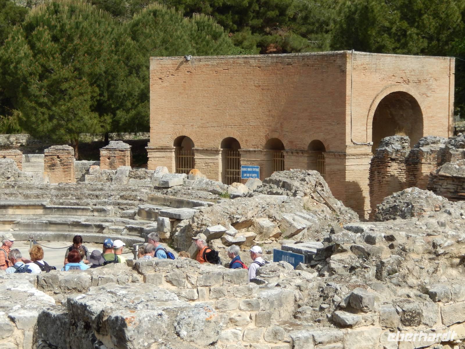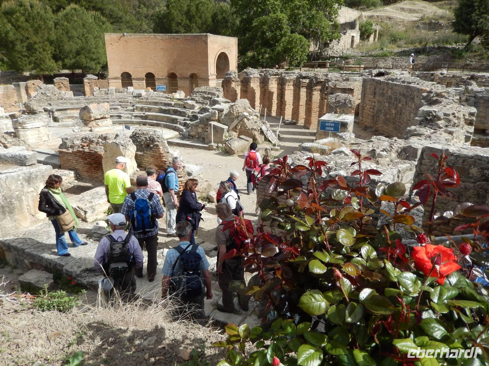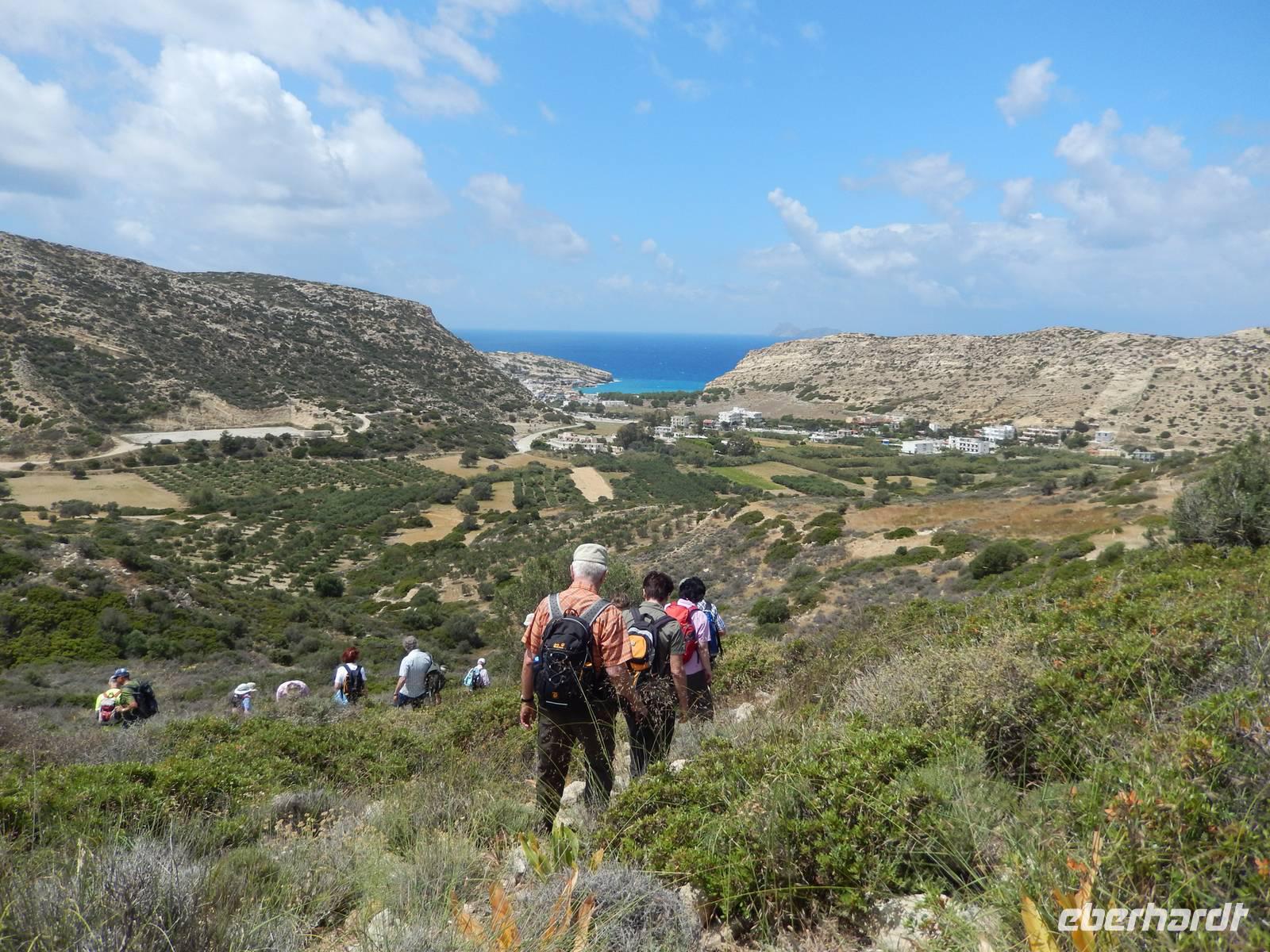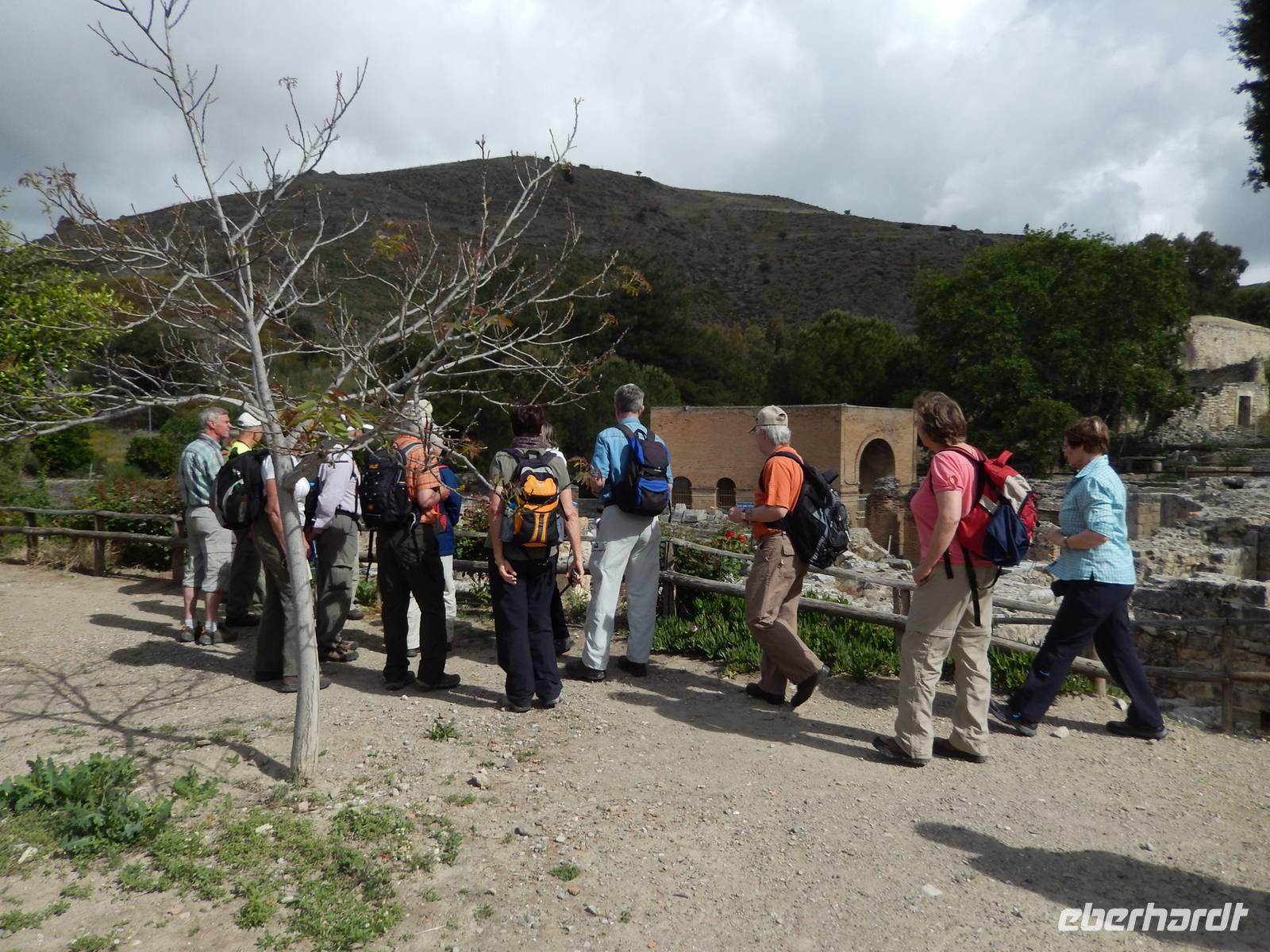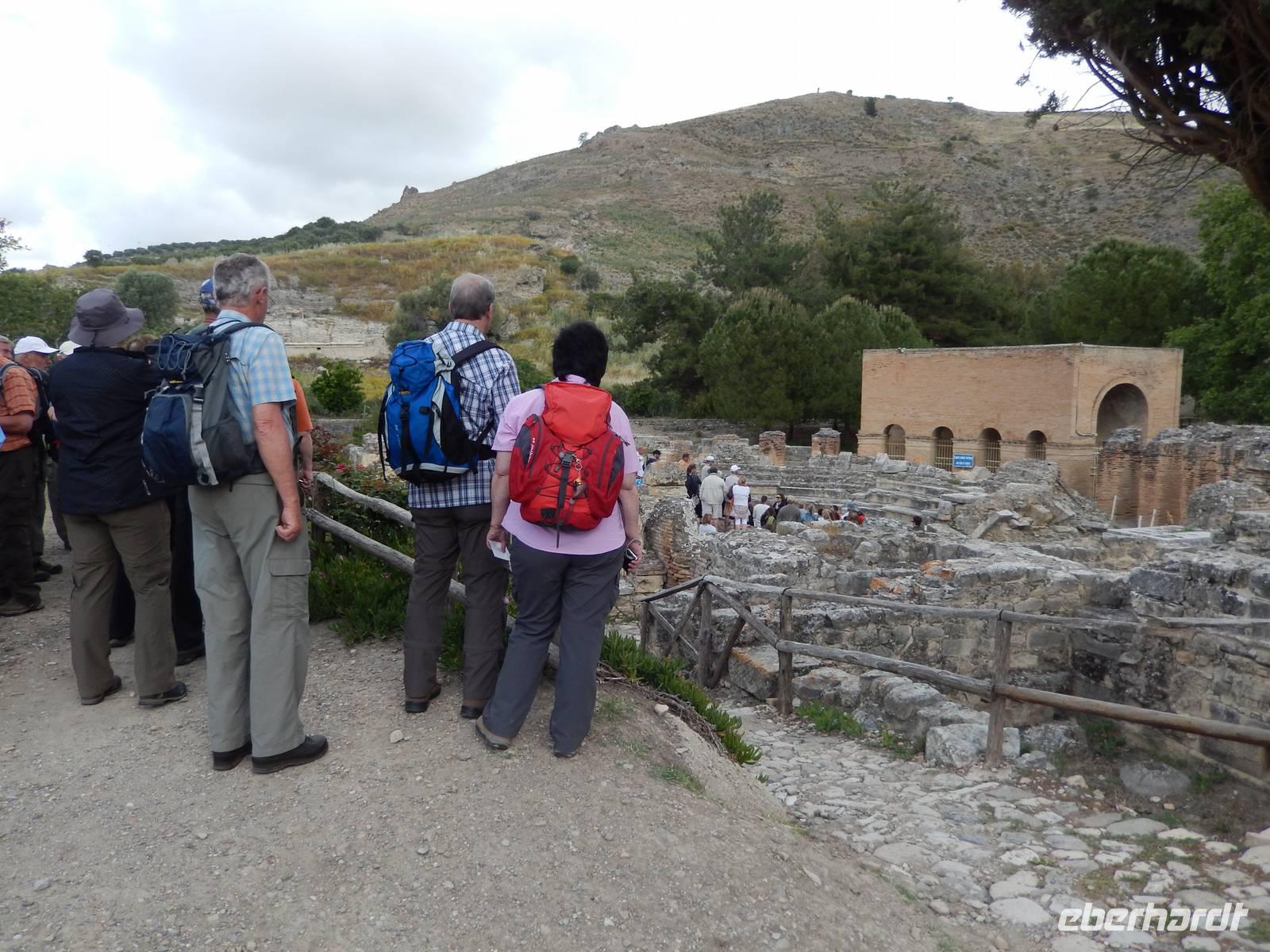 Nachdem wir gestern die Lasithi-Hochebene kennengelernt hatten, stand heute die eindrucksvolle Messara-Ebene auf dem Programm. Doch bevor wir unsere Wanderung unternahmen, besuchten wir das römische Odeon in Gortys, eine der ersten Städte Kretas, die das Christentum annahm. Maria führte uns durch diese kleine Anlage und wir konnten auch hier wieder interessante Funde und Ausgrabungen entdecken, wie beispielsweise den ersten eingemeißelten Rechtskodex aus der Zeit 500 vor Christus. Da die Titus Basilika derzeit auf Grund von Restaurationsarbeiten verhüllt war, ging es dann auch gleich weiter zur Wanderung. Zu Beginn gab es zur kleinen Stärkung Mispeln, die von Maria am Morgen noch im eigenen Garten gepflückt und dann an unsere Reisegäste verteilt wurden. Wir wanderten von Pitsidia, einem kleinen beschaulichen Dörfchen, über den Höhenweg in den Küstenort Matala. Auf dem „Gipfel" durfte natürlich ein Gruppenfoto mit schönem Blick auf das Meer nicht fehlen. In Matala angekommen, konnten wir uns entspannen, etwas stärken oder für die ganz Mutigen auch das kühle Nass austesten. Bevor es wieder in unser Hotel zurückging, besuchten wir die minoische Palastanlage von Festos, die uns an die Ausgrabungsstätte von Knossos erinnerte, nur war sie etwas kleiner und vielleicht an der einen oder anderen Stelle detailgetreuer. Wir hatten einen tollen Blick in die mit Olivenhainen überzogenen Ebenen und auch das Wetter war wieder super. Im Hotel angekommen machten wir uns noch etwas frisch und genossen in einer urigen Taverne einen griechischen Abend mit Folklore, Musik, Tanz und Gesang. Auch wir waren mittendrin, haben gemeinsam Sirtaki getanzt und ließen uns von der griechischen Lebensfreude anstecken.