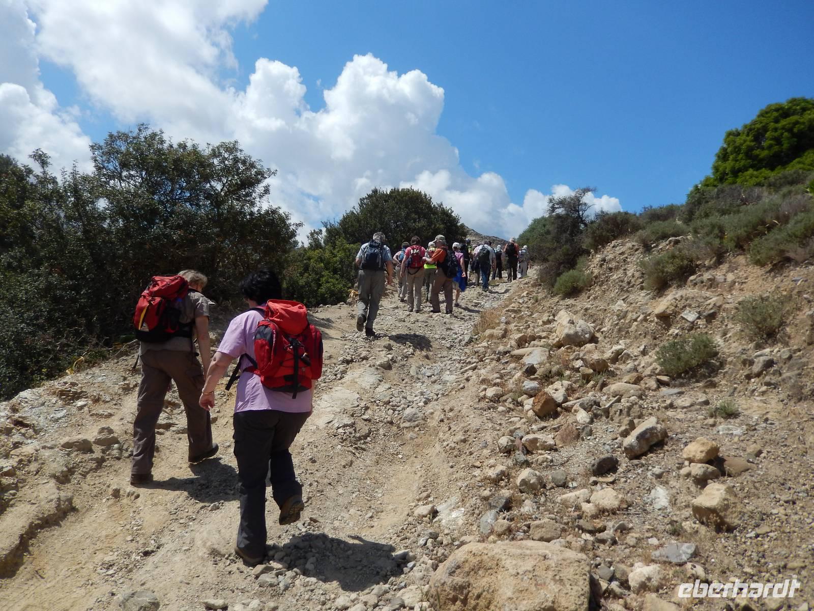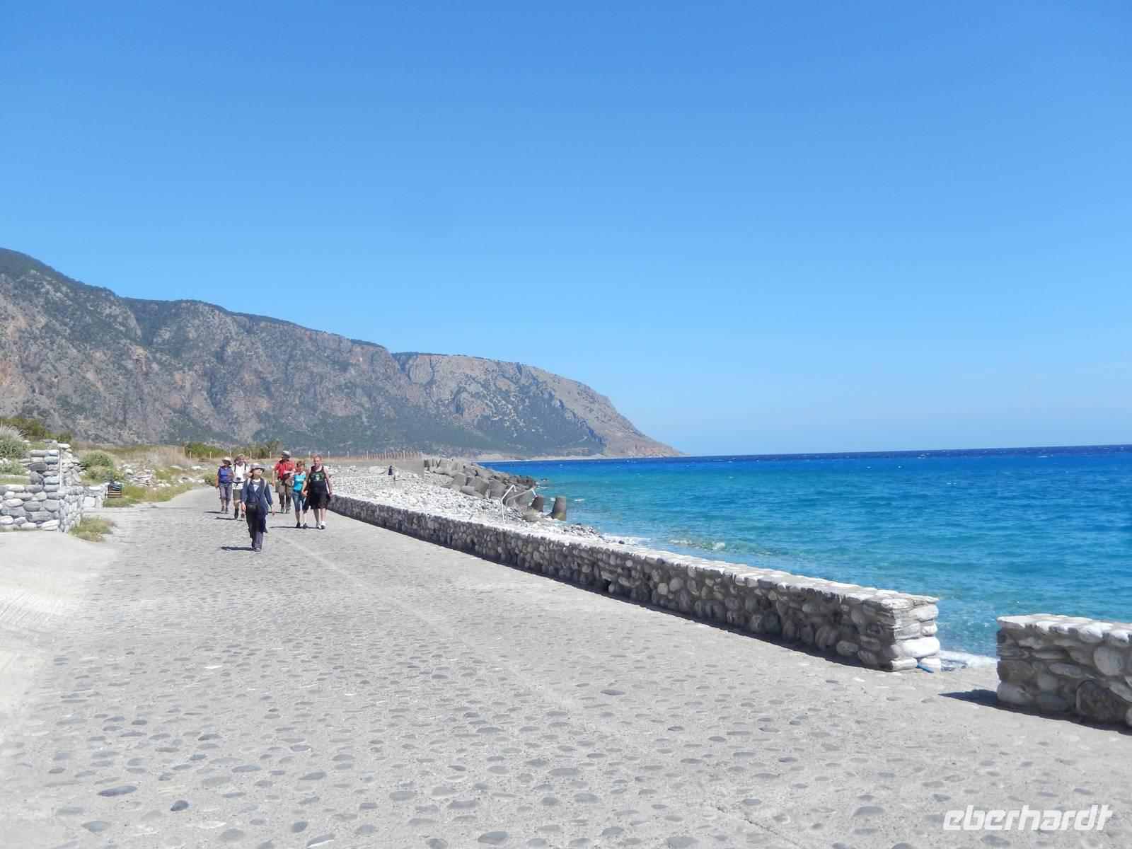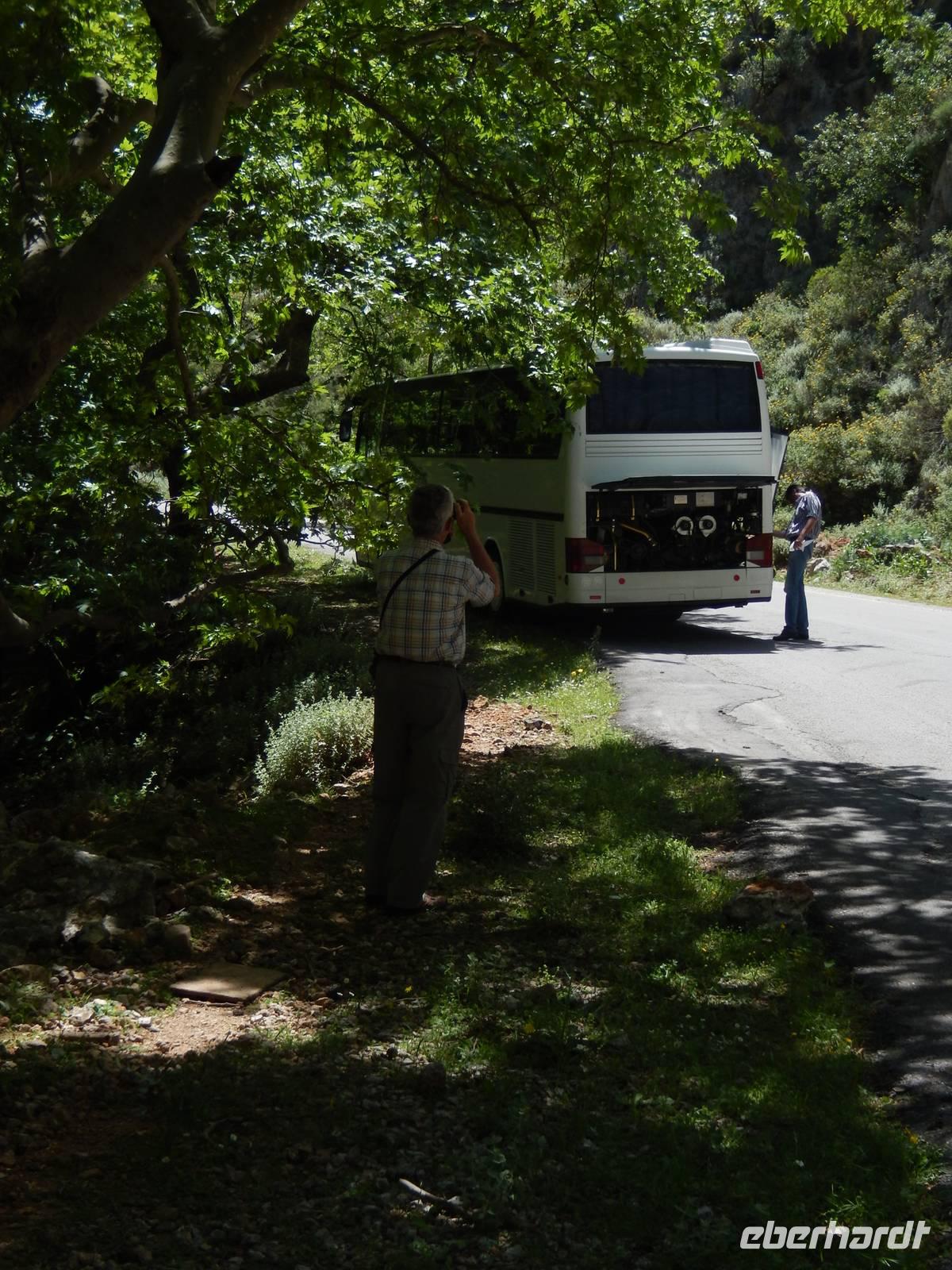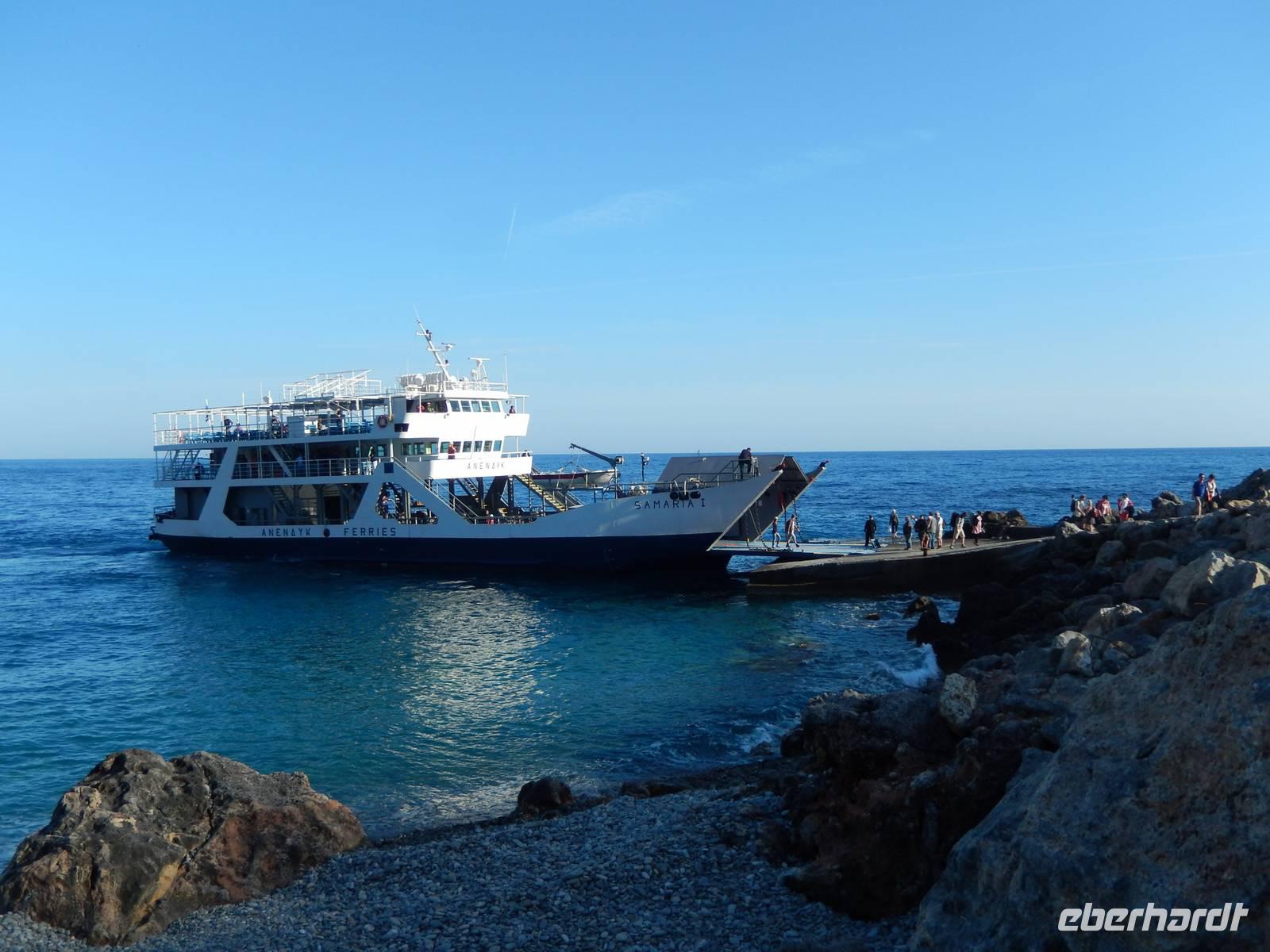 Auf den heutigen Tag freuten wir uns schon die ganze Woche: die Wanderung in die längste Schlucht Europas, in die Samaria-Schlucht. Die Sonne lachte wieder und so ging es gegen acht Uhr in den Süden der Insel zum Ausgangspunkt der Wanderung. Ich verteilte die Eintrittskarten, die Jeder sorgsam aufbewahren sollte, da am Ende der Schlucht kontrolliert wird, ob auch alle Gäste die Schlucht verlassen haben. Auf 1250m begannen wir nun die Tour von der Omalos-Hochebene durch die Bergwelt Lefka Ori bis zum Lybischen Meer. Die Tour führte zunächst über viele Steinstufen hinab auf den Schluchtgrund und die steilen, eindrucksvollen Felswände präsentierten sich in voller Schönheit. Es ging weiter bergab vorbei an vielen Kiefern, uralten Zypressen und riesengroßen Felsblöcken. Zwischendurch gibt es immer einige Rastplätze und Quellen, die zum Pausieren bzw. Erfrischen einluden. Wir pausierten an einem schattigen Plätzchen und verzehrten unser leckeres Sandwich. Der Weg führte nun über Geröll und Flussstege, aber man musste immer wieder stehenbleiben um die gewaltigen Steinwände zu betrachten. Bald darauf verengte sich die Schlucht und wir passierten die „Eiserne Pforte", die mit 3 Metern engste Stelle der Schlucht. Von hier aus wanderten wir an vielen Oleandern und kleineren Ruinen vorbei bis in den Küstenort Agia Roumeli. Dort angekommen, entspannten wir uns in einer Taverne bei einem leckeren Eis oder einem kühlen Bier. Dann war noch etwas Zeit am Strand zu verweilen bevor es mit der Fähre nach Sougia und wieder zurück ins Hotel ging. Alle waren sehr zufrieden, glücklich und stolz die Tour gemeistert zu haben. Als Abschluss dieser gelungenen Tour spendierte ich einen kretischen Raki und wir stießen gemeinsam an. Im Hotel angekommen, hatten wir uns unser Abendessen redlich verdient!