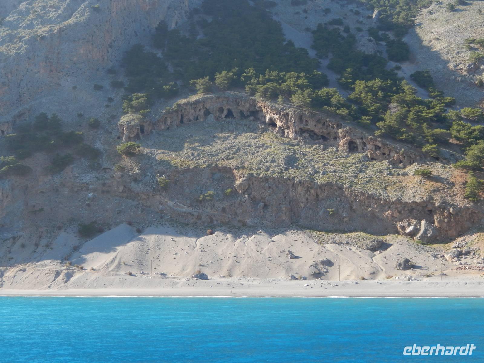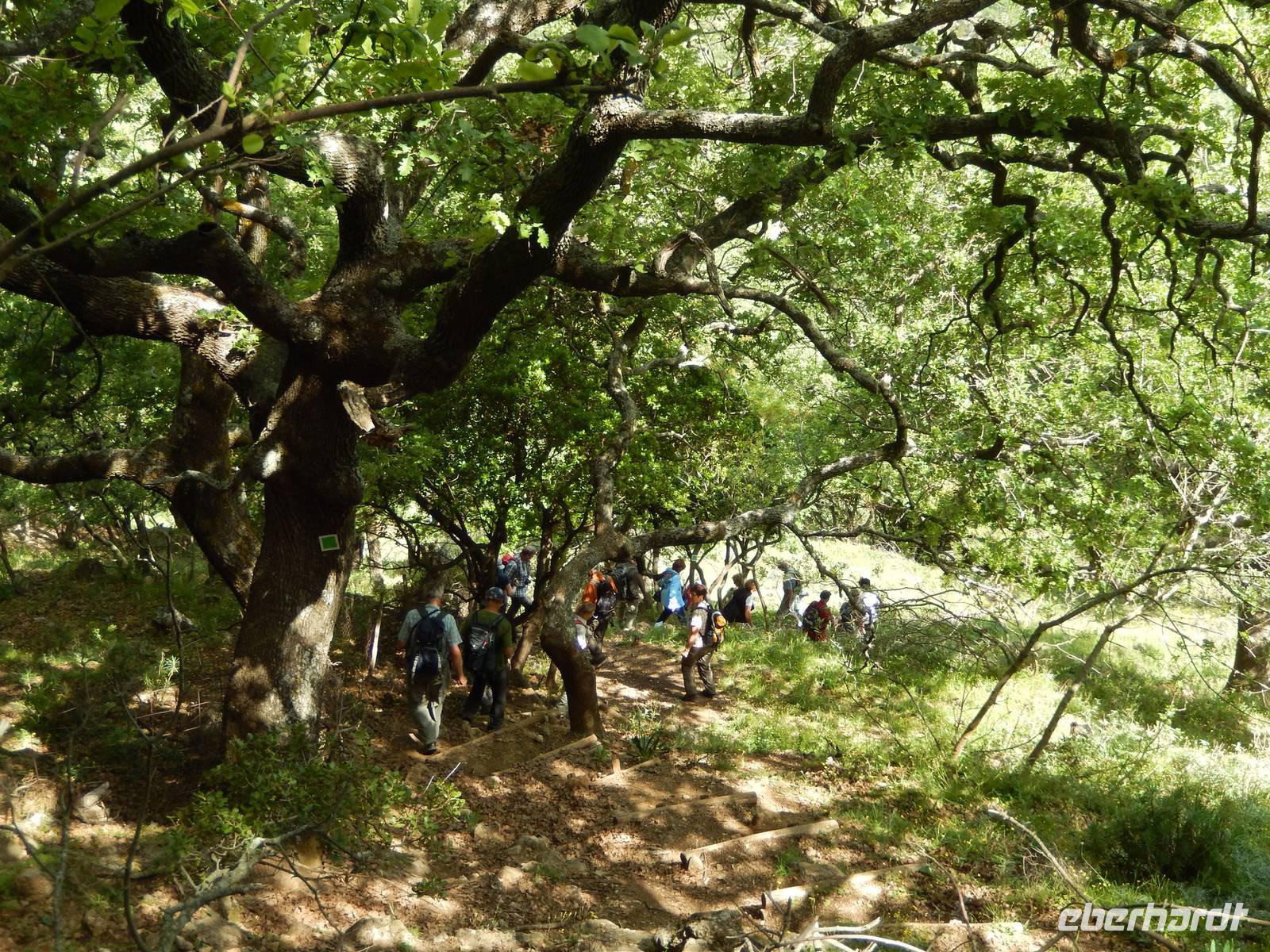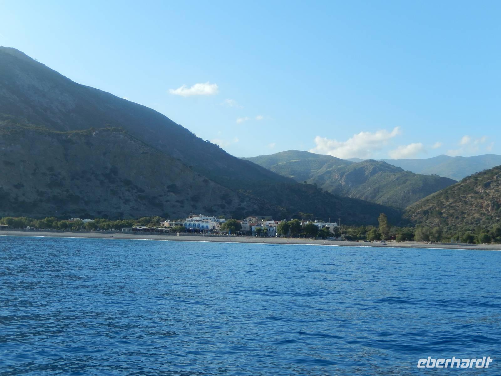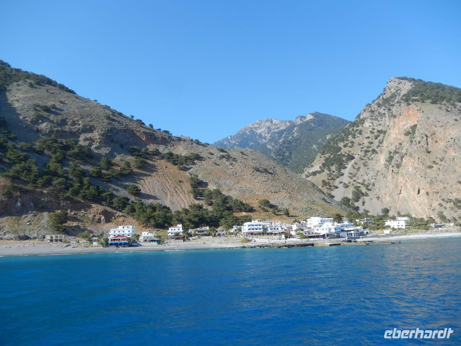 Auf den heutigen Tag freuten wir uns schon die ganze Woche: die Wanderung in die längste Schlucht Europas, in die Samaria-Schlucht. Die Sonne lachte wieder und so ging es gegen acht Uhr in den Süden der Insel zum Ausgangspunkt der Wanderung. Ich verteilte die Eintrittskarten, die Jeder sorgsam aufbewahren sollte, da am Ende der Schlucht kontrolliert wird, ob auch alle Gäste die Schlucht verlassen haben. Auf 1250m begannen wir nun die Tour von der Omalos-Hochebene durch die Bergwelt Lefka Ori bis zum Lybischen Meer. Die Tour führte zunächst über viele Steinstufen hinab auf den Schluchtgrund und die steilen, eindrucksvollen Felswände präsentierten sich in voller Schönheit. Es ging weiter bergab vorbei an vielen Kiefern, uralten Zypressen und riesengroßen Felsblöcken. Zwischendurch gibt es immer einige Rastplätze und Quellen, die zum Pausieren bzw. Erfrischen einluden. Wir pausierten an einem schattigen Plätzchen und verzehrten unser leckeres Sandwich. Der Weg führte nun über Geröll und Flussstege, aber man musste immer wieder stehenbleiben um die gewaltigen Steinwände zu betrachten. Bald darauf verengte sich die Schlucht und wir passierten die „Eiserne Pforte", die mit 3 Metern engste Stelle der Schlucht. Von hier aus wanderten wir an vielen Oleandern und kleineren Ruinen vorbei bis in den Küstenort Agia Roumeli. Dort angekommen, entspannten wir uns in einer Taverne bei einem leckeren Eis oder einem kühlen Bier. Dann war noch etwas Zeit am Strand zu verweilen bevor es mit der Fähre nach Sougia und wieder zurück ins Hotel ging. Alle waren sehr zufrieden, glücklich und stolz die Tour gemeistert zu haben. Als Abschluss dieser gelungenen Tour spendierte ich einen kretischen Raki und wir stießen gemeinsam an. Im Hotel angekommen, hatten wir uns unser Abendessen redlich verdient!