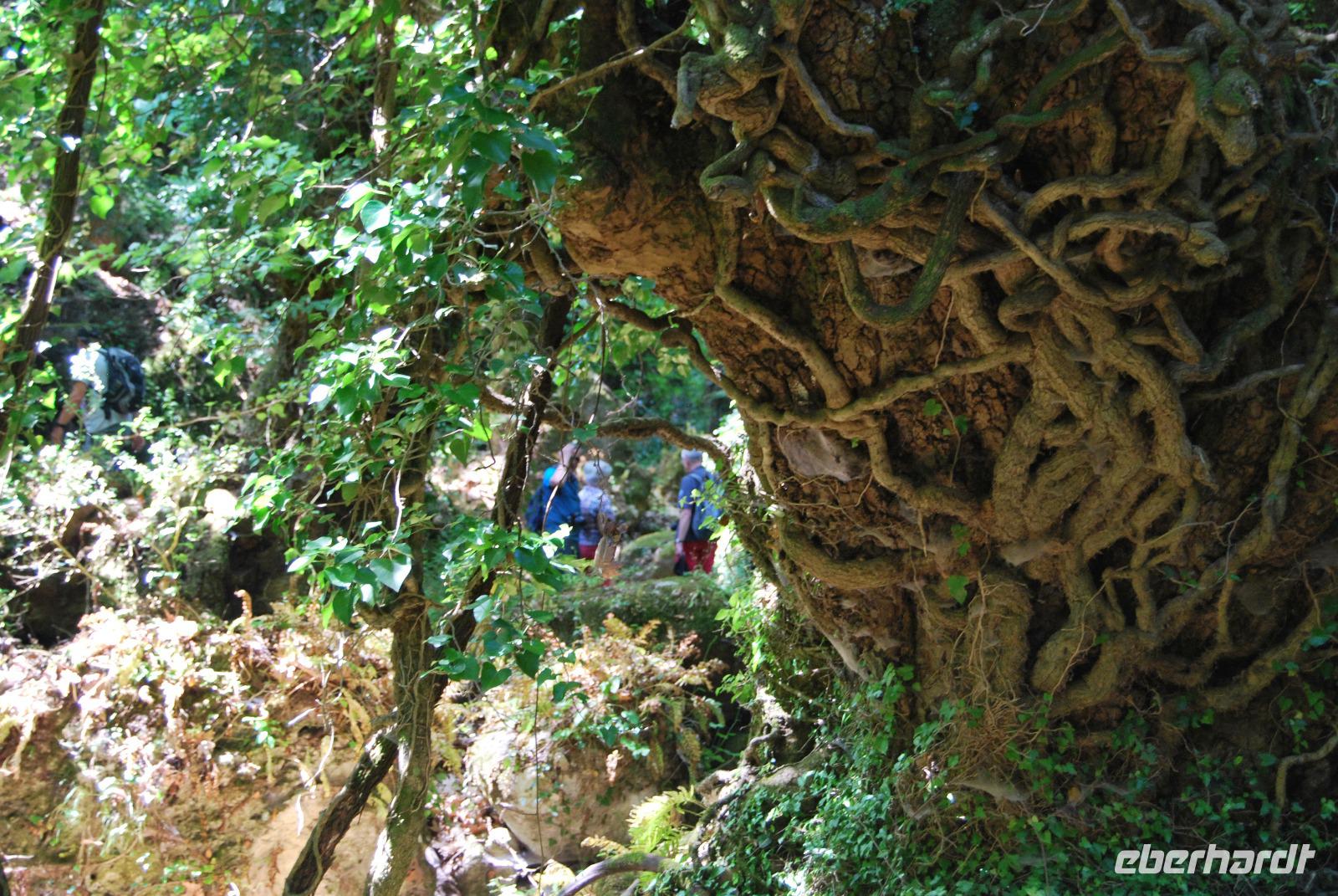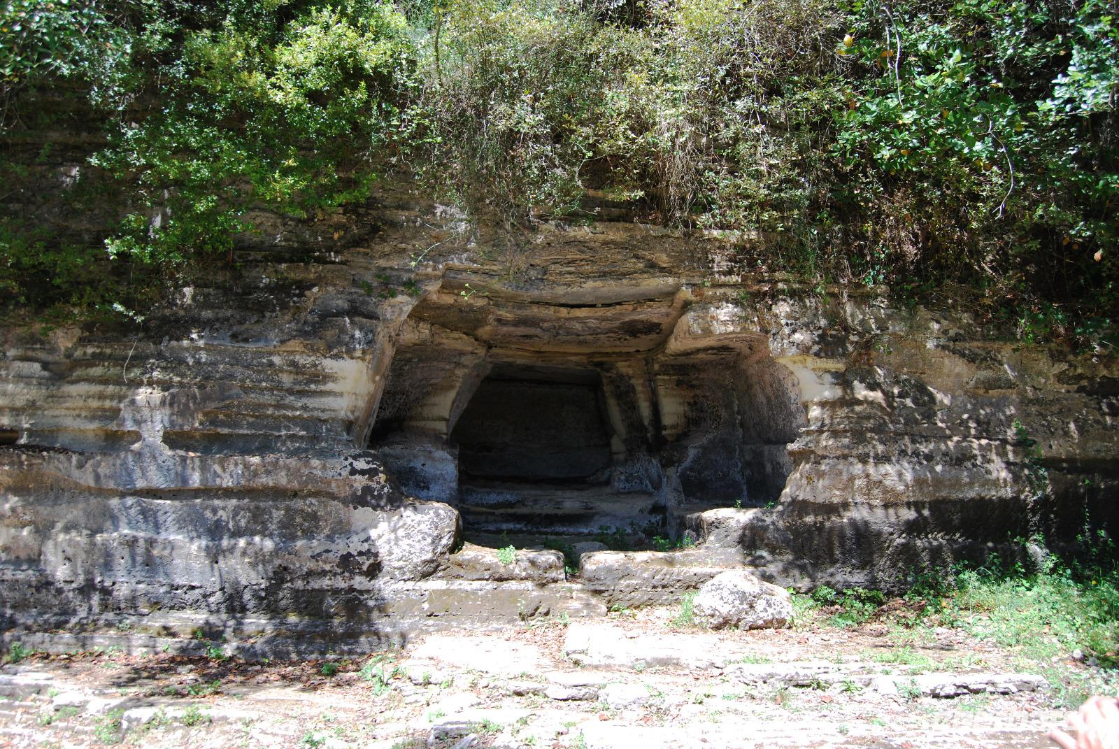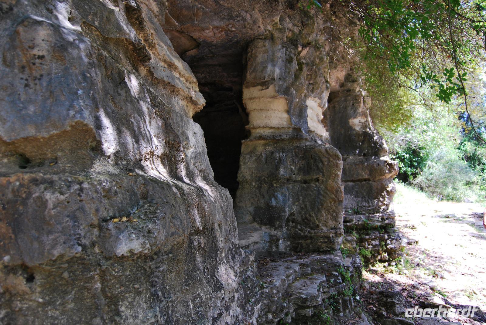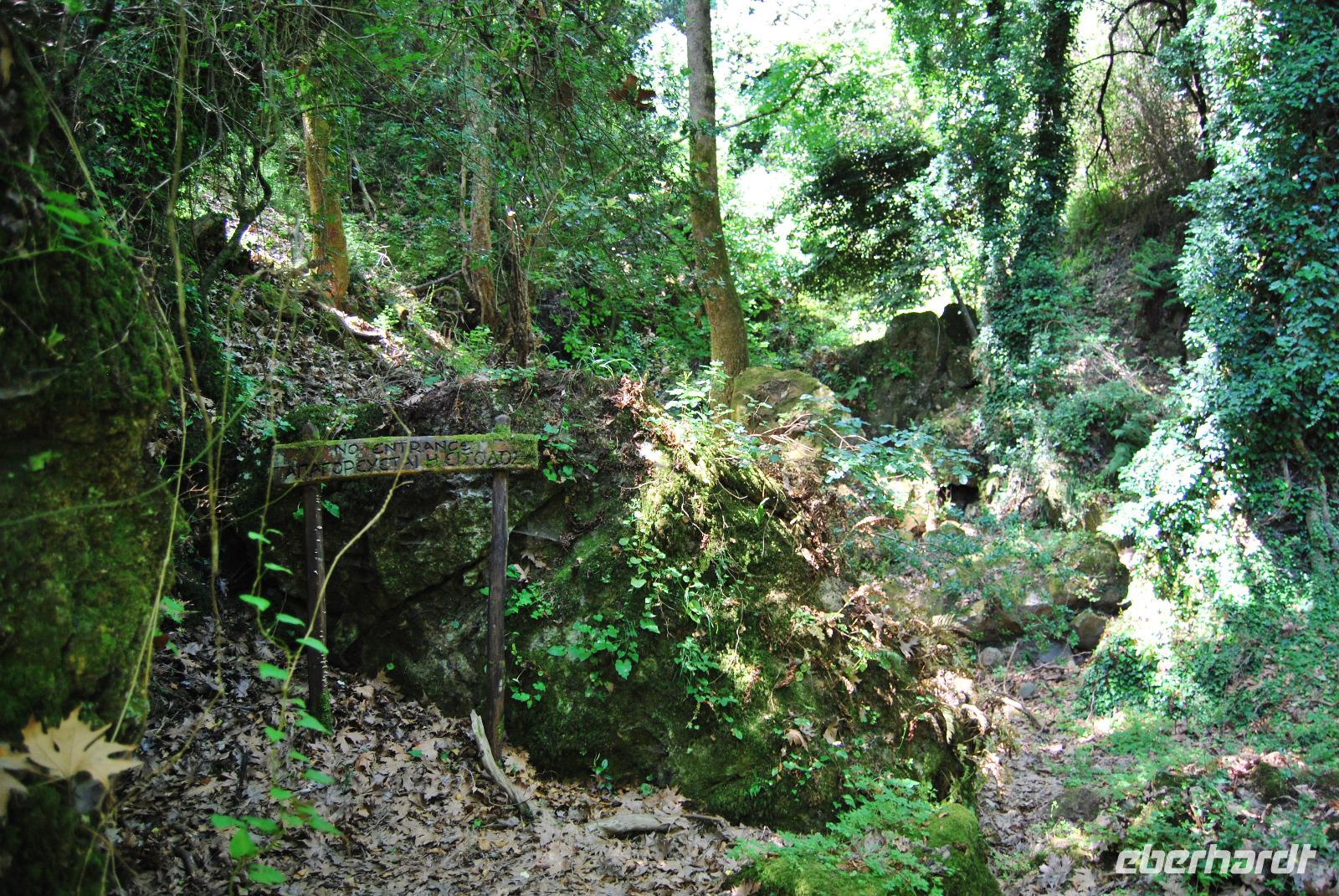 Nicht lang und wir kamen durch das Dorf Zouridi. Ein altes, rostiges Schild wies uns nach Argyroupolis. Über einfache Straßen spazierten wir nun eine Weile abwärts bis der Wald größer wurde. Der Schatten war sehr angenehm. Dann ging es wieder leicht aufwärts. In dem kühlen Dickicht konnten wir alte Gräber sehen, die die Römer zur Zeiten der Besetzung geschaffen hatten. Zahlreiche solcher Höhlen-Gräber konnten wir auf dem Weg entdecken. Die Bäume waren mächtig und groß - besonders einer hatte eine magische Wirkung. Mit gewaltigen, starken Armen wachte er über die ehemalige Friedhofsanlage. Nicht weit davon entfernt, die Kapelle der fünf Jungfrauen. Auch im Fels bei Ihr konnten wir große Grabkammern entdecken.