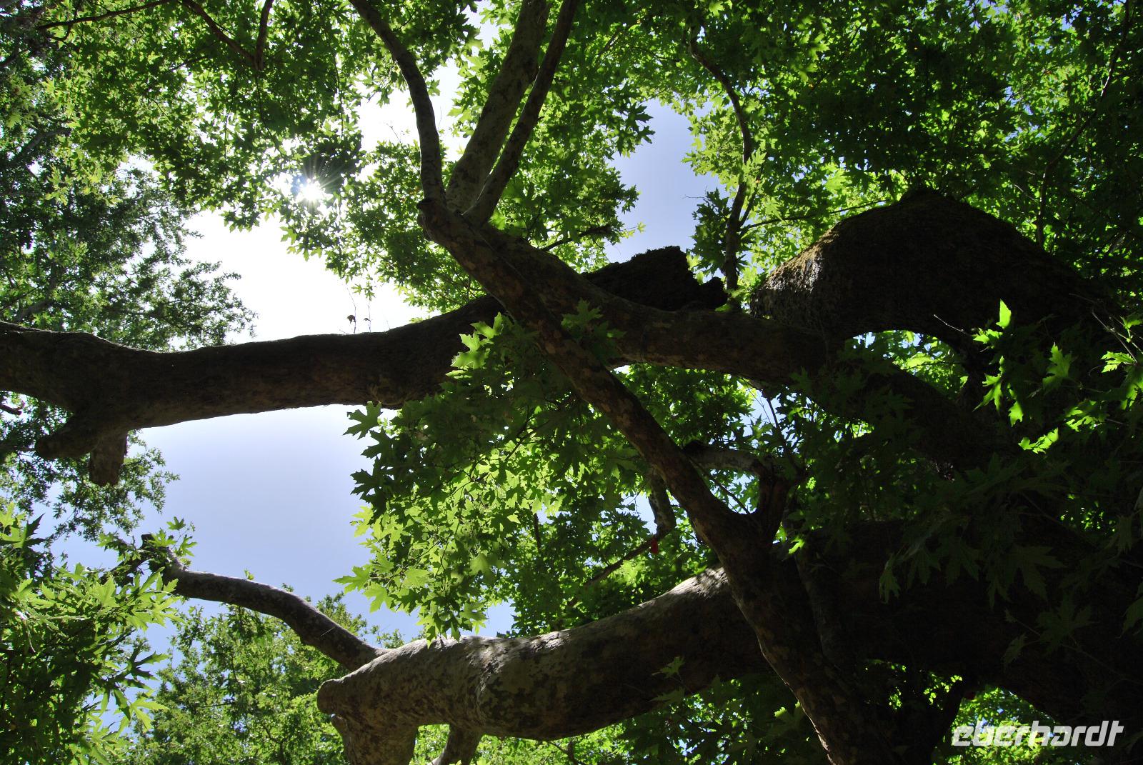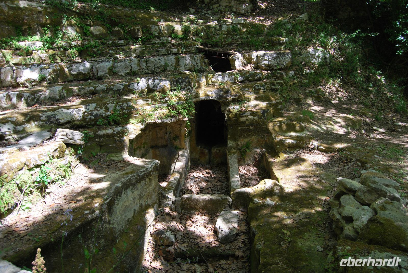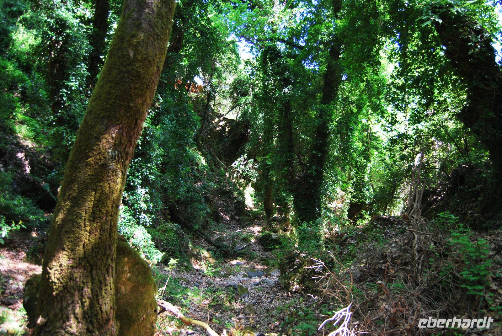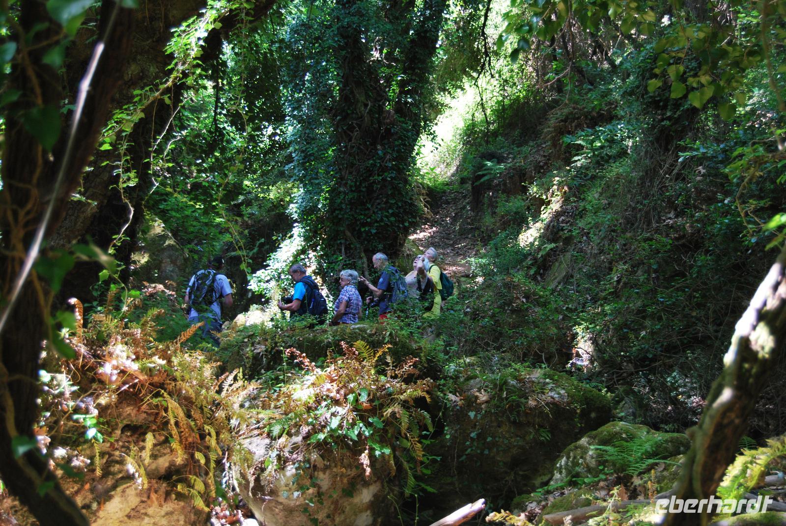 Nicht lang und wir kamen durch das Dorf Zouridi. Ein altes, rostiges Schild wies uns nach Argyroupolis. Über einfache Straßen spazierten wir nun eine Weile abwärts bis der Wald größer wurde. Der Schatten war sehr angenehm. Dann ging es wieder leicht aufwärts. In dem kühlen Dickicht konnten wir alte Gräber sehen, die die Römer zur Zeiten der Besetzung geschaffen hatten. Zahlreiche solcher Höhlen-Gräber konnten wir auf dem Weg entdecken. Die Bäume waren mächtig und groß - besonders einer hatte eine magische Wirkung. Mit gewaltigen, starken Armen wachte er über die ehemalige Friedhofsanlage. Nicht weit davon entfernt, die Kapelle der fünf Jungfrauen. Auch im Fels bei Ihr konnten wir große Grabkammern entdecken.
