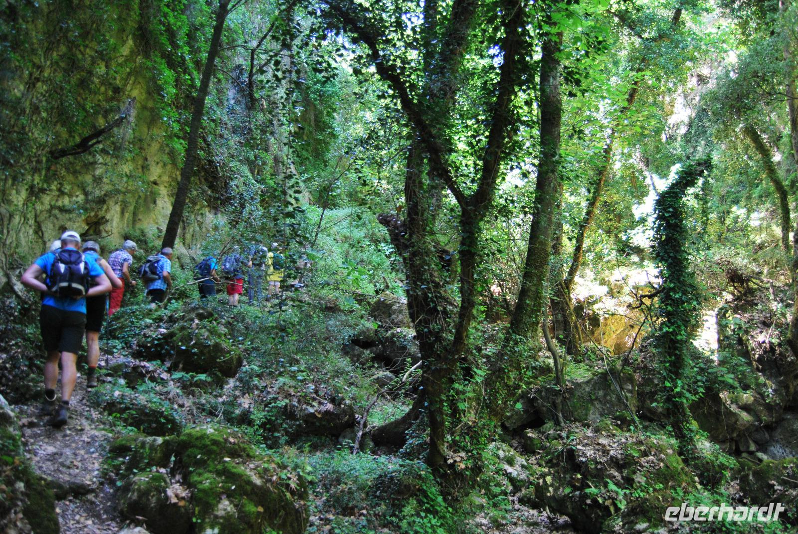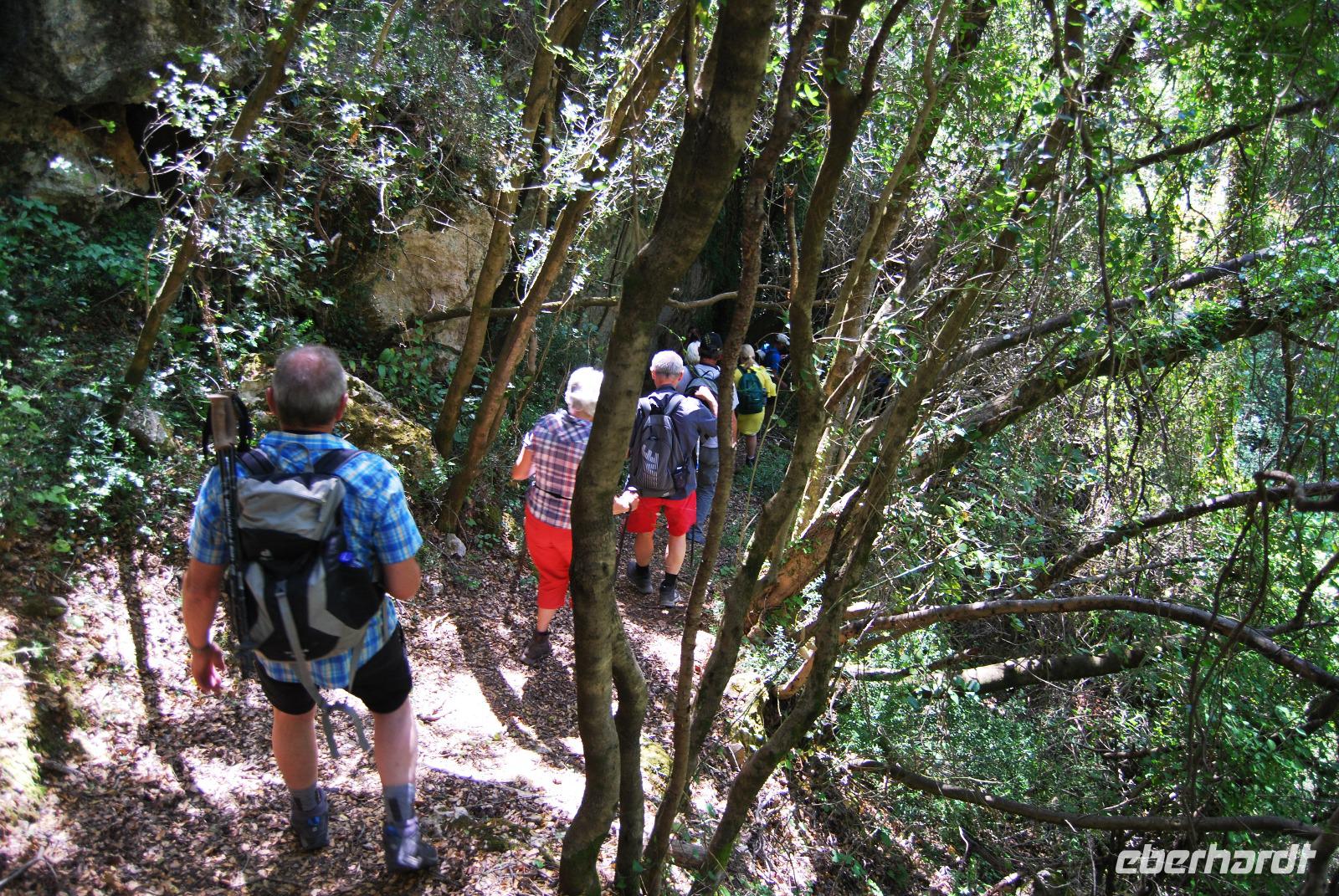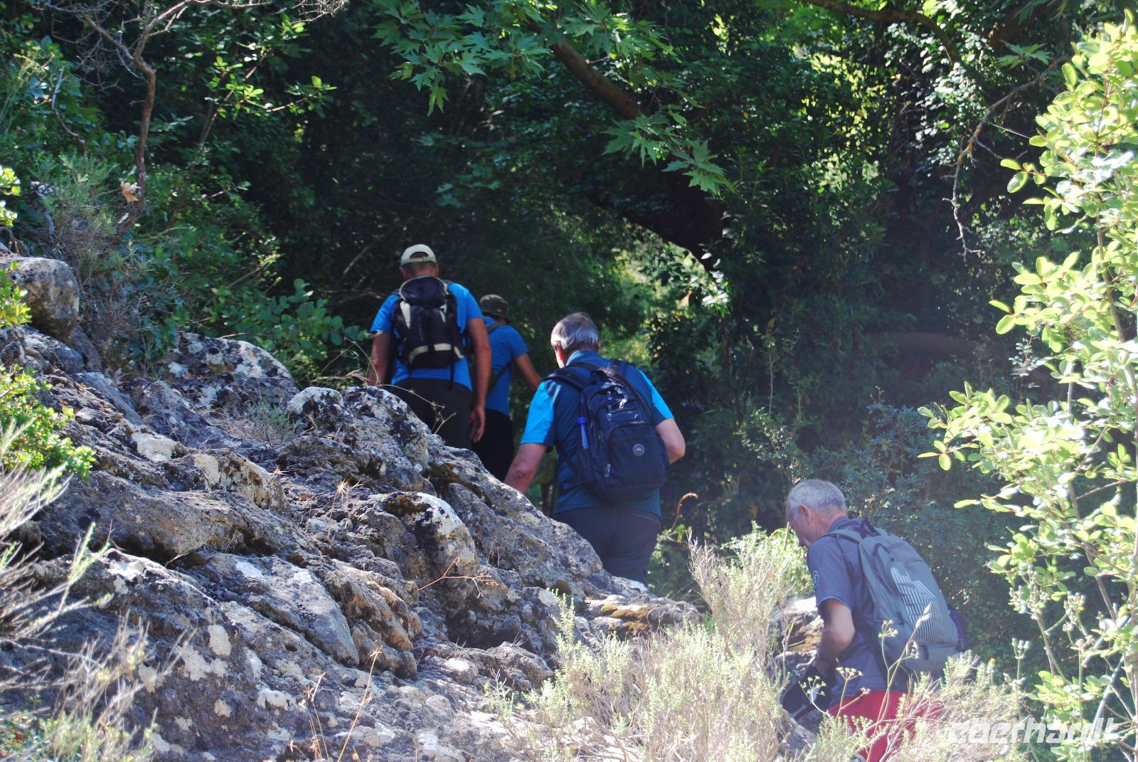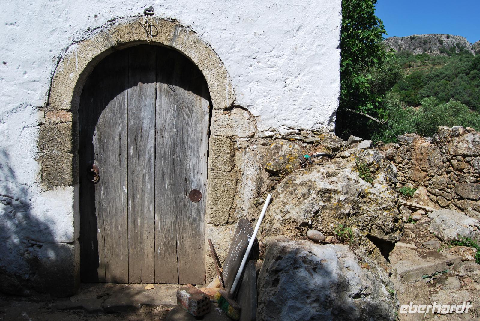 Nicht lang und wir kamen durch das Dorf Zouridi. Ein altes, rostiges Schild wies uns nach Argyroupolis. Über einfache Straßen spazierten wir nun eine Weile abwärts bis der Wald größer wurde. Der Schatten war sehr angenehm. Dann ging es wieder leicht aufwärts. In dem kühlen Dickicht konnten wir alte Gräber sehen, die die Römer zur Zeiten der Besetzung geschaffen hatten. Zahlreiche solcher Höhlen-Gräber konnten wir auf dem Weg entdecken. Die Bäume waren mächtig und groß - besonders einer hatte eine magische Wirkung. Mit gewaltigen, starken Armen wachte er über die ehemalige Friedhofsanlage. Nicht weit davon entfernt, die Kapelle der fünf Jungfrauen. Auch im Fels bei Ihr konnten wir große Grabkammern entdecken.