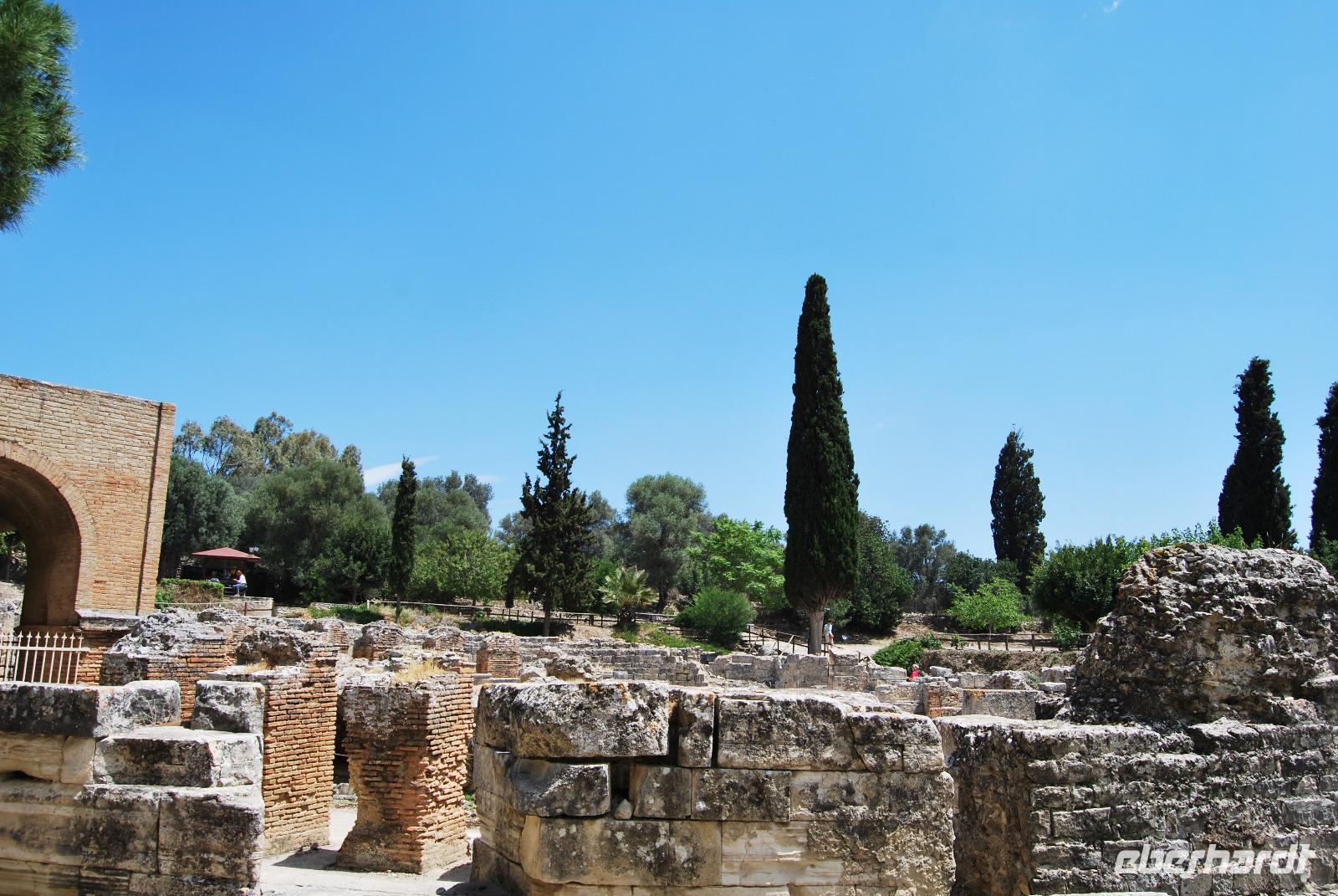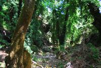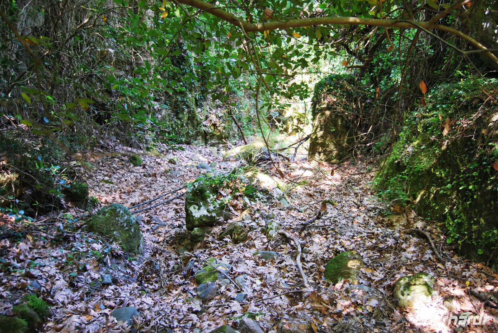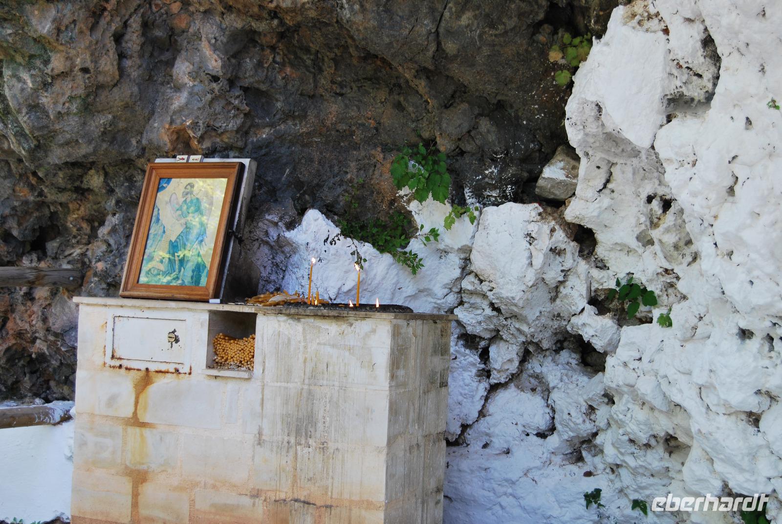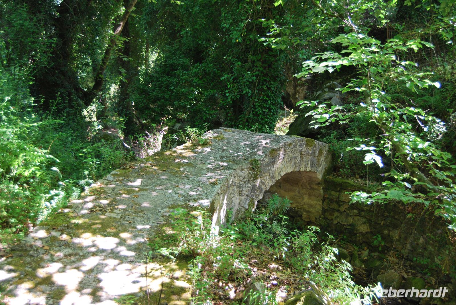 Nicht lang und wir kamen durch das Dorf Zouridi. Ein altes, rostiges Schild wies uns nach Argyroupolis. Über einfache Straßen spazierten wir nun eine Weile abwärts bis der Wald größer wurde. Der Schatten war sehr angenehm. Dann ging es wieder leicht aufwärts. In dem kühlen Dickicht konnten wir alte Gräber sehen, die die Römer zur Zeiten der Besetzung geschaffen hatten. Zahlreiche solcher Höhlen-Gräber konnten wir auf dem Weg entdecken. Die Bäume waren mächtig und groß - besonders einer hatte eine magische Wirkung. Mit gewaltigen, starken Armen wachte er über die ehemalige Friedhofsanlage. Nicht weit davon entfernt, die Kapelle der fünf Jungfrauen. Auch im Fels bei Ihr konnten wir große Grabkammern entdecken.