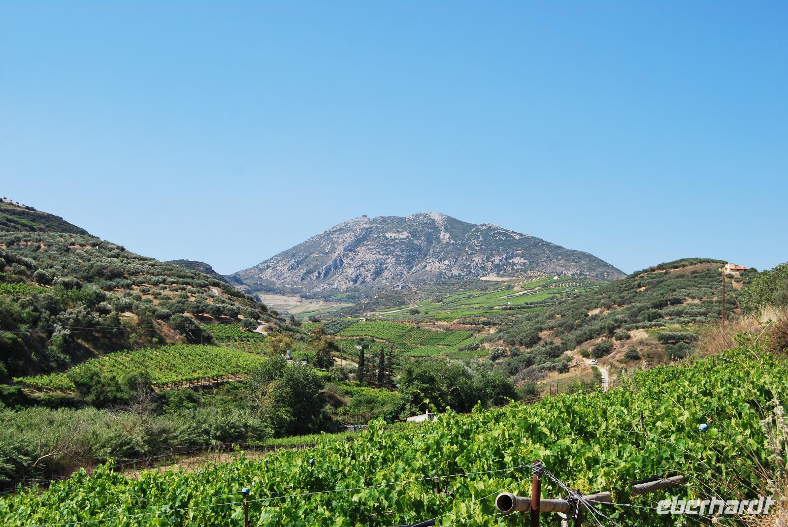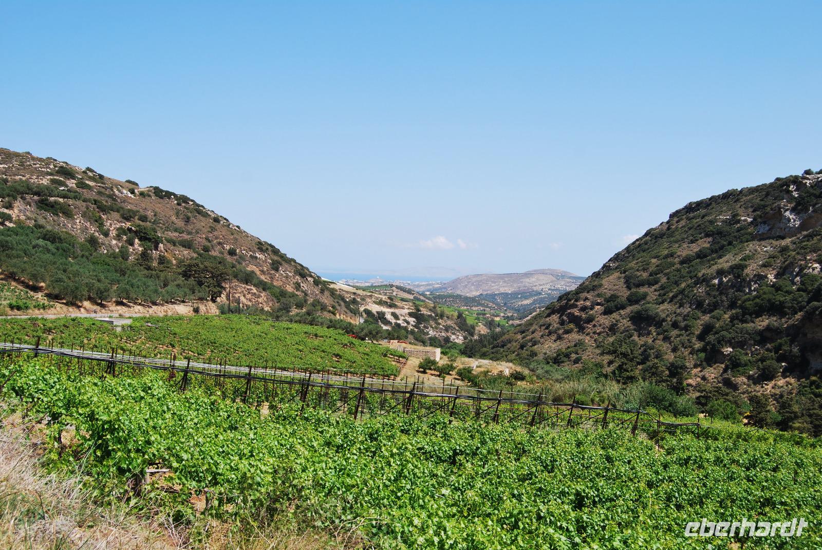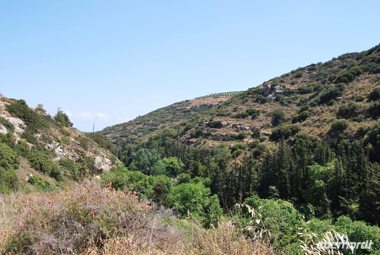 Wir konnten unser Frühstück entspannt auf der Restaurant-Terrasse einnehmen und schon mal ein wenig die Morgensonne genießen. Dann stand mal wieder die Fahrt nach Heraklion an. In der Nähe des Palastes von Knossos sammelten wir Kiki ein und fuhren ein Stück weiter. Von dort begannen wir die Wanderung in der Knosano Schlucht. Wir begannen die Wanderung durch dichtes Grün und hohe Gräser. Immer an einem Bach entlang. Schon einst die Minoer nutzen das herabfließende Wasser aus dieser Schlucht und leiteten diese geschickt in Tonröhren bis in die Paläste. An diesem sonnigen Vormittag hatten wir einen guten Blick auf den Berg Jouchtas wo wir sogar eine Kapelle oben drauf sehen konnten. Die Hänge, an denen wir wanderten, waren mit Wein und Olivenbäumen bepflanzt.