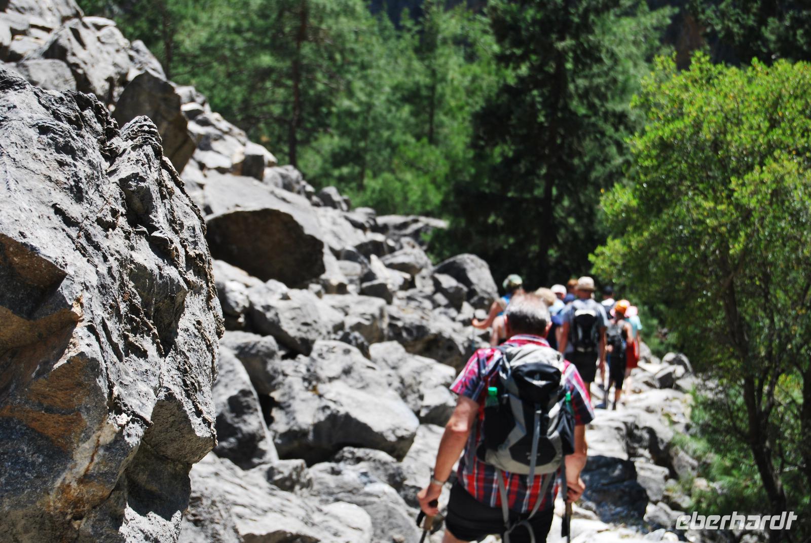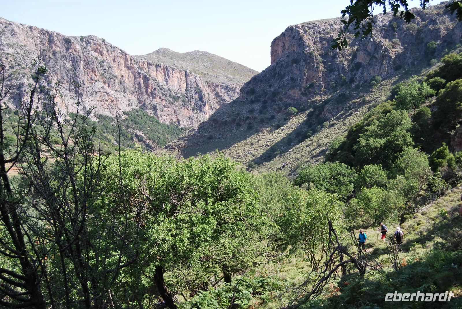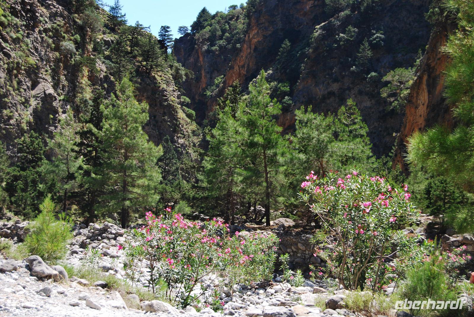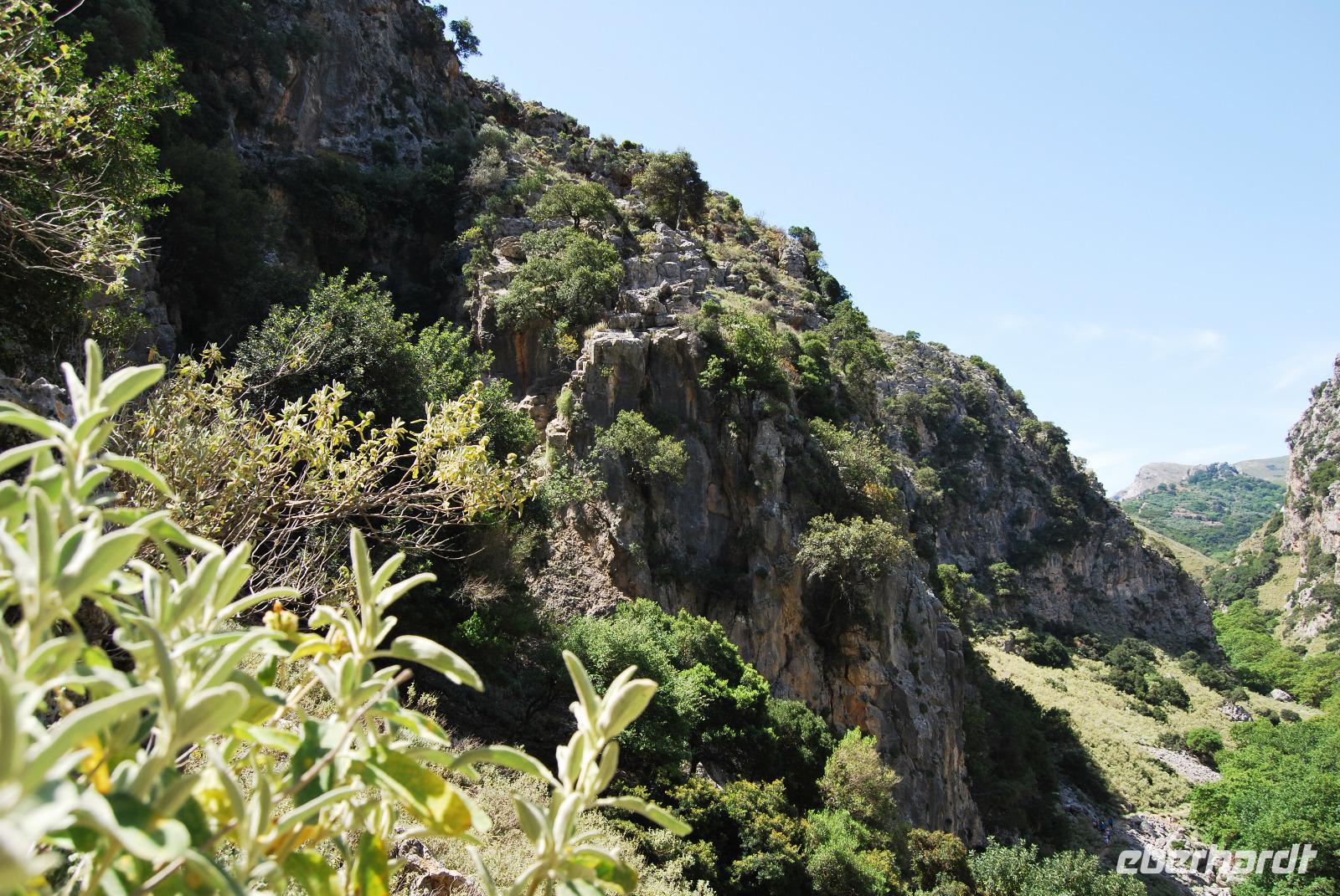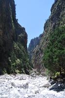 Heute erwartete uns ein sehr anstrengender Tag. Morgens um sechs Uhr saßen wir zusammen am Frühstückstisch. Eine Stunde später fuhren wir ab. Im Südwesten der Insel wollten wir die Samaria-Schlucht hinabsteigen, was wir dann auch taten. Anfangs ging es stufenartig über graues Gestein hinunter. Die Wände mussten teilweise gesichert sein, da herabfallende Steine drohten. Am Wegesrand stand ab du zu ein Drachenmaul, der Dracunculus, dessen üblen Geruch man vom Näheren riechen konnte. Stetig wurden wir vom trockenen Flussbett - später auch vom plätschernden Bach begleitet. Am Rande Kiefern, Zypressen und Platanen.
