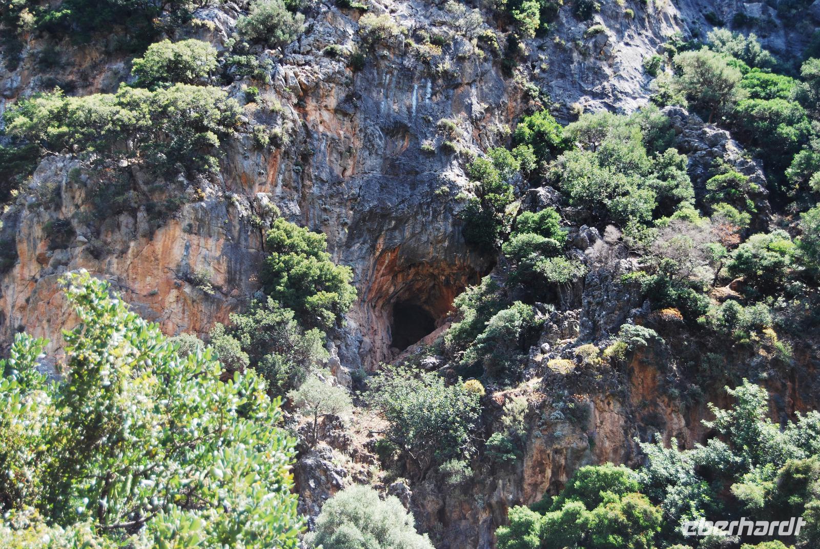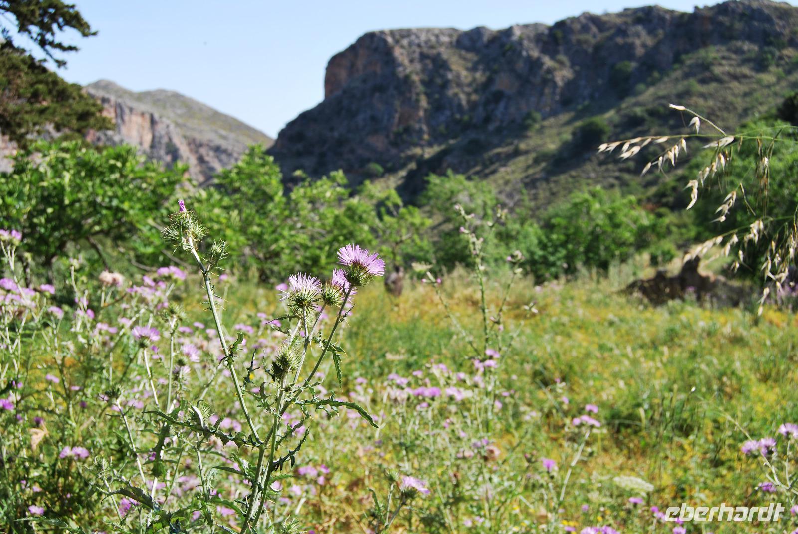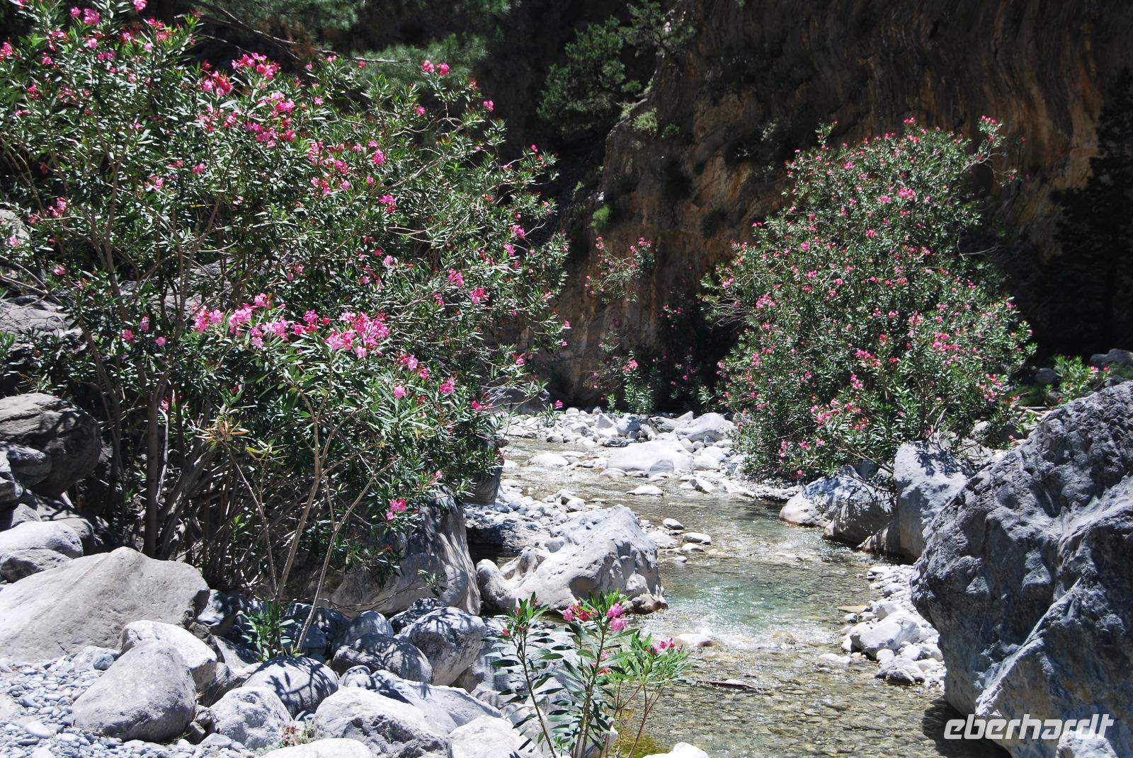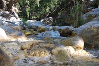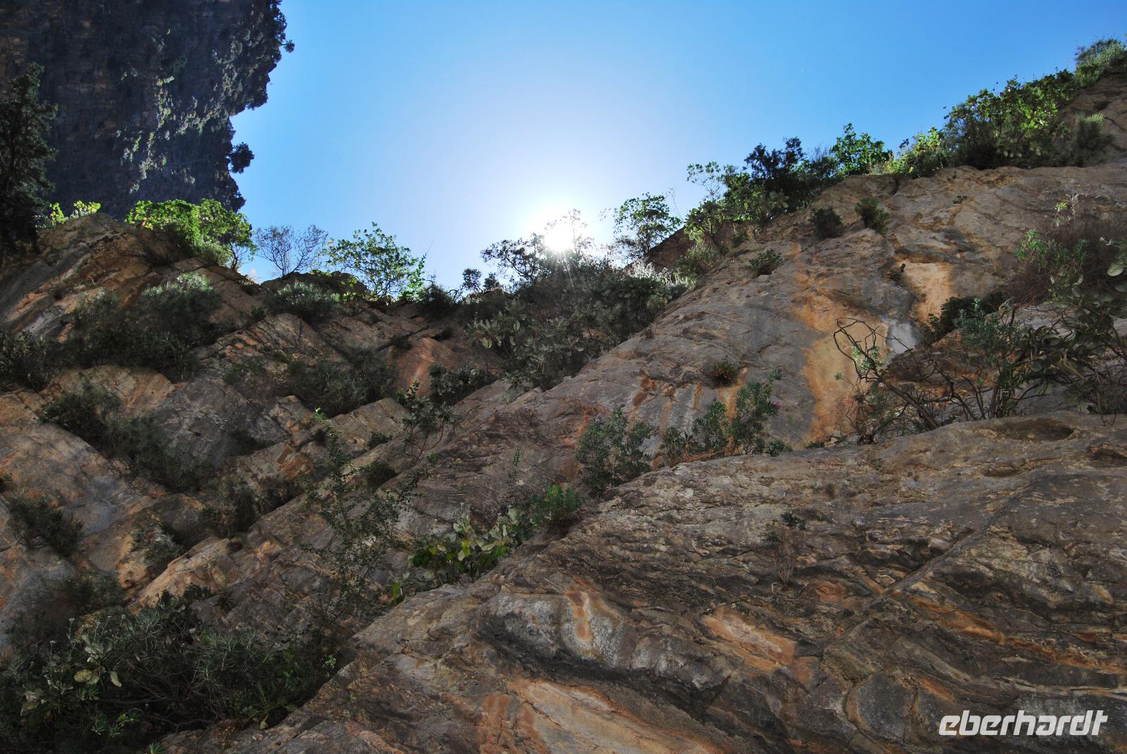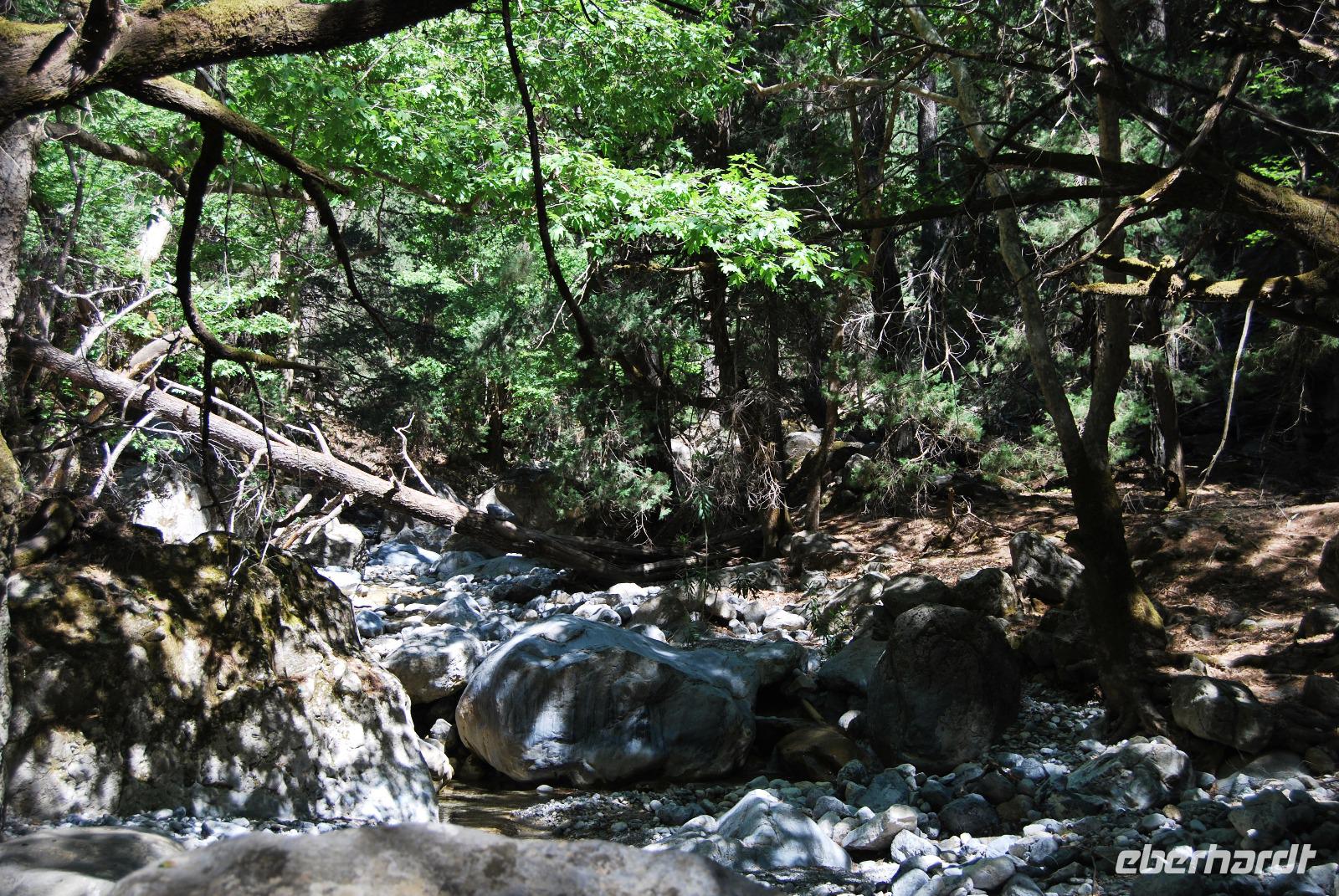 Heute erwartete uns ein sehr anstrengender Tag. Morgens um sechs Uhr saßen wir zusammen am Frühstückstisch. Eine Stunde später fuhren wir ab. Im Südwesten der Insel wollten wir die Samaria-Schlucht hinabsteigen, was wir dann auch taten. Anfangs ging es stufenartig über graues Gestein hinunter. Die Wände mussten teilweise gesichert sein, da herabfallende Steine drohten. Am Wegesrand stand ab du zu ein Drachenmaul, der Dracunculus, dessen üblen Geruch man vom Näheren riechen konnte. Stetig wurden wir vom trockenen Flussbett - später auch vom plätschernden Bach begleitet. Am Rande Kiefern, Zypressen und Platanen.