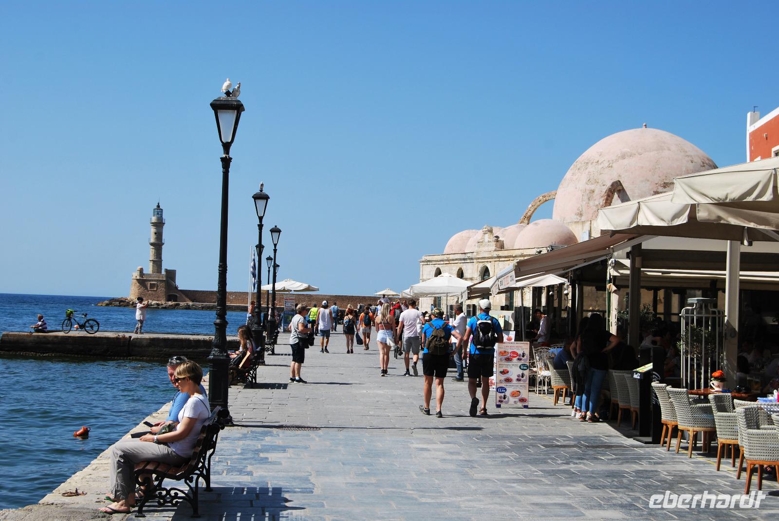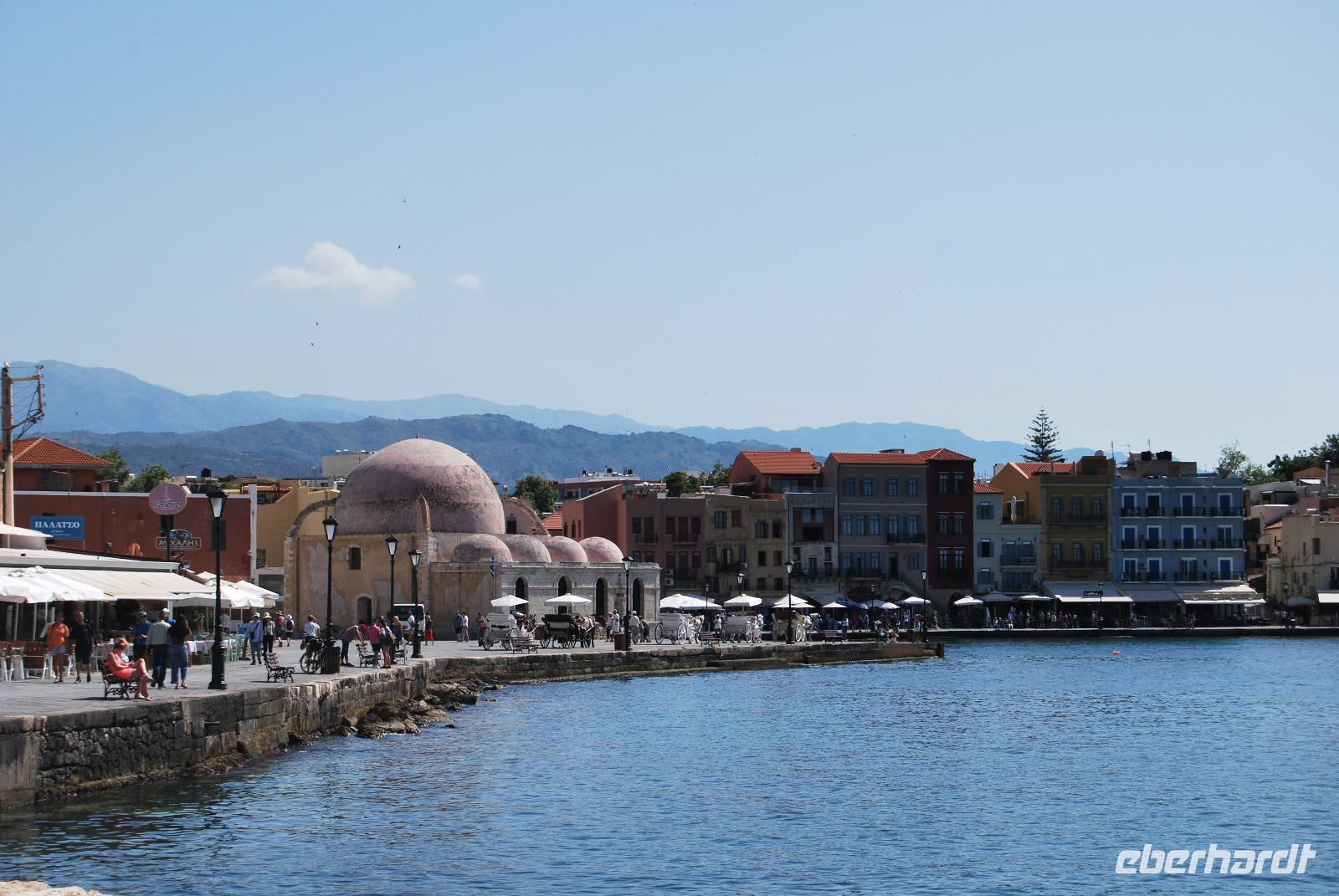 Nach dieser belebenden Vormittagswanderung fuhr uns Nikos, unserer Busfahrer, nach Chania, wo wir die historische Altstadt besichtigten. Von der Markthalle, die 1913 mit einer Grundform eines Kreuzes erbaut wurde, schlenderten wir in die Straße Chalidon. Dort sahen wir die griechisch-orthodoxe Kirche von Chania und wir besichtigten das archäologische Museum. Darin befanden sich sehr interassante Skulpturen, Mosaike, Schmuck und Kunst der Minoer, Griechen und Römer. Wir sahen die alten Herrenhäuser und ließen uns vom Ambiente des venezianischen Hafens bestaunen und genossen den Ausblick. Die alten Häuser vermittelten ein angenehmes, warmes Gefühl. Auch die Mosche direkt am Hafen erinnert an die osmanische Zeit und fügt sich dennoch authentisch ins Bild. Die Freizeit nutzten einige um sich die Festungsanlage von Chania anzusehen, deren Ursprung auf das Jahr 1336 zurückgeht.