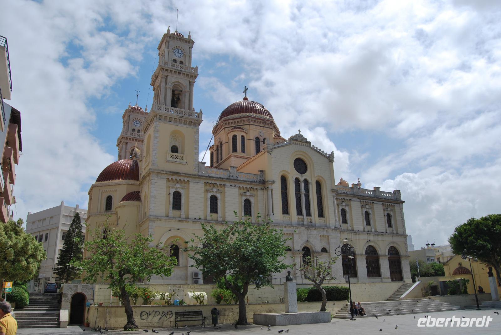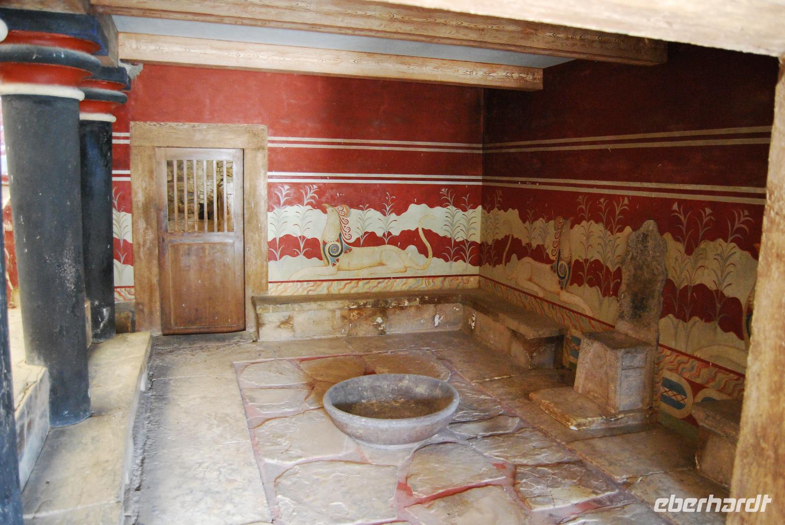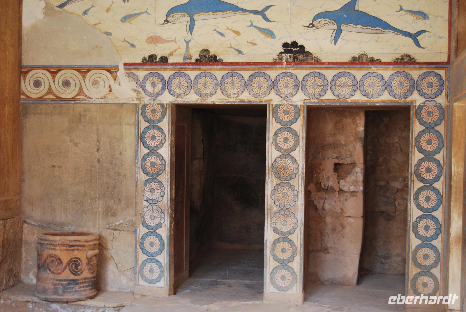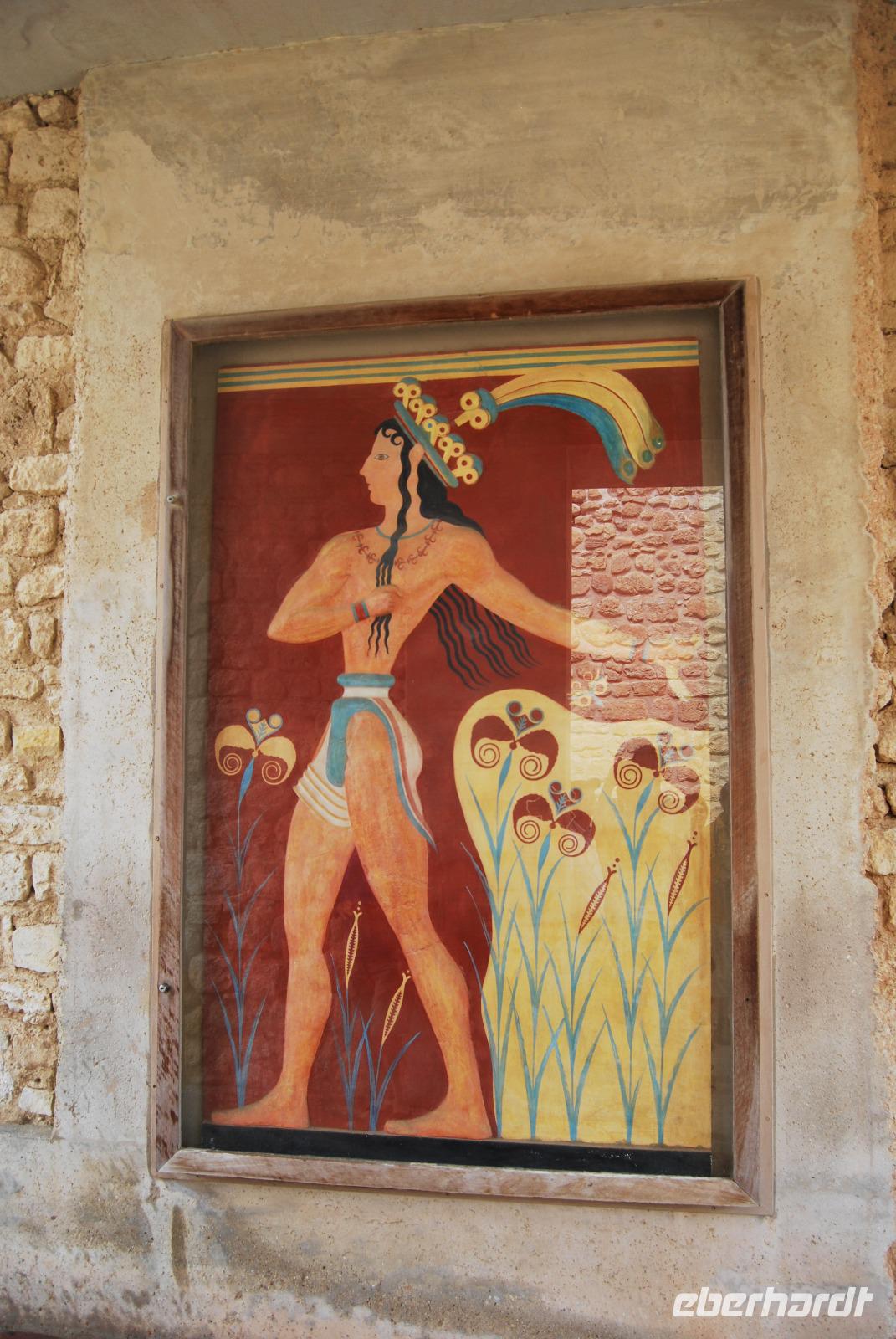 Der Palast von Knossos wurde zwischen 2.100 und 1.800 vor Christus. In mehreren Phasen errichtet. Noch heute kann man den Reichtum und Pracht des Palastes und der Tempel von Knossos erkennen. Mich beeindrucken besonders die uralten Abbildungen an den Wänden. Man erlangte dabei einen recht guten Eindruck über Kleidung und Gesellschaft zur Minoischen Zeit. Als wir gerade auf der Anlage waren und Kiki uns die ersten Informationen vermittelte, setzte doch glatt ein Regenschauer ein. Wir retteten uns schnell zum Lilien-Prinzen, einem Fresko von ungefähr 1.550 Jahren vor Christus. Nach der ausführlichen Besichtigung des minoischen Palastes fuhren wir zur Weinprobe nach Peza. Das Weingut Miliarakis ließ uns von ein paar Flaschen des Hauses kosten und servierte uns außerdem unsere ersten einheimischen Spezialitäten. Am Nachmittag fuhren wir nach Heraklion, in die Hautstadt Kretas. Wir starteten an der Minas-Kathedrale Heraklion, aus 19. Jahrhundert. Sie ist eine der größten Kathedralen Griechenlands und bietet Platz für ca. 8.000 Gläubige. Vom Agia-Ekaterini-Platz gingen wir dann ehemaligen Marktstraße und Basars Heraklions und kamen dann auch zum Morosini-Brunnen am Löweplatz. Dieser wurde einst während der Herrschaft der Osmanen verkleinert und die Häuser dichter gebaut. Heute erstrahlt der Platz in einem gemütlichen Flair. Weit vor den Osmanen eroberten auch die Venezianer die Insel. Sie planten Heraklion als neues Venedig und hinterließen damit einige wundervolle Elemente und Gebäude, die auch die Osmanen nicht zerstörten. So konnten wir uns noch am Venezianischen Earl Haus oder auch Club-Haus, beziehungsweise Venezianische Loggia genannt, erfreuen, dass heutzutage als Rathaus von Heraklion dient. Wir sahen uns noch die Titos Kirche an, die sich auch an der Straße des 25. August befindet und auch eine belebte Fußgängerzone ist. und zum Platz der 18 Engländer führt.