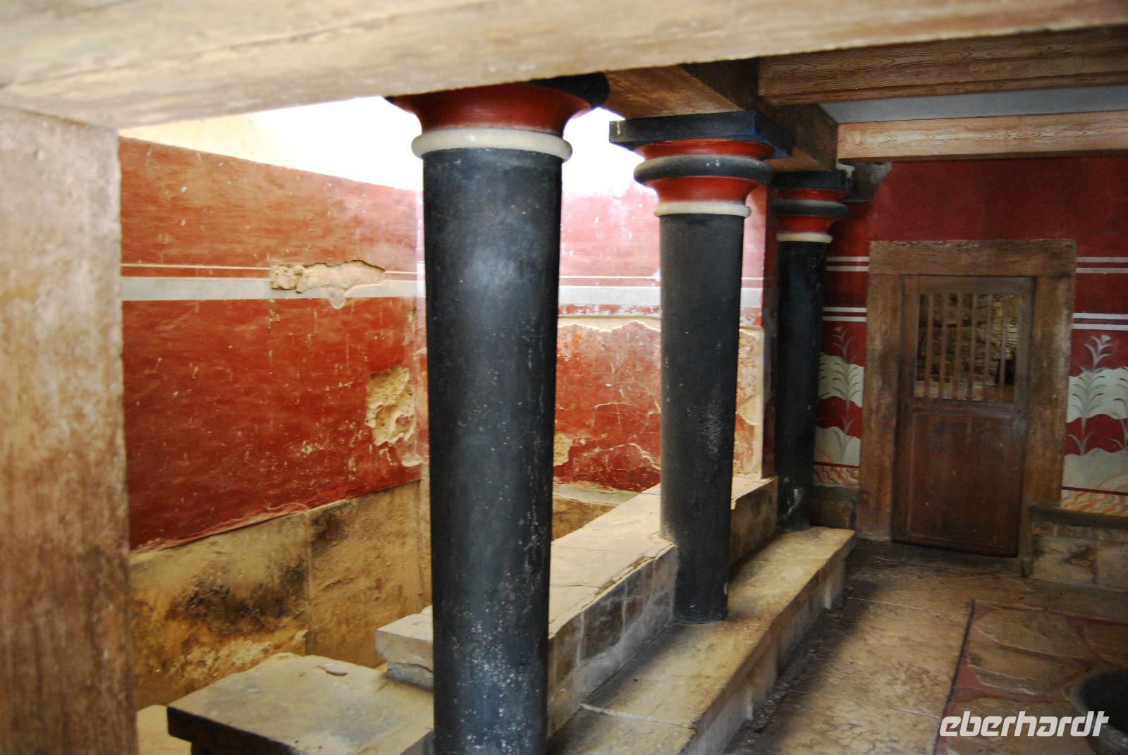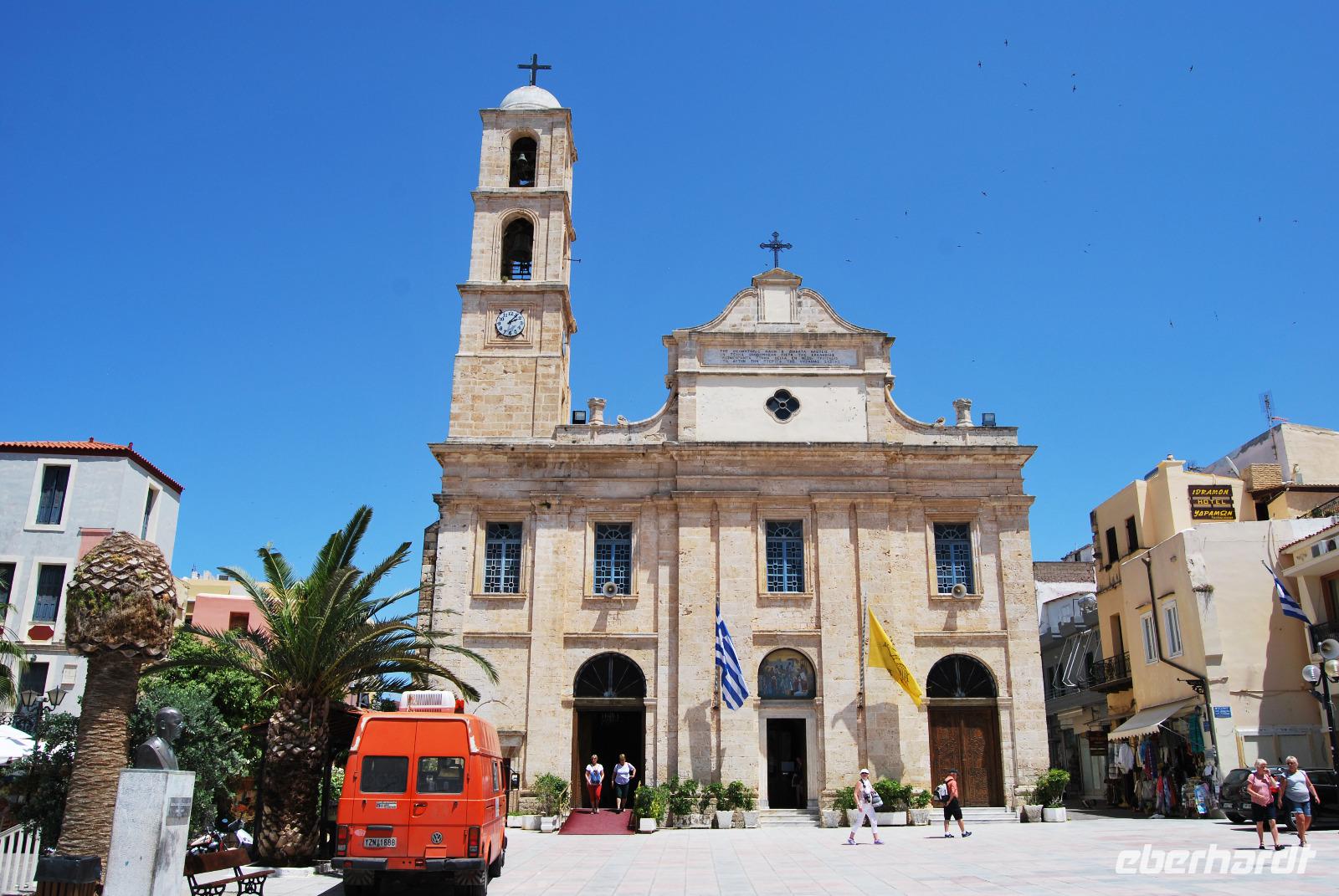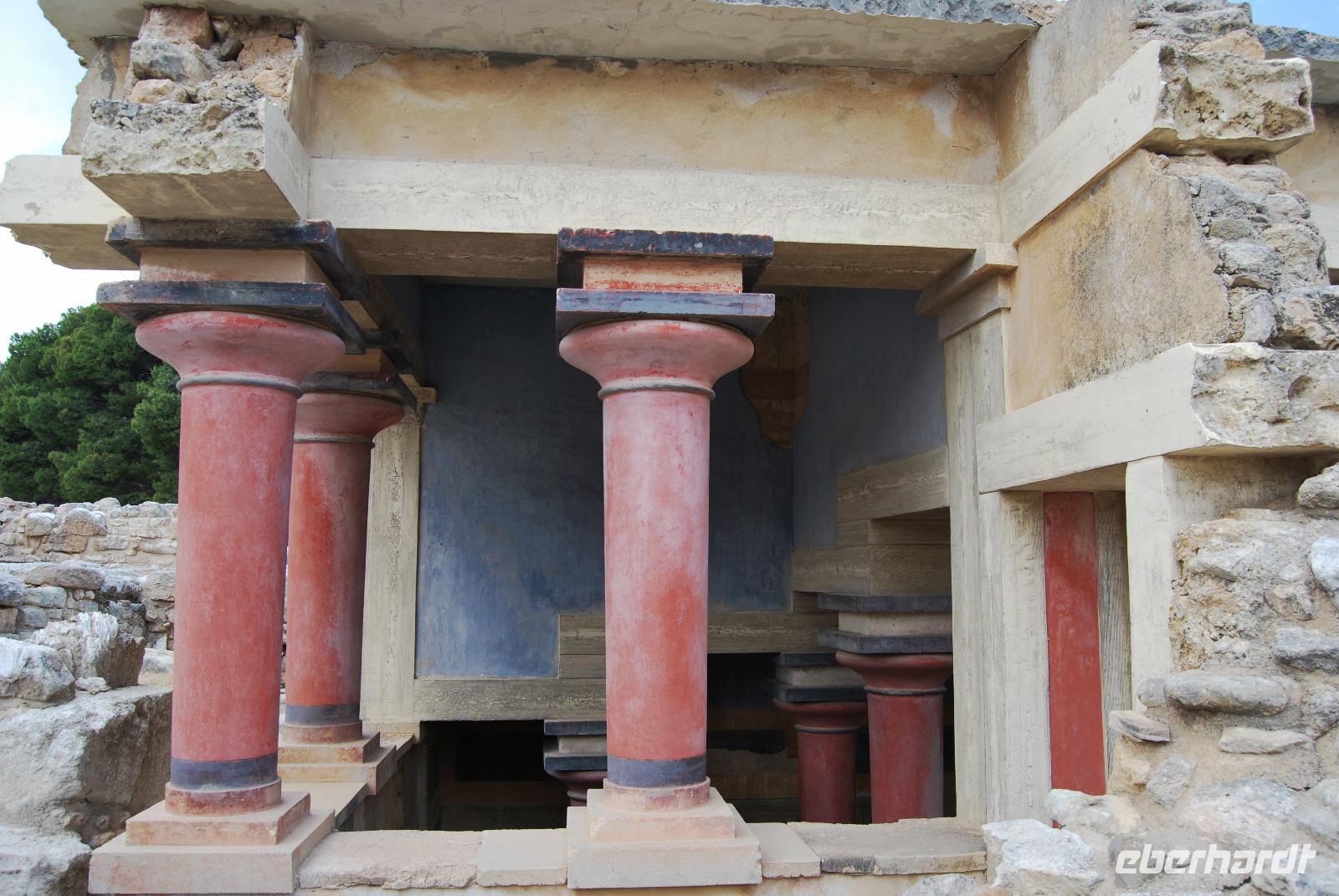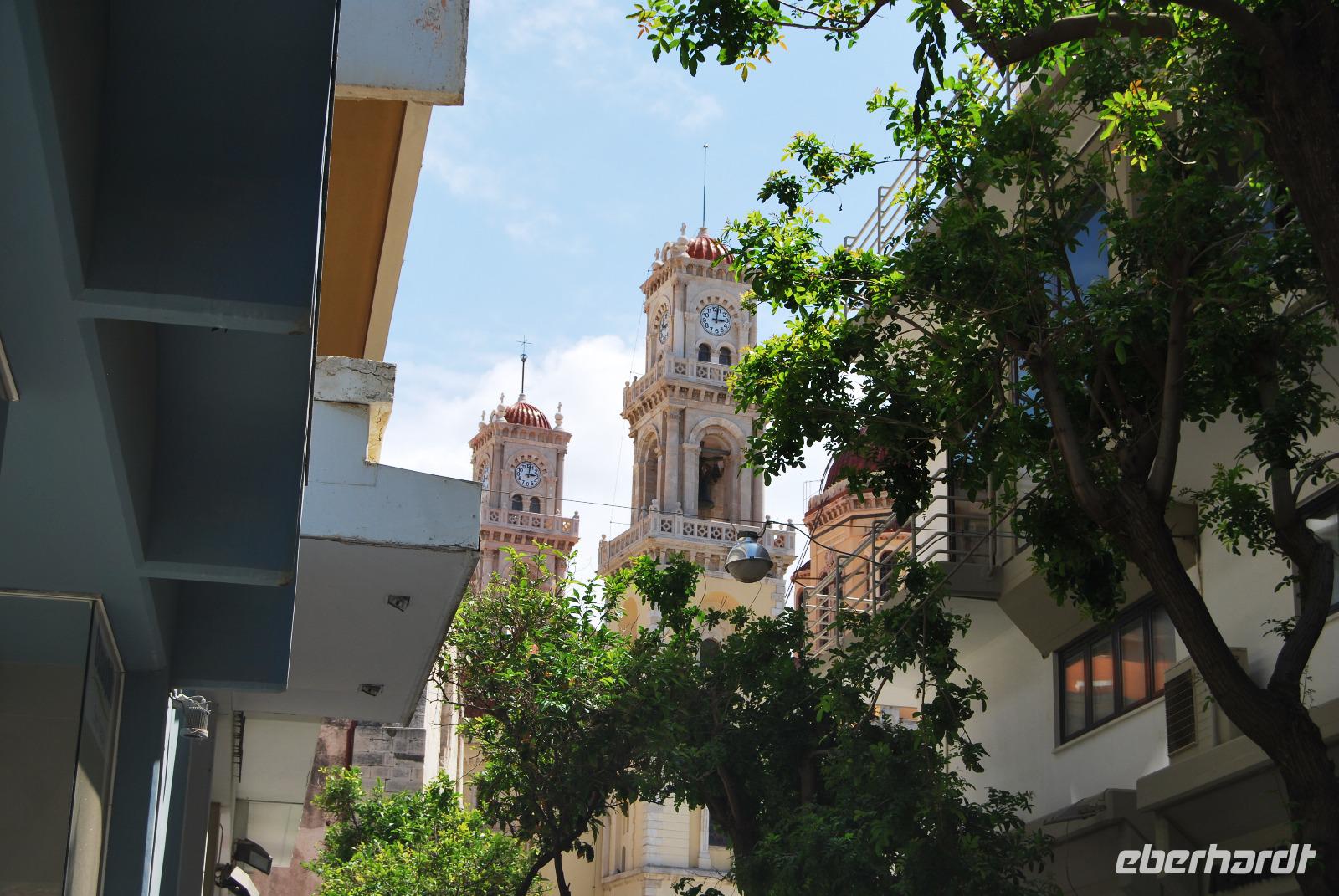 Der Palast von Knossos wurde zwischen 2.100 und 1.800 vor Christus. In mehreren Phasen errichtet. Noch heute kann man den Reichtum und Pracht des Palastes und der Tempel von Knossos erkennen. Mich beeindrucken besonders die uralten Abbildungen an den Wänden. Man erlangte dabei einen recht guten Eindruck über Kleidung und Gesellschaft zur Minoischen Zeit. Als wir gerade auf der Anlage waren und Kiki uns die ersten Informationen vermittelte, setzte doch glatt ein Regenschauer ein. Wir retteten uns schnell zum Lilien-Prinzen, einem Fresko von ungefähr 1.550 Jahren vor Christus. Nach der ausführlichen Besichtigung des minoischen Palastes fuhren wir zur Weinprobe nach Peza. Das Weingut Miliarakis ließ uns von ein paar Flaschen des Hauses kosten und servierte uns außerdem unsere ersten einheimischen Spezialitäten. Am Nachmittag fuhren wir nach Heraklion, in die Hautstadt Kretas. Wir starteten an der Minas-Kathedrale Heraklion, aus 19. Jahrhundert. Sie ist eine der größten Kathedralen Griechenlands und bietet Platz für ca. 8.000 Gläubige. Vom Agia-Ekaterini-Platz gingen wir dann ehemaligen Marktstraße und Basars Heraklions und kamen dann auch zum Morosini-Brunnen am Löweplatz. Dieser wurde einst während der Herrschaft der Osmanen verkleinert und die Häuser dichter gebaut. Heute erstrahlt der Platz in einem gemütlichen Flair. Weit vor den Osmanen eroberten auch die Venezianer die Insel. Sie planten Heraklion als neues Venedig und hinterließen damit einige wundervolle Elemente und Gebäude, die auch die Osmanen nicht zerstörten. So konnten wir uns noch am Venezianischen Earl Haus oder auch Club-Haus, beziehungsweise Venezianische Loggia genannt, erfreuen, dass heutzutage als Rathaus von Heraklion dient. Wir sahen uns noch die Titos Kirche an, die sich auch an der Straße des 25. August befindet und auch eine belebte Fußgängerzone ist. und zum Platz der 18 Engländer führt.
