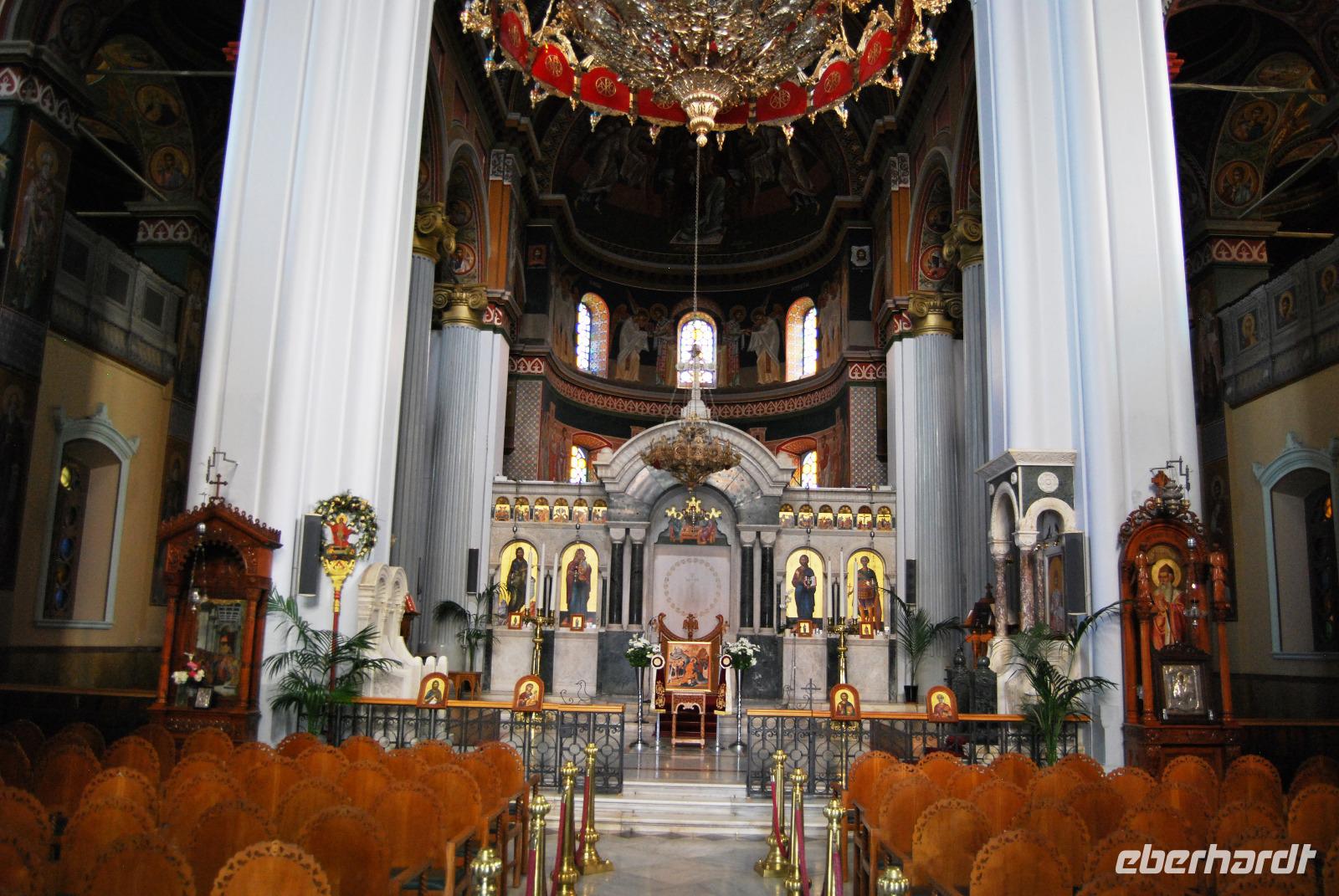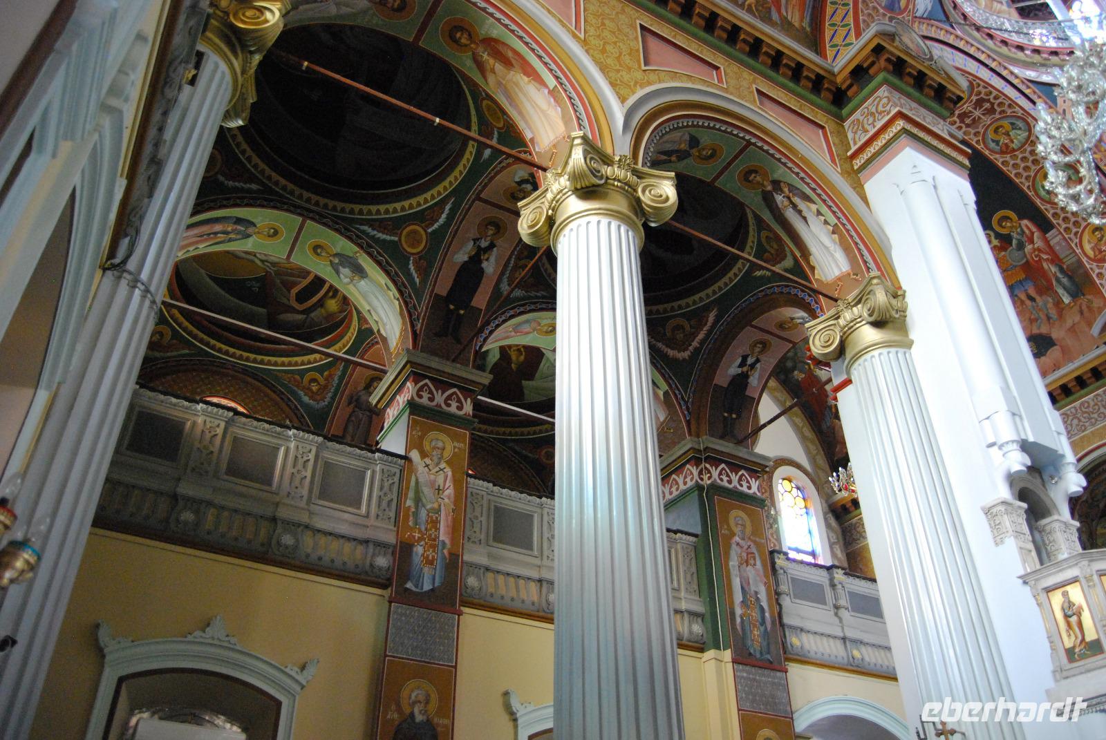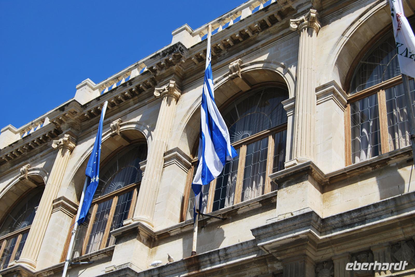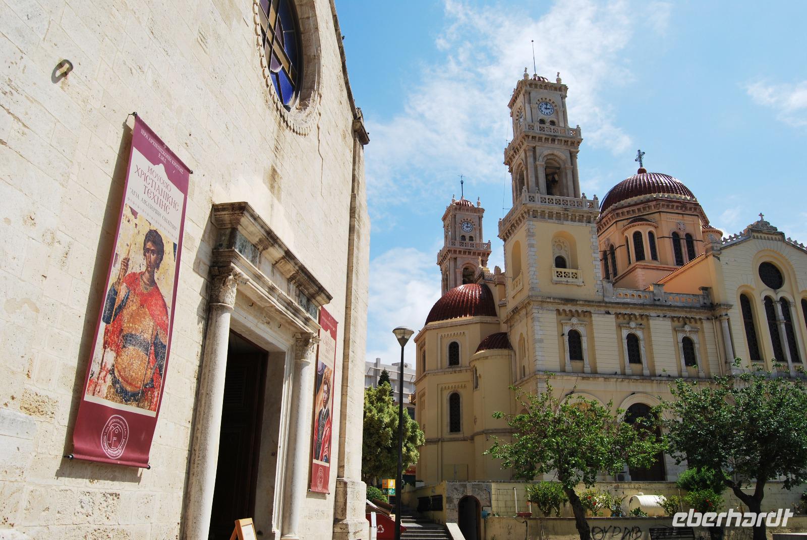 Der Palast von Knossos wurde zwischen 2.100 und 1.800 vor Christus. In mehreren Phasen errichtet. Noch heute kann man den Reichtum und Pracht des Palastes und der Tempel von Knossos erkennen. Mich beeindrucken besonders die uralten Abbildungen an den Wänden. Man erlangte dabei einen recht guten Eindruck über Kleidung und Gesellschaft zur Minoischen Zeit. Als wir gerade auf der Anlage waren und Kiki uns die ersten Informationen vermittelte, setzte doch glatt ein Regenschauer ein. Wir retteten uns schnell zum Lilien-Prinzen, einem Fresko von ungefähr 1.550 Jahren vor Christus. Nach der ausführlichen Besichtigung des minoischen Palastes fuhren wir zur Weinprobe nach Peza. Das Weingut Miliarakis ließ uns von ein paar Flaschen des Hauses kosten und servierte uns außerdem unsere ersten einheimischen Spezialitäten. Am Nachmittag fuhren wir nach Heraklion, in die Hautstadt Kretas. Wir starteten an der Minas-Kathedrale Heraklion, aus 19. Jahrhundert. Sie ist eine der größten Kathedralen Griechenlands und bietet Platz für ca. 8.000 Gläubige. Vom Agia-Ekaterini-Platz gingen wir dann ehemaligen Marktstraße und Basars Heraklions und kamen dann auch zum Morosini-Brunnen am Löweplatz. Dieser wurde einst während der Herrschaft der Osmanen verkleinert und die Häuser dichter gebaut. Heute erstrahlt der Platz in einem gemütlichen Flair. Weit vor den Osmanen eroberten auch die Venezianer die Insel. Sie planten Heraklion als neues Venedig und hinterließen damit einige wundervolle Elemente und Gebäude, die auch die Osmanen nicht zerstörten. So konnten wir uns noch am Venezianischen Earl Haus oder auch Club-Haus, beziehungsweise Venezianische Loggia genannt, erfreuen, dass heutzutage als Rathaus von Heraklion dient. Wir sahen uns noch die Titos Kirche an, die sich auch an der Straße des 25. August befindet und auch eine belebte Fußgängerzone ist. und zum Platz der 18 Engländer führt.