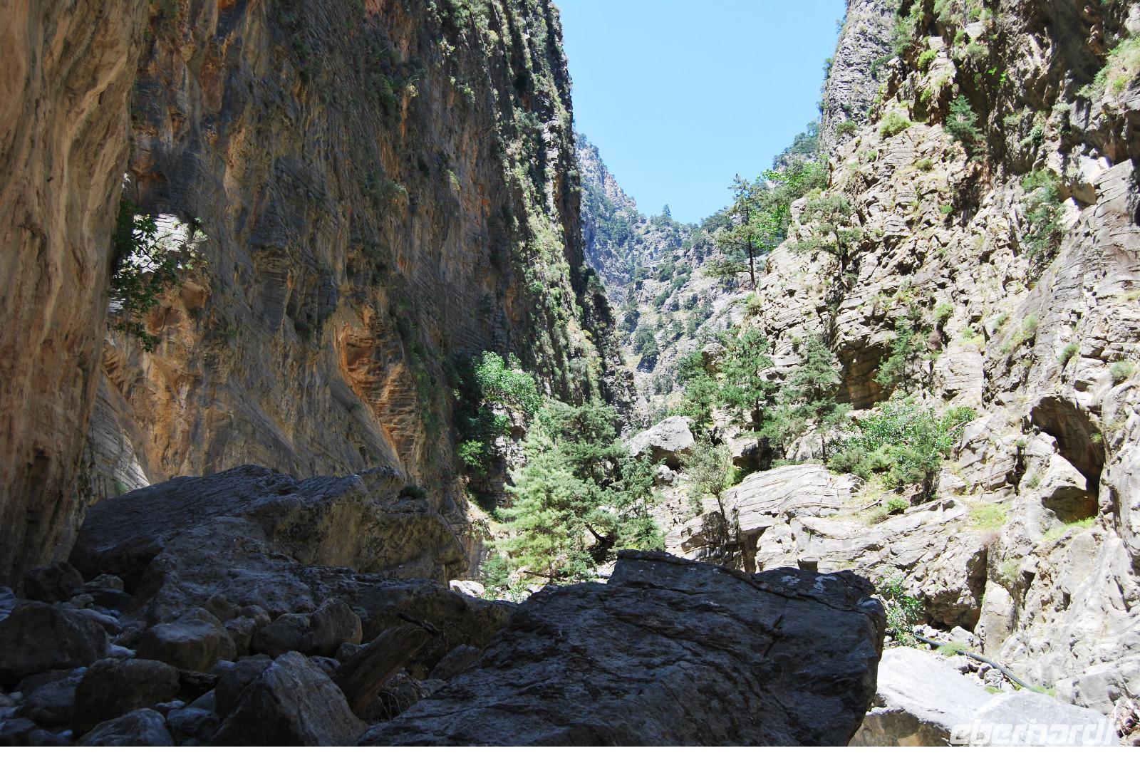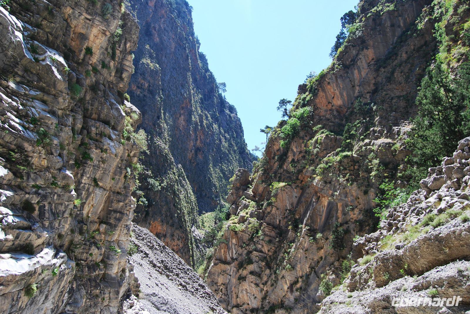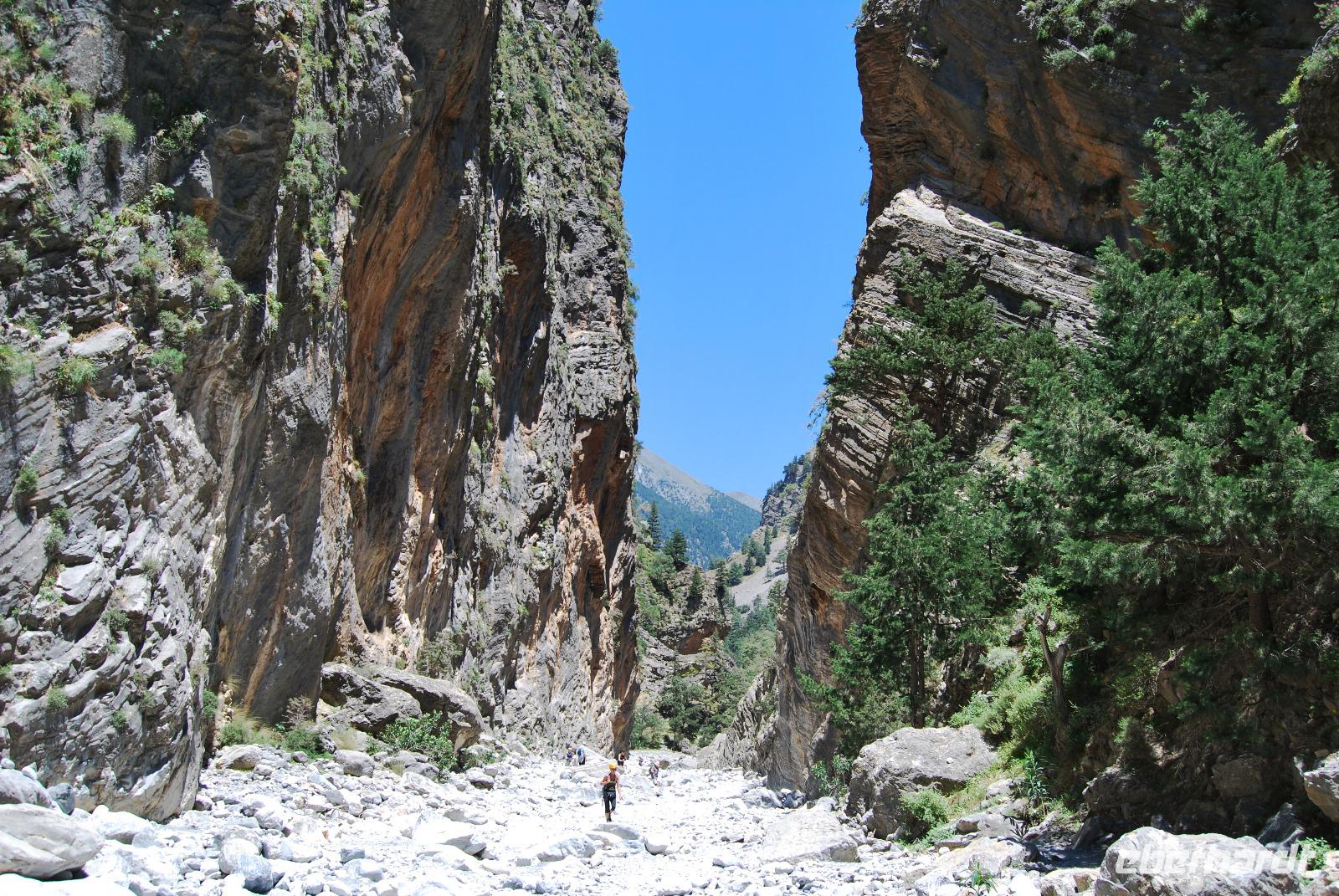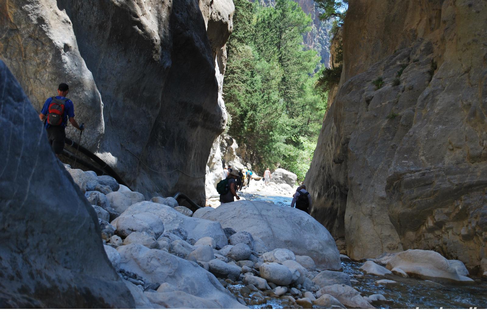 Irgendwann erreichten wir das Samaria Dorf, das nach der Benennung zum Nationalpark (1962) im Jahr 1965 verlassen wurde. Heute nutzen die Wanderer dieses verlassene Dorf als Rastplatz ihrer Wanderung. Eine Brücke führt über den schmalen Graben, den das Wasser gewaschen hatte. Die einfachen Hütten aus Stein, Lehm, Stroh und Holz sind mittlerweile schon zu Ruinen zerfallen. Und gerade das macht diesen Ort magisch. Nach dieser Erfrischung im Samaria Dorf ging es weiter. Wir krackselten über Felsen, glatt und rund geschliffen vom Wasser sowie über groben und feinen Kies. Die Schlucht wurde immer und immer Schmaler, die Seitenwände türmten sich auf. Wir erreichten die schmalste Stelle und befanden uns inmitten des eindrucksvollen Canyons. Mit nur gut drei Metern Breite und vielleicht sechshundert Metern senkrechter Felswände ist es schon ein aufregendes Erlebnis die Schlucht zu durchwandern. Am Ausgang vom Nationalpark wartete eine herrlich kühle Erfrischung auf uns, mit der wir die letzten Meter bis ans lybische Meer im Handumdrehen meisterten. Wir erreichten das Fährmannsdorf Agia Roumeli und legte eine spätere Mittagspause ein. Ein kühlendes Bad im Meer konnte man beinahe nicht auslassen. Der grobe schwarze Kies war brennend heiß und man musste schleunigst seine Füße kühlen wenn die nicht verbrennen sollten.