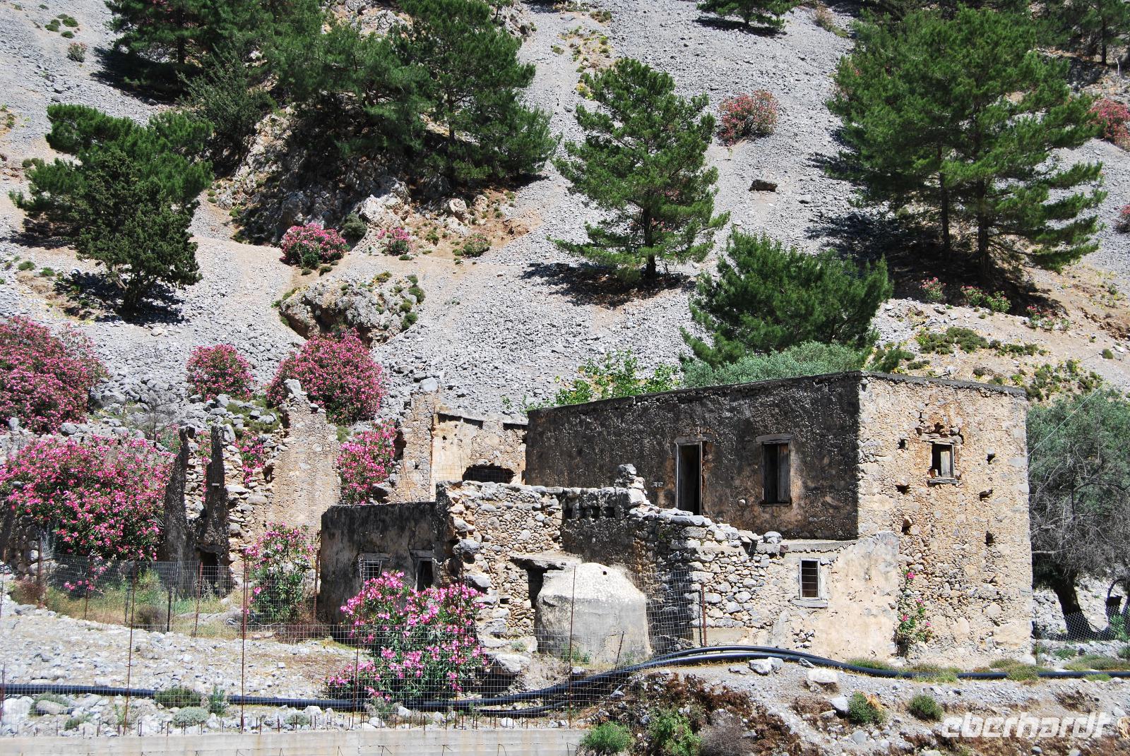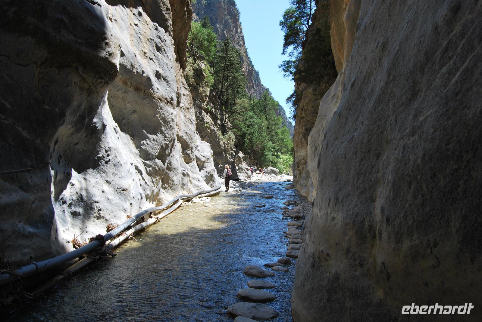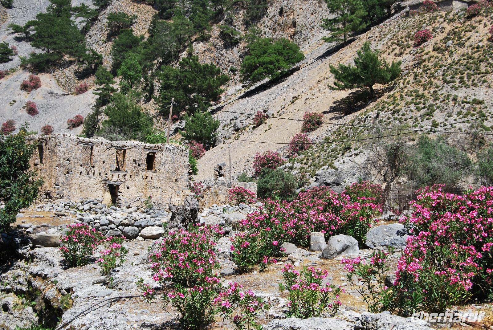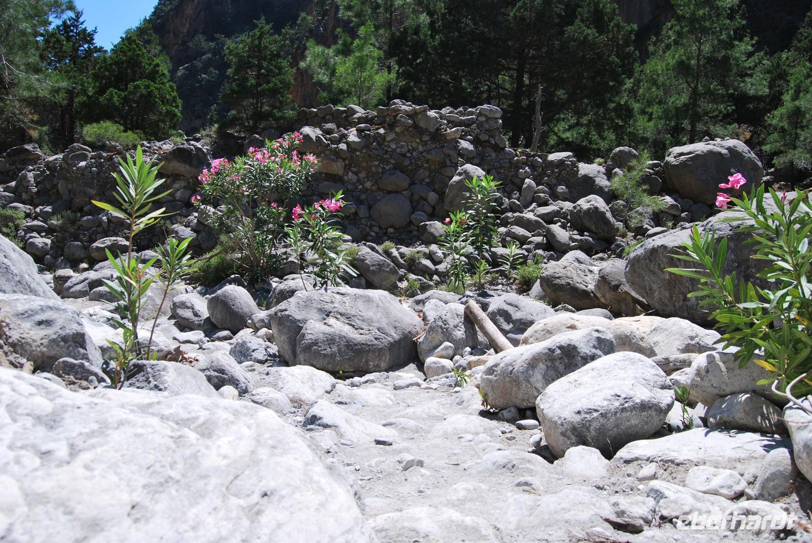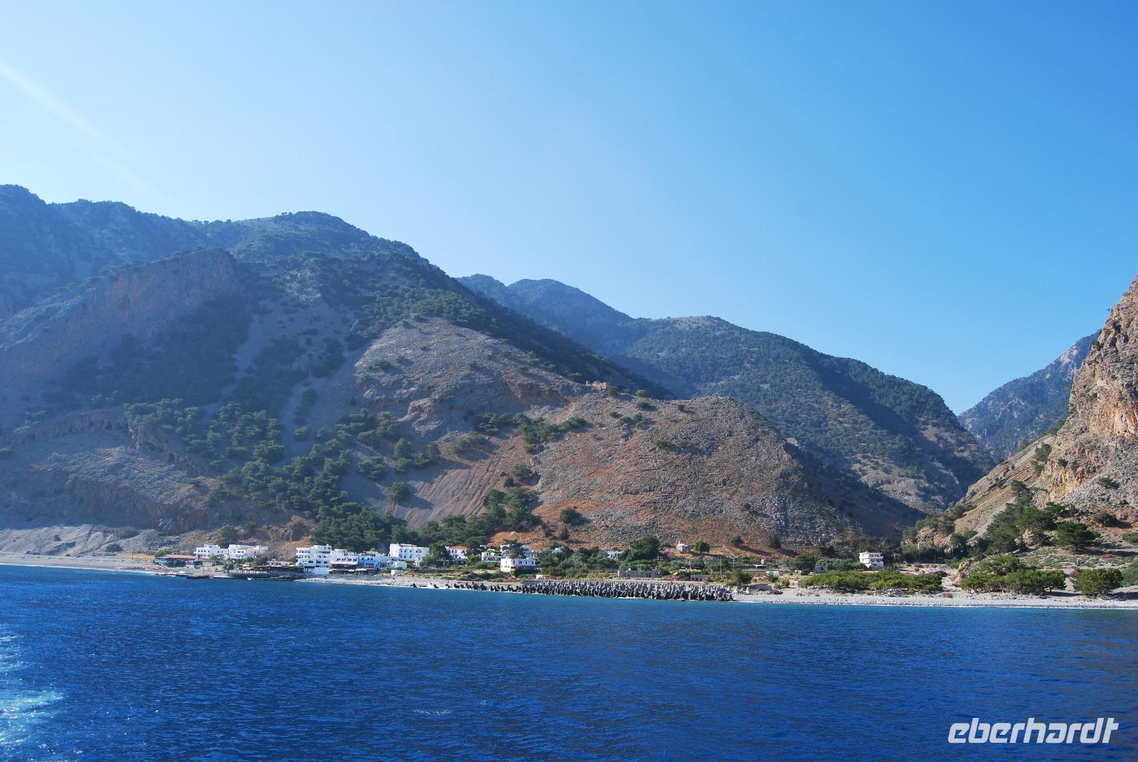 Irgendwann erreichten wir das Samaria Dorf, das nach der Benennung zum Nationalpark (1962) im Jahr 1965 verlassen wurde. Heute nutzen die Wanderer dieses verlassene Dorf als Rastplatz ihrer Wanderung. Eine Brücke führt über den schmalen Graben, den das Wasser gewaschen hatte. Die einfachen Hütten aus Stein, Lehm, Stroh und Holz sind mittlerweile schon zu Ruinen zerfallen. Und gerade das macht diesen Ort magisch. Nach dieser Erfrischung im Samaria Dorf ging es weiter. Wir krackselten über Felsen, glatt und rund geschliffen vom Wasser sowie über groben und feinen Kies. Die Schlucht wurde immer und immer Schmaler, die Seitenwände türmten sich auf. Wir erreichten die schmalste Stelle und befanden uns inmitten des eindrucksvollen Canyons. Mit nur gut drei Metern Breite und vielleicht sechshundert Metern senkrechter Felswände ist es schon ein aufregendes Erlebnis die Schlucht zu durchwandern. Am Ausgang vom Nationalpark wartete eine herrlich kühle Erfrischung auf uns, mit der wir die letzten Meter bis ans lybische Meer im Handumdrehen meisterten. Wir erreichten das Fährmannsdorf Agia Roumeli und legte eine spätere Mittagspause ein. Ein kühlendes Bad im Meer konnte man beinahe nicht auslassen. Der grobe schwarze Kies war brennend heiß und man musste schleunigst seine Füße kühlen wenn die nicht verbrennen sollten.