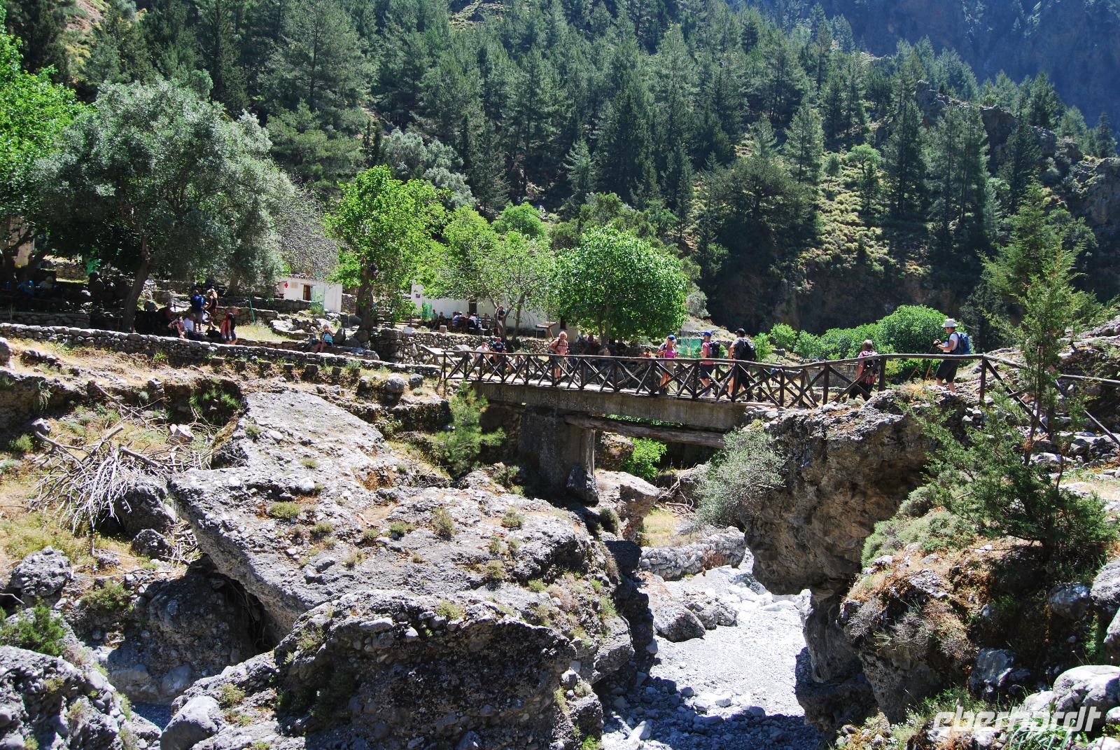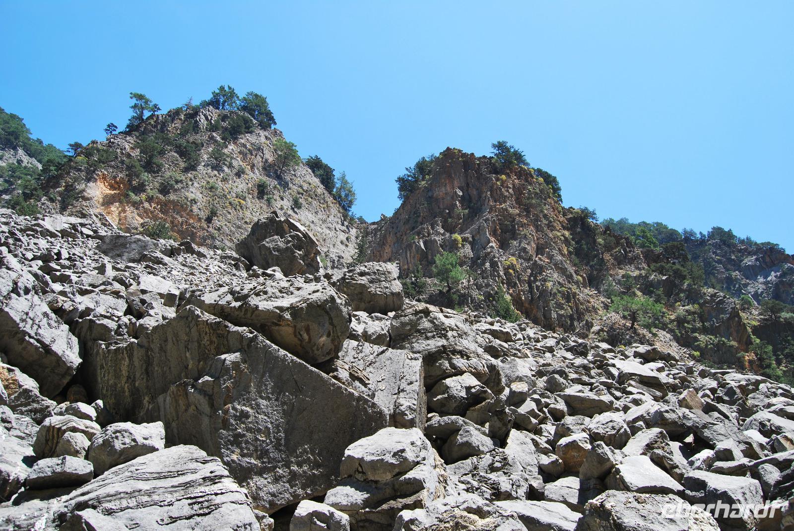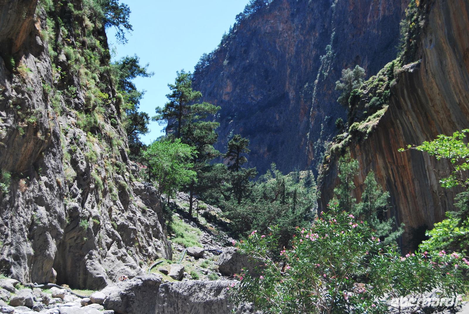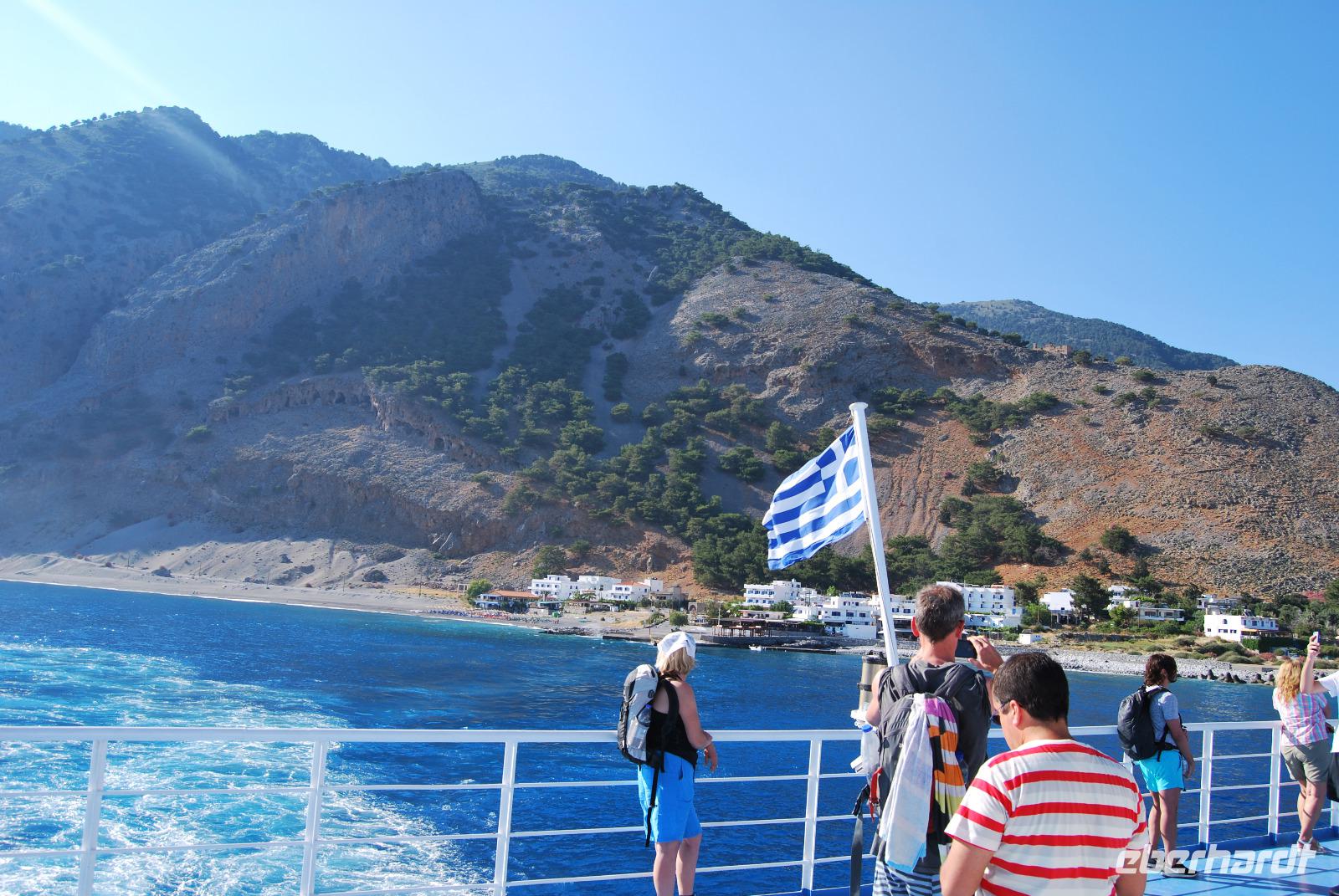 Irgendwann erreichten wir das Samaria Dorf, das nach der Benennung zum Nationalpark (1962) im Jahr 1965 verlassen wurde. Heute nutzen die Wanderer dieses verlassene Dorf als Rastplatz ihrer Wanderung. Eine Brücke führt über den schmalen Graben, den das Wasser gewaschen hatte. Die einfachen Hütten aus Stein, Lehm, Stroh und Holz sind mittlerweile schon zu Ruinen zerfallen. Und gerade das macht diesen Ort magisch. Nach dieser Erfrischung im Samaria Dorf ging es weiter. Wir krackselten über Felsen, glatt und rund geschliffen vom Wasser sowie über groben und feinen Kies. Die Schlucht wurde immer und immer Schmaler, die Seitenwände türmten sich auf. Wir erreichten die schmalste Stelle und befanden uns inmitten des eindrucksvollen Canyons. Mit nur gut drei Metern Breite und vielleicht sechshundert Metern senkrechter Felswände ist es schon ein aufregendes Erlebnis die Schlucht zu durchwandern. Am Ausgang vom Nationalpark wartete eine herrlich kühle Erfrischung auf uns, mit der wir die letzten Meter bis ans lybische Meer im Handumdrehen meisterten. Wir erreichten das Fährmannsdorf Agia Roumeli und legte eine spätere Mittagspause ein. Ein kühlendes Bad im Meer konnte man beinahe nicht auslassen. Der grobe schwarze Kies war brennend heiß und man musste schleunigst seine Füße kühlen wenn die nicht verbrennen sollten.