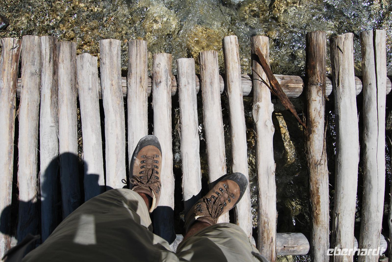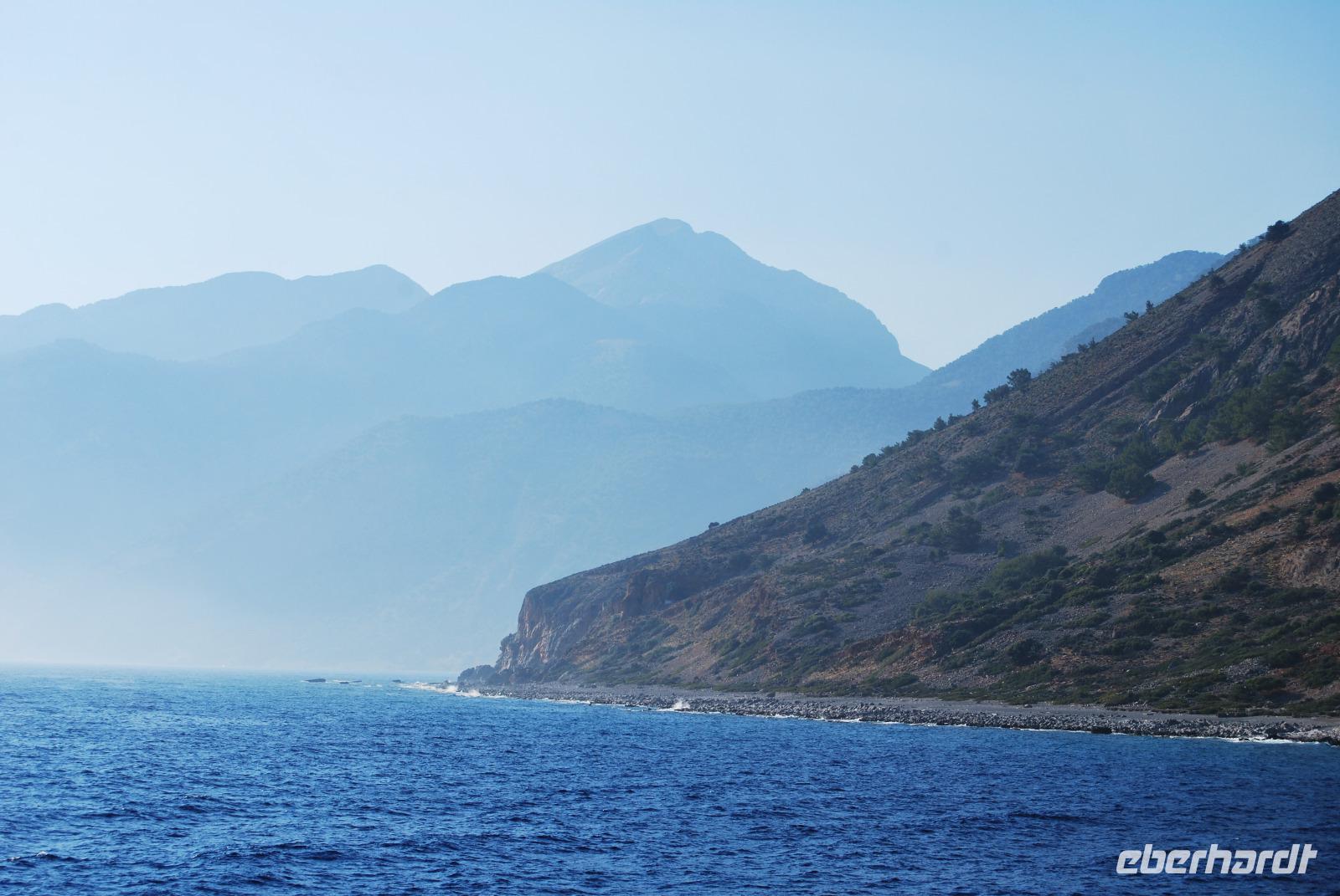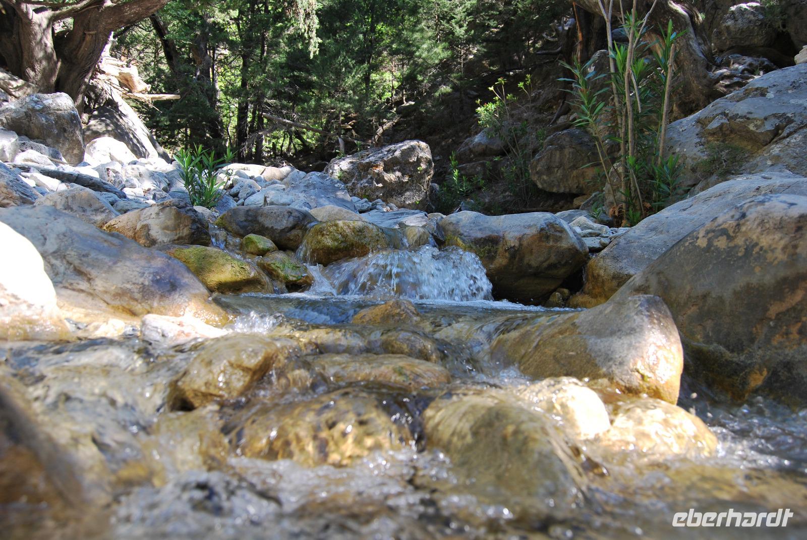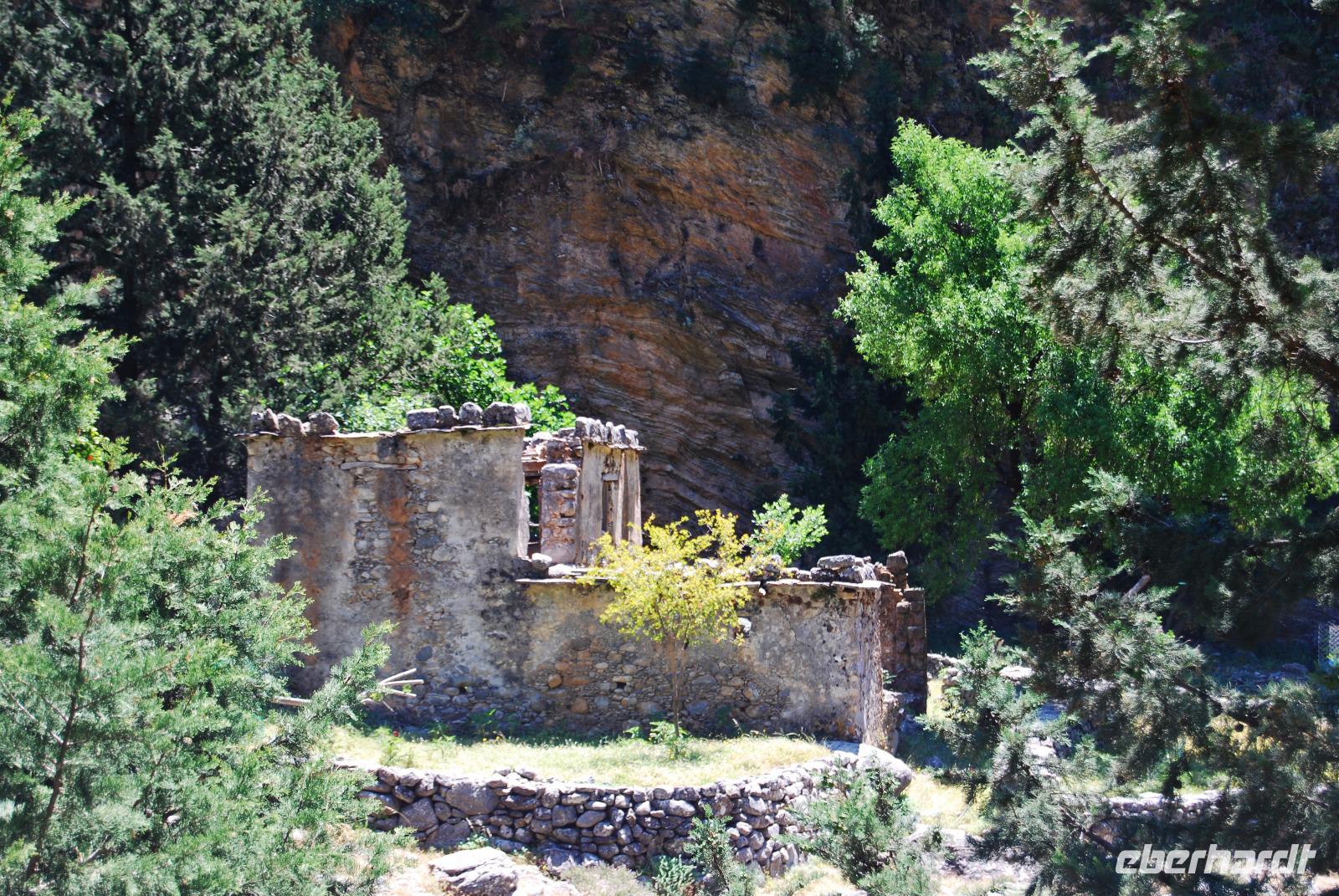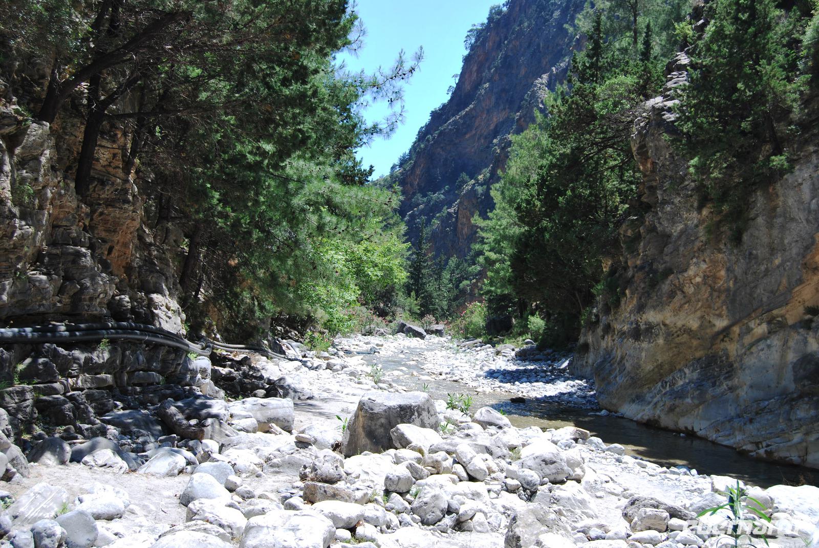Irgendwann erreichten wir das Samaria Dorf, das nach der Benennung zum Nationalpark (1962) im Jahr 1965 verlassen wurde. Heute nutzen die Wanderer dieses verlassene Dorf als Rastplatz ihrer Wanderung. Eine Brücke führt über den schmalen Graben, den das Wasser gewaschen hatte. Die einfachen Hütten aus Stein, Lehm, Stroh und Holz sind mittlerweile schon zu Ruinen zerfallen. Und gerade das macht diesen Ort magisch. Nach dieser Erfrischung im Samaria Dorf ging es weiter. Wir krackselten über Felsen, glatt und rund geschliffen vom Wasser sowie über groben und feinen Kies. Die Schlucht wurde immer und immer Schmaler, die Seitenwände türmten sich auf. Wir erreichten die schmalste Stelle und befanden uns inmitten des eindrucksvollen Canyons. Mit nur gut drei Metern Breite und vielleicht sechshundert Metern senkrechter Felswände ist es schon ein aufregendes Erlebnis die Schlucht zu durchwandern. Am Ausgang vom Nationalpark wartete eine herrlich kühle Erfrischung auf uns, mit der wir die letzten Meter bis ans lybische Meer im Handumdrehen meisterten. Wir erreichten das Fährmannsdorf Agia Roumeli und legte eine spätere Mittagspause ein. Ein kühlendes Bad im Meer konnte man beinahe nicht auslassen. Der grobe schwarze Kies war brennend heiß und man musste schleunigst seine Füße kühlen wenn die nicht verbrennen sollten.